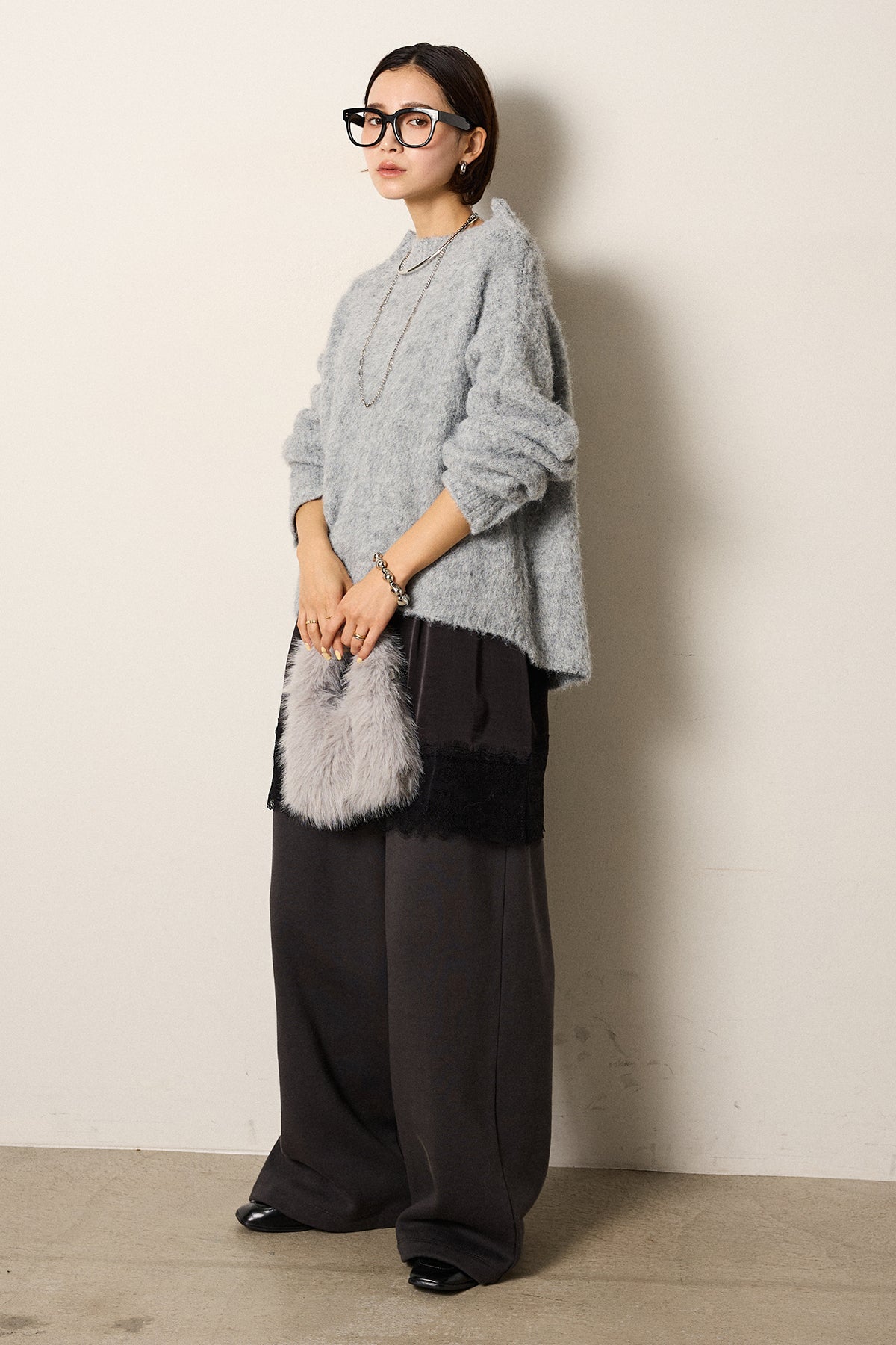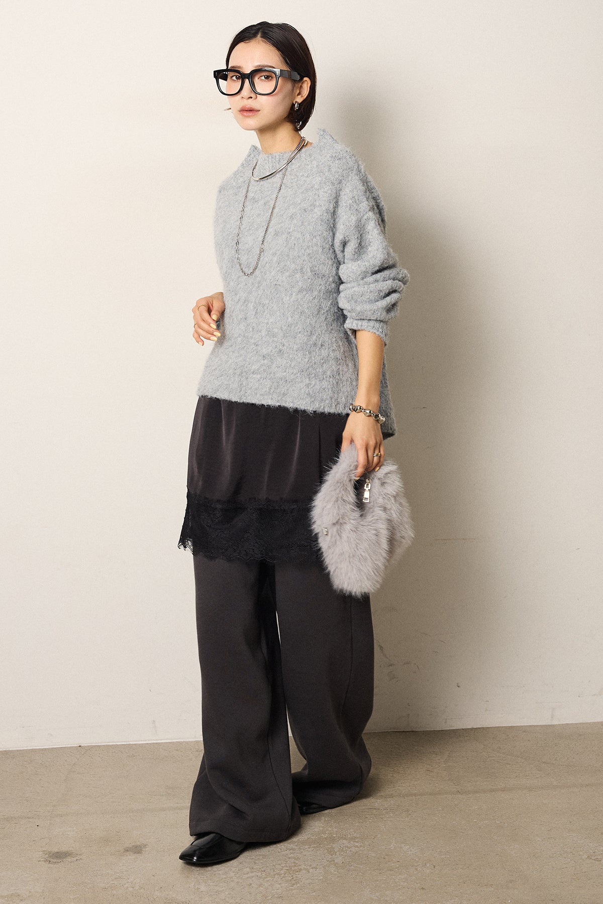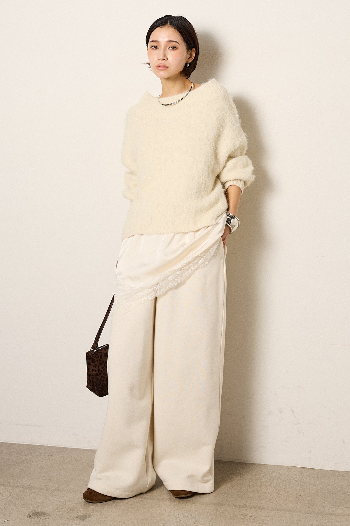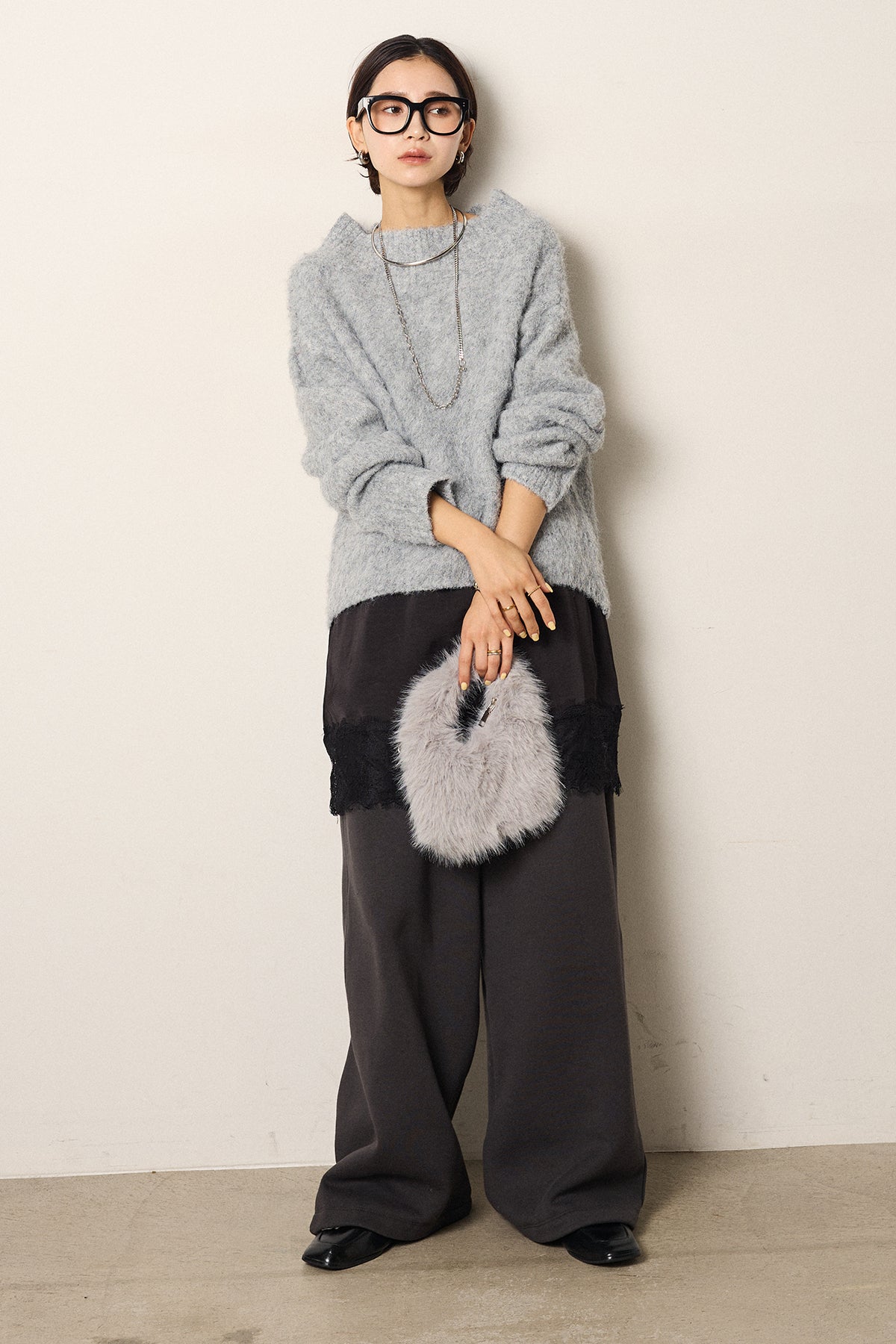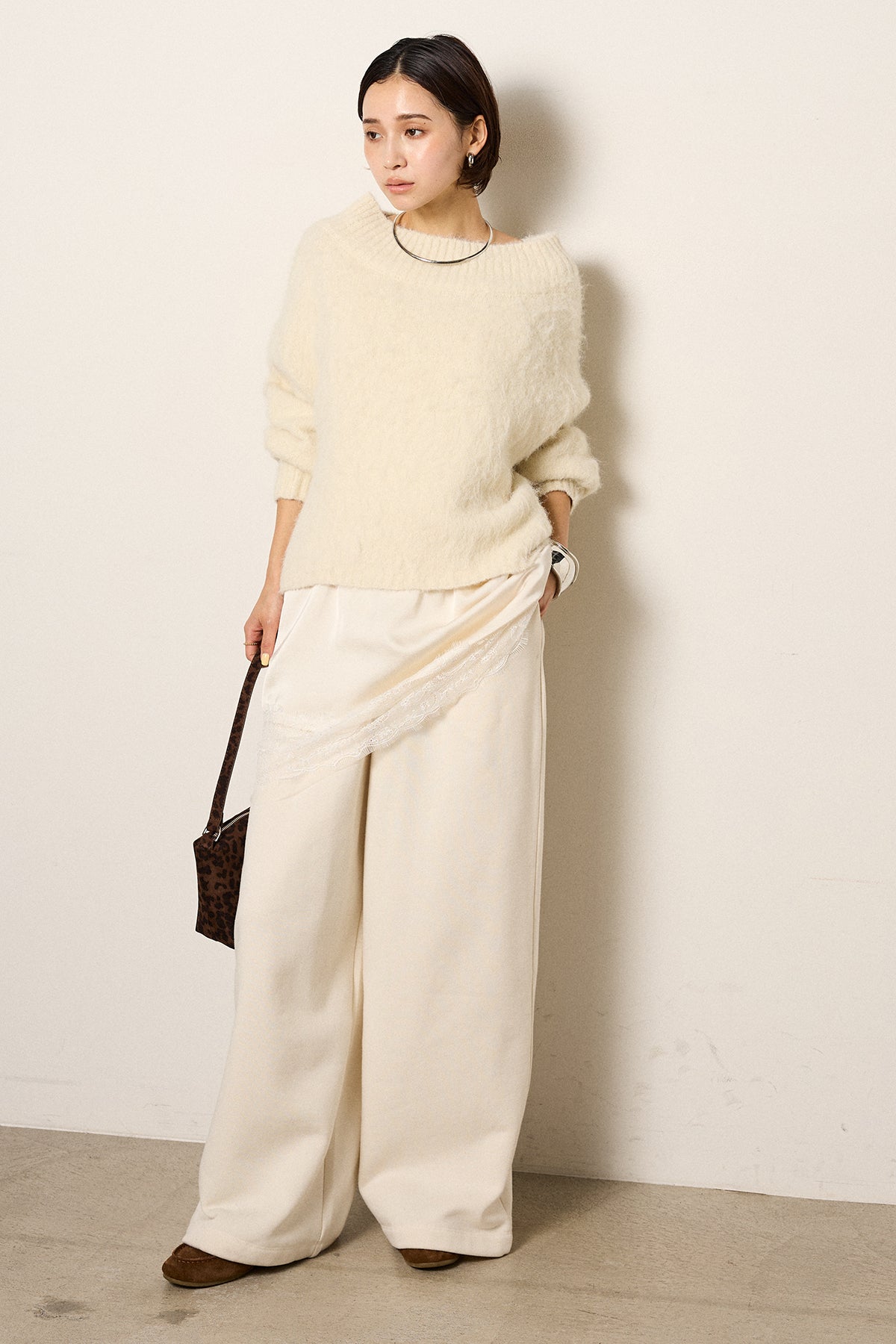 ふんわりとした風合いが魅力のアルパカタッチニット。肩のラインをゆるっと落としたオフショルシルエットが、抜け感のあるバランスをつくります。やわらかい編地が軽やかに体を包み込み、リラックスムード漂う佇まいに。ロング丈のインナーやワイドパンツとも合わせやすく、シンプルながら雰囲気のあるスタイルを楽しめる一枚です。