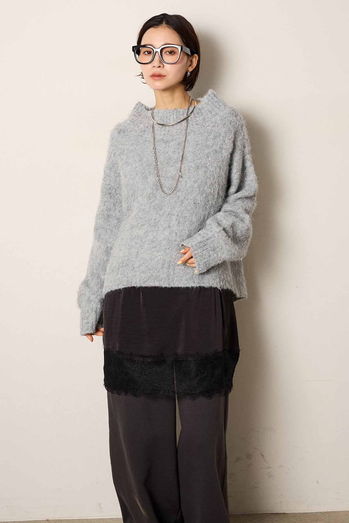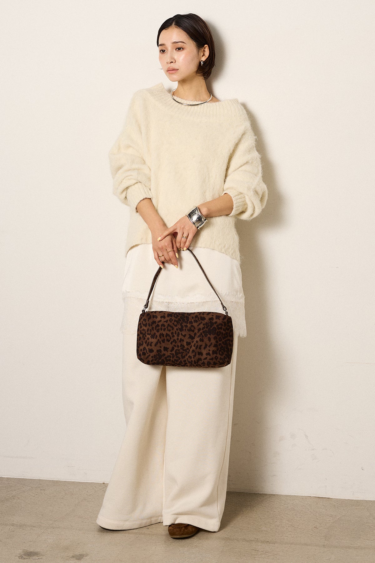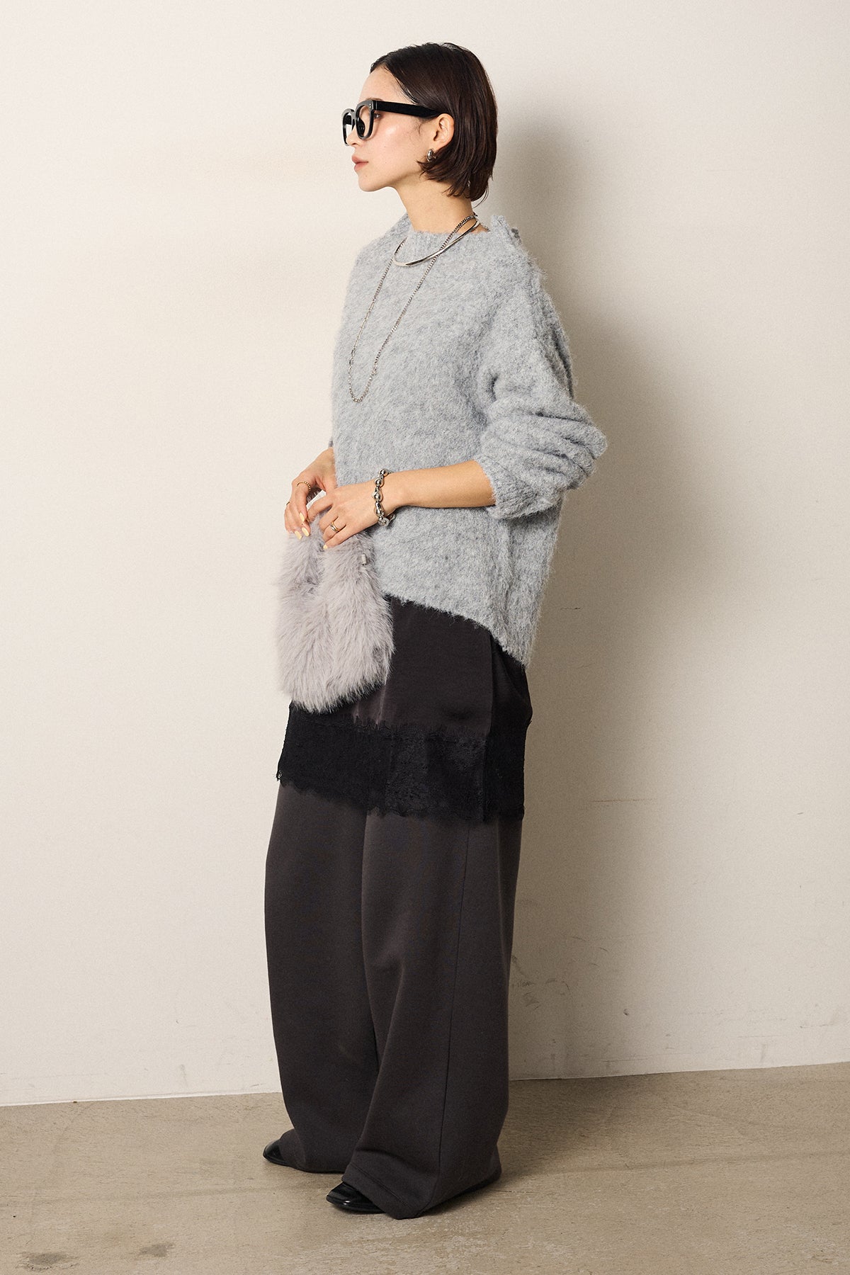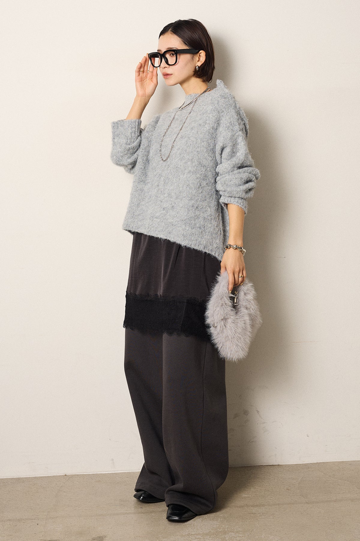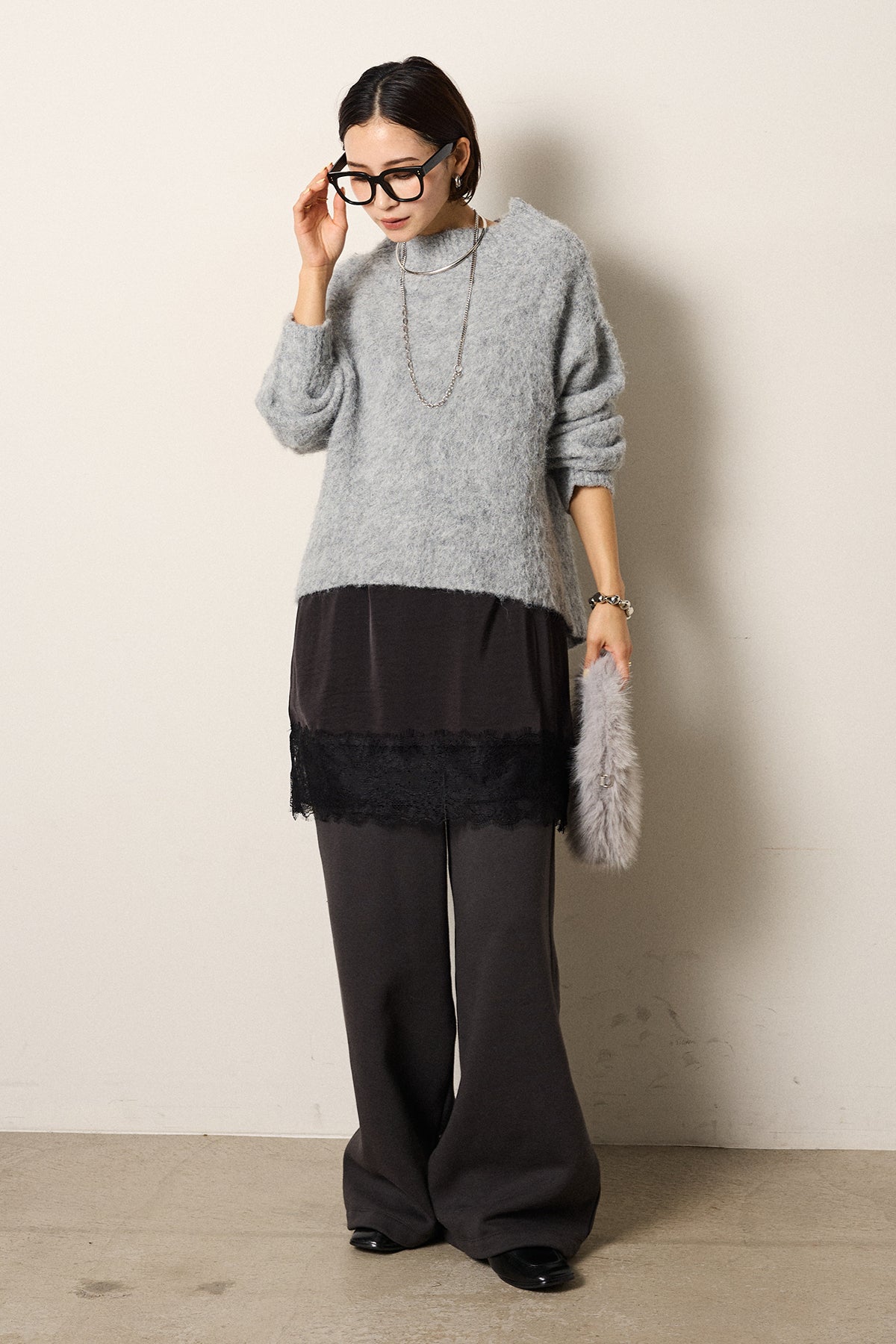 ふんわりとした風合いが魅力のアルパカタッチニット。肩のラインをゆるっと落としたオフショルシルエットが、抜け感のあるバランスをつくります。やわらかい編地が軽やかに体を包み込み、リラックスムード漂う佇まいに。ロング丈のインナーやワイドパンツとも合わせやすく、シンプルながら雰囲気のあるスタイルを楽しめる一枚です。