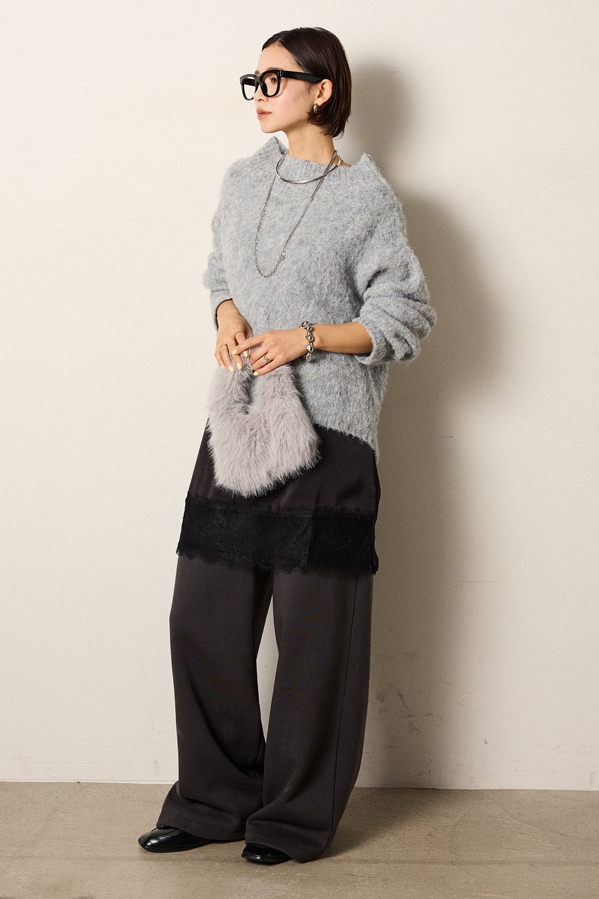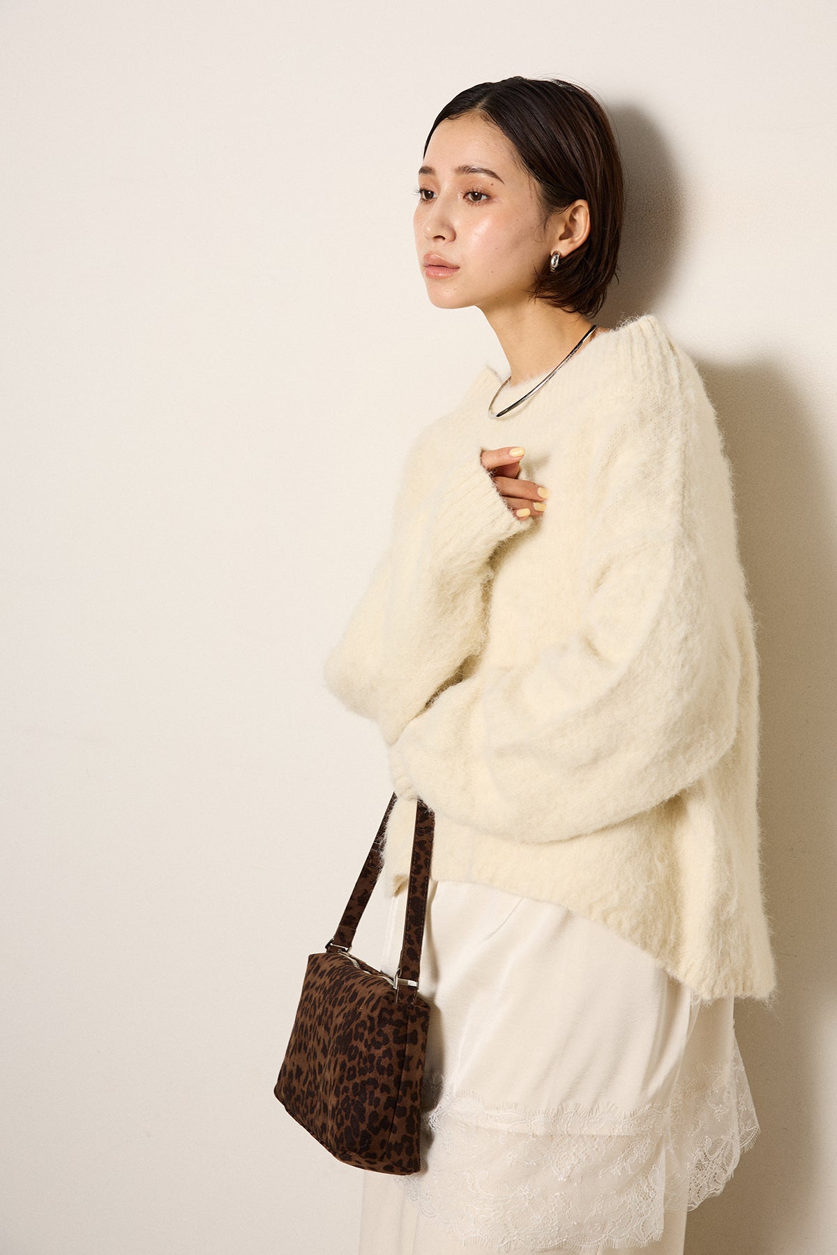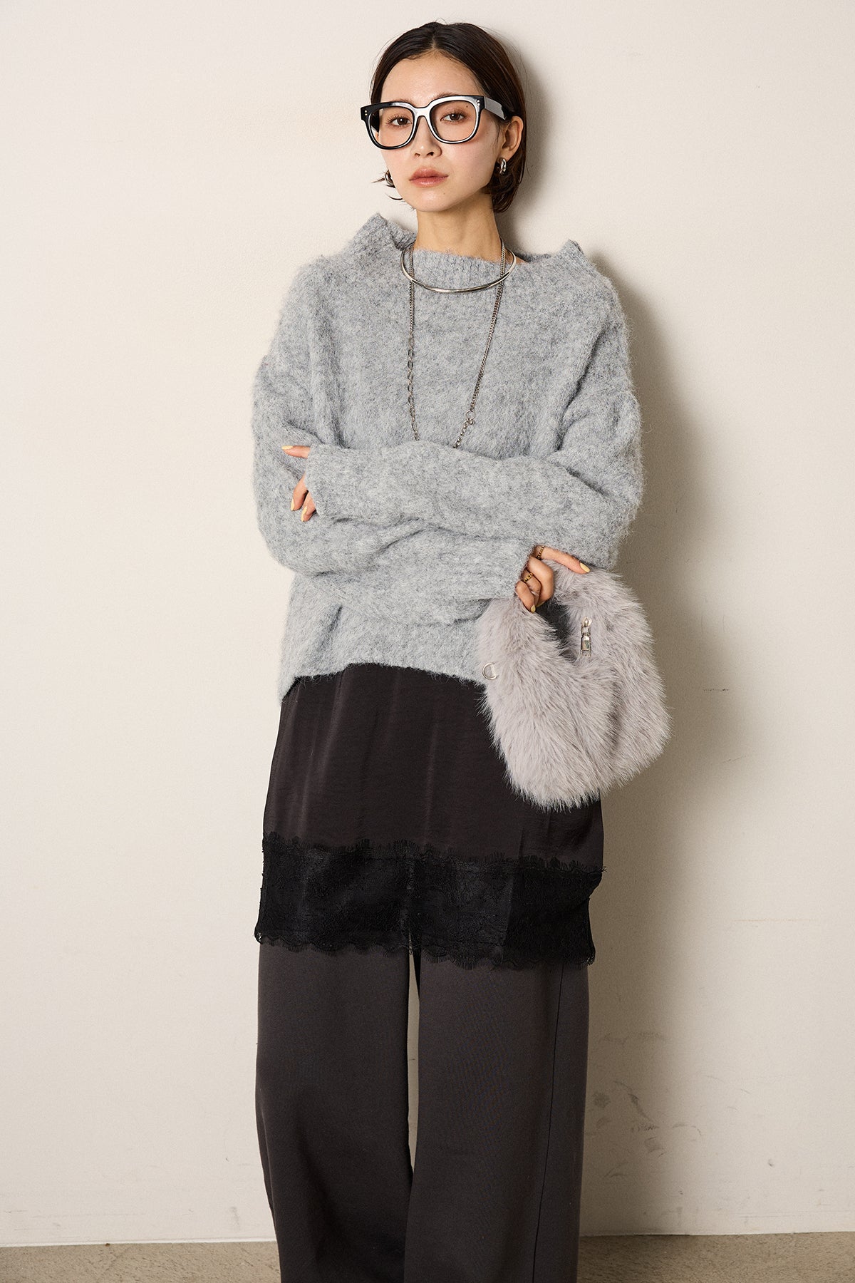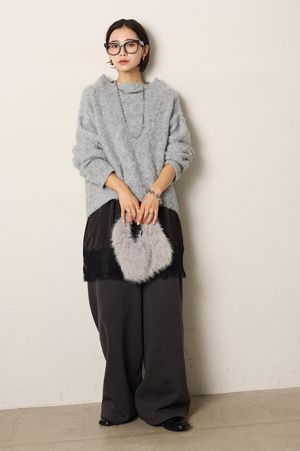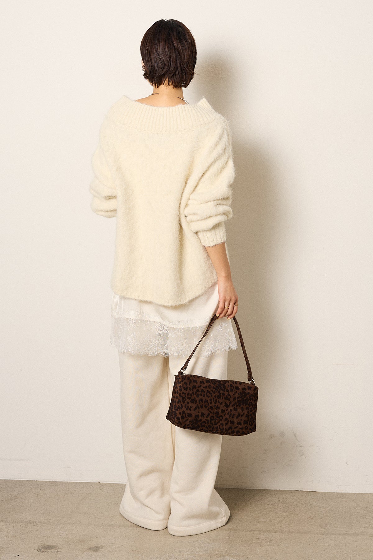 ふんわりとした風合いが魅力のアルパカタッチニット。肩のラインをゆるっと落としたオフショルシルエットが、抜け感のあるバランスをつくります。やわらかい編地が軽やかに体を包み込み、リラックスムード漂う佇まいに。ロング丈のインナーやワイドパンツとも合わせやすく、シンプルながら雰囲気のあるスタイルを楽しめる一枚です。