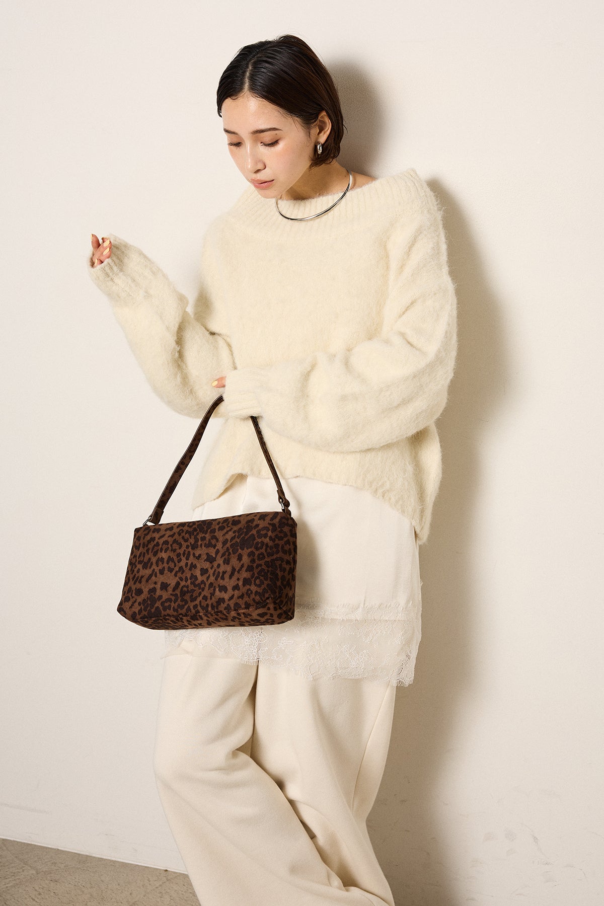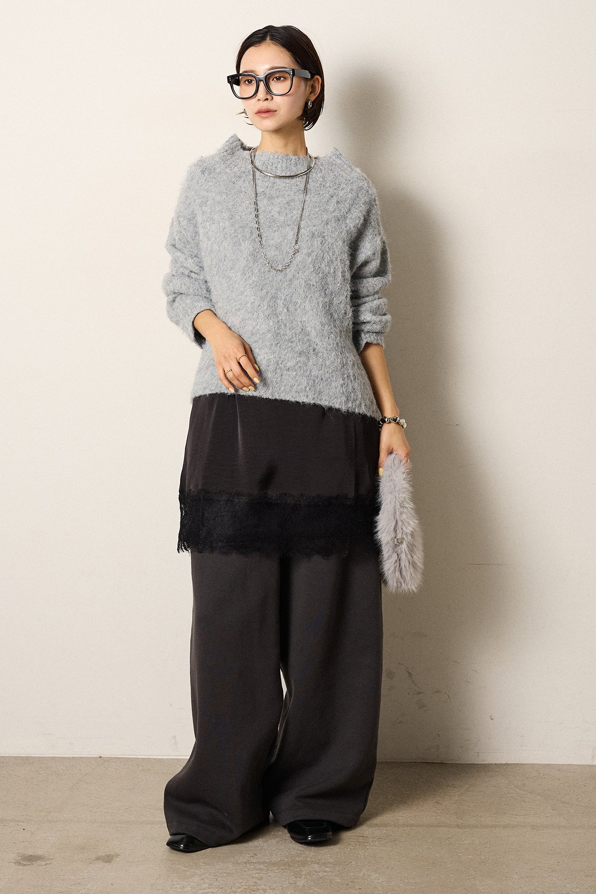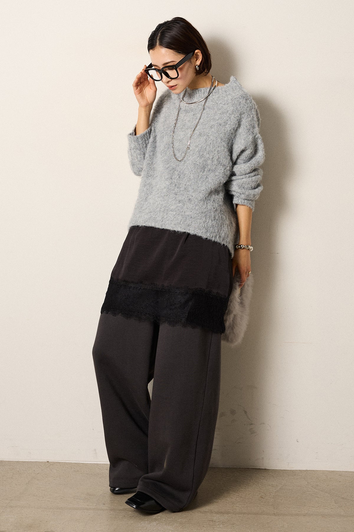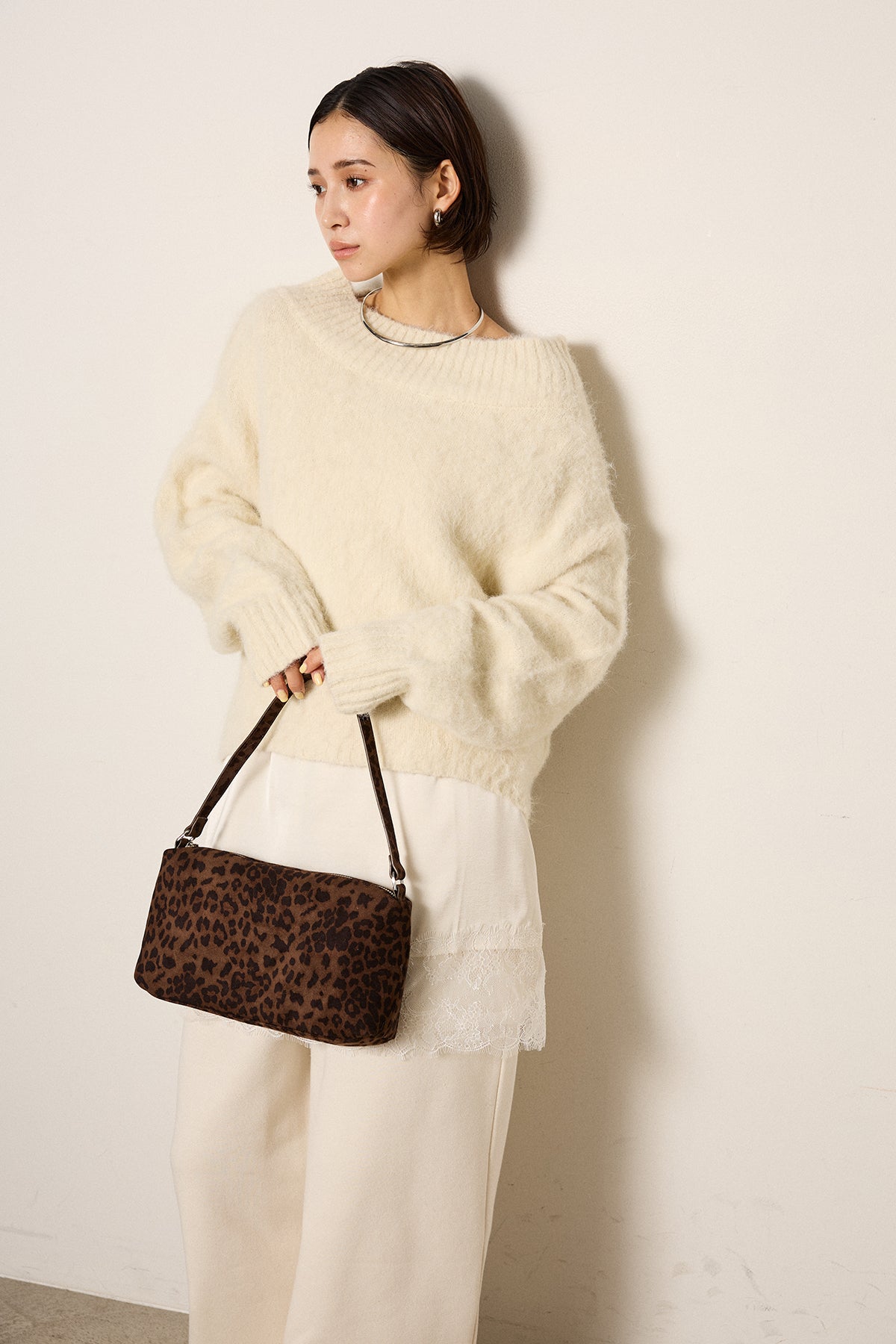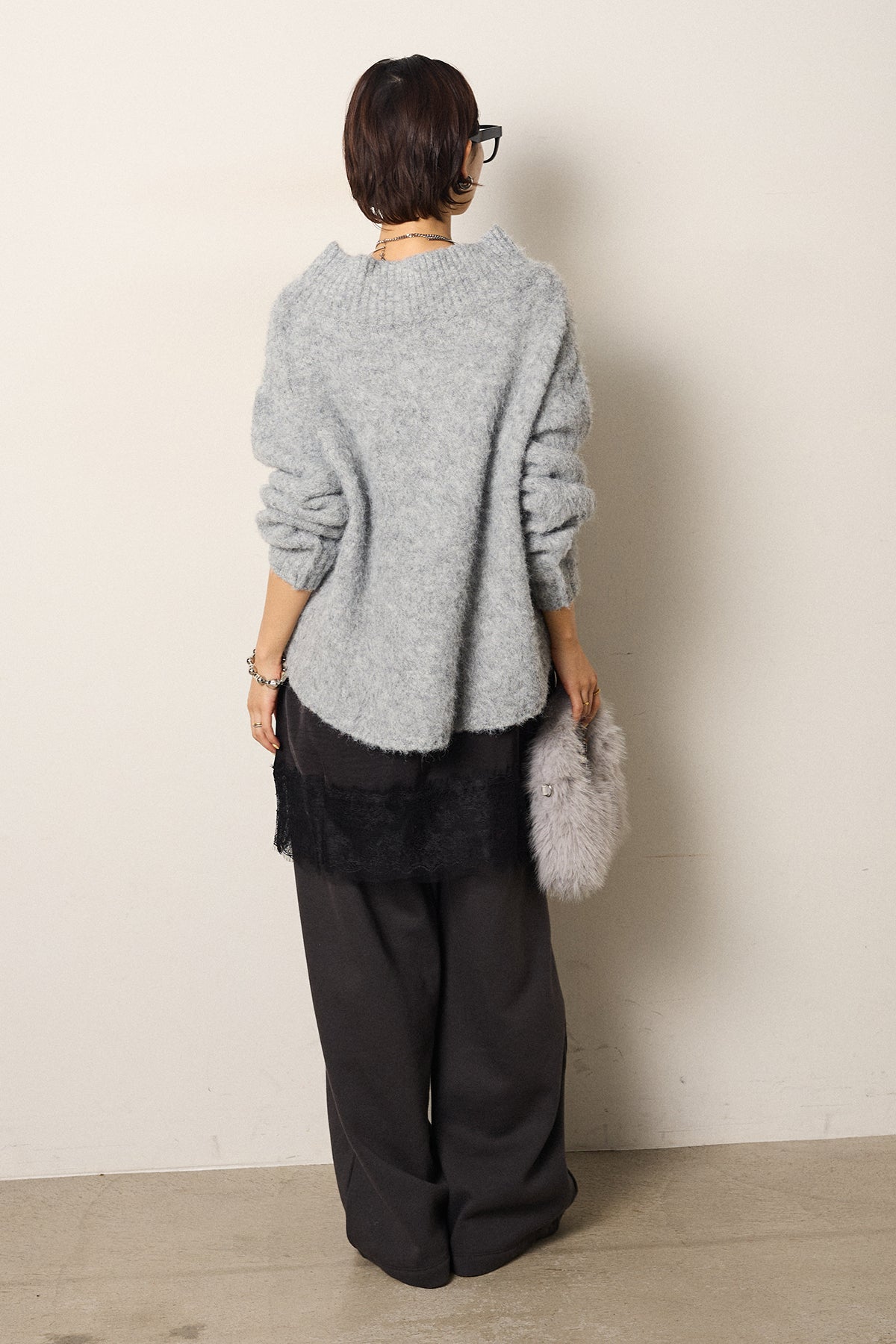 ふんわりとした風合いが魅力のアルパカタッチニット。肩のラインをゆるっと落としたオフショルシルエットが、抜け感のあるバランスをつくります。やわらかい編地が軽やかに体を包み込み、リラックスムード漂う佇まいに。ロング丈のインナーやワイドパンツとも合わせやすく、シンプルながら雰囲気のあるスタイルを楽しめる一枚です。