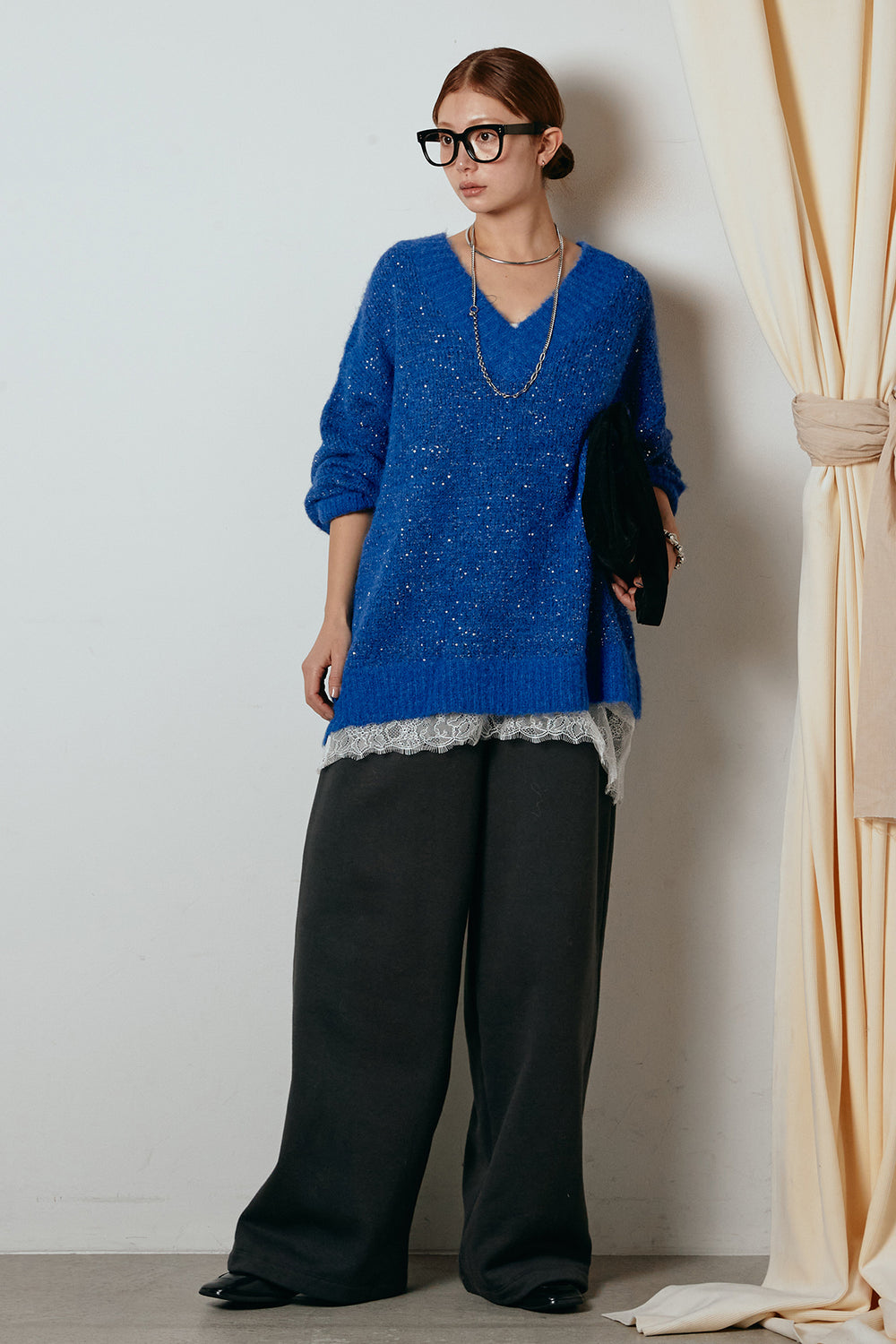 [SET]Vネックルーズラメニットトップス+裏起毛スウェットワイドパンツ(2set)