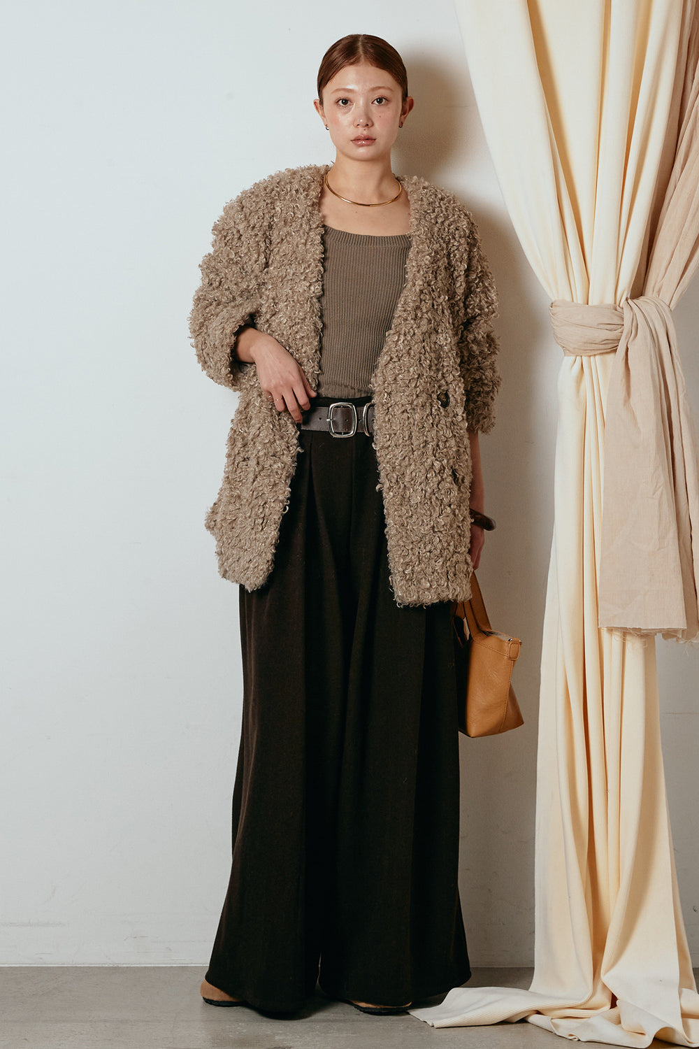 [SET]シープライクファージャケット+フェイクレザー太ベルト付きタックワイドパンツ(2set)
