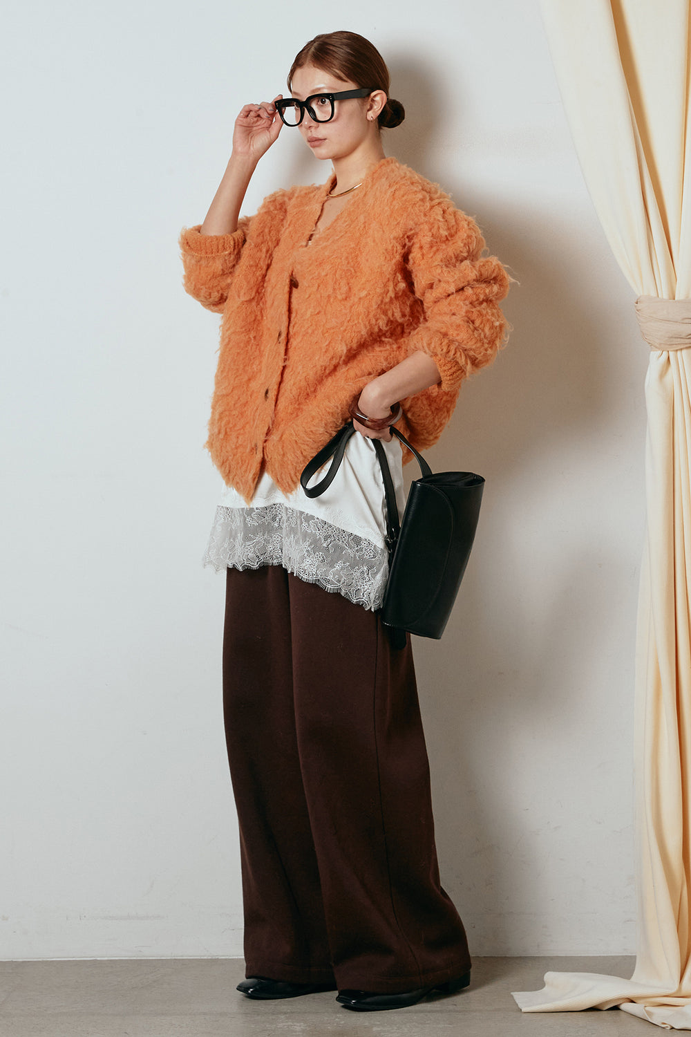 [SET]ルーズシャギーニットカーディガン+裏起毛スウェットワイドパンツ+レース切り替えキャミソール(3set)