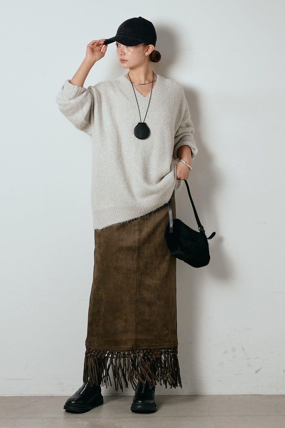 [SET]Vネックルーズラメニットトップス+スウェードライク裾フリンジスカート(2set)
