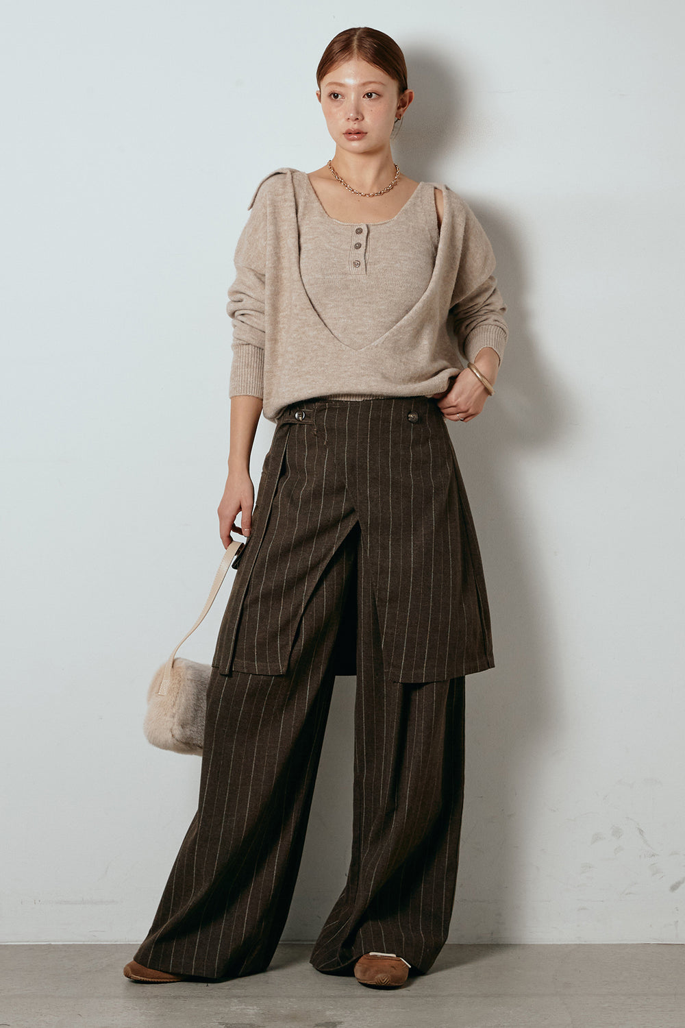 [SET]襟付きレイヤードニットトップス+細ストライプレイヤードデザインパンツ(2set)