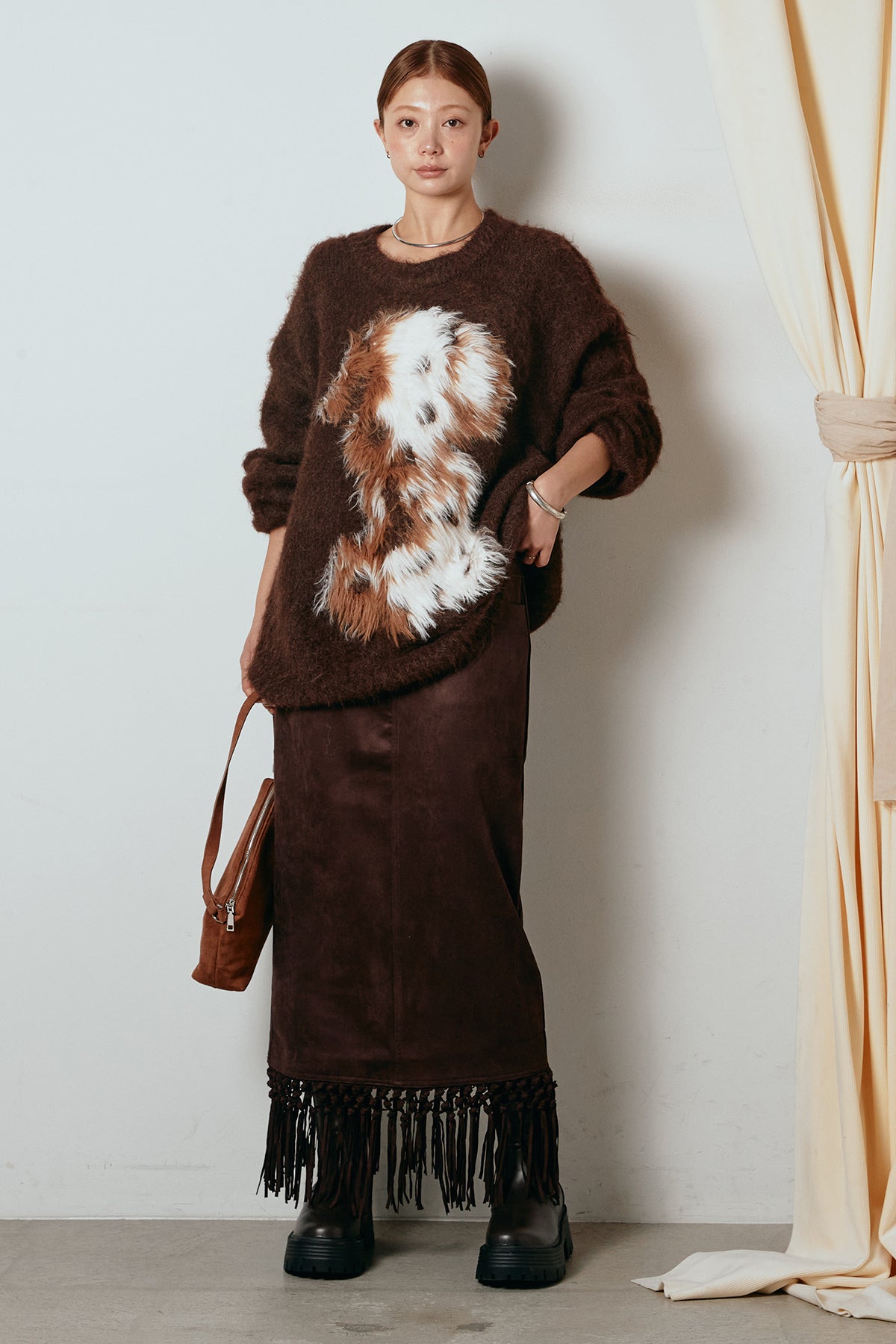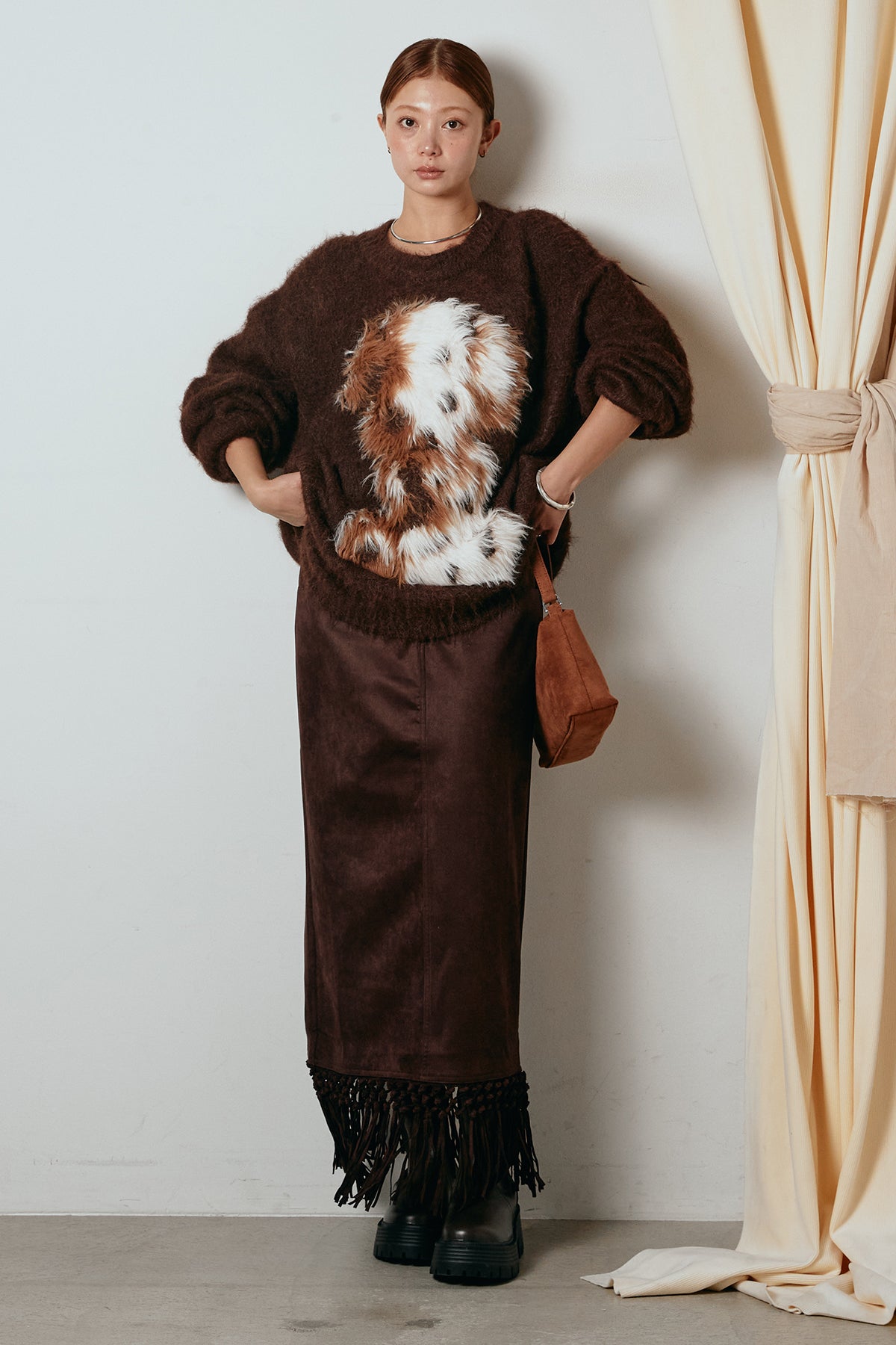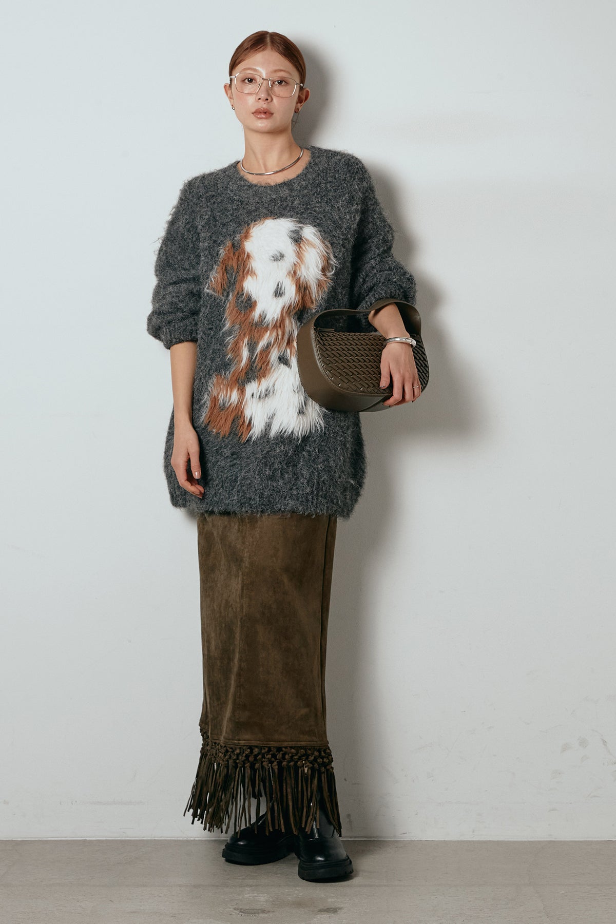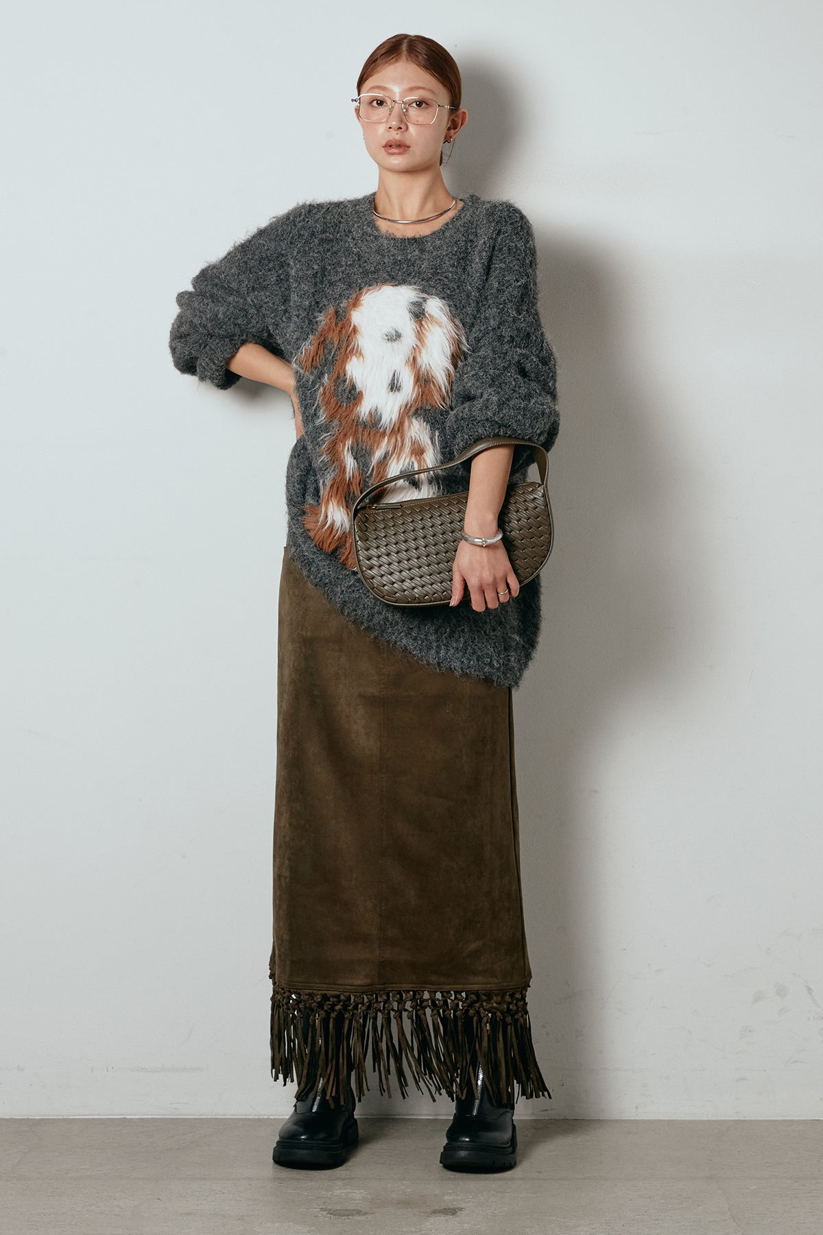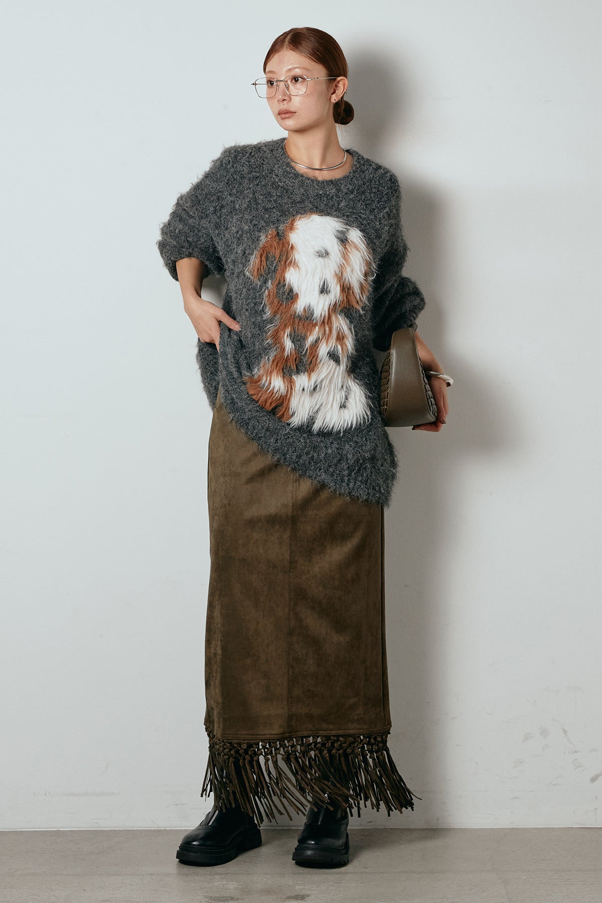 [SET]シャギーニュアンスアニマルニット+スウェードライク裾フリンジスカート(2set)