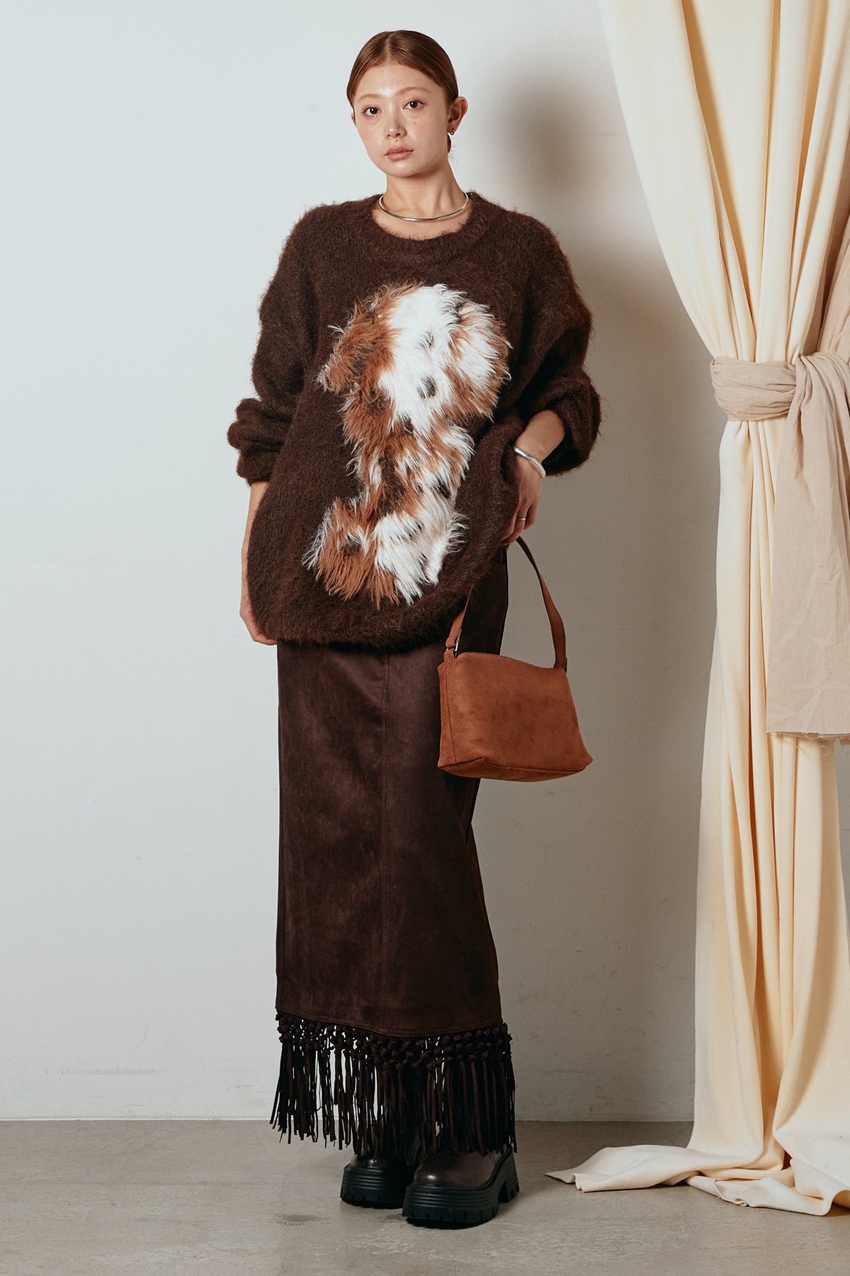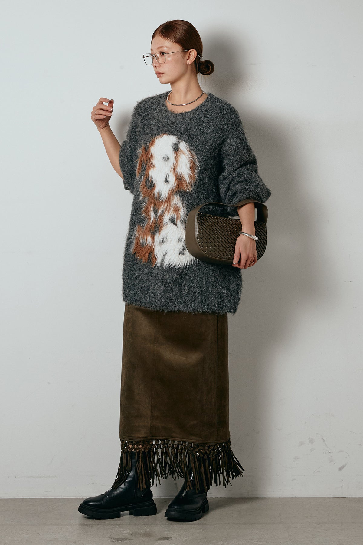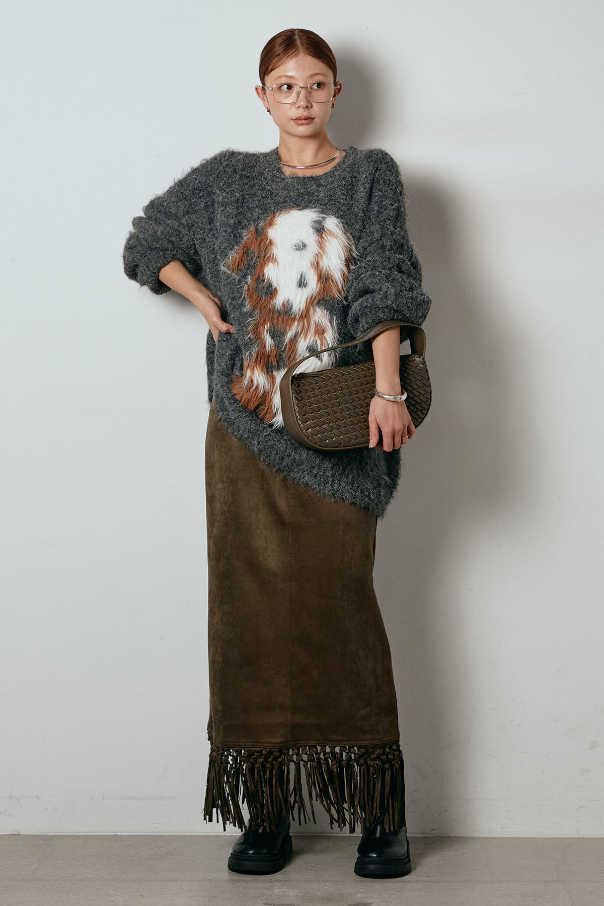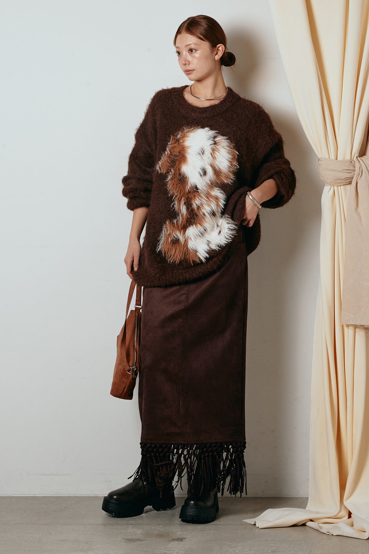 [SET]シャギーニュアンスアニマルニット+スウェードライク裾フリンジスカート(2set)