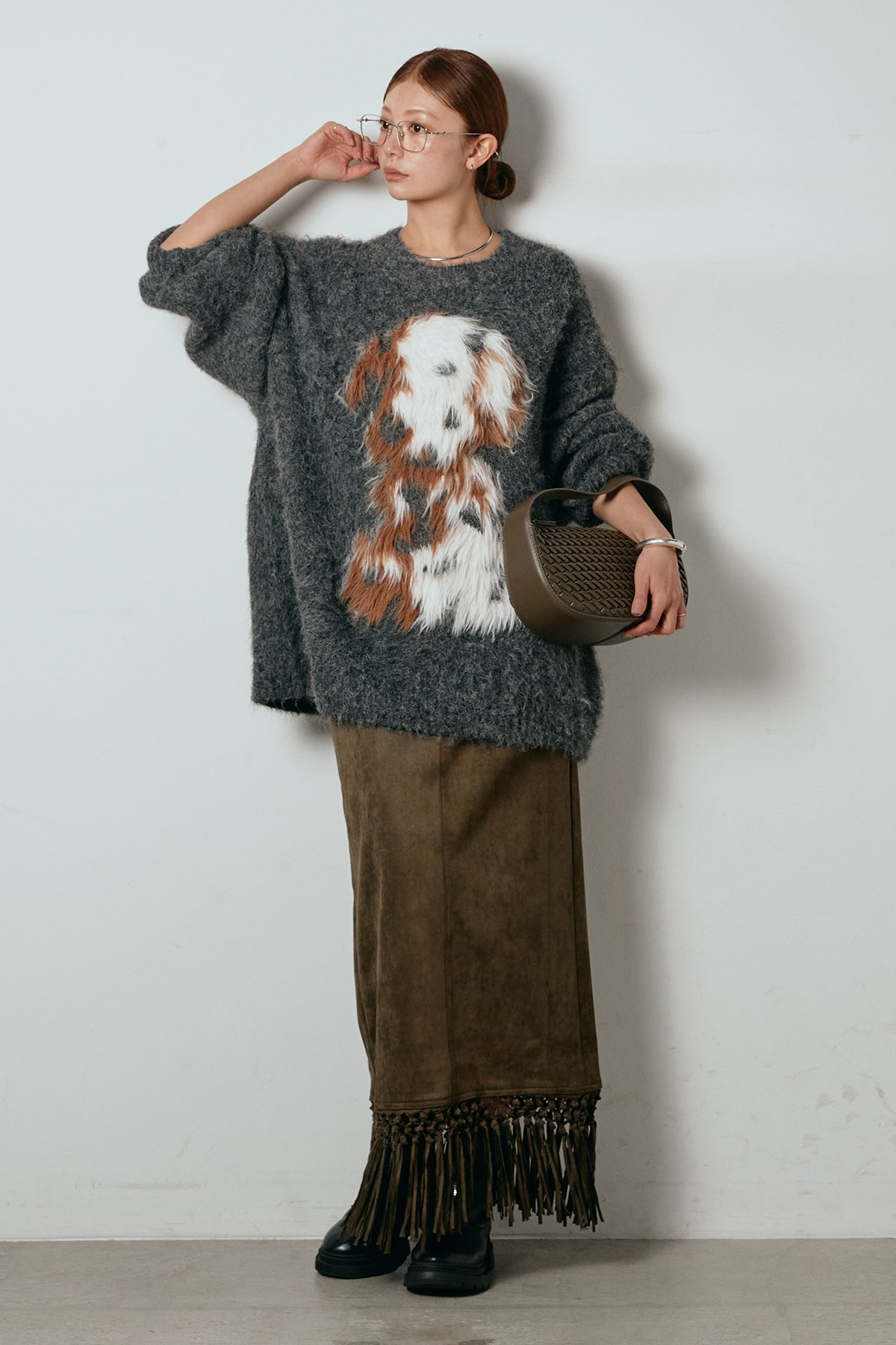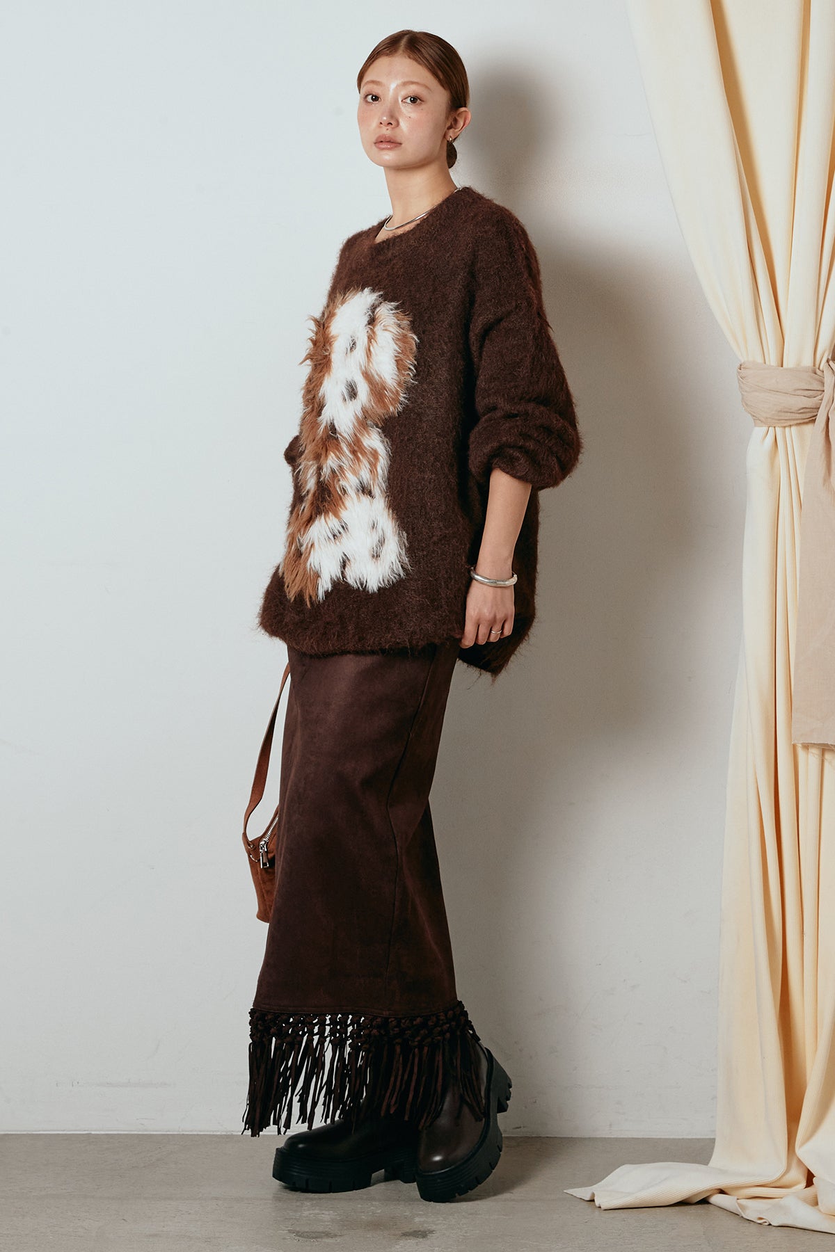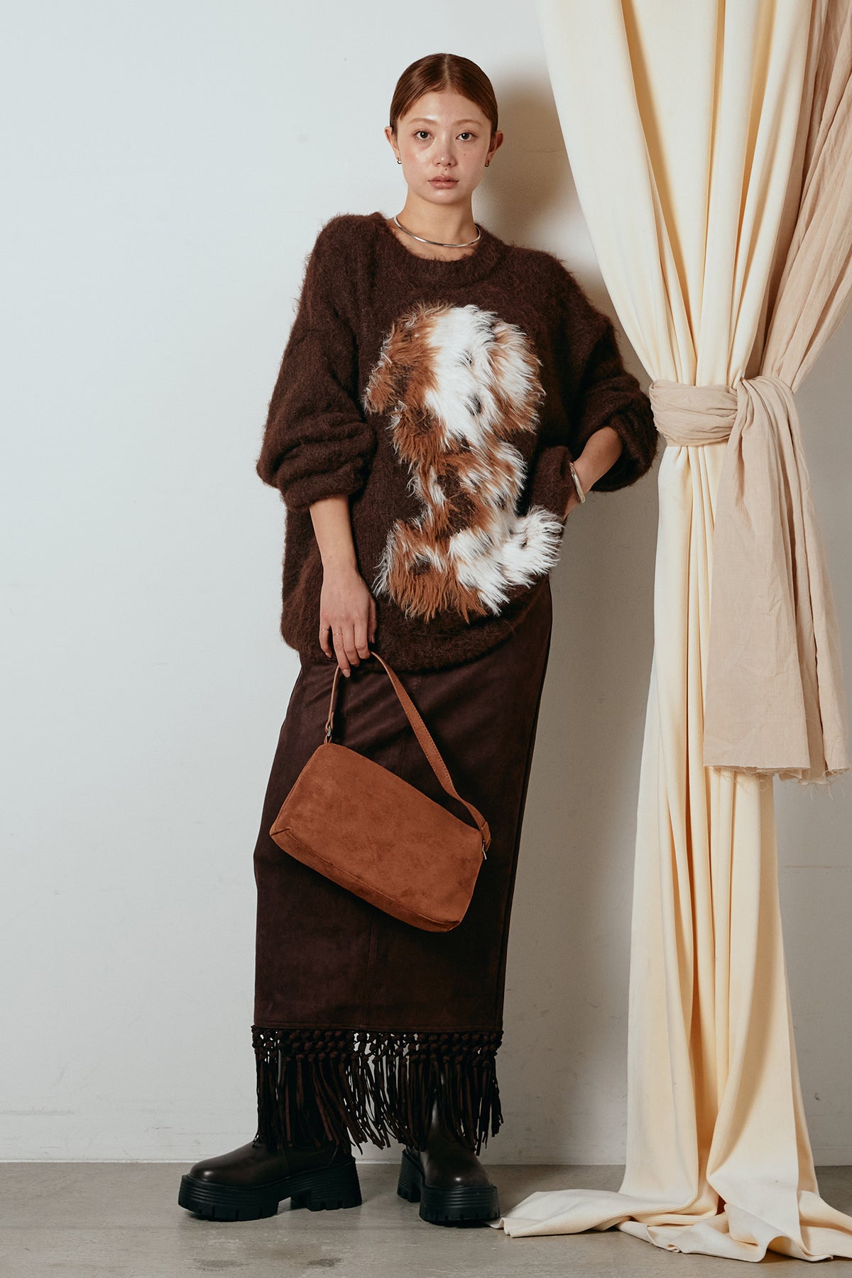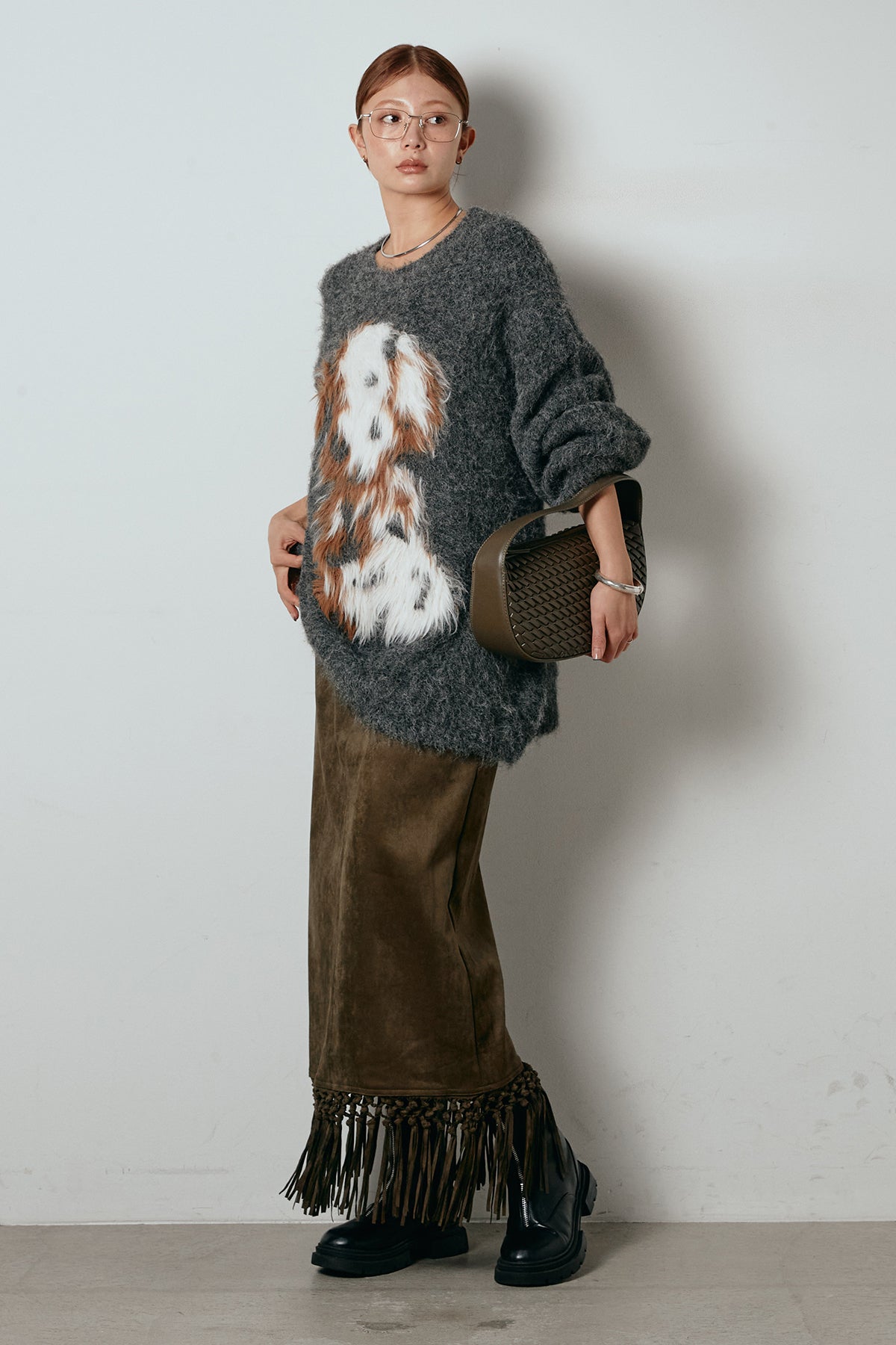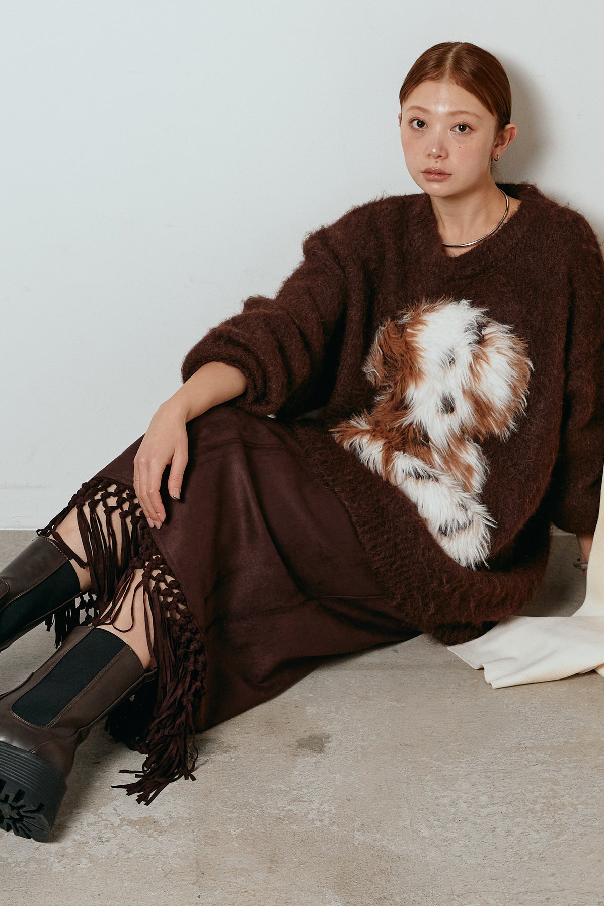 [SET]シャギーニュアンスアニマルニット+スウェードライク裾フリンジスカート(2set)