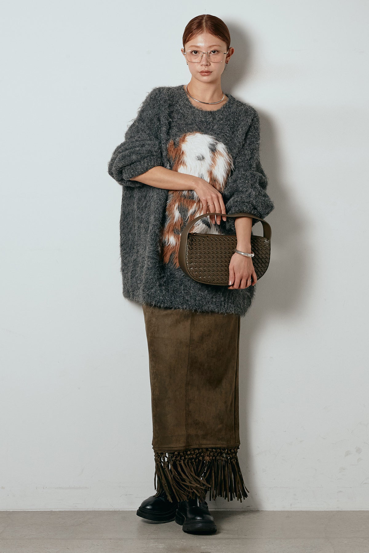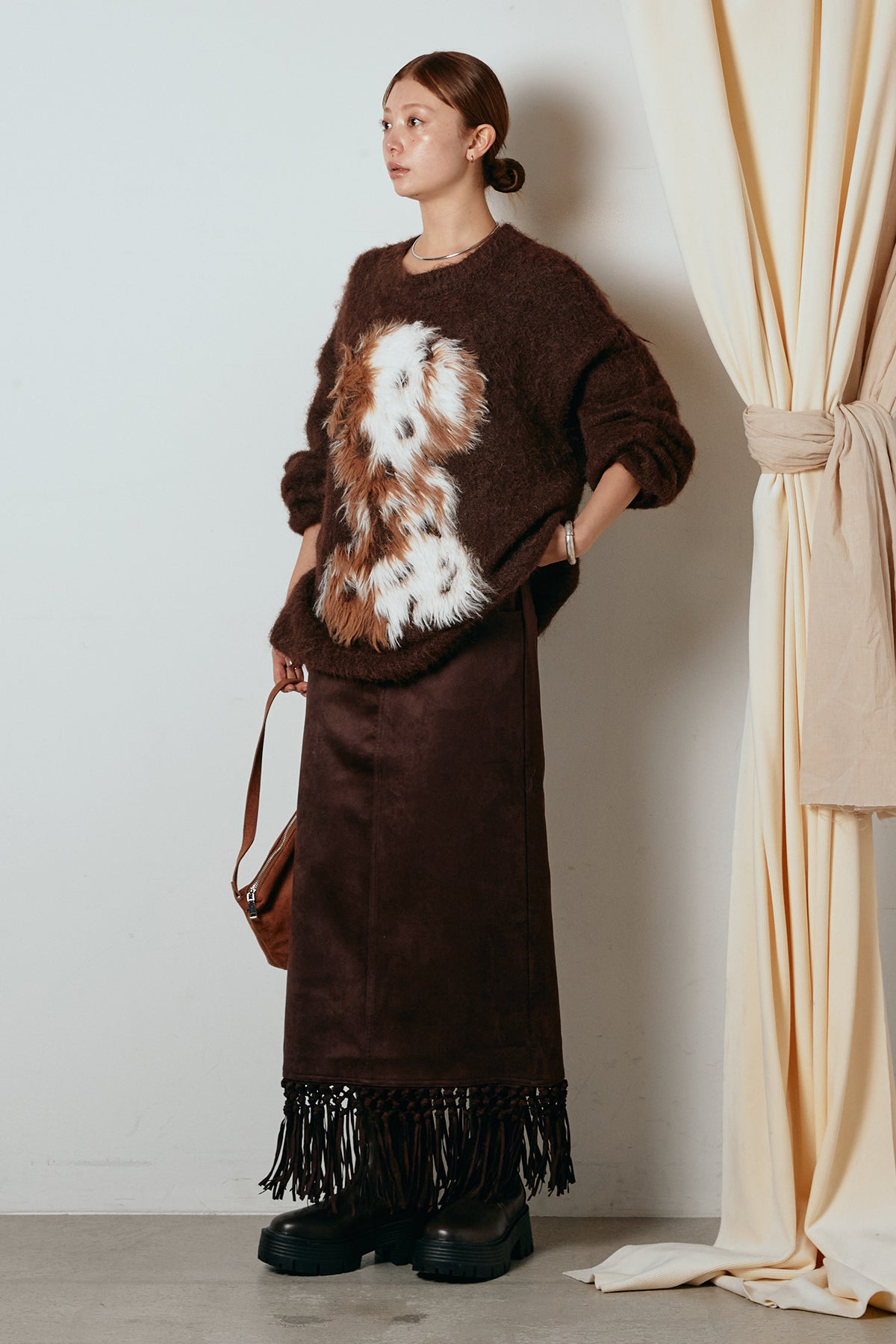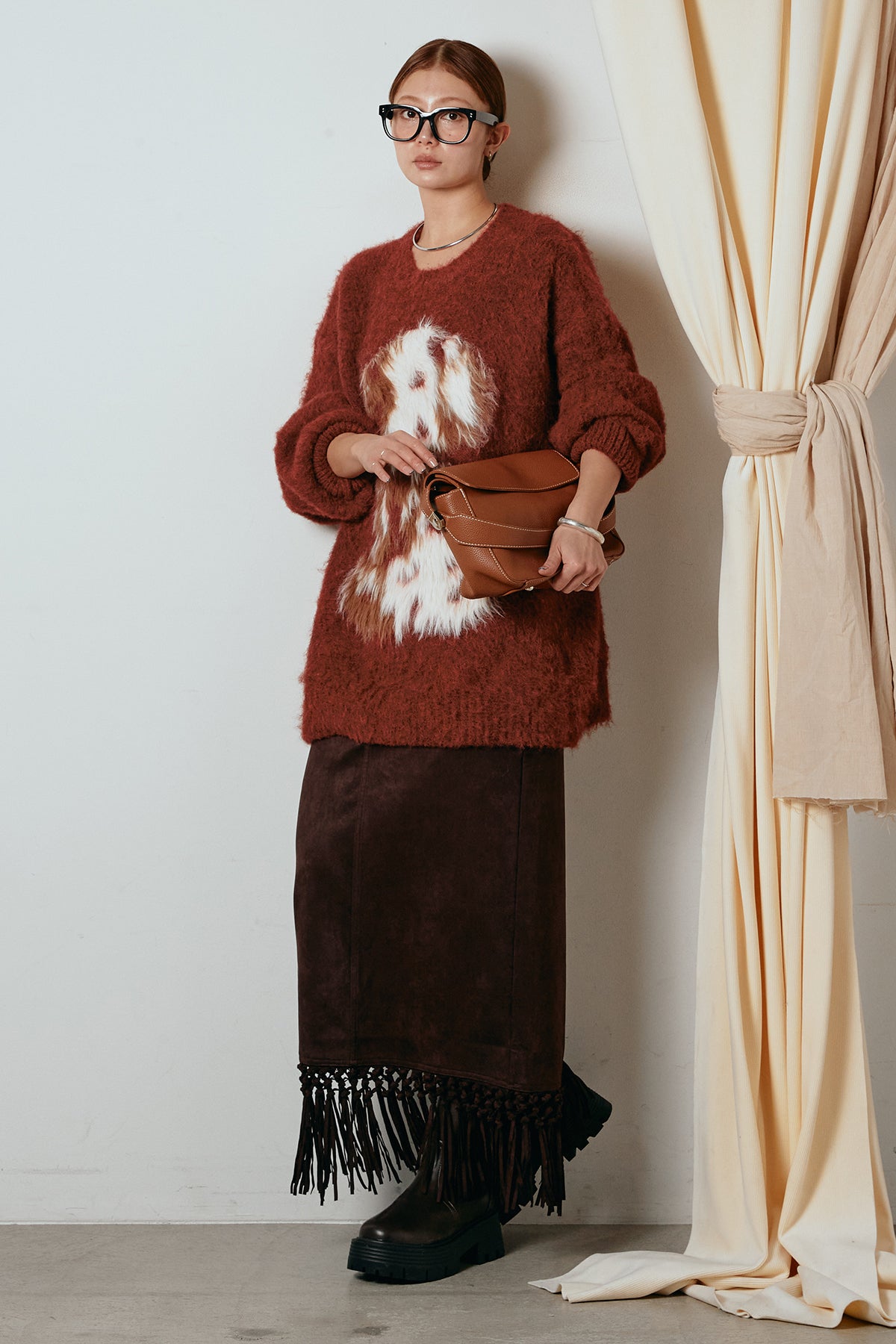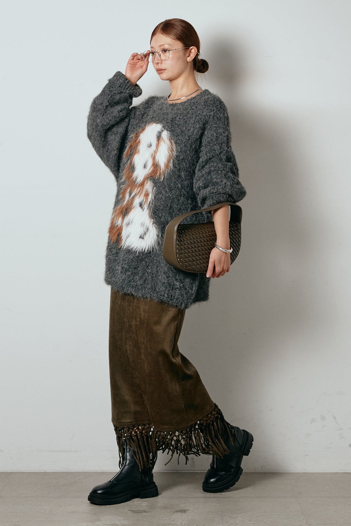 [SET]シャギーニュアンスアニマルニット+スウェードライク裾フリンジスカート(2set)