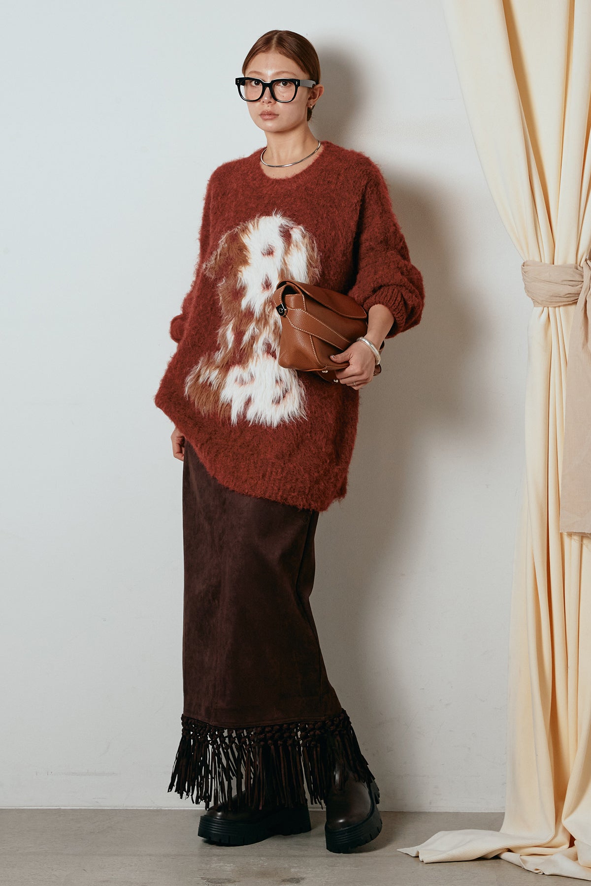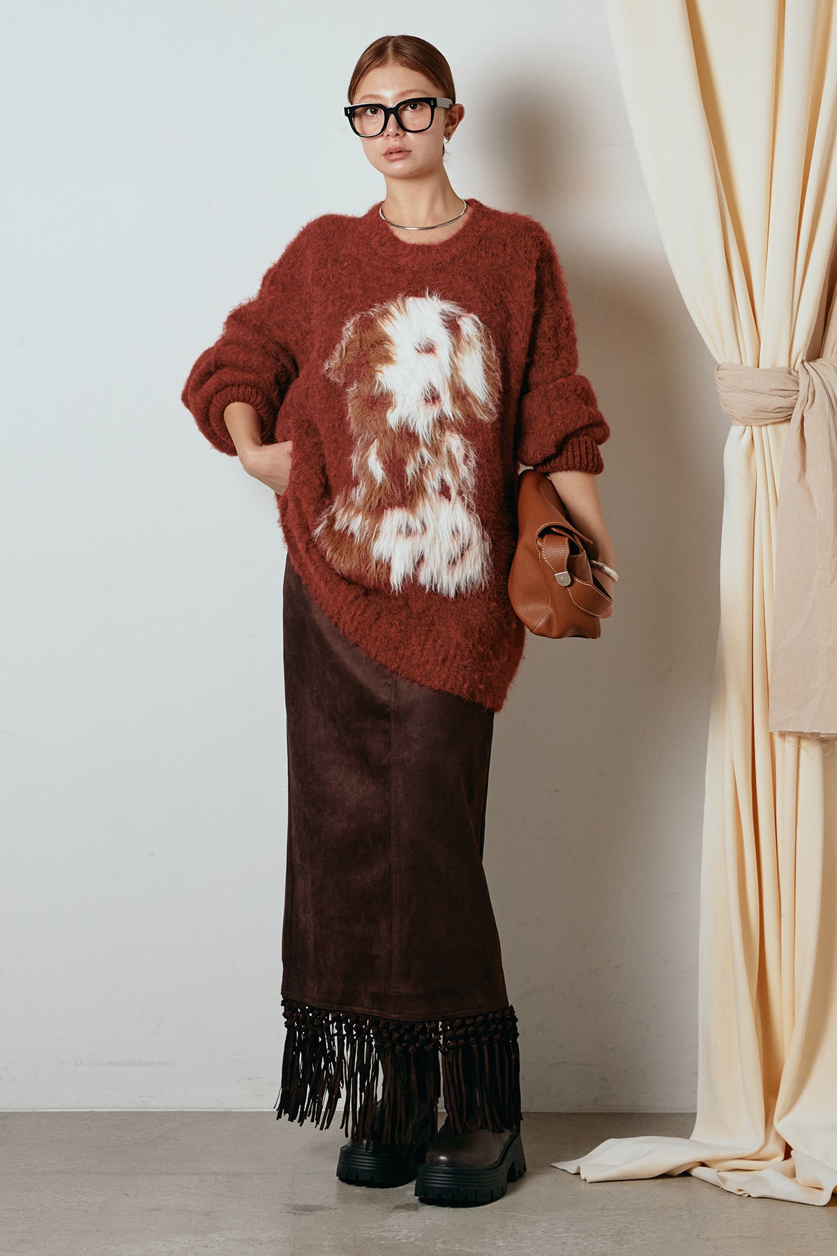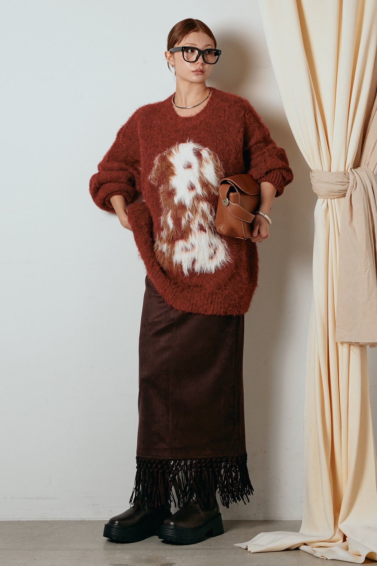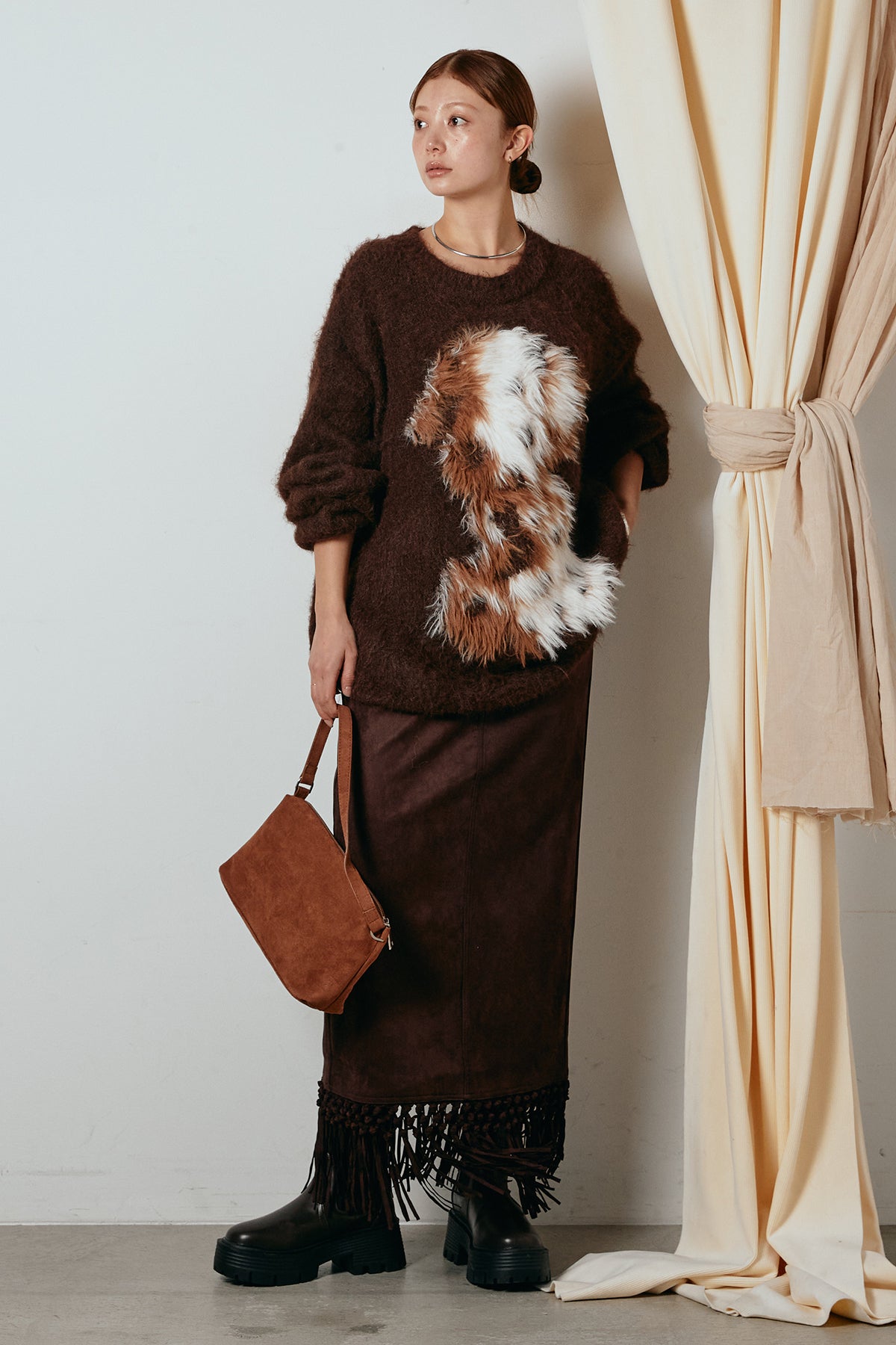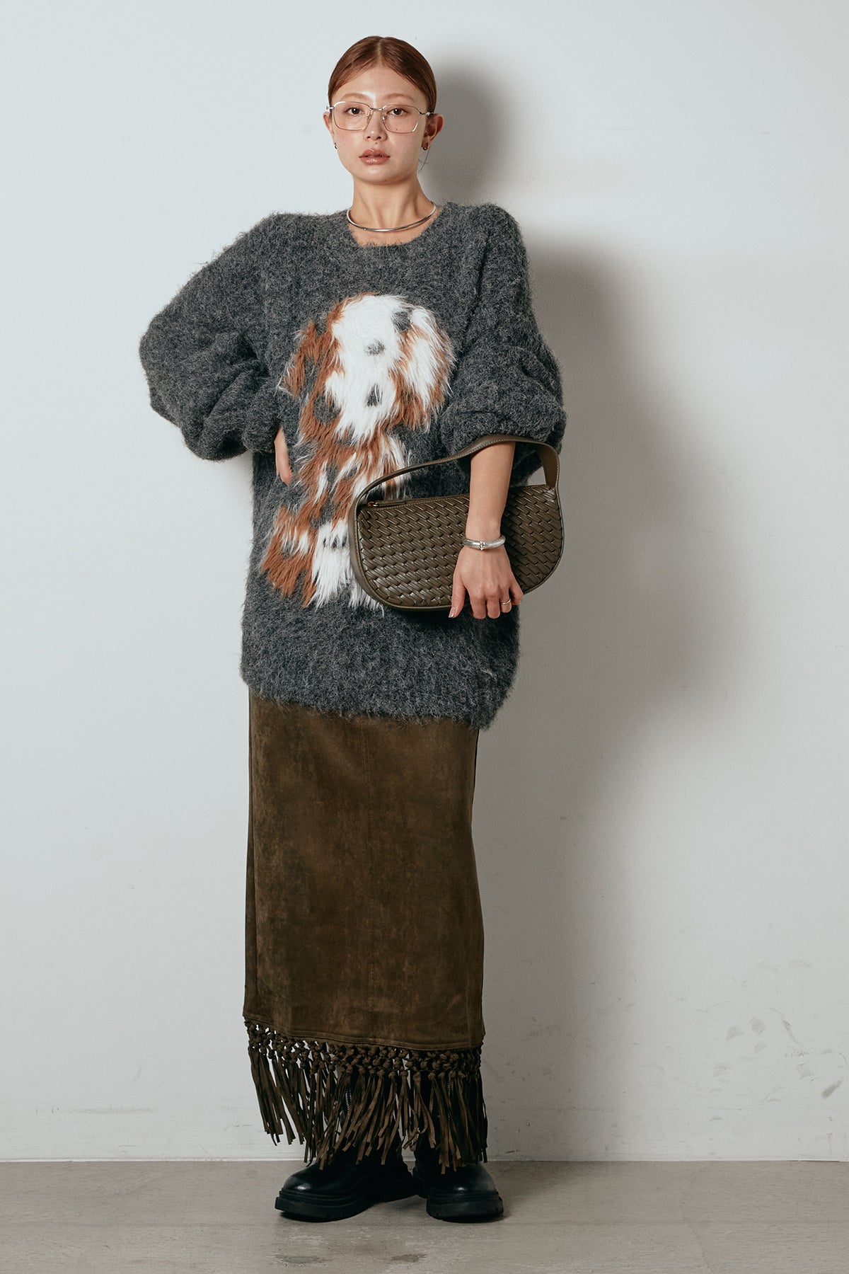 [SET]シャギーニュアンスアニマルニット+スウェードライク裾フリンジスカート(2set)