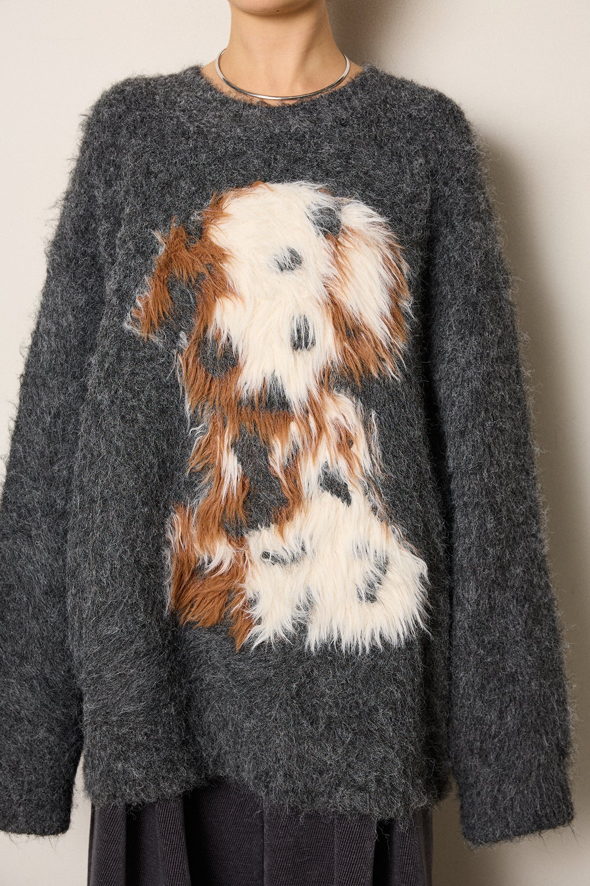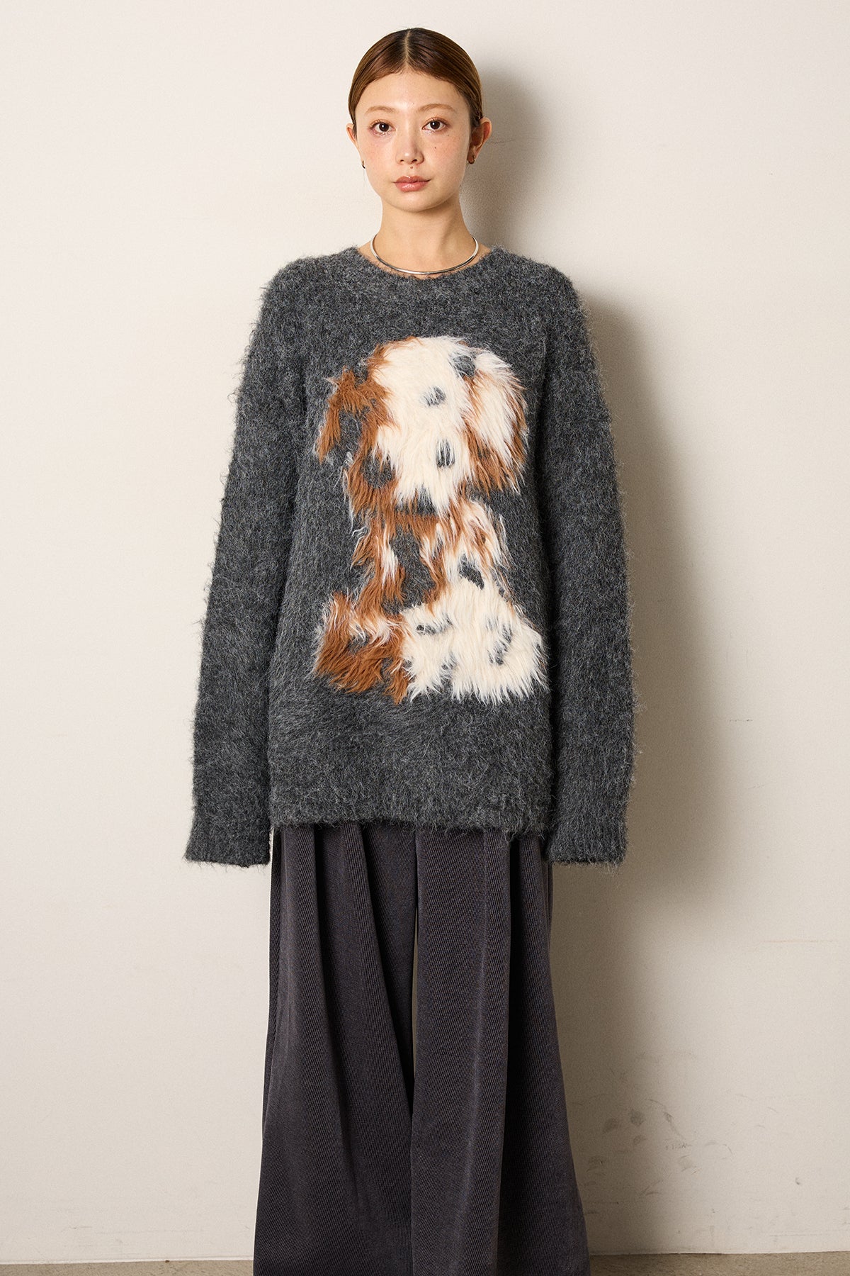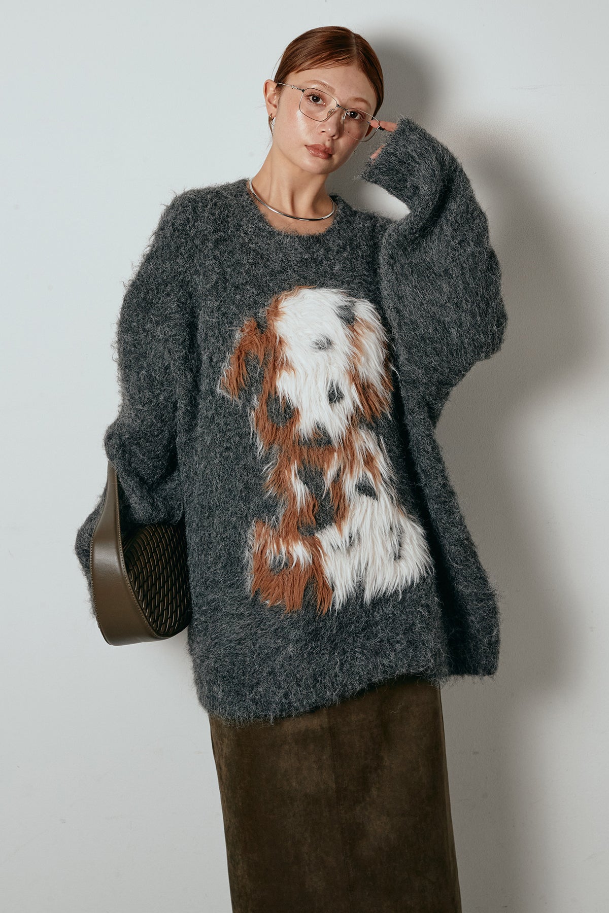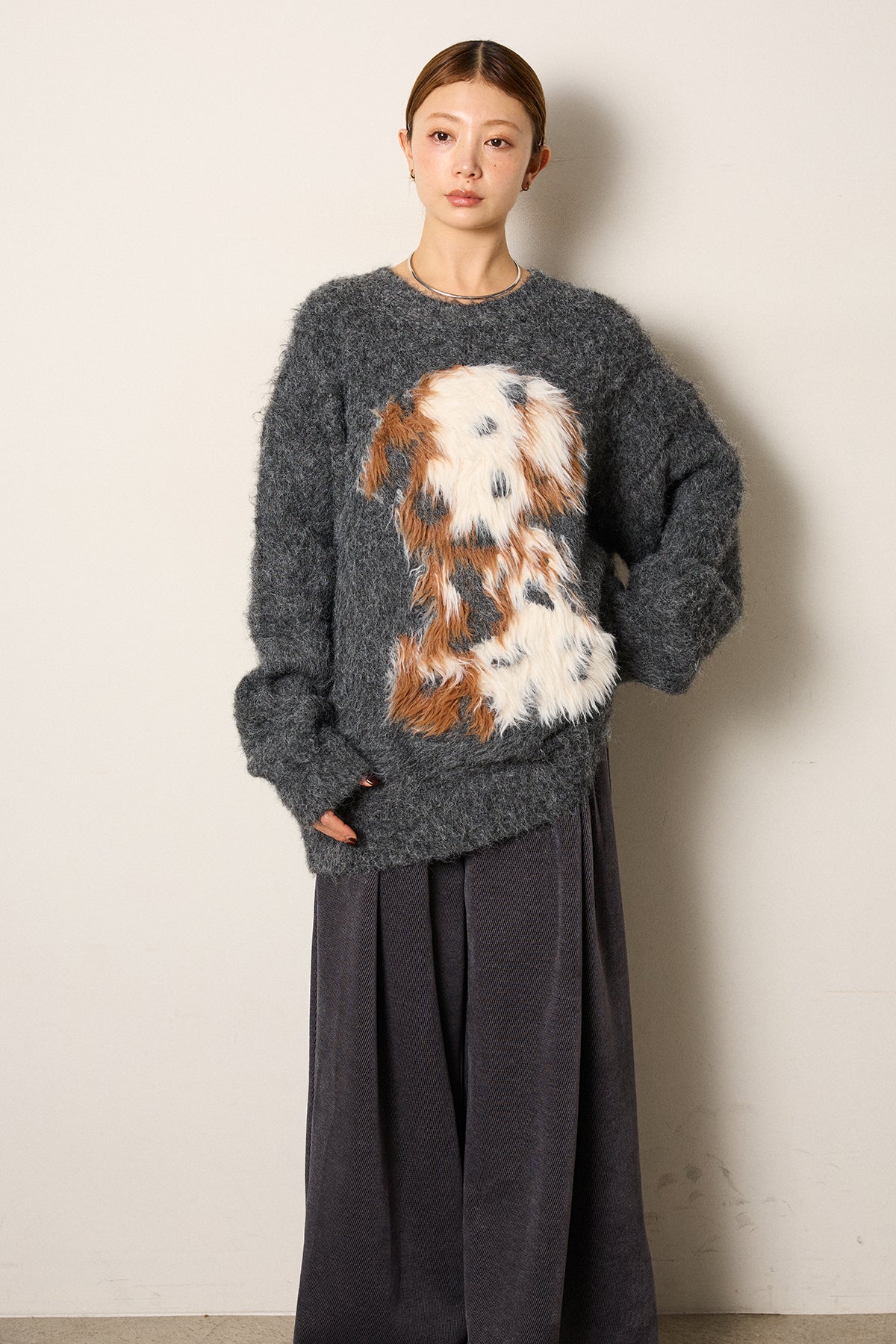 ふわふわとした質感が目を惹く、シャギー素材のアニマルモチーフニット。立体感のあるニュアンス柄が、遊び心のあるアクセントになりながらも大人っぽい雰囲気で着られる一枚。ゆるめのシルエットでラフに着こなせ、ロング丈がバランス良く体型をカバーします。シンプルなボトムに合わせるだけでスタイリングが完成する存在感のあるアイテムです。