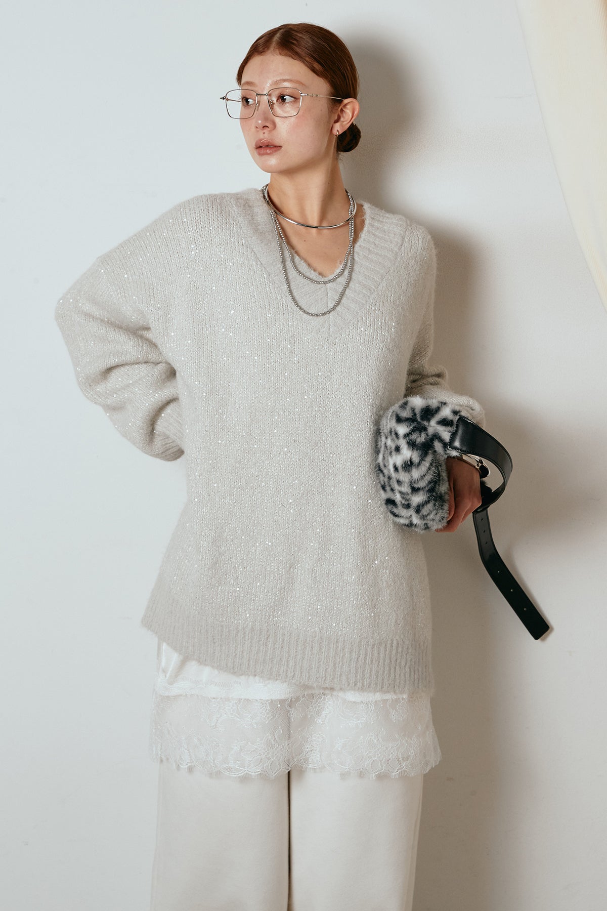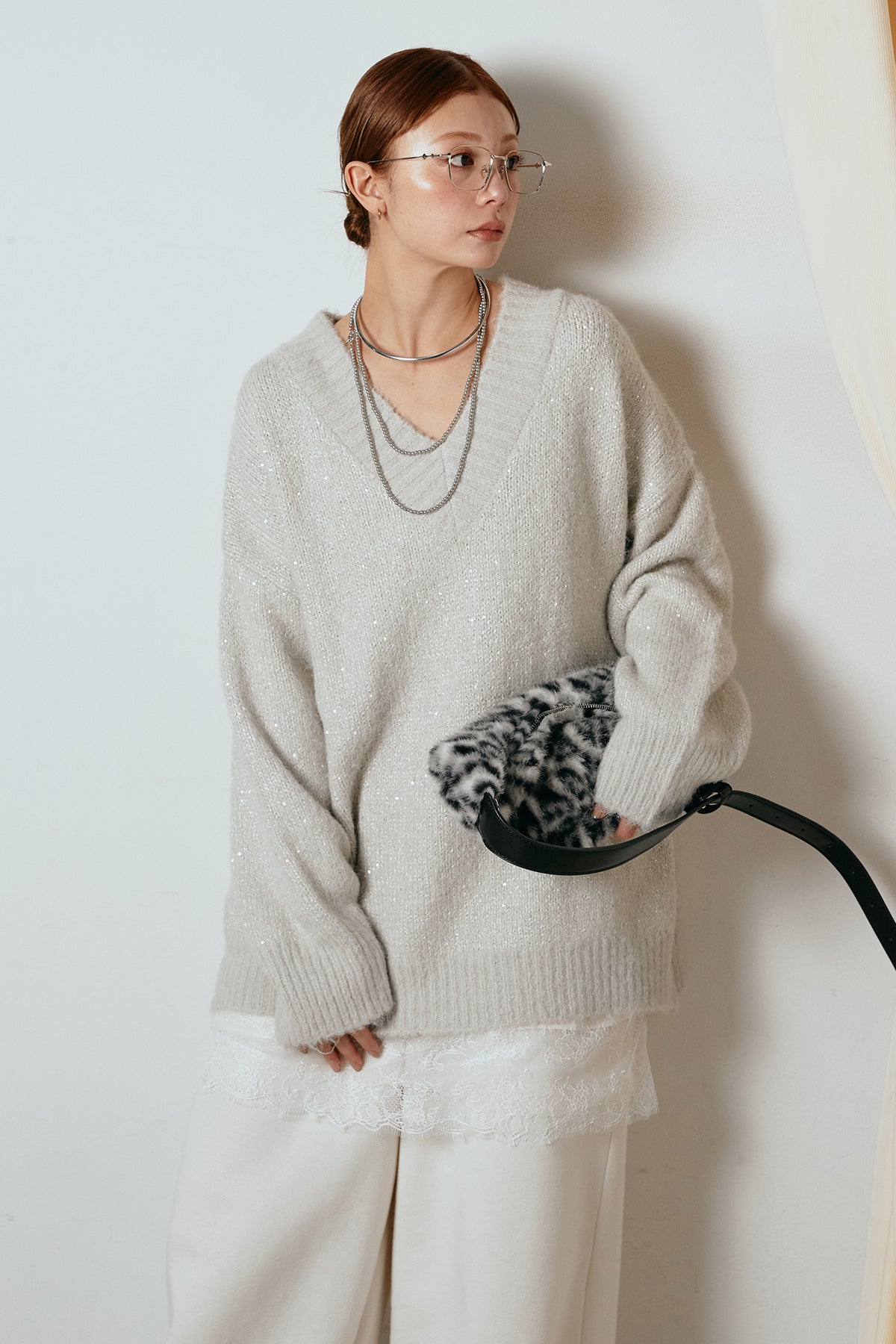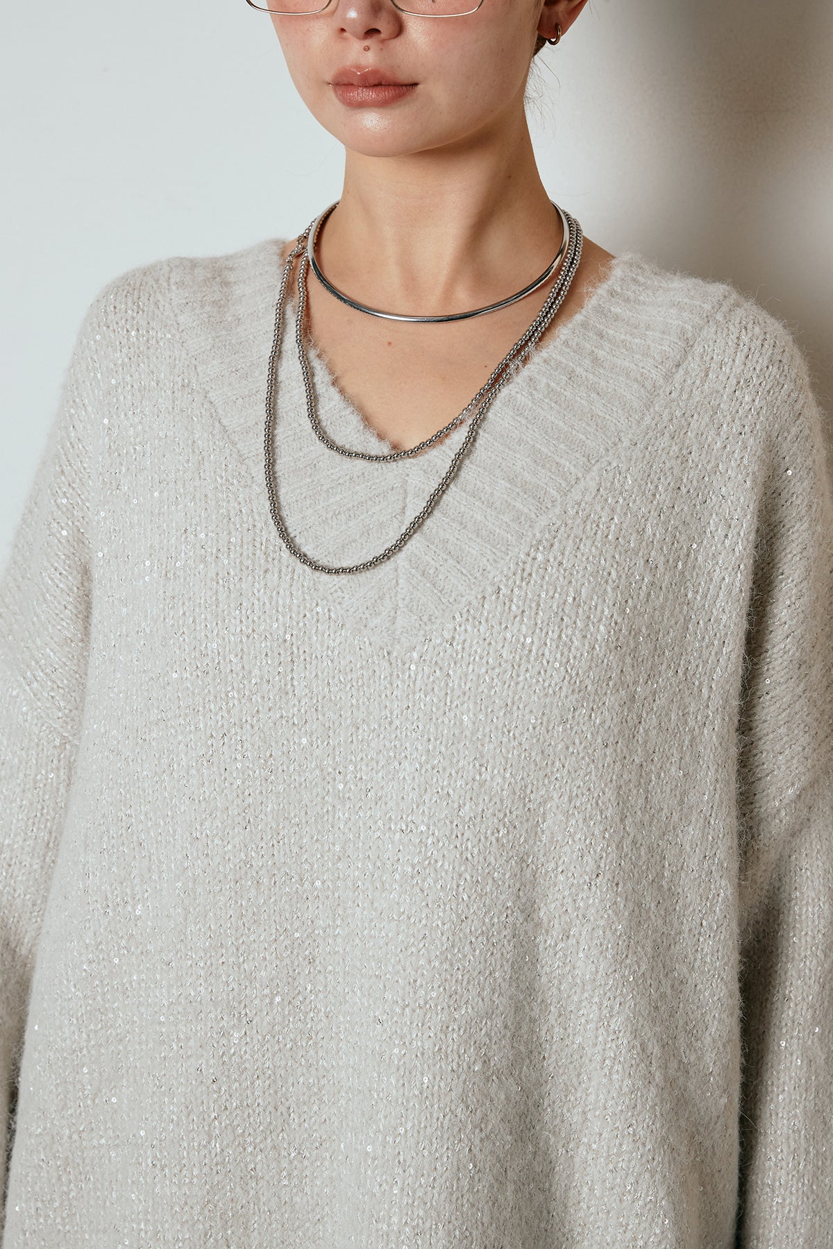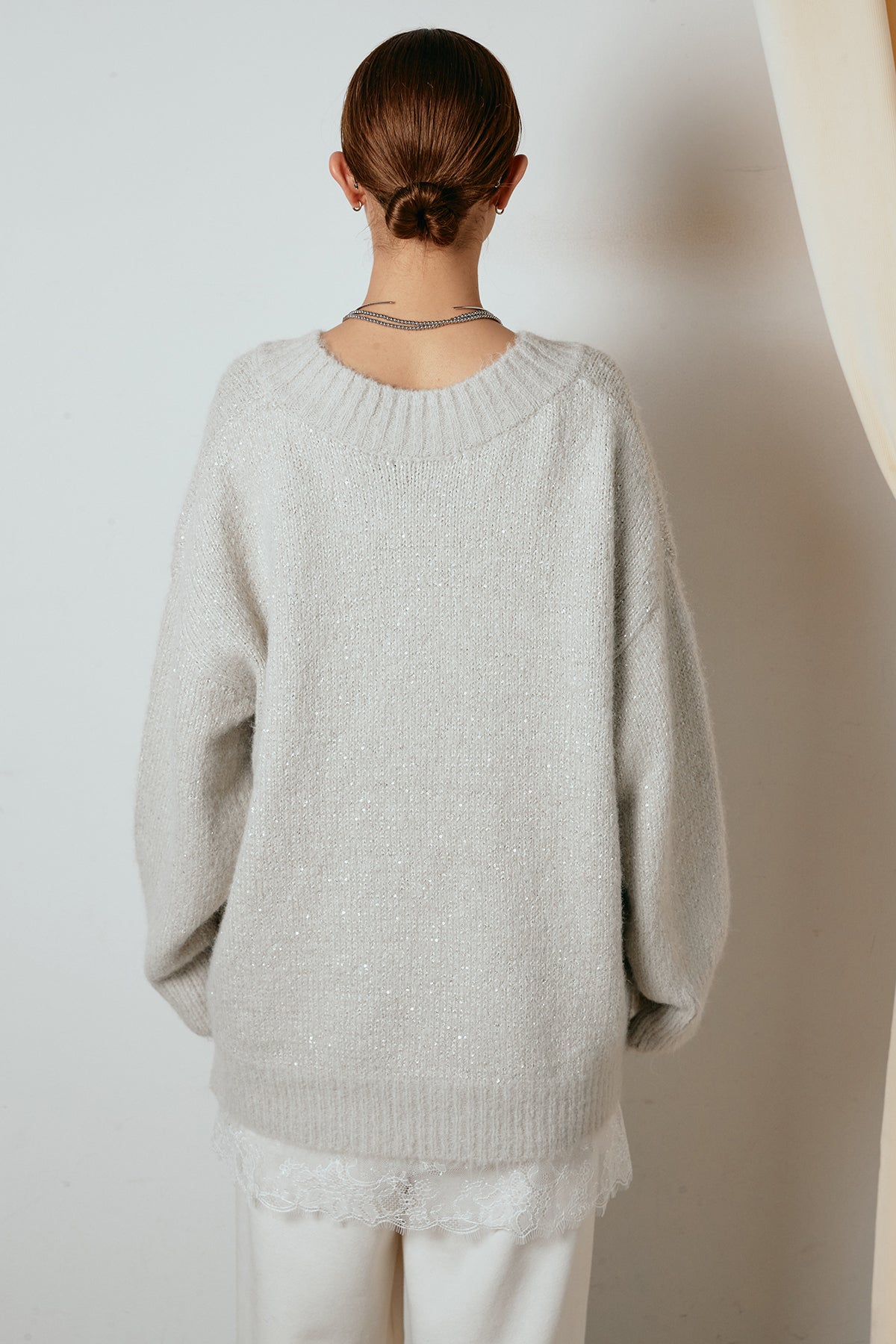 ラメ糸を織り交ぜた柔らかな風合いが、さりげない華やかさを添えるVネックニットトップス。ゆるく落ちるルーズシルエットが抜け感をつくり、1枚でこなれた印象に仕上がります。深めのVラインが顔まわりをすっきり見せ、レースやシャツとのレイヤードも楽しめるデザイン。デイリーから特別な日のスタイリングまで幅広く活躍する一枚です。