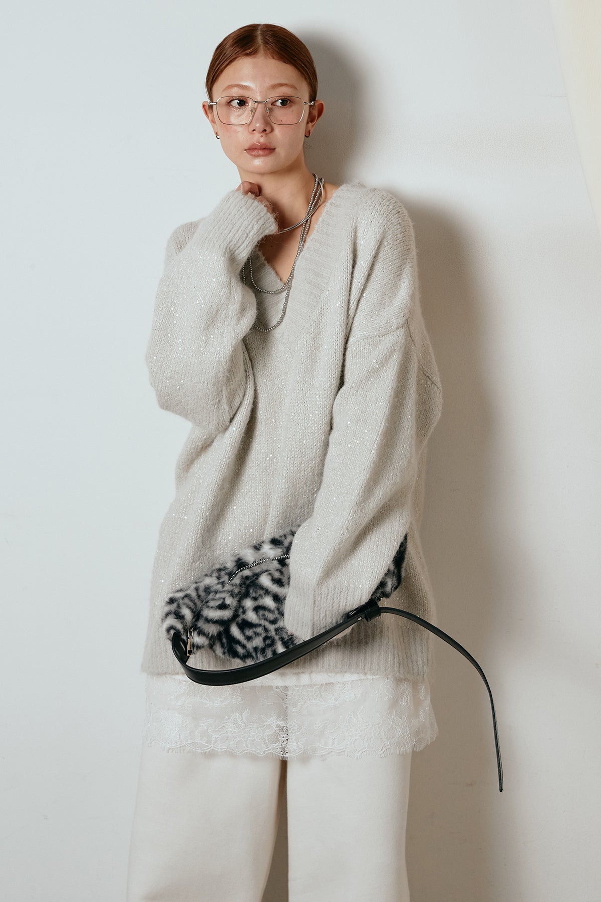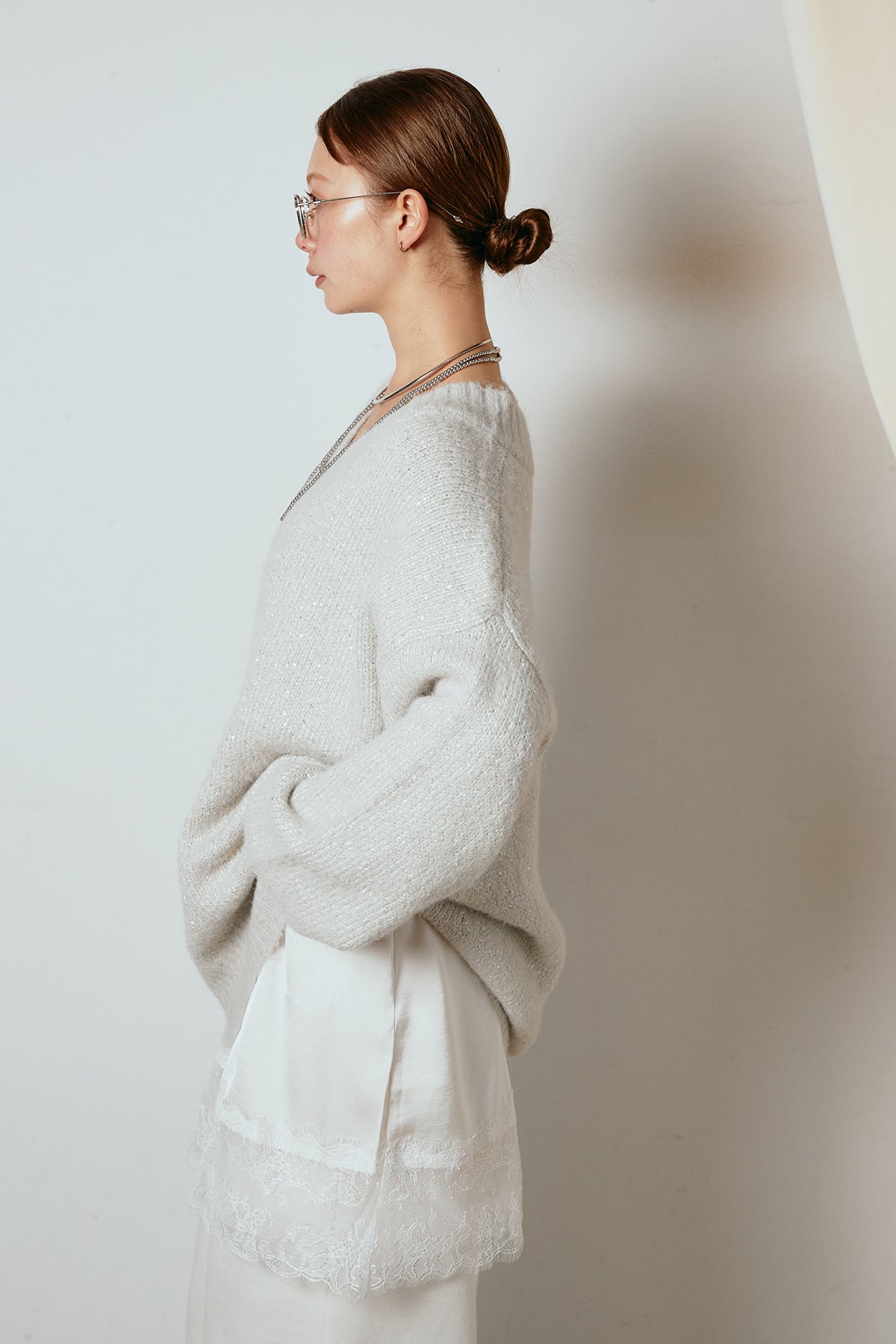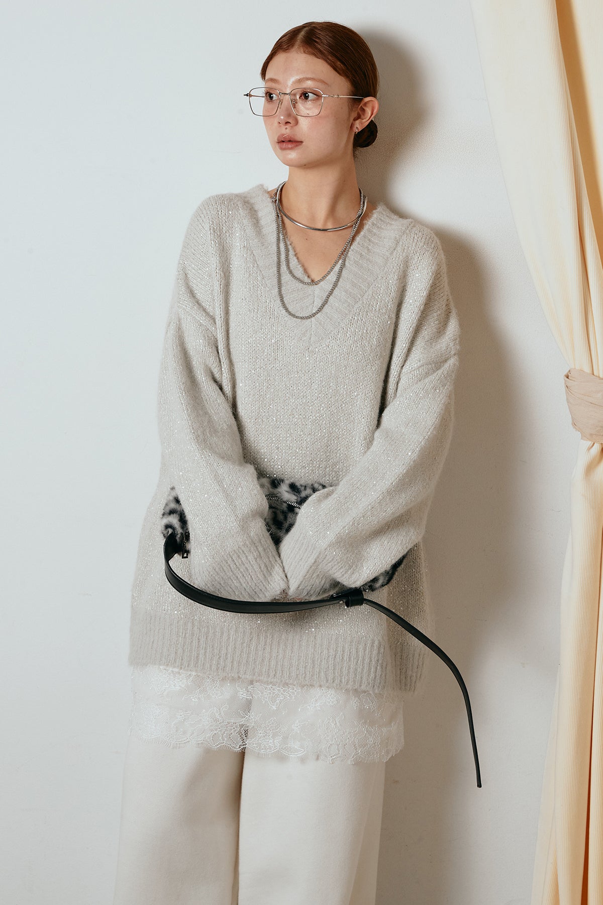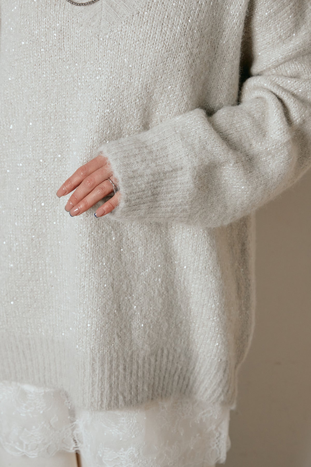 ラメ糸を織り交ぜた柔らかな風合いが、さりげない華やかさを添えるVネックニットトップス。ゆるく落ちるルーズシルエットが抜け感をつくり、1枚でこなれた印象に仕上がります。深めのVラインが顔まわりをすっきり見せ、レースやシャツとのレイヤードも楽しめるデザイン。デイリーから特別な日のスタイリングまで幅広く活躍する一枚です。