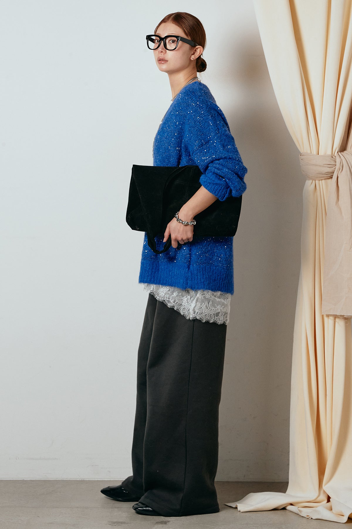 [SET]Vネックルーズラメニットトップス+裏起毛スウェットワイドパンツ(2set)
