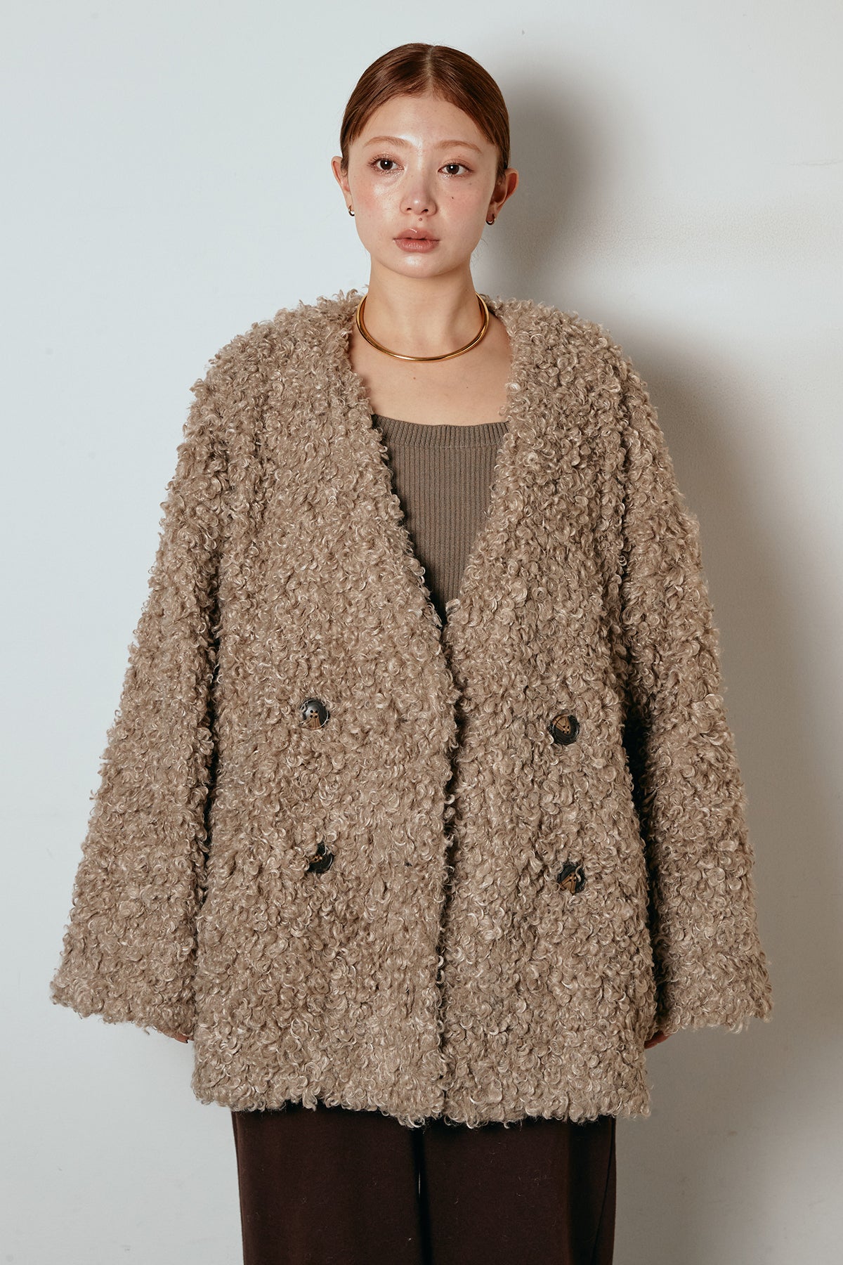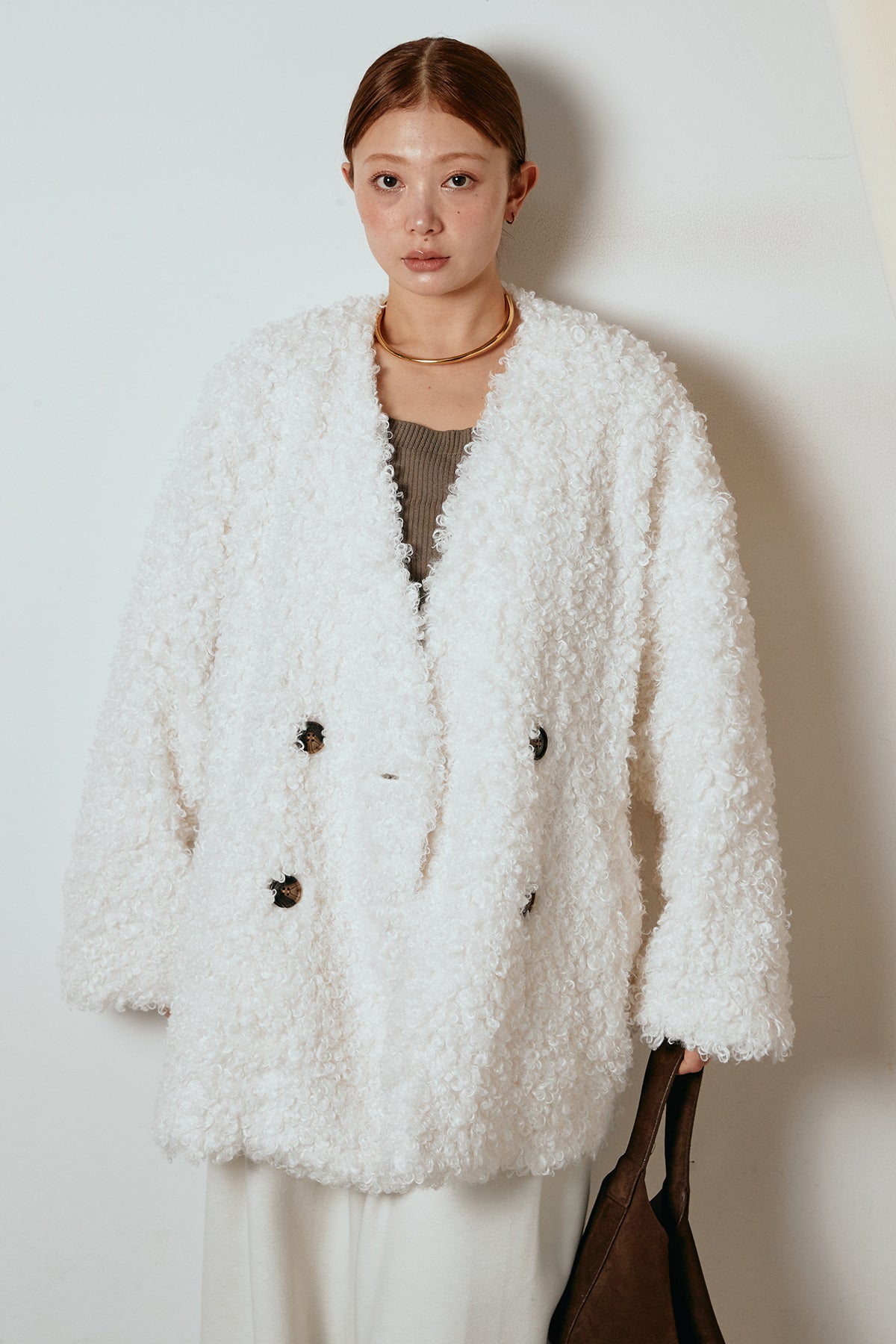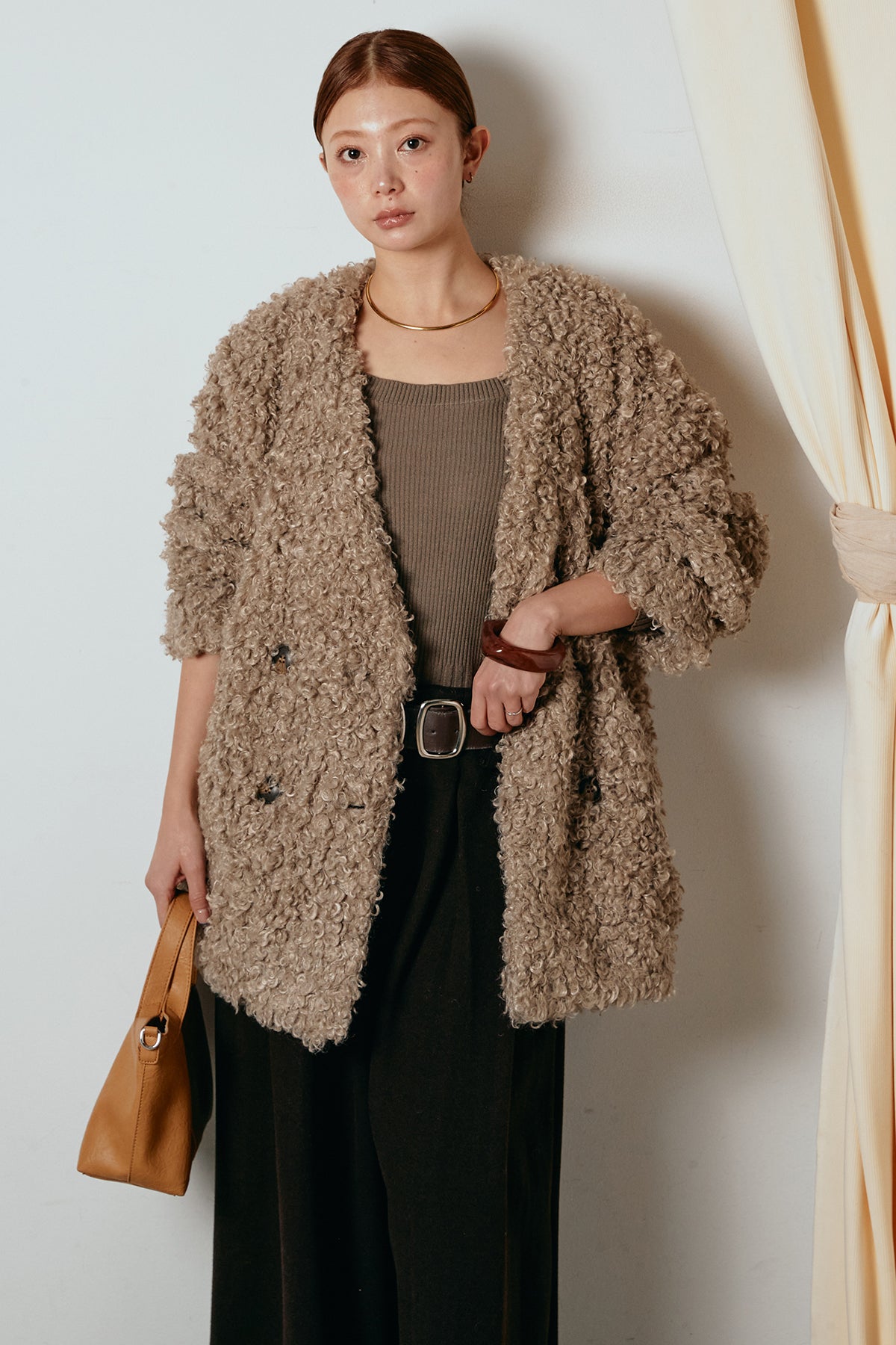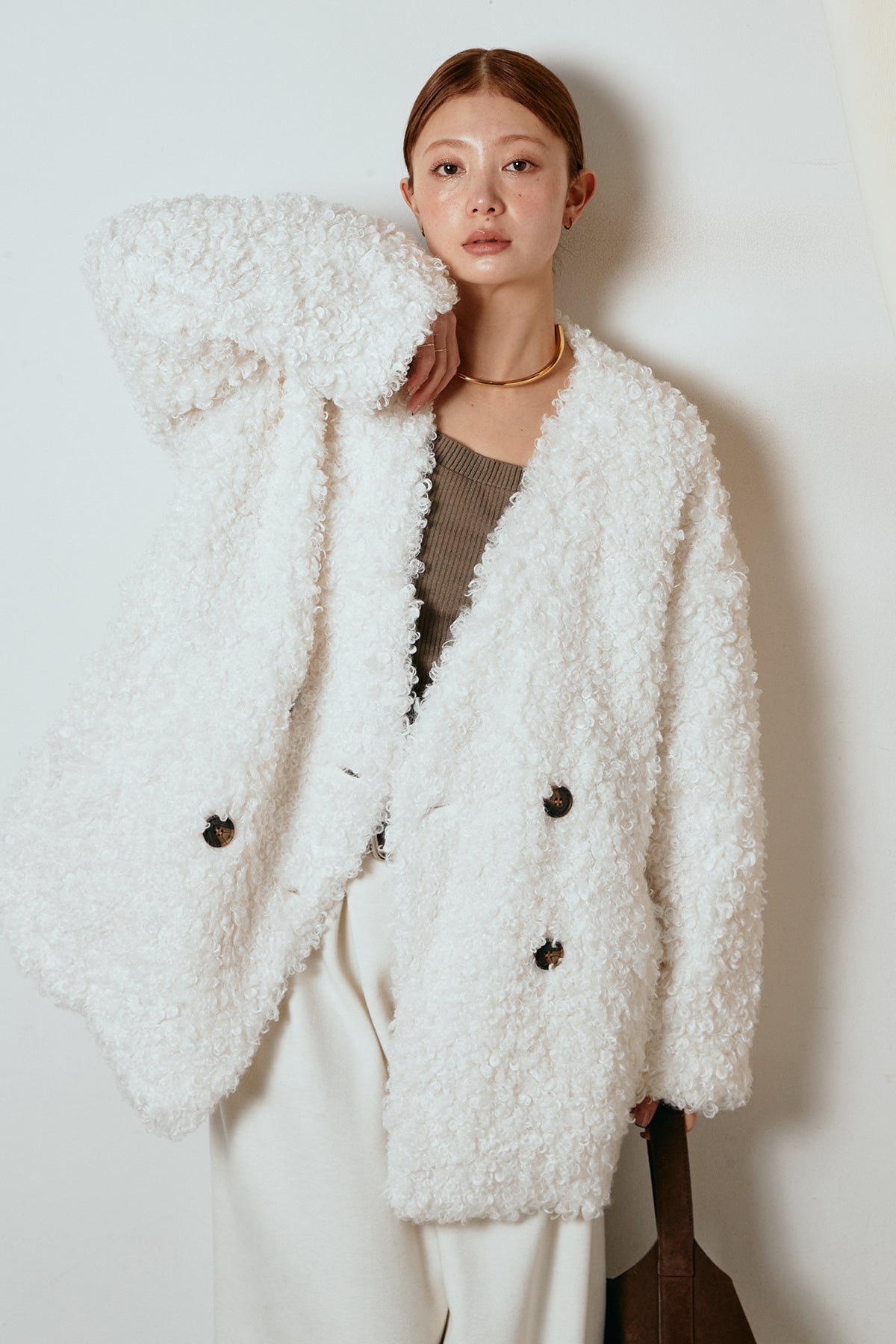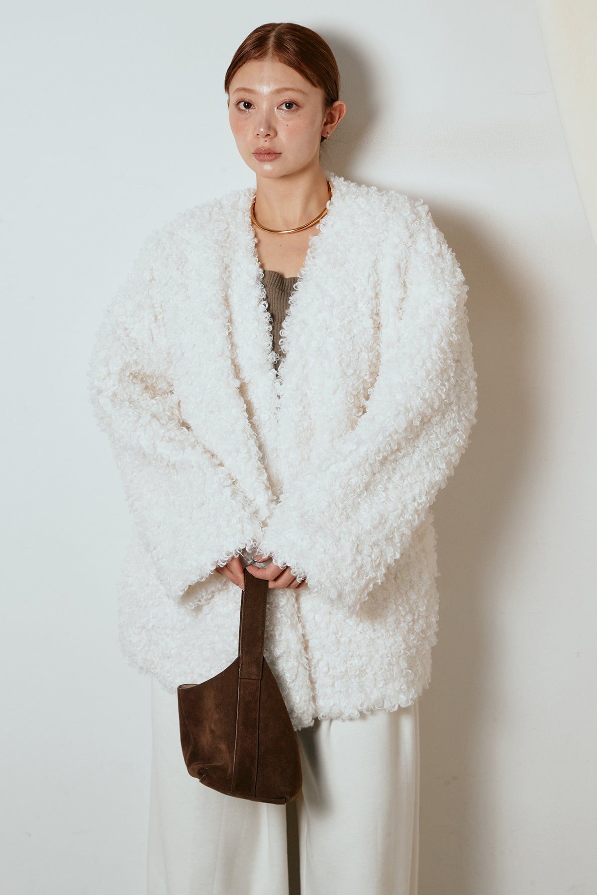 ふんわりとしたシープ調のファーが、優しいボリューム感とあたたかなムードを演出するファージャケット。柔らかな毛足が立体的な表情をつくり、シンプルなスタイリングにも存在感を添えます。前立てはすっきりとしたV開きで、インナーを問わず合わせやすいバランスに。軽やかな着心地ながらもしっかりと暖かく、デイリーからお出かけまで幅広く活躍。羽織るだけで季節感のあるスタイルが完成する一枚です。