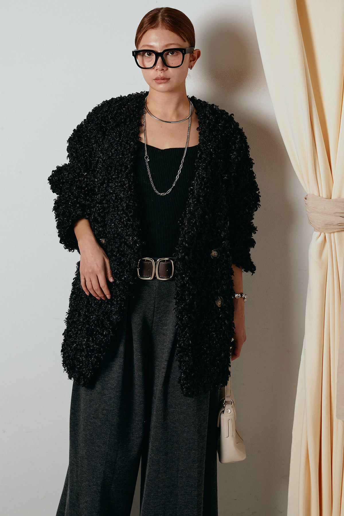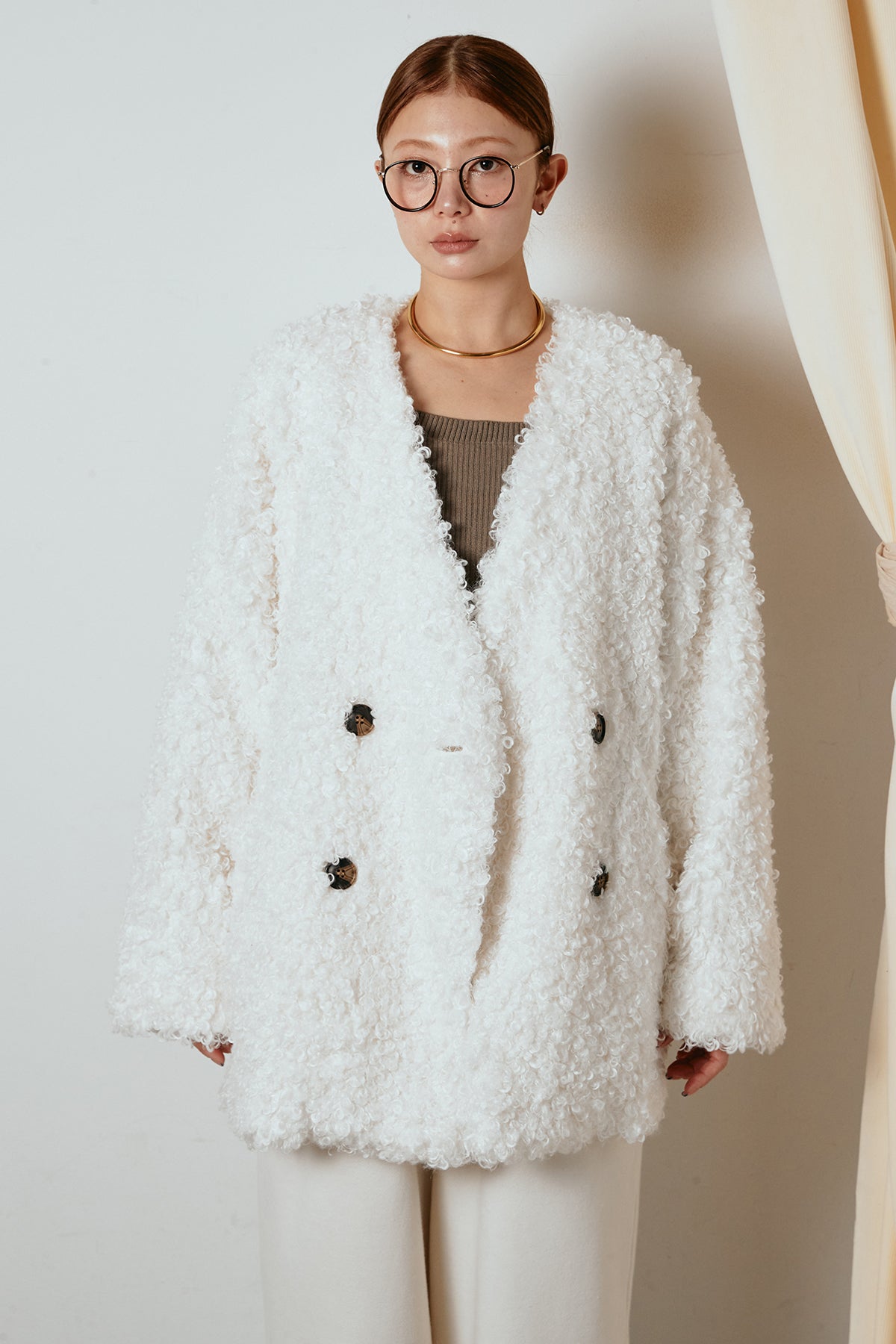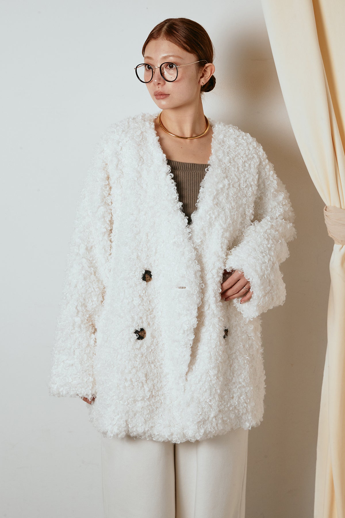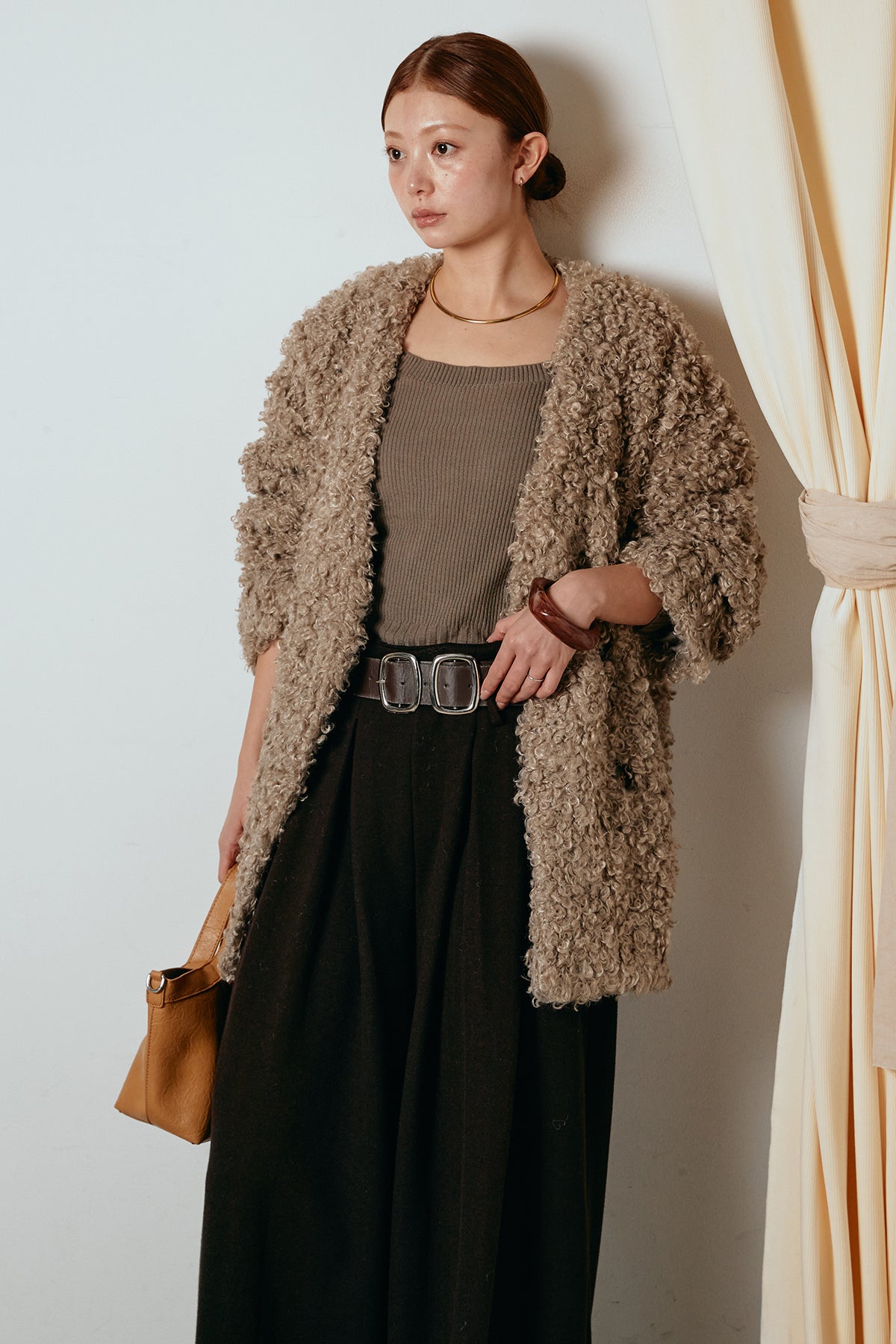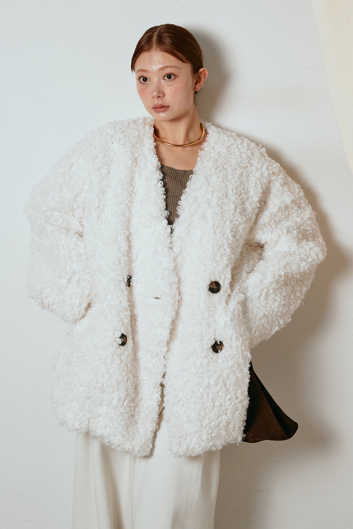 ふんわりとしたシープ調のファーが、優しいボリューム感とあたたかなムードを演出するファージャケット。柔らかな毛足が立体的な表情をつくり、シンプルなスタイリングにも存在感を添えます。前立てはすっきりとしたV開きで、インナーを問わず合わせやすいバランスに。軽やかな着心地ながらもしっかりと暖かく、デイリーからお出かけまで幅広く活躍。羽織るだけで季節感のあるスタイルが完成する一枚です。