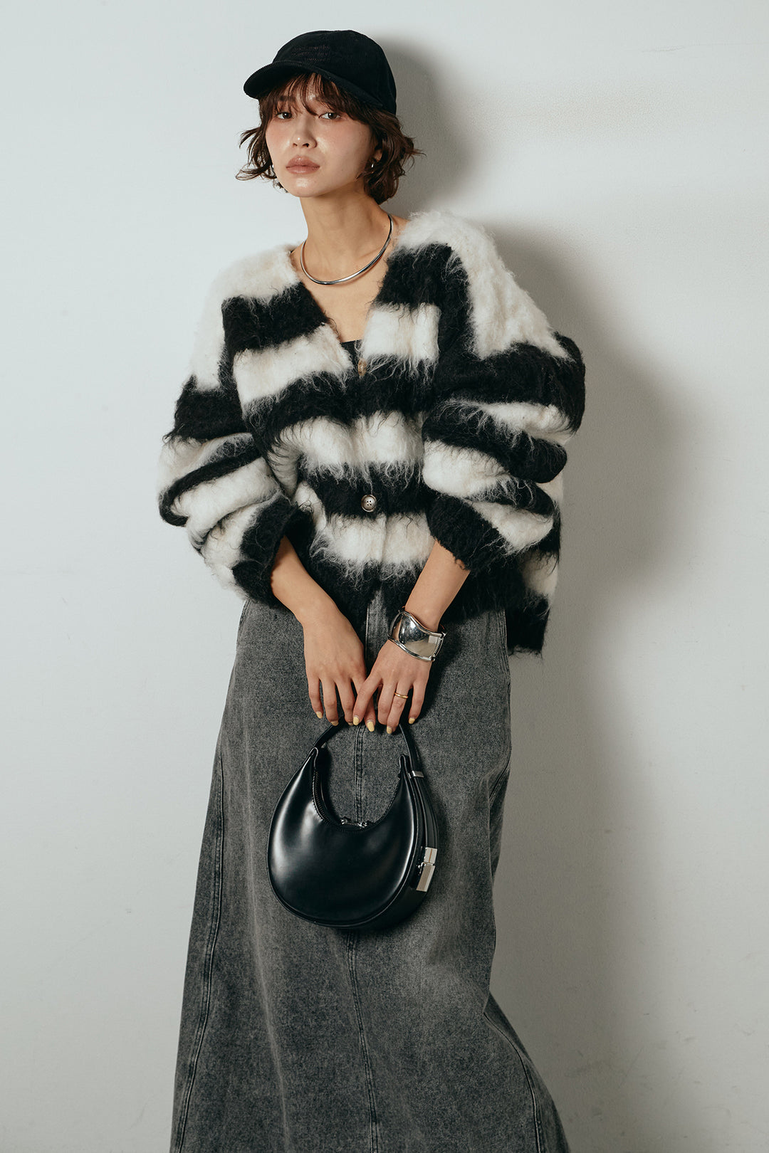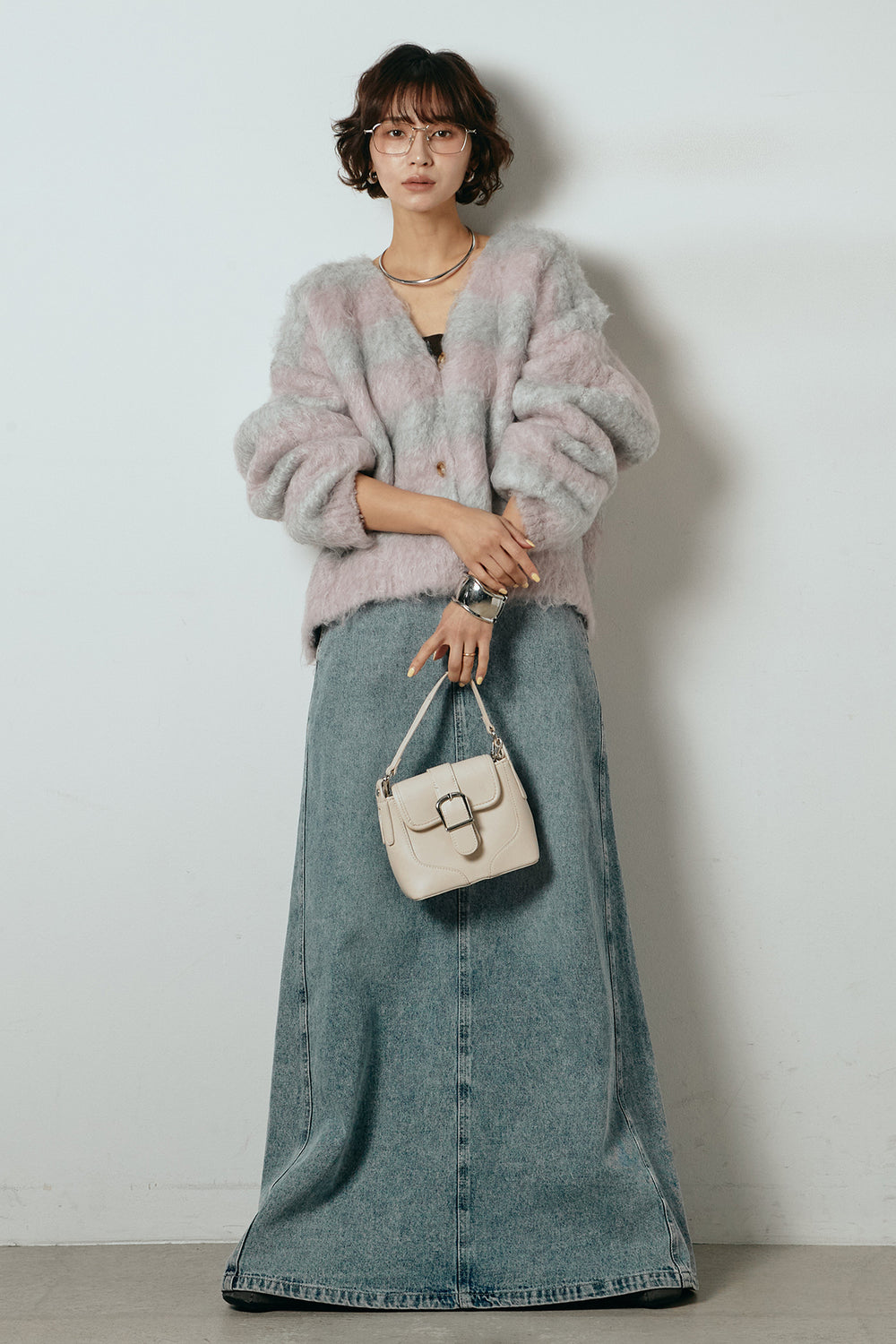 [SET]シャギーボーダー柄ニットカーディガン+デニムロングフレアスカート(2set)