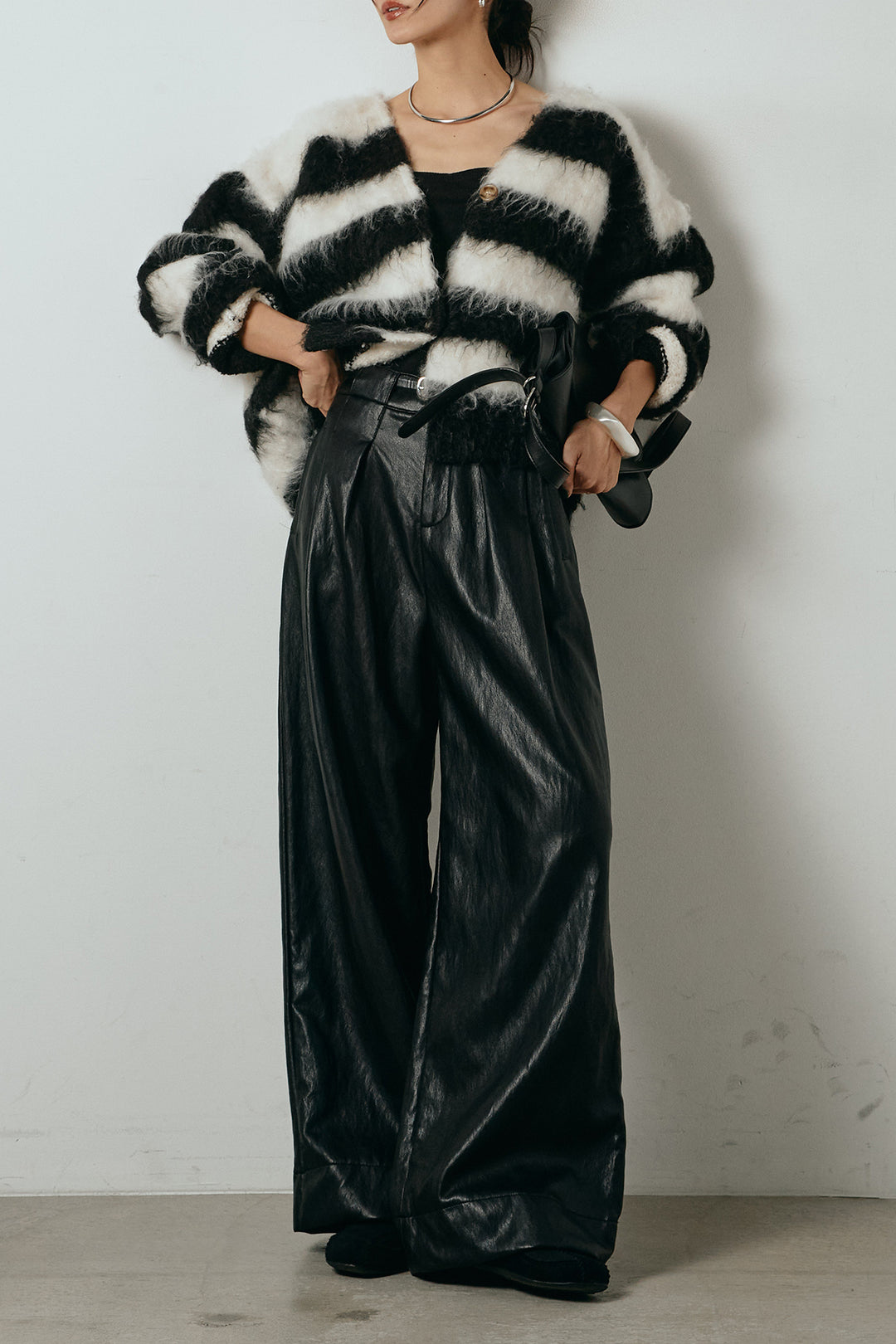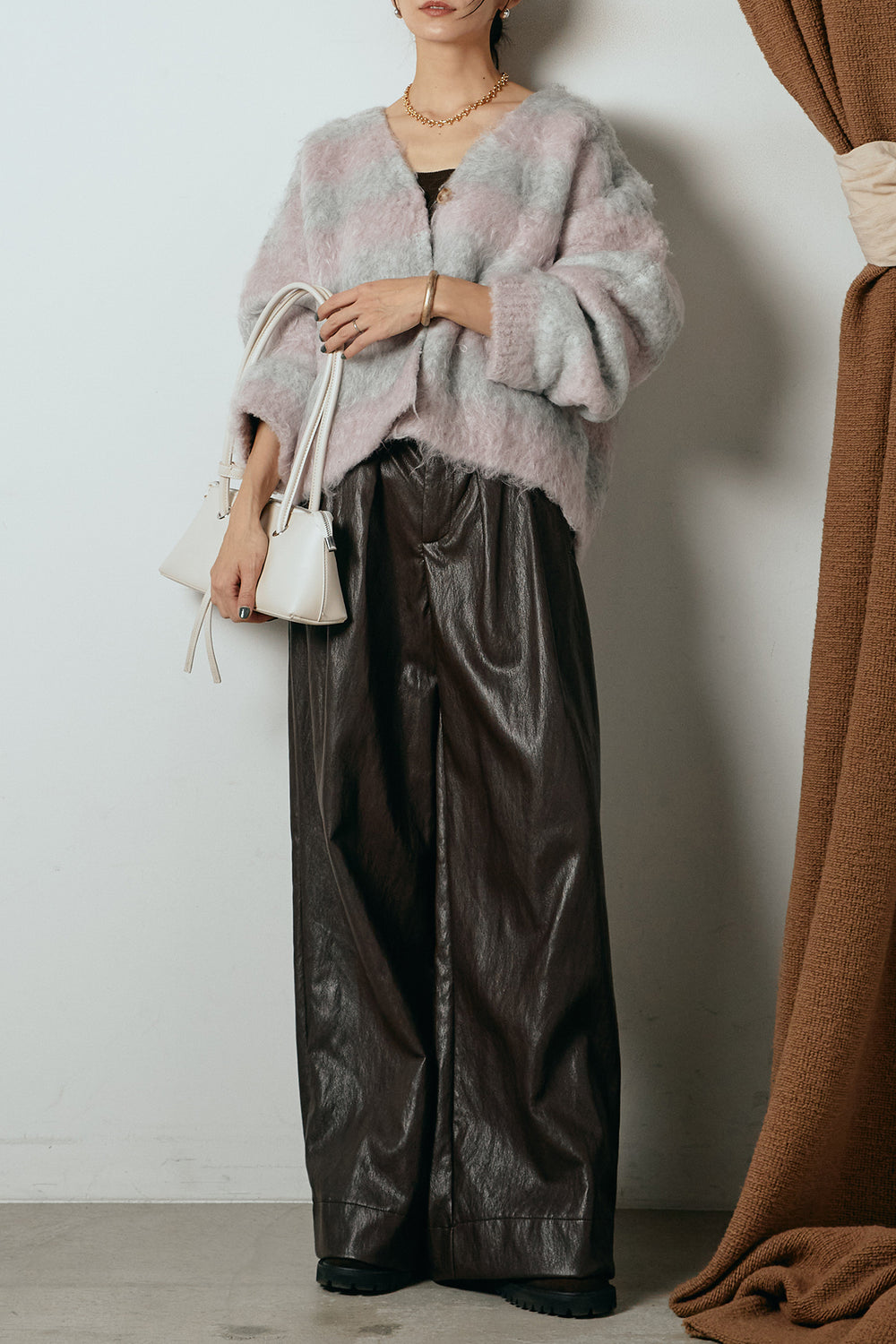 [SET]シャギーボーダー柄ニットカーディガン+ベルト付きレザーライクタックパンツ(2set)