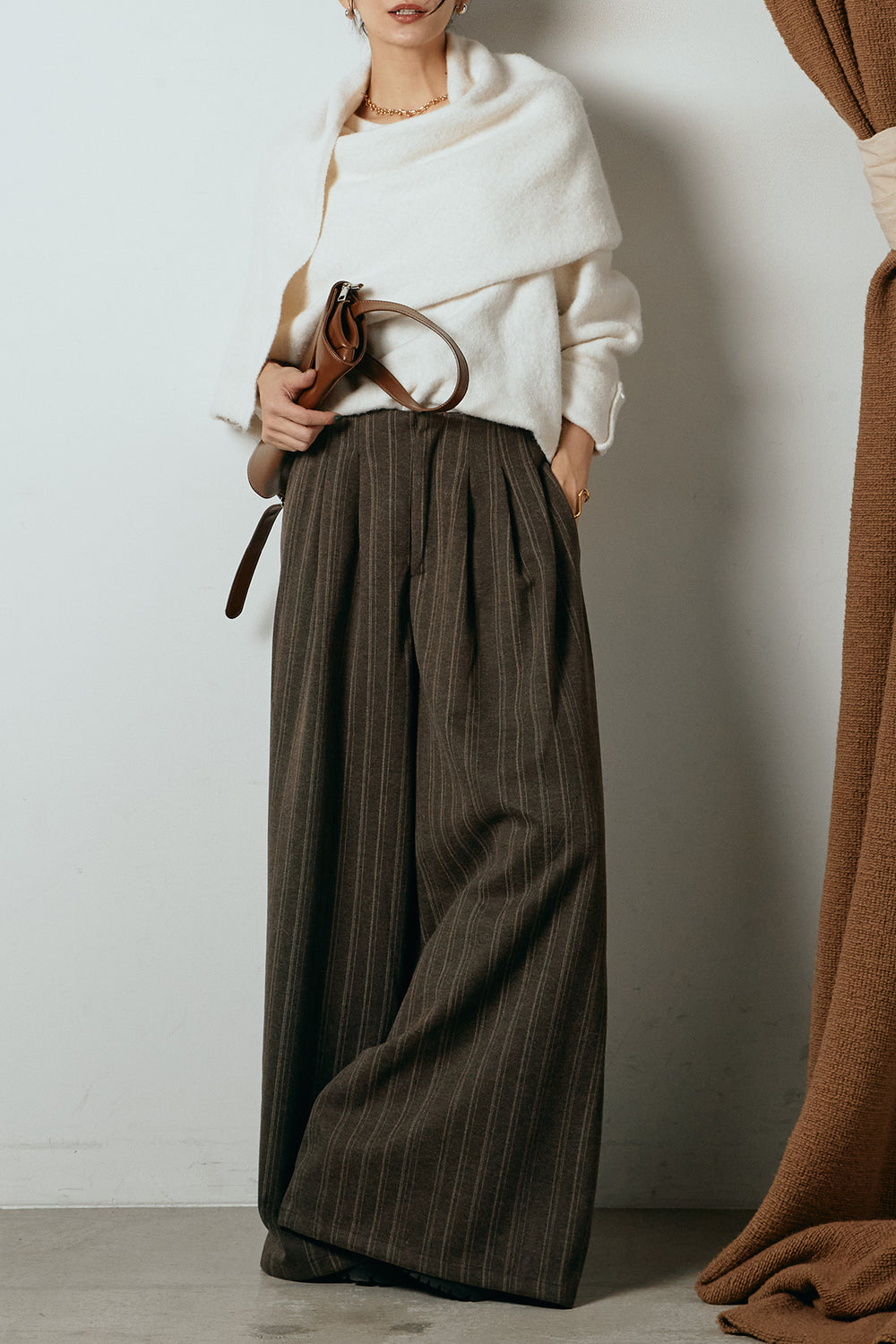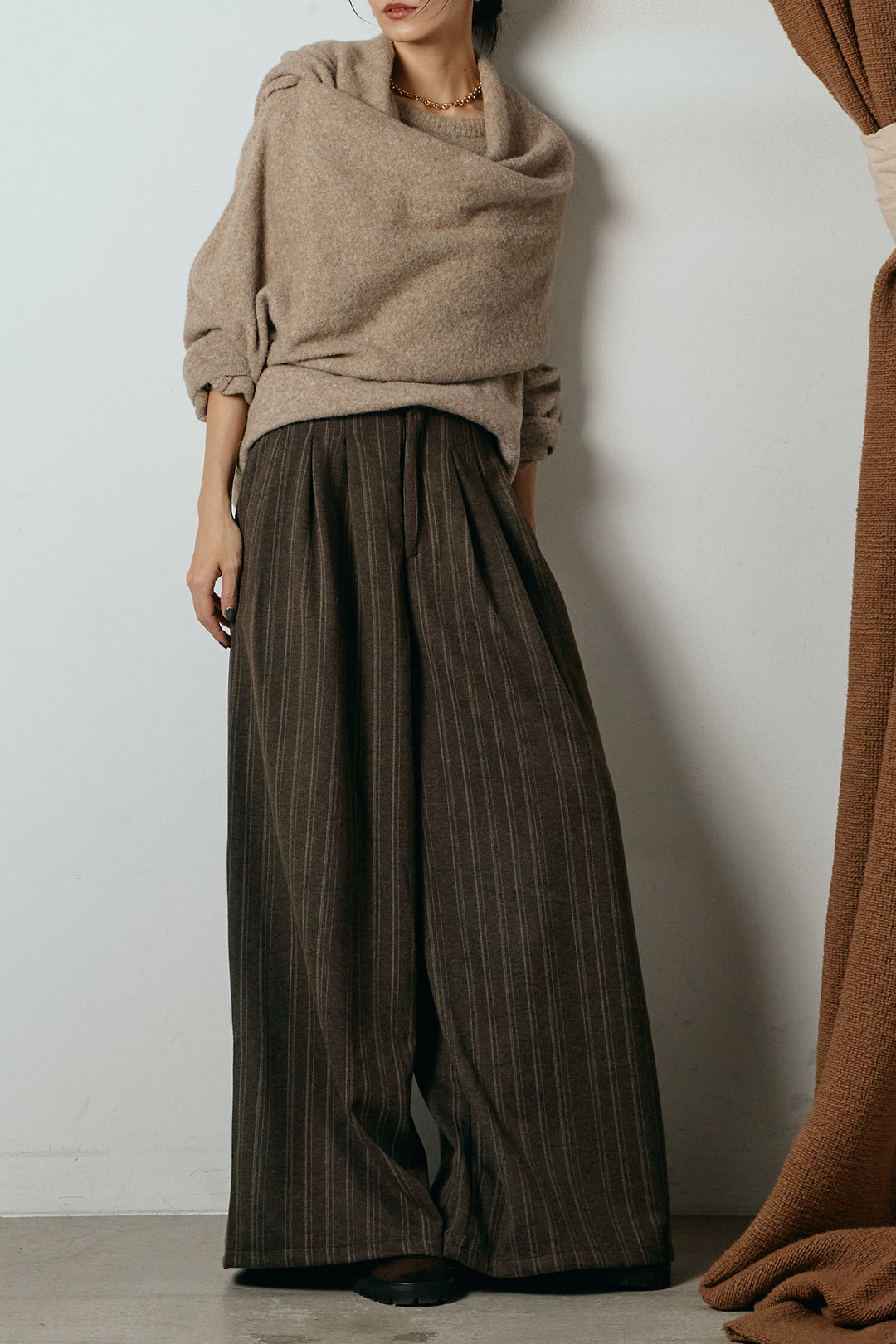 [SET]ネック巻きデザインニットトップス+タック入りマルチストライプ柄ワイドパンツ(2set)