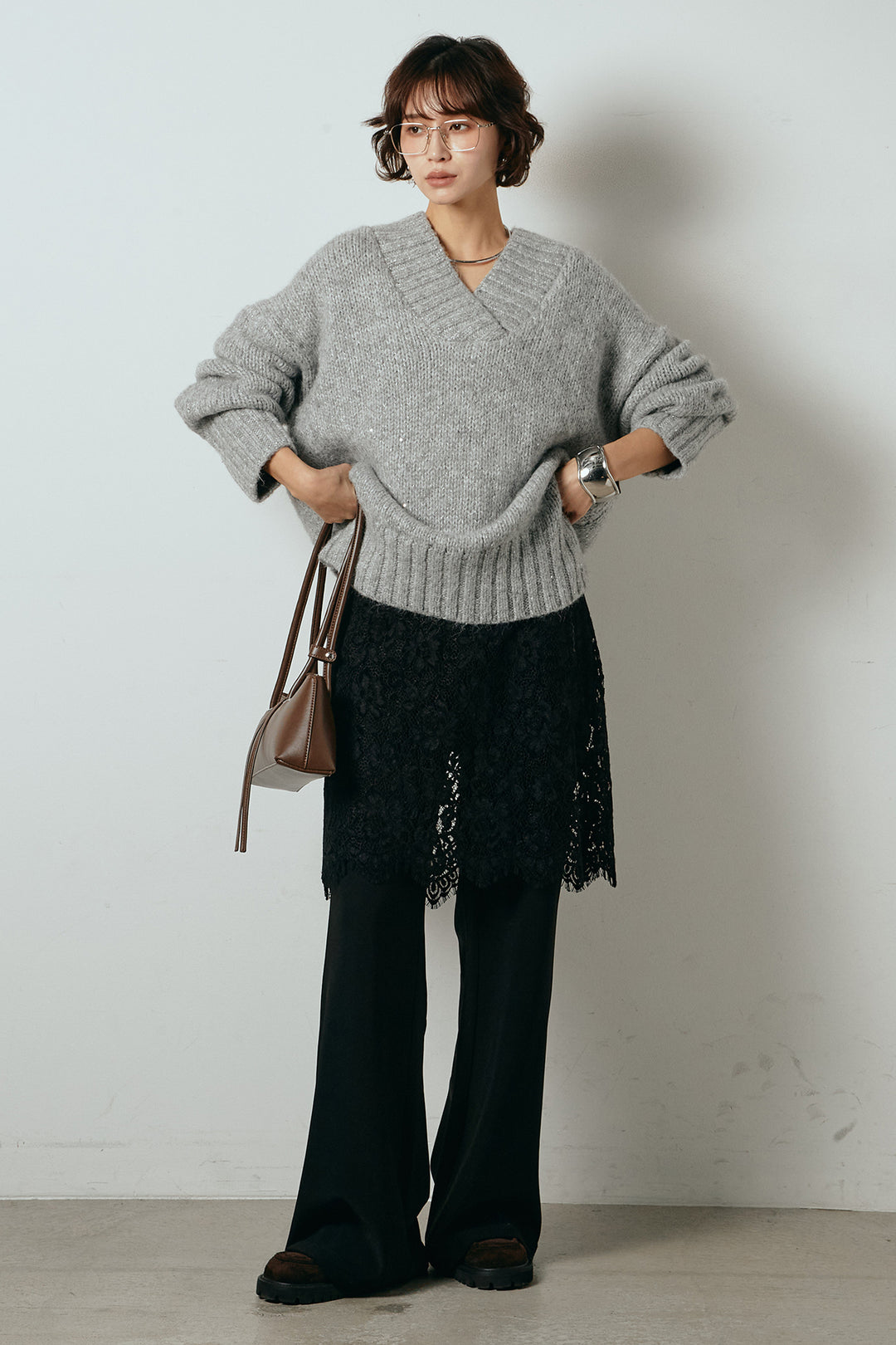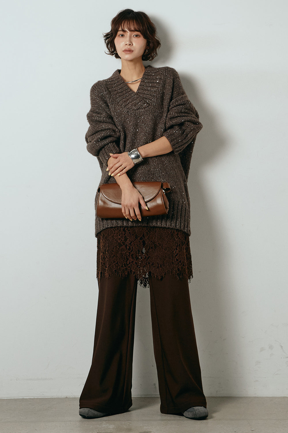 [SET]Vネックラメニットトップス+レース刺繍レイヤードフレアパンツ(2set)