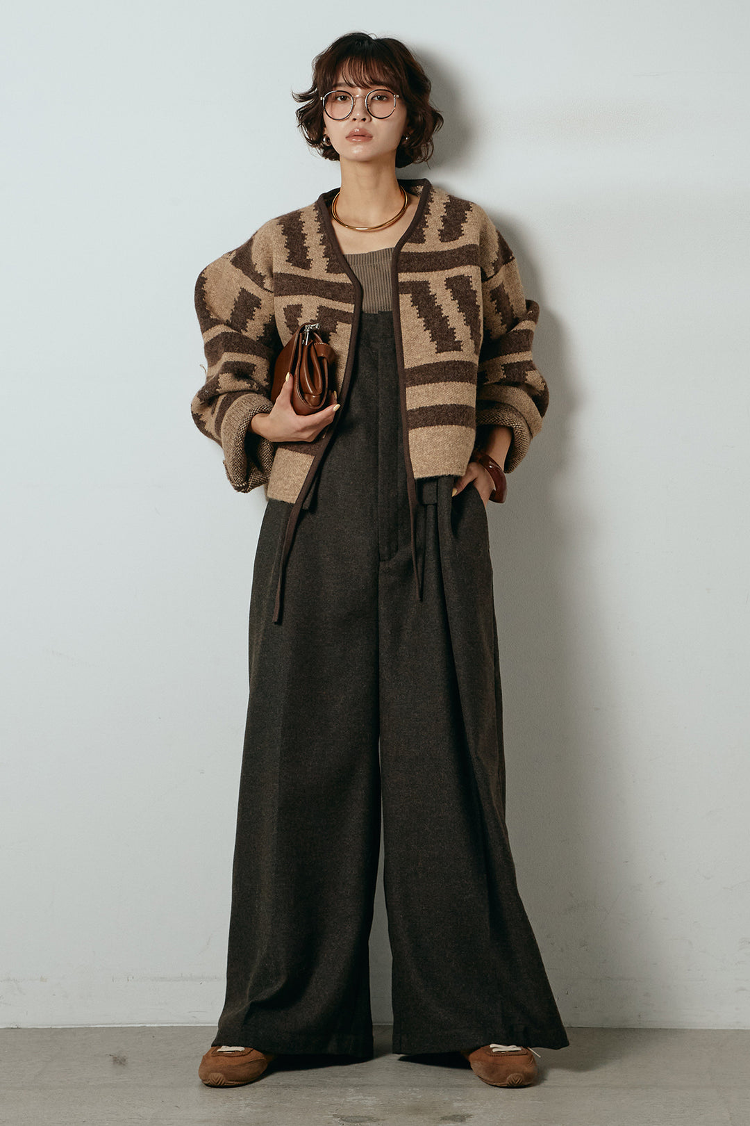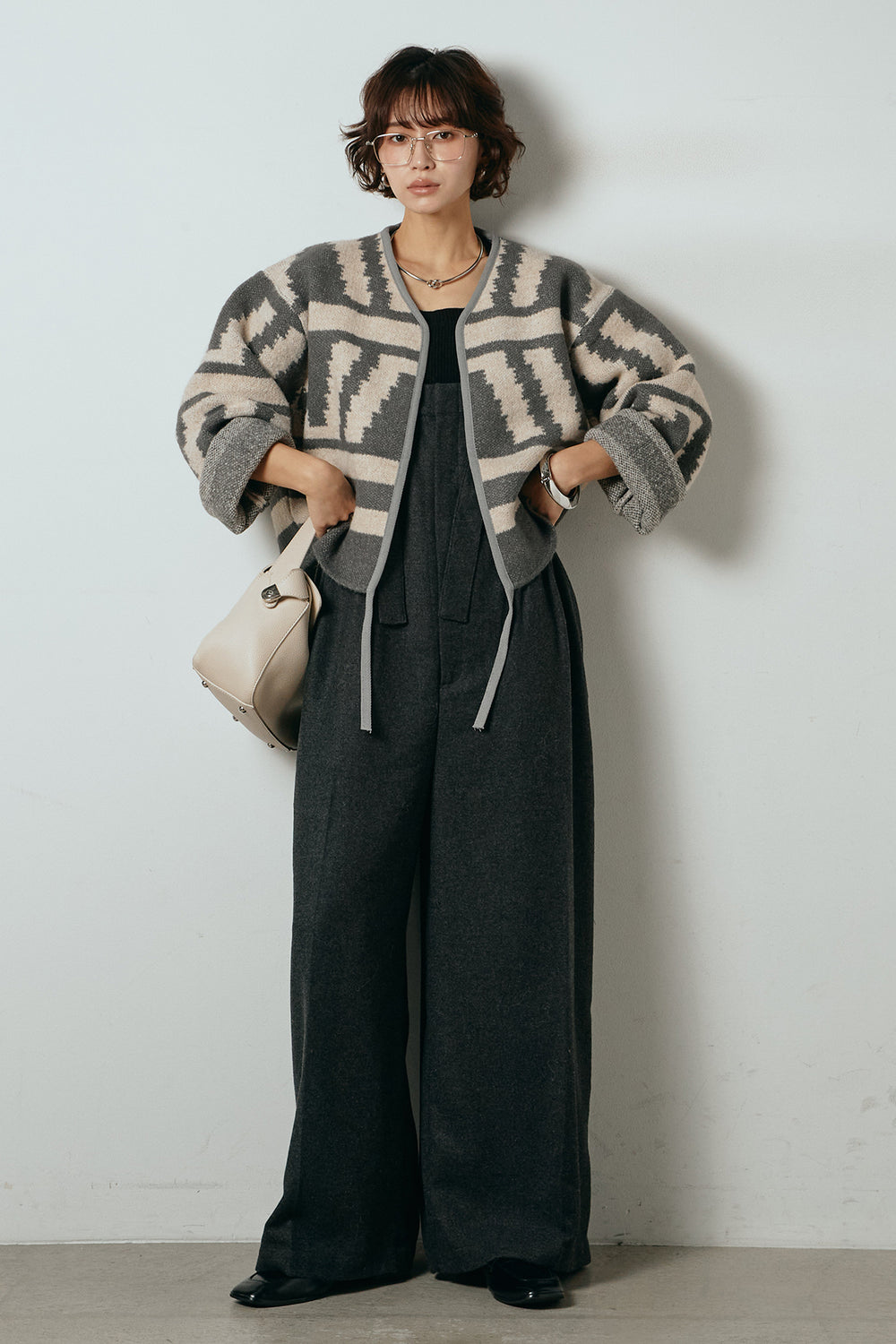 [SET]ノーカラー幾何学模様アウター+ウール混フランネルワイドサロペット(2set)