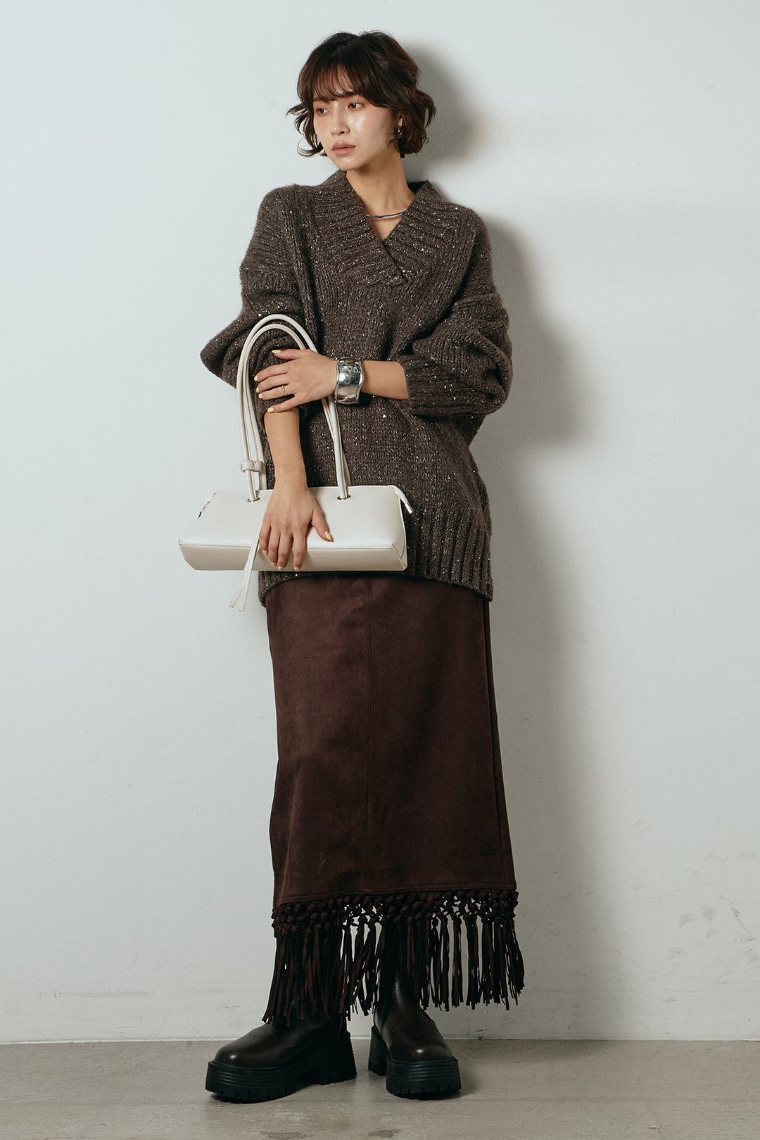 [SET]Vネックラメニットトップス+スウェードライク裾フリンジスカート(2set)