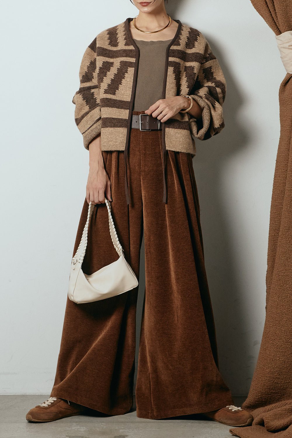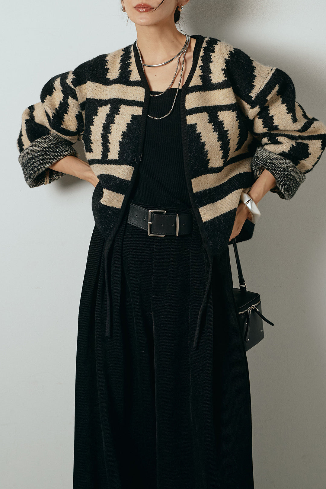 [SET]ノーカラー幾何学模様アウター+ベルトループコーデュロイワイドパンツ(2set)