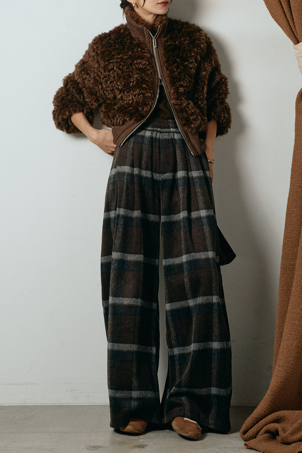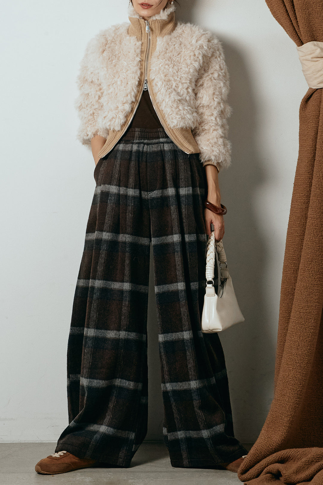 [SET]ハイネックショート丈ボアジップブルゾン+起毛タータンチェック柄ワイドパンツ(2set)