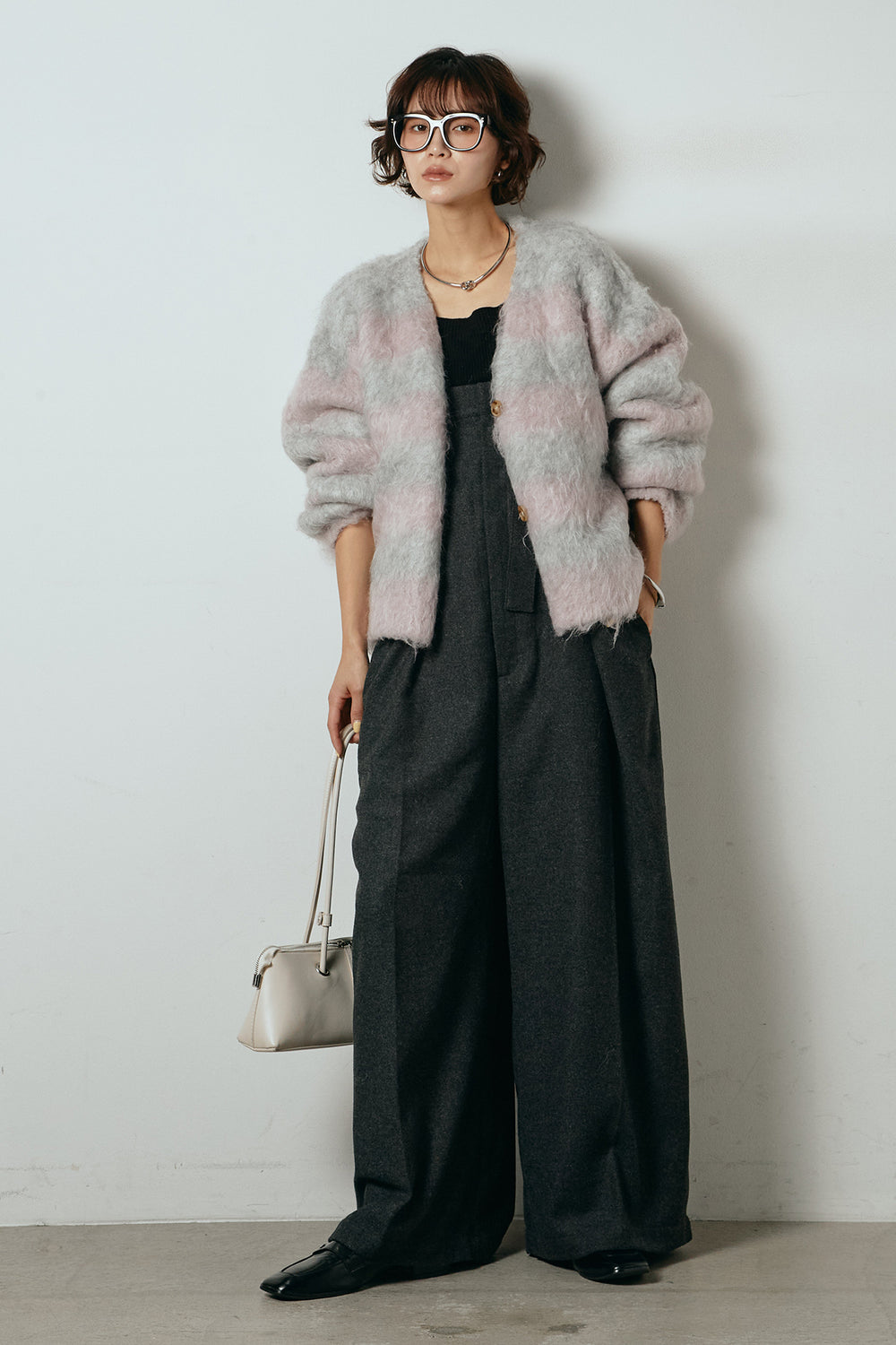 [SET]シャギーボーダー柄ニットカーディガン+ウール混フランネルワイドサロペット(2set)