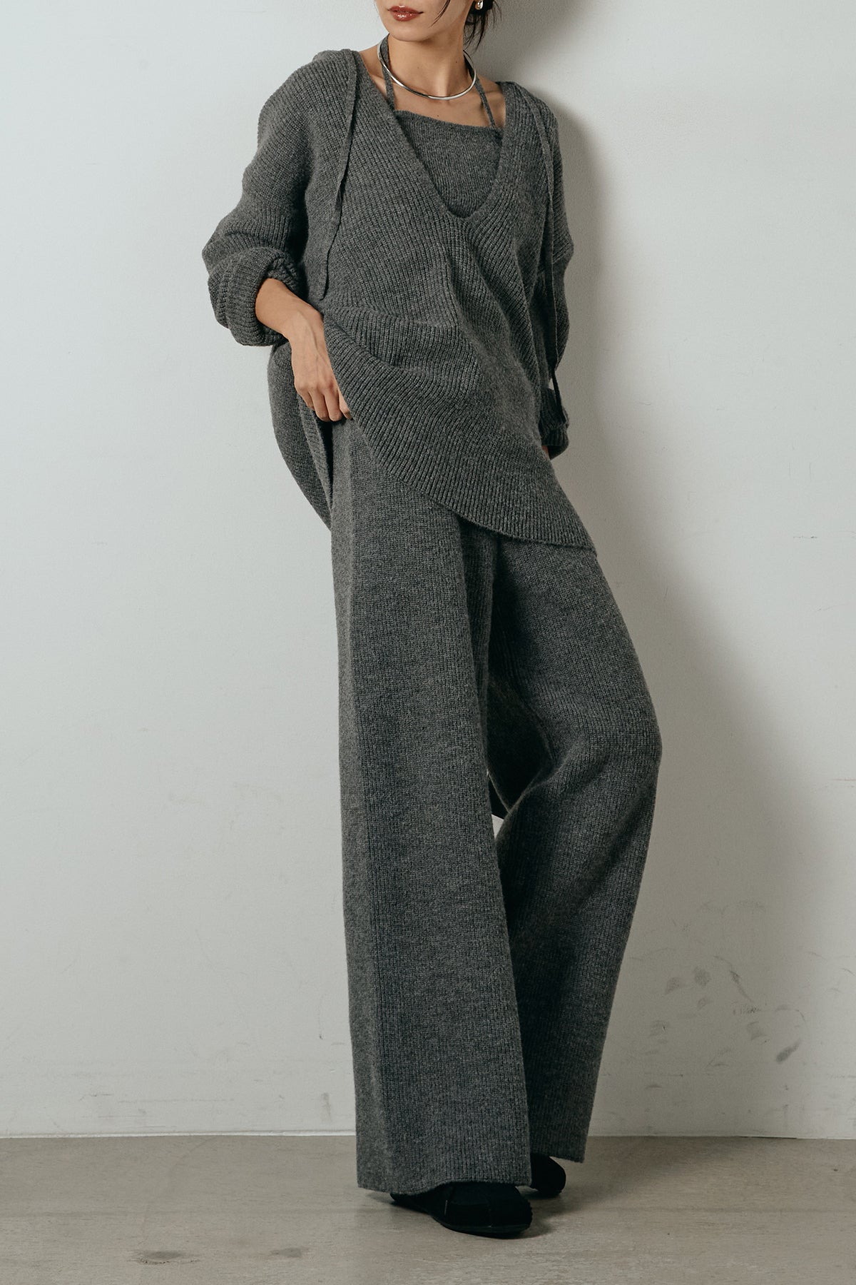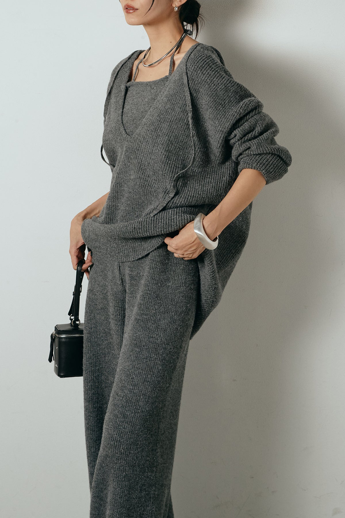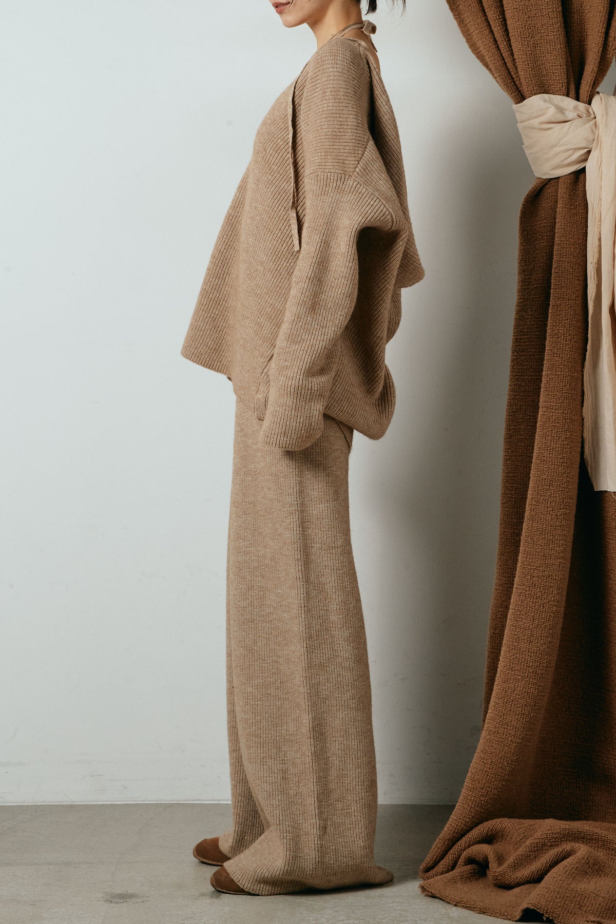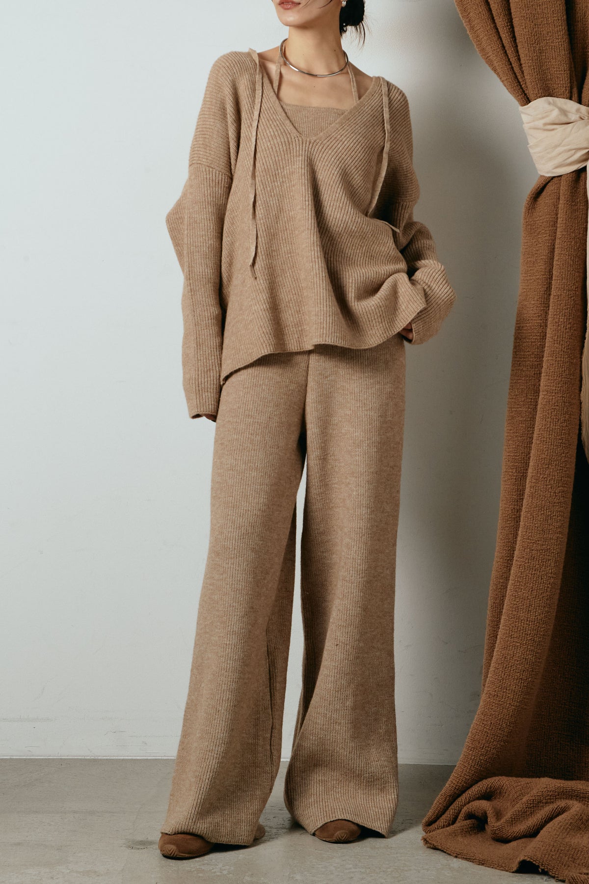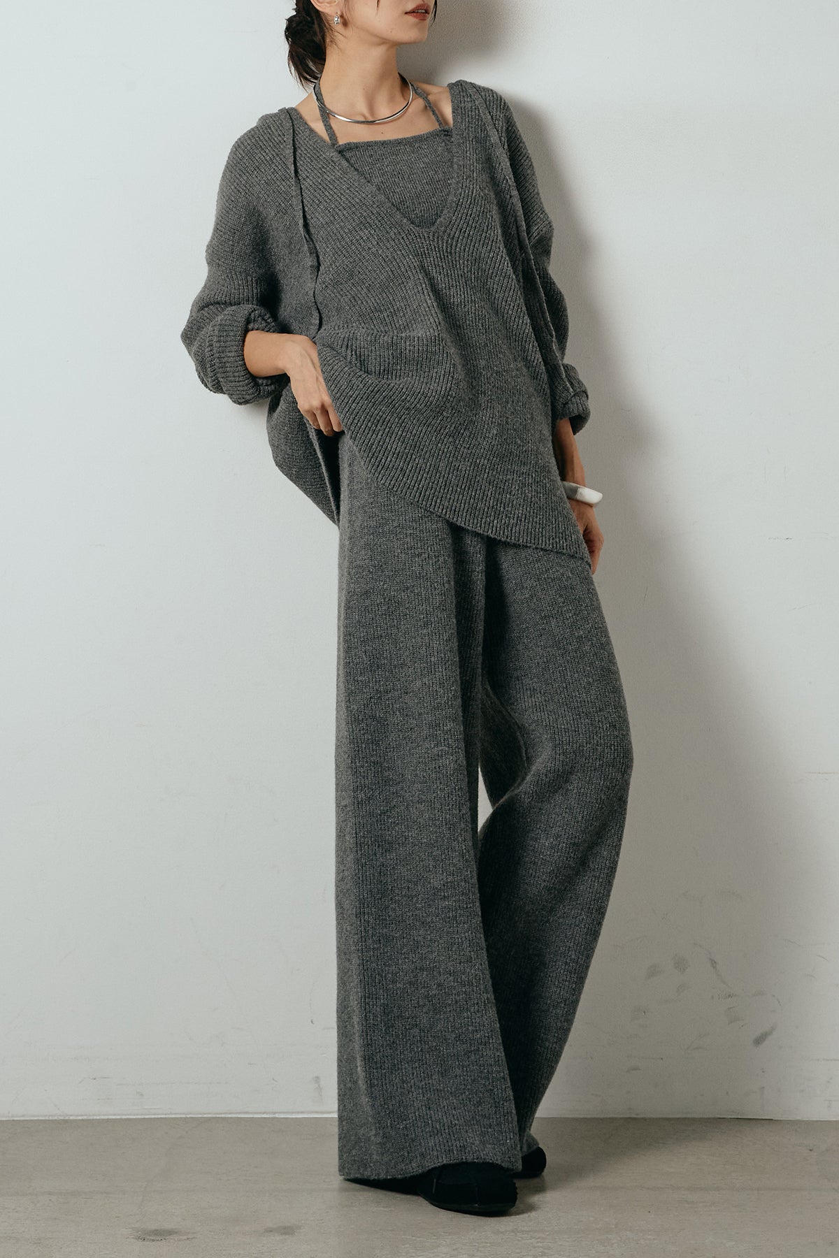 ホルターネックデザインがさりげないアクセントになる、ニットトップスとパンツのセットアップ。表情のある編地が柔らかな立体感を生み、リラックス感の中にも女性らしさを感じさせます。トップスは動きのあるシルエットで抜け感を演出し、ワイドパンツと合わせることで縦ラインを強調。セットではもちろん、単品使いもしやすく、幅広いスタイリングに活躍するアイテムです。