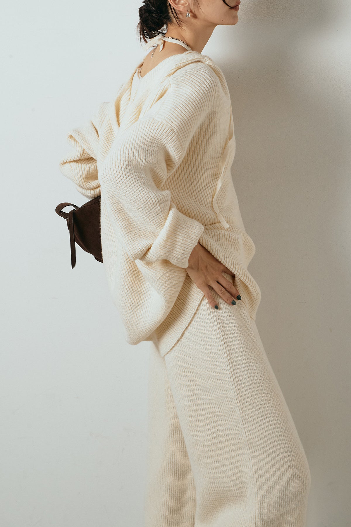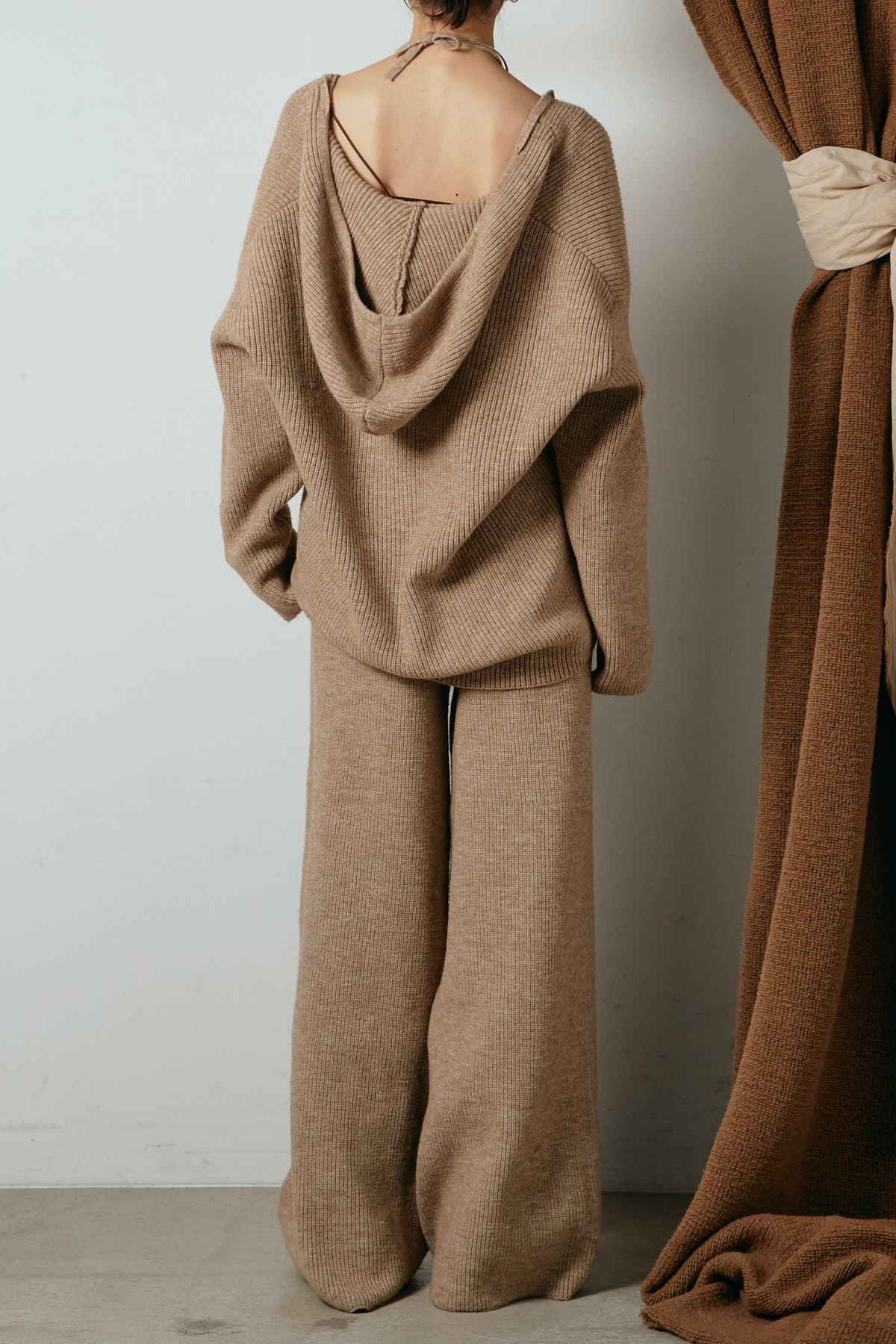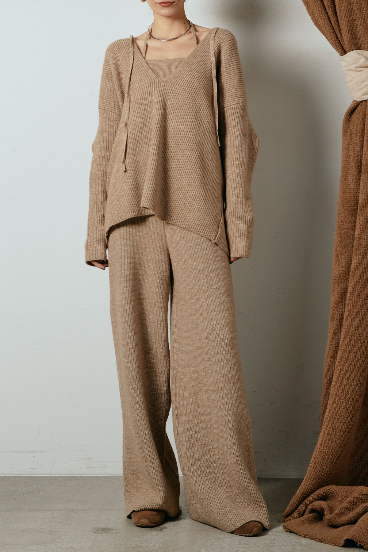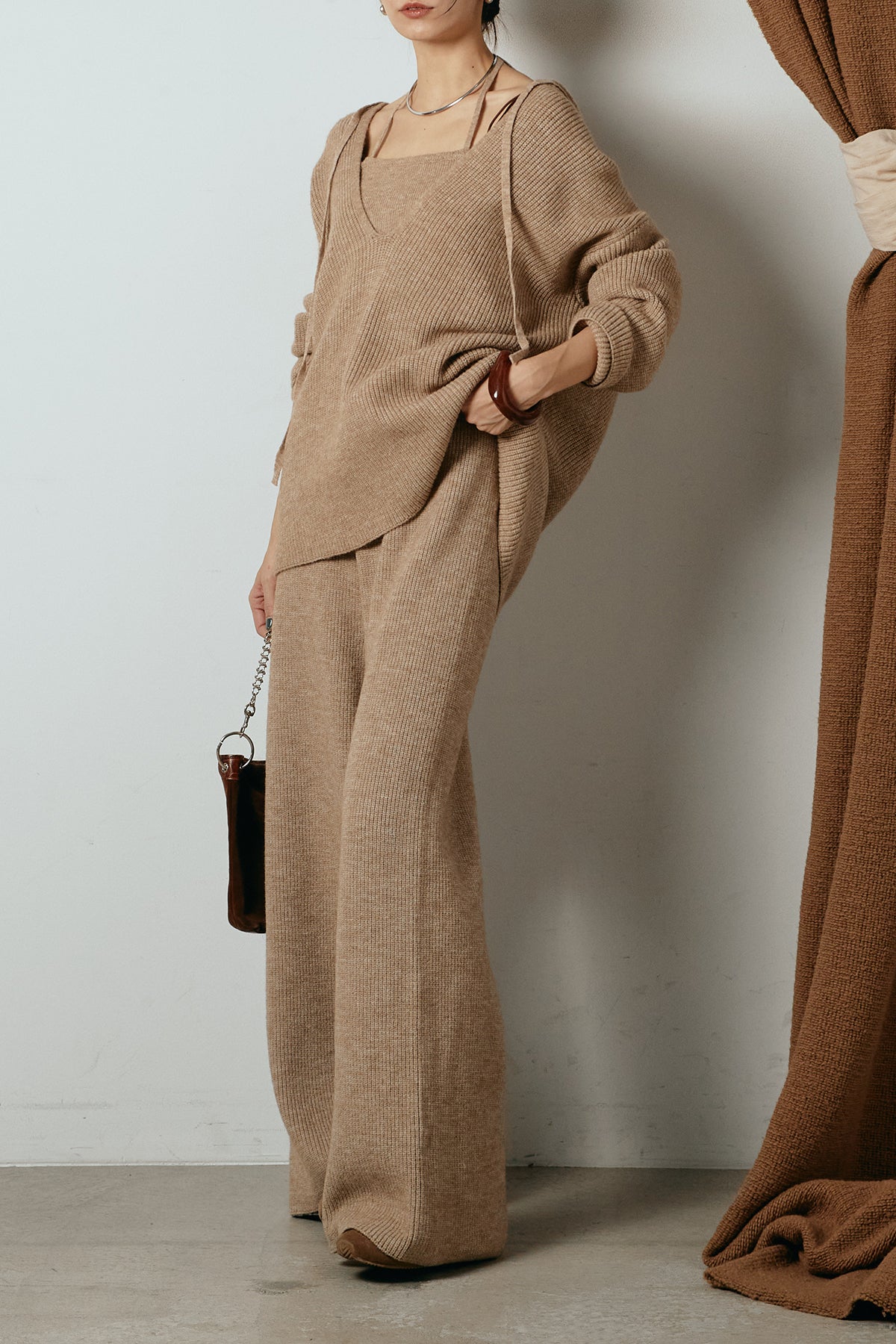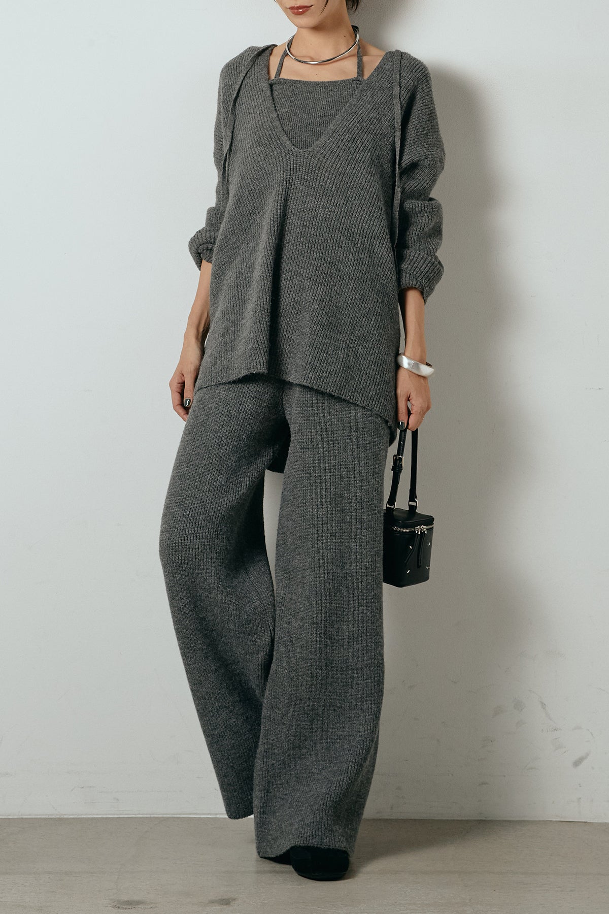 ホルターネックデザインがさりげないアクセントになる、ニットトップスとパンツのセットアップ。表情のある編地が柔らかな立体感を生み、リラックス感の中にも女性らしさを感じさせます。トップスは動きのあるシルエットで抜け感を演出し、ワイドパンツと合わせることで縦ラインを強調。セットではもちろん、単品使いもしやすく、幅広いスタイリングに活躍するアイテムです。