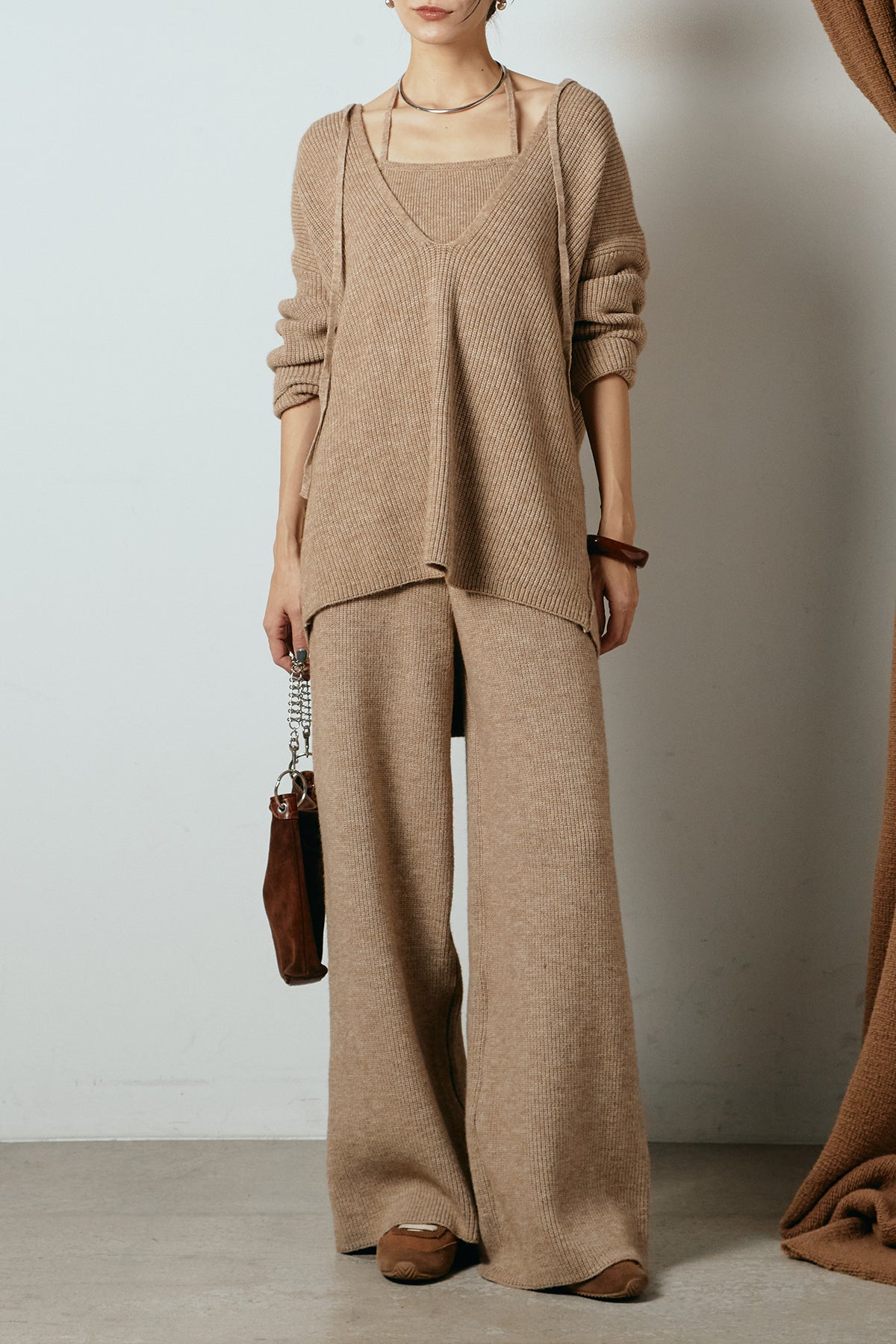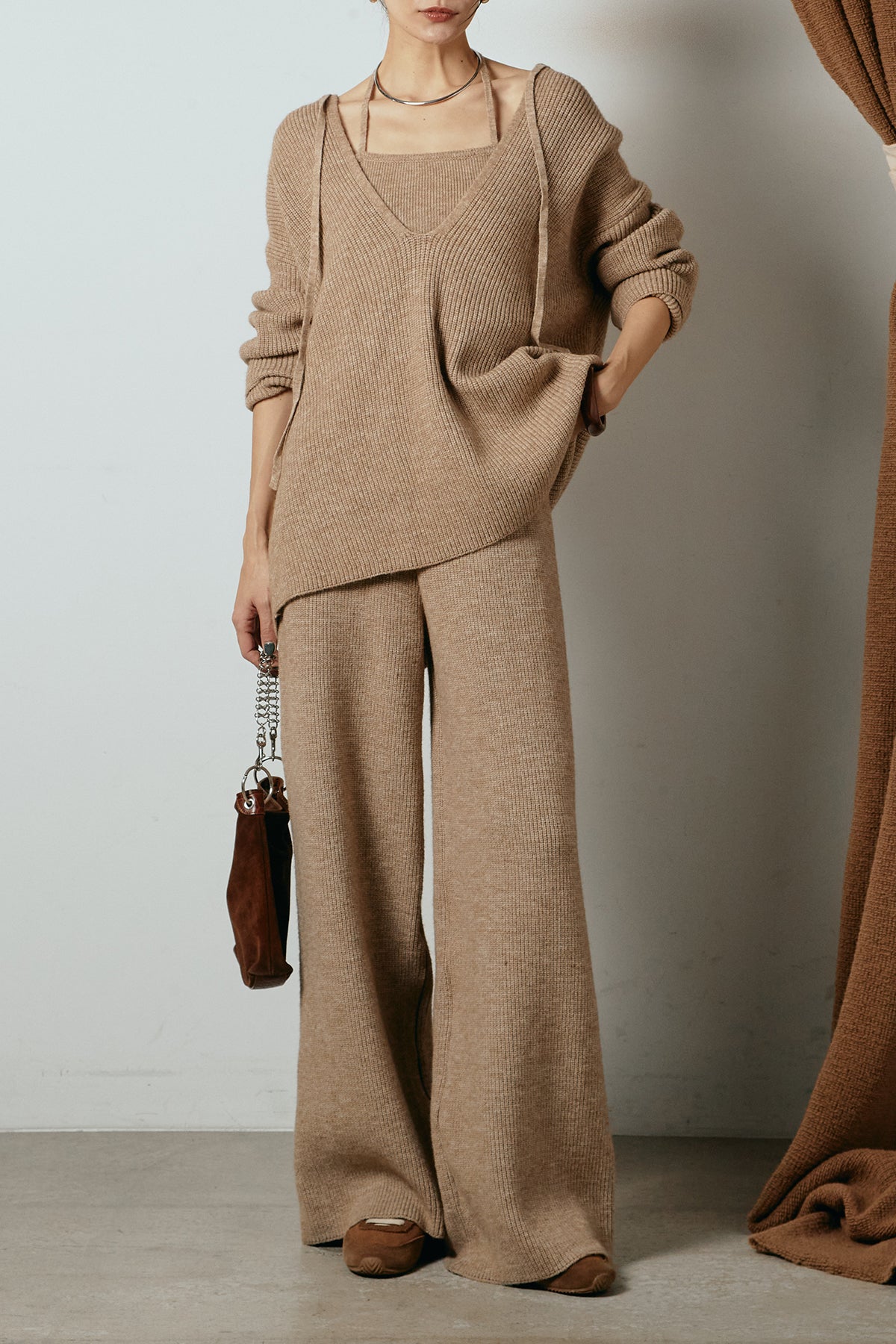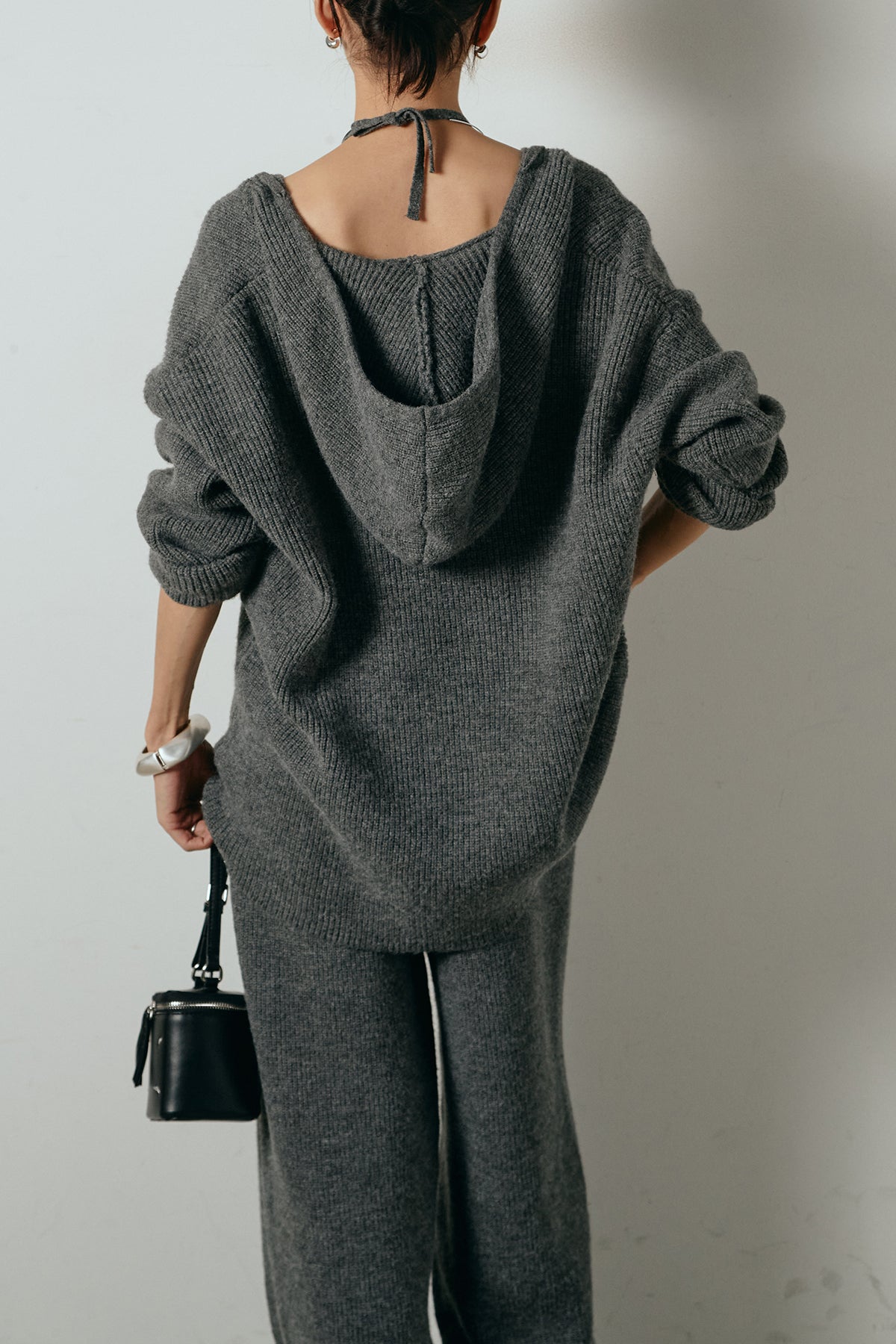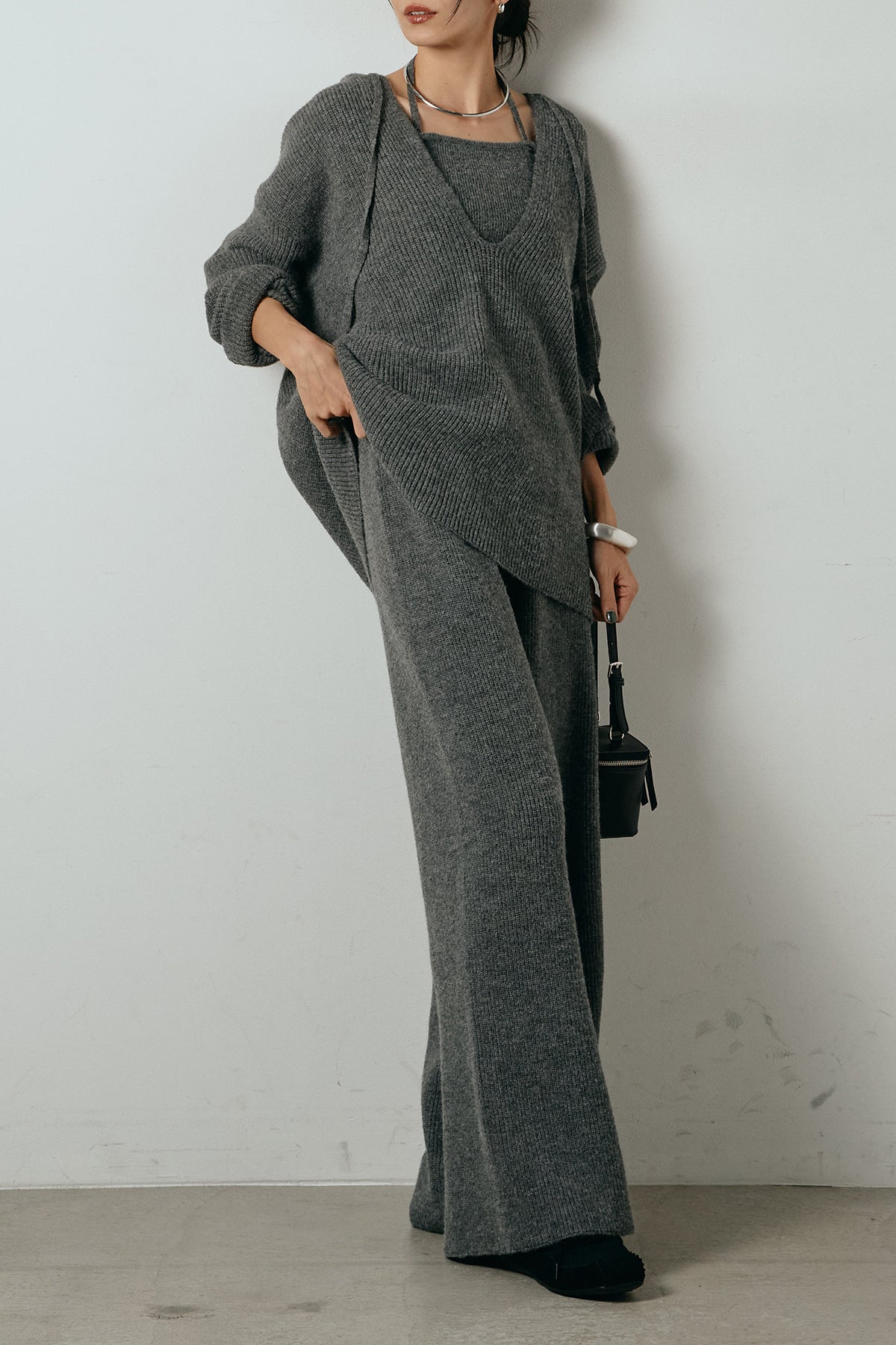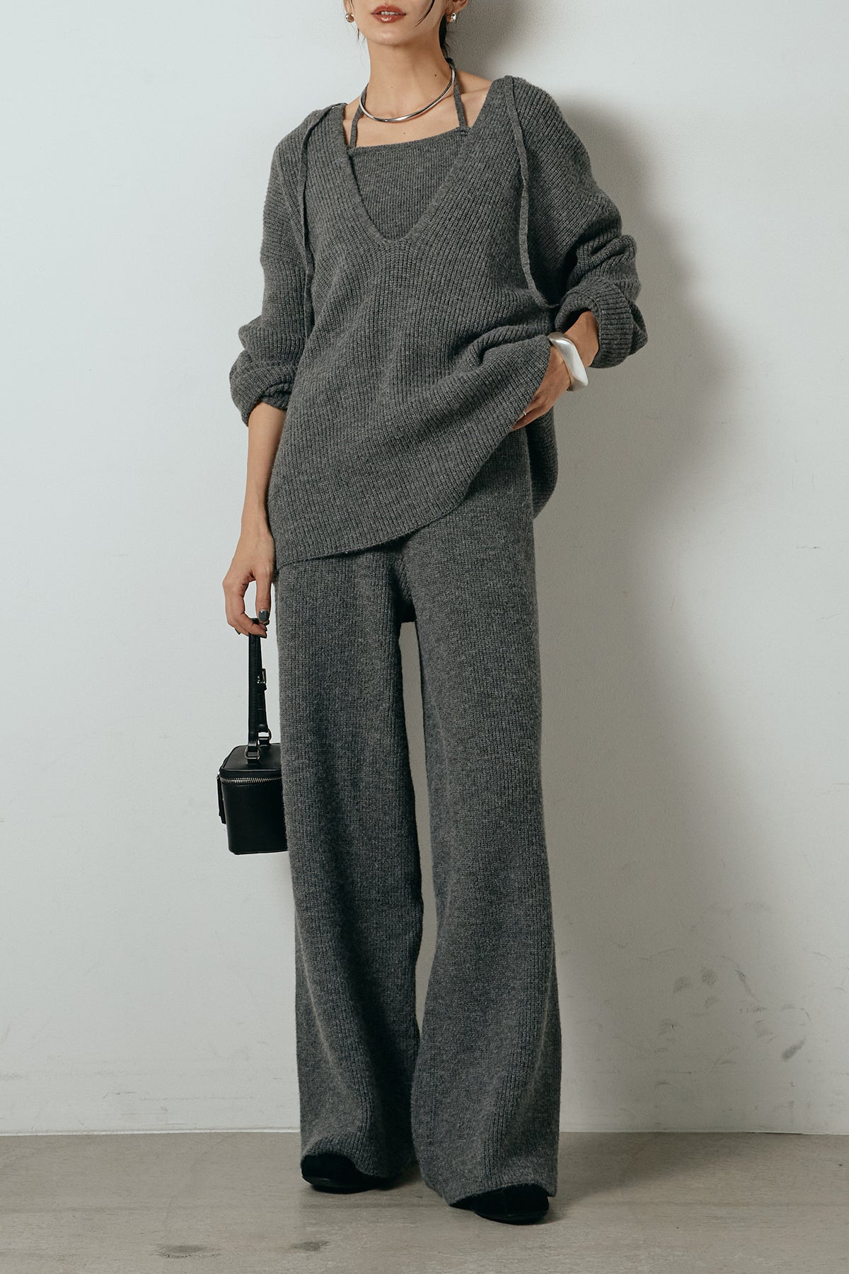 ホルターネックデザインがさりげないアクセントになる、ニットトップスとパンツのセットアップ。表情のある編地が柔らかな立体感を生み、リラックス感の中にも女性らしさを感じさせます。トップスは動きのあるシルエットで抜け感を演出し、ワイドパンツと合わせることで縦ラインを強調。セットではもちろん、単品使いもしやすく、幅広いスタイリングに活躍するアイテムです。