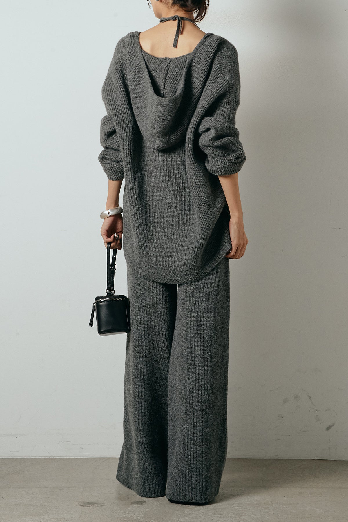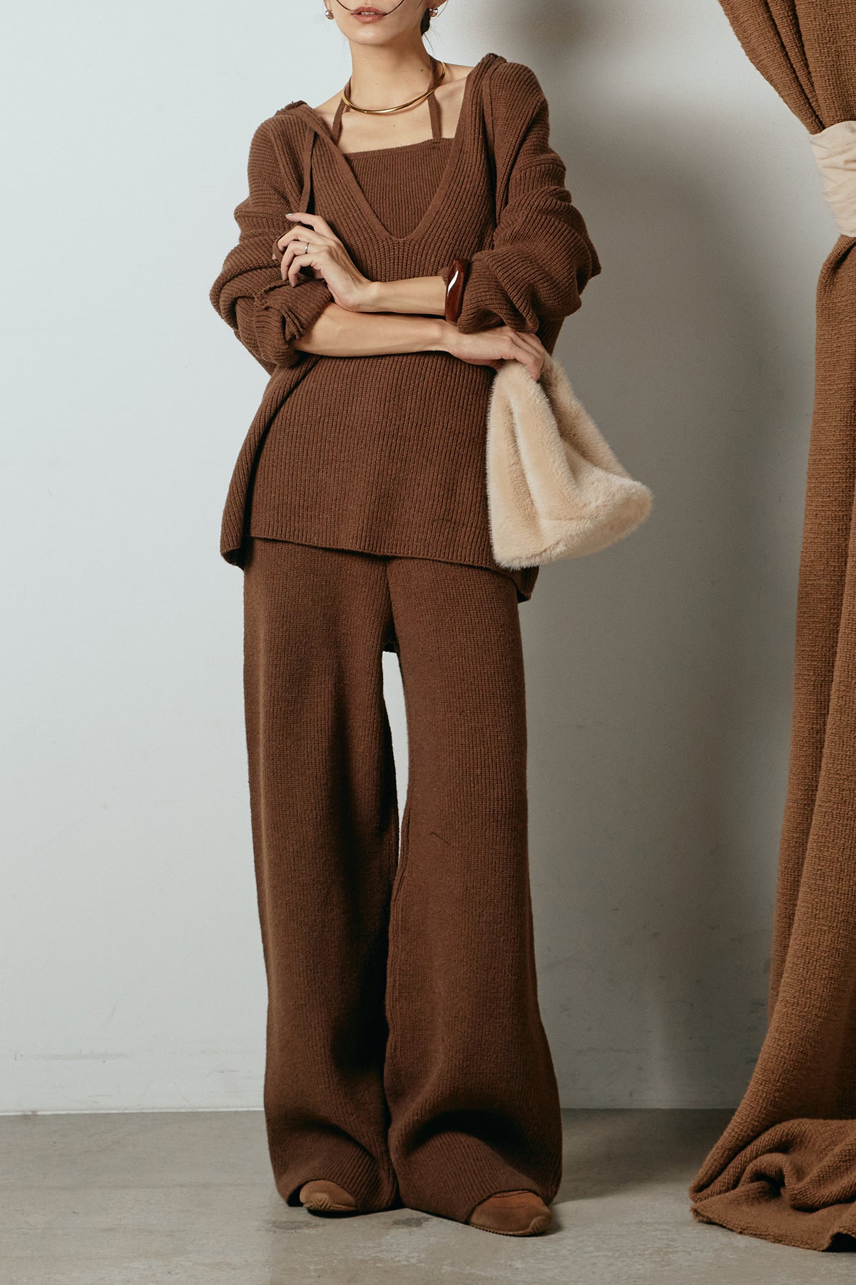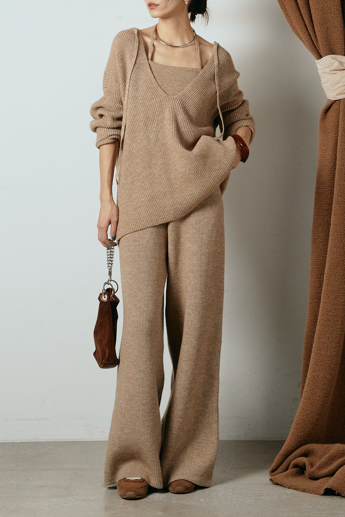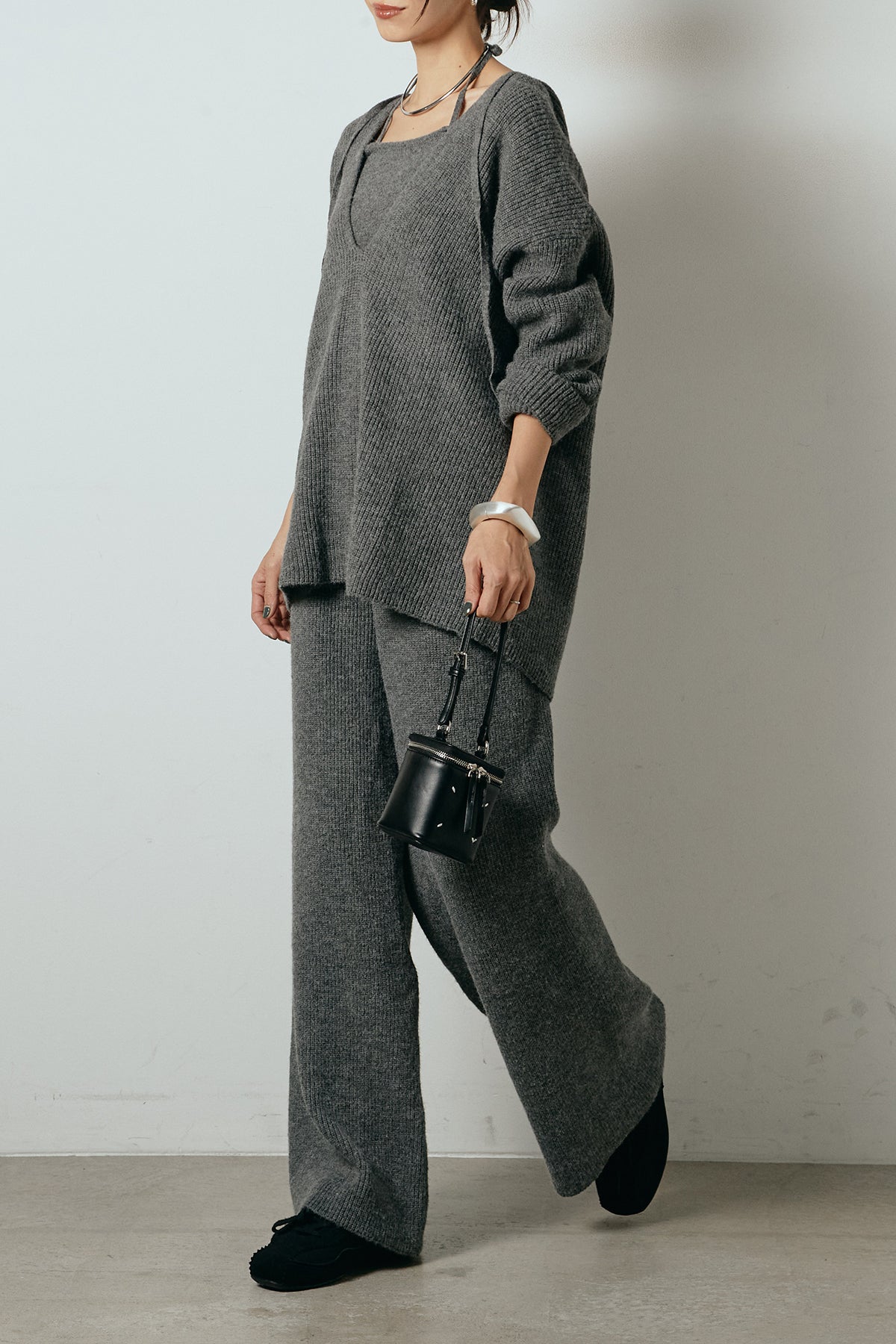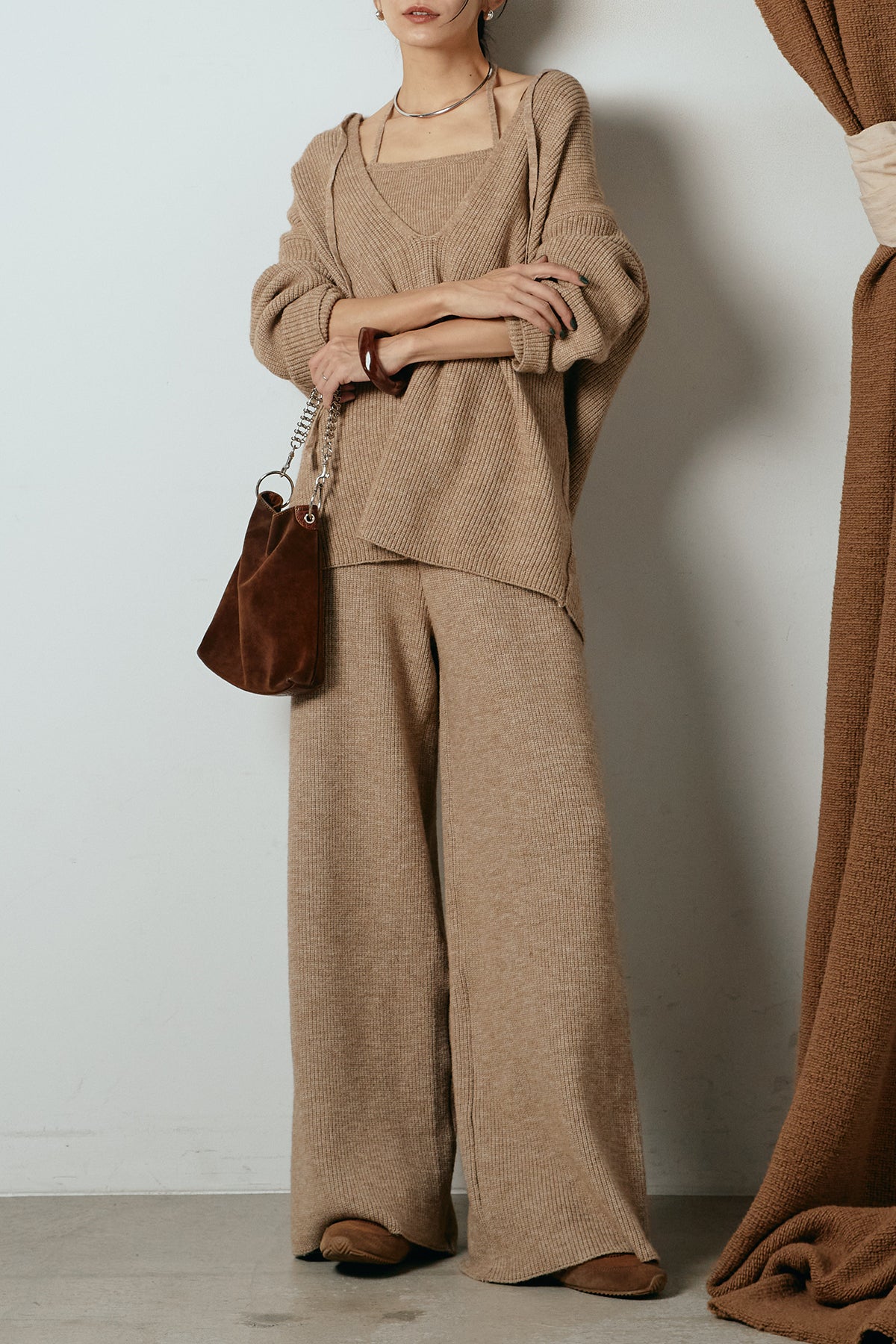 ホルターネックデザインがさりげないアクセントになる、ニットトップスとパンツのセットアップ。表情のある編地が柔らかな立体感を生み、リラックス感の中にも女性らしさを感じさせます。トップスは動きのあるシルエットで抜け感を演出し、ワイドパンツと合わせることで縦ラインを強調。セットではもちろん、単品使いもしやすく、幅広いスタイリングに活躍するアイテムです。