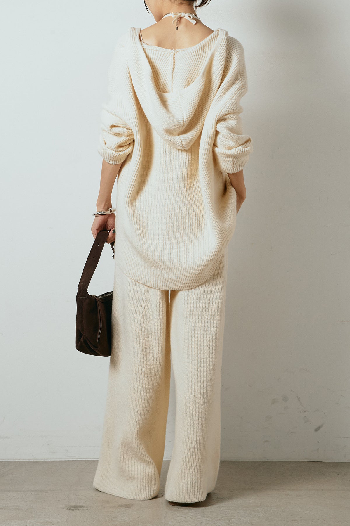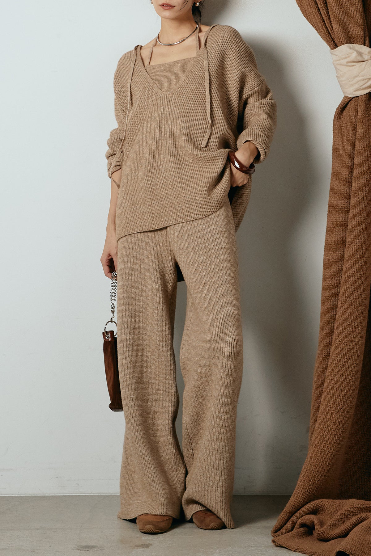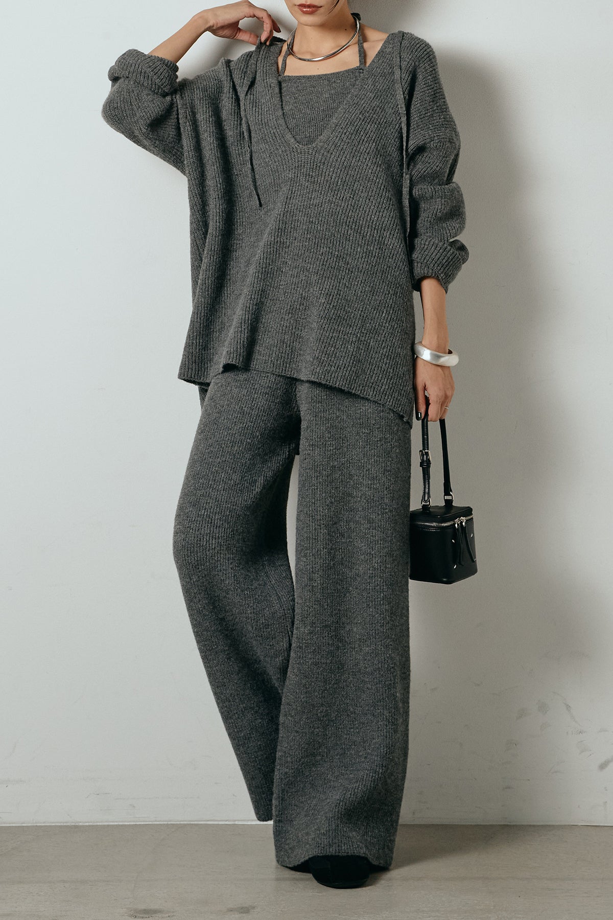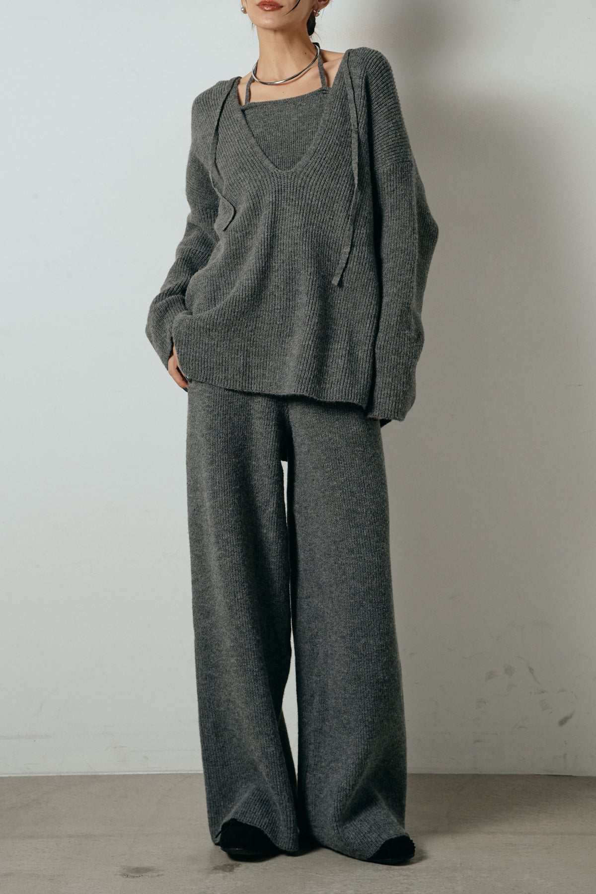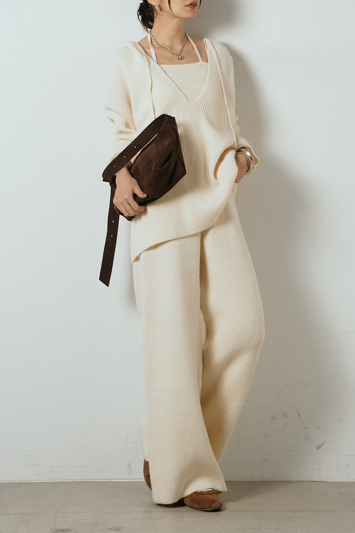 ホルターネックデザインがさりげないアクセントになる、ニットトップスとパンツのセットアップ。表情のある編地が柔らかな立体感を生み、リラックス感の中にも女性らしさを感じさせます。トップスは動きのあるシルエットで抜け感を演出し、ワイドパンツと合わせることで縦ラインを強調。セットではもちろん、単品使いもしやすく、幅広いスタイリングに活躍するアイテムです。