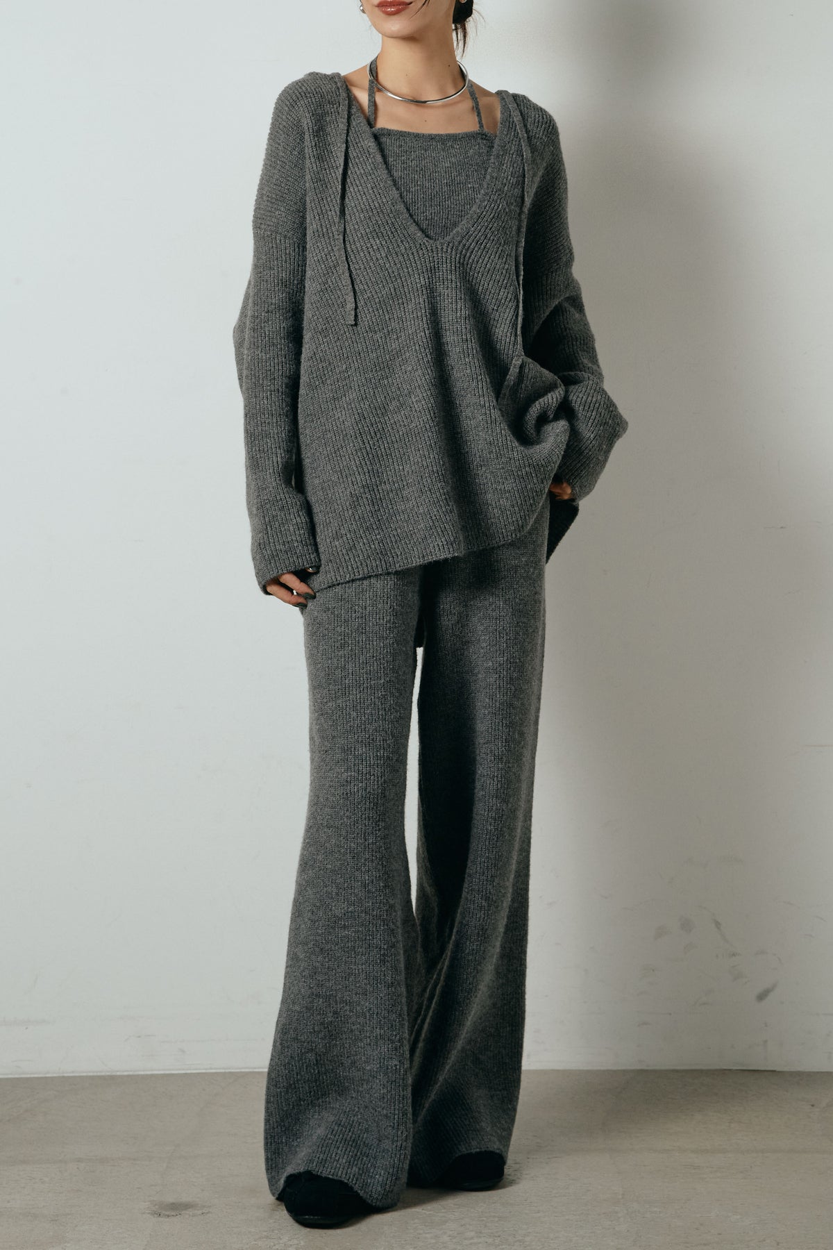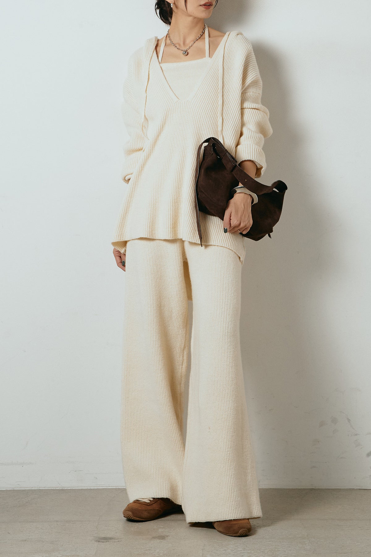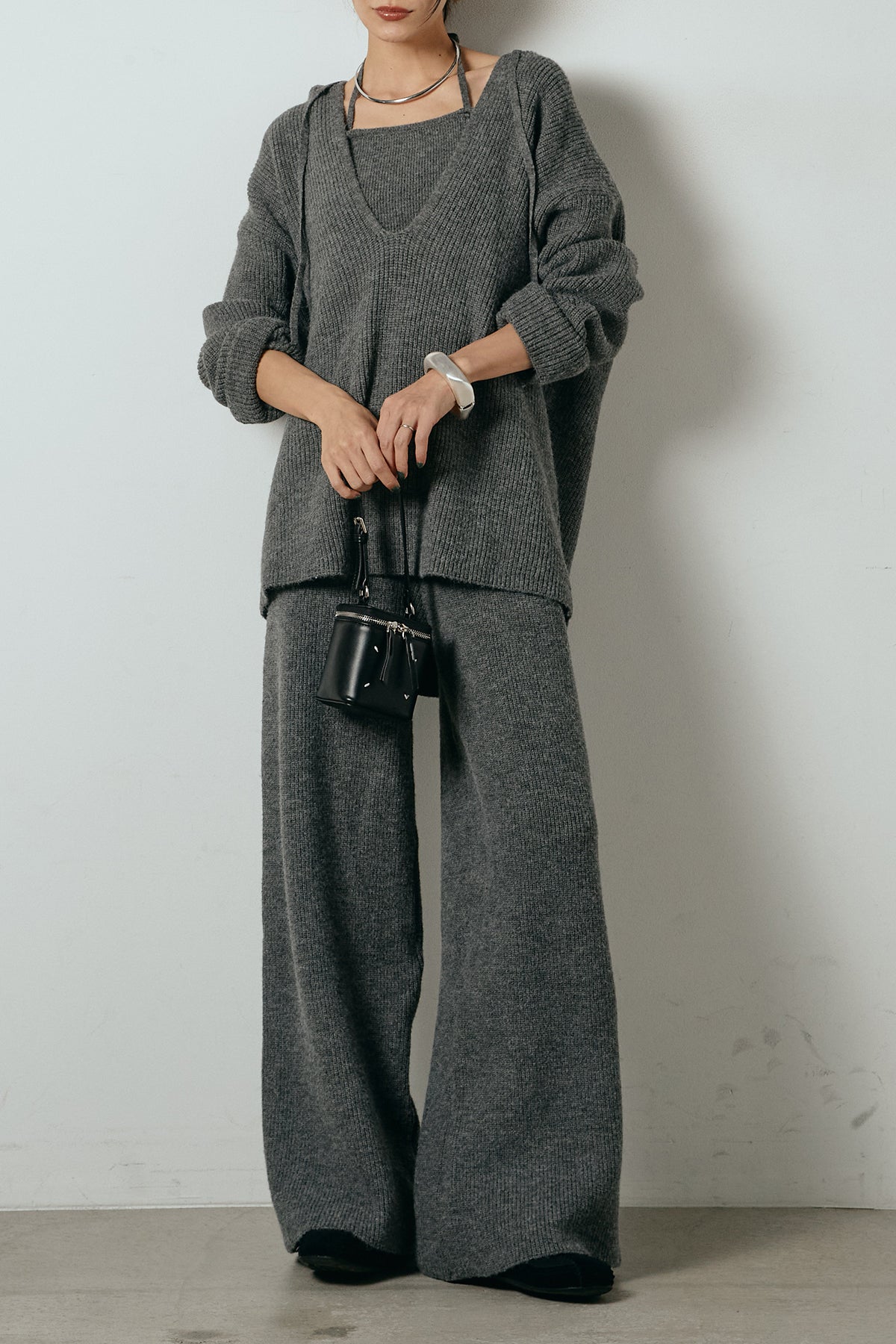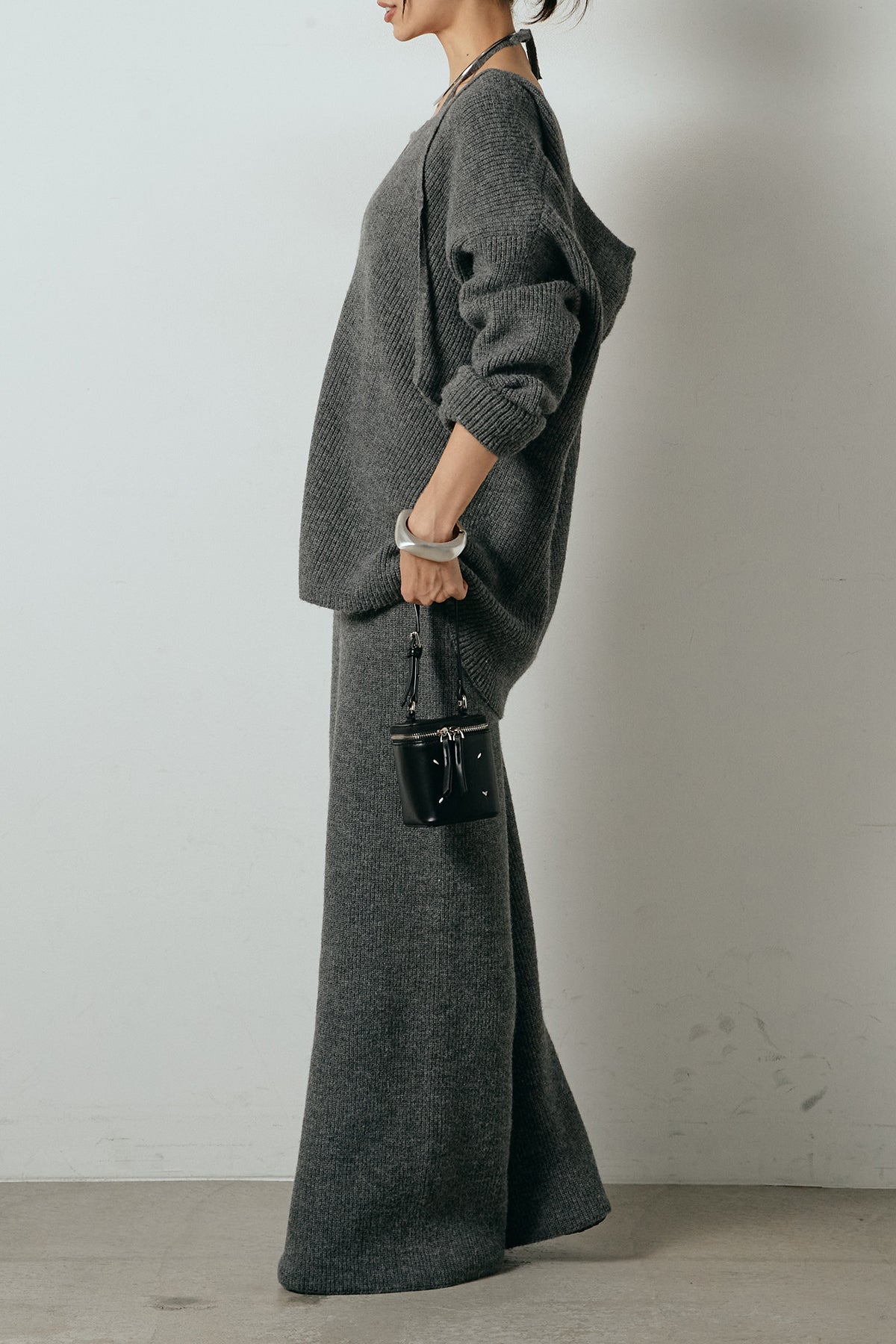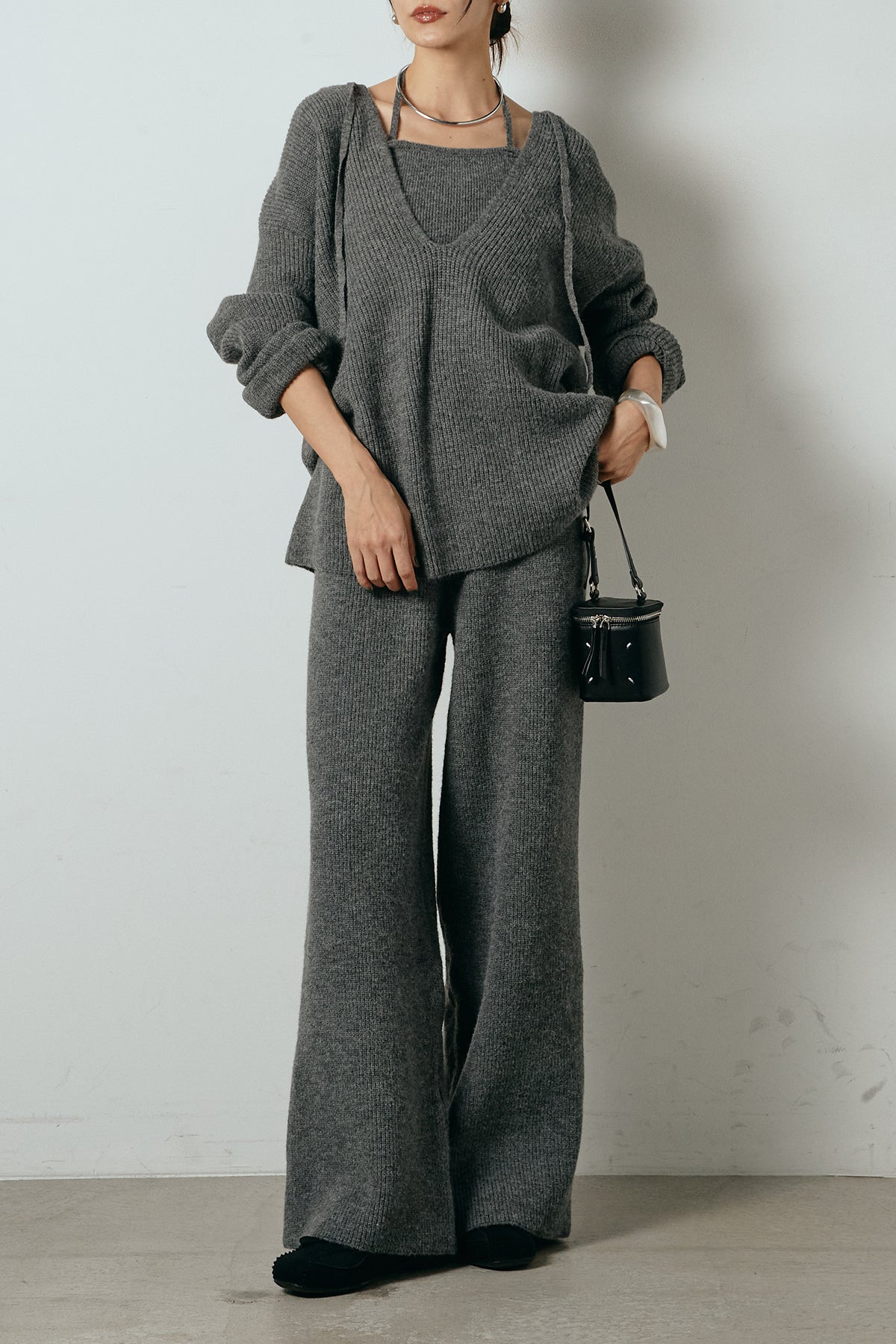 ホルターネックデザインがさりげないアクセントになる、ニットトップスとパンツのセットアップ。表情のある編地が柔らかな立体感を生み、リラックス感の中にも女性らしさを感じさせます。トップスは動きのあるシルエットで抜け感を演出し、ワイドパンツと合わせることで縦ラインを強調。セットではもちろん、単品使いもしやすく、幅広いスタイリングに活躍するアイテムです。