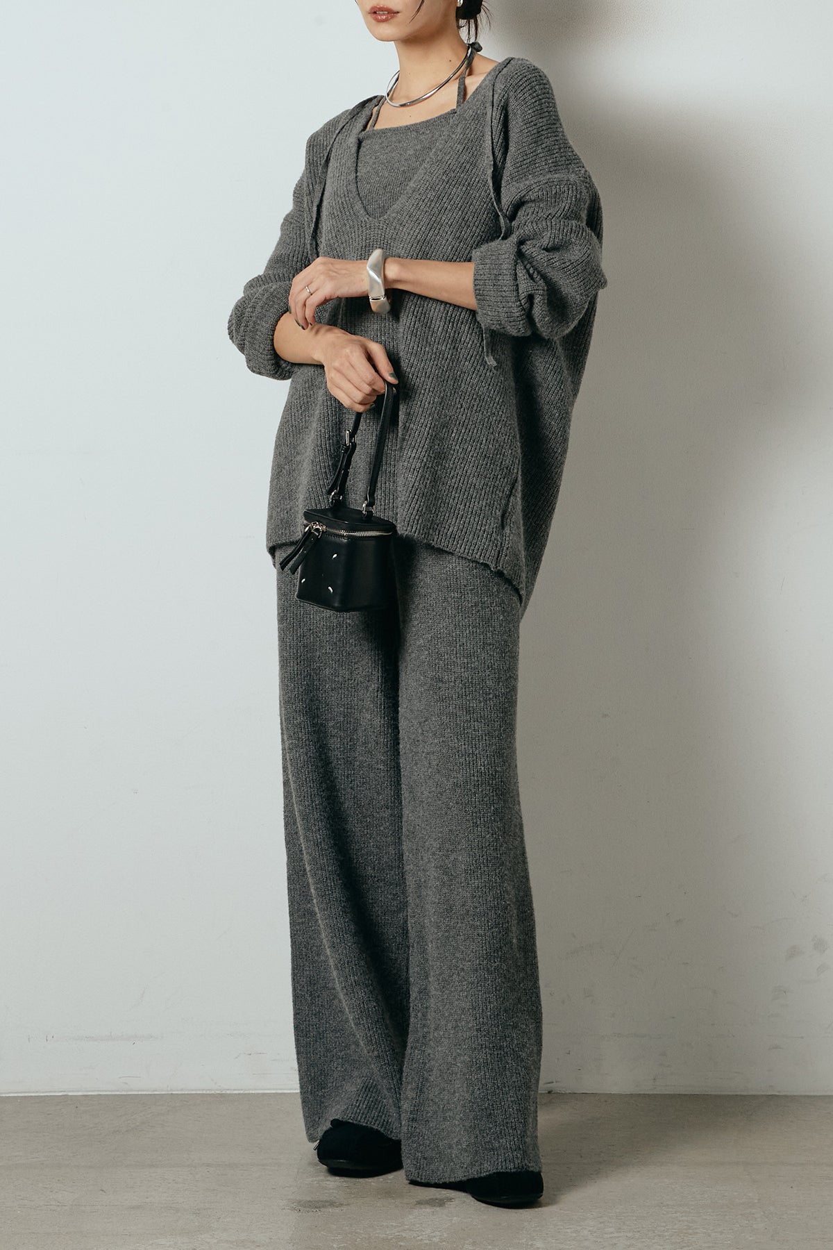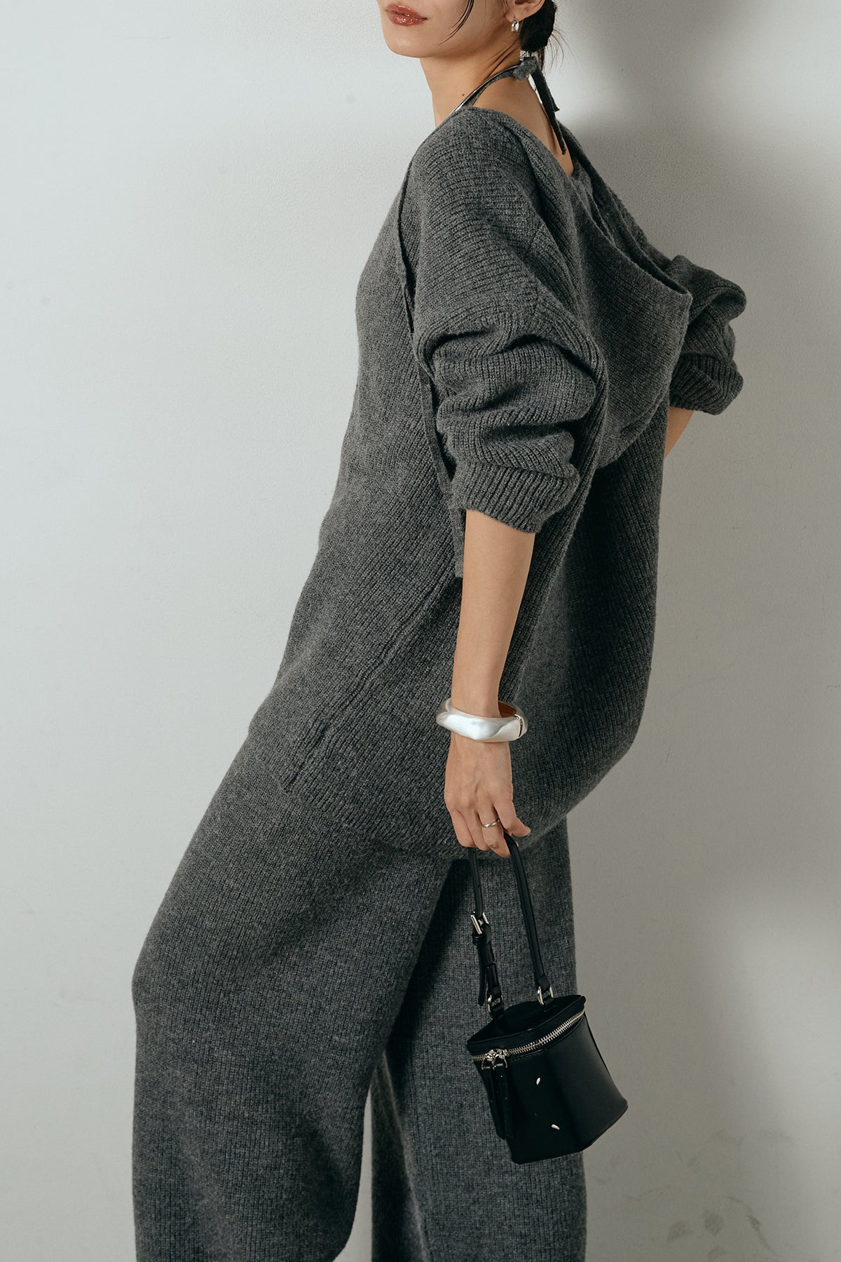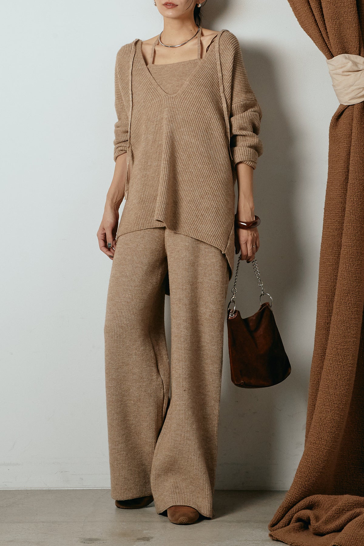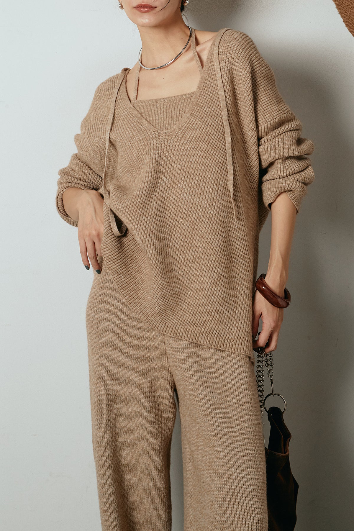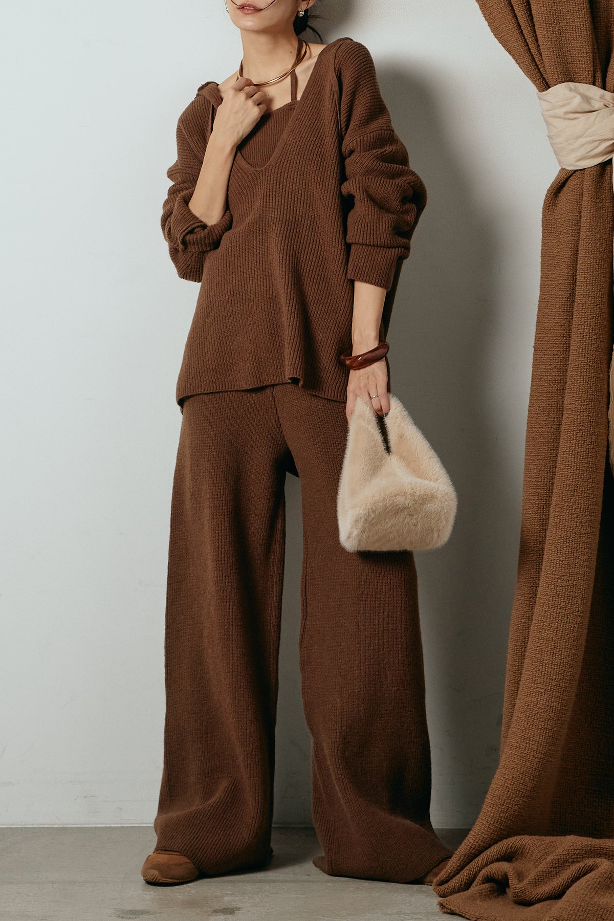 ホルターネックデザインがさりげないアクセントになる、ニットトップスとパンツのセットアップ。表情のある編地が柔らかな立体感を生み、リラックス感の中にも女性らしさを感じさせます。トップスは動きのあるシルエットで抜け感を演出し、ワイドパンツと合わせることで縦ラインを強調。セットではもちろん、単品使いもしやすく、幅広いスタイリングに活躍するアイテムです。