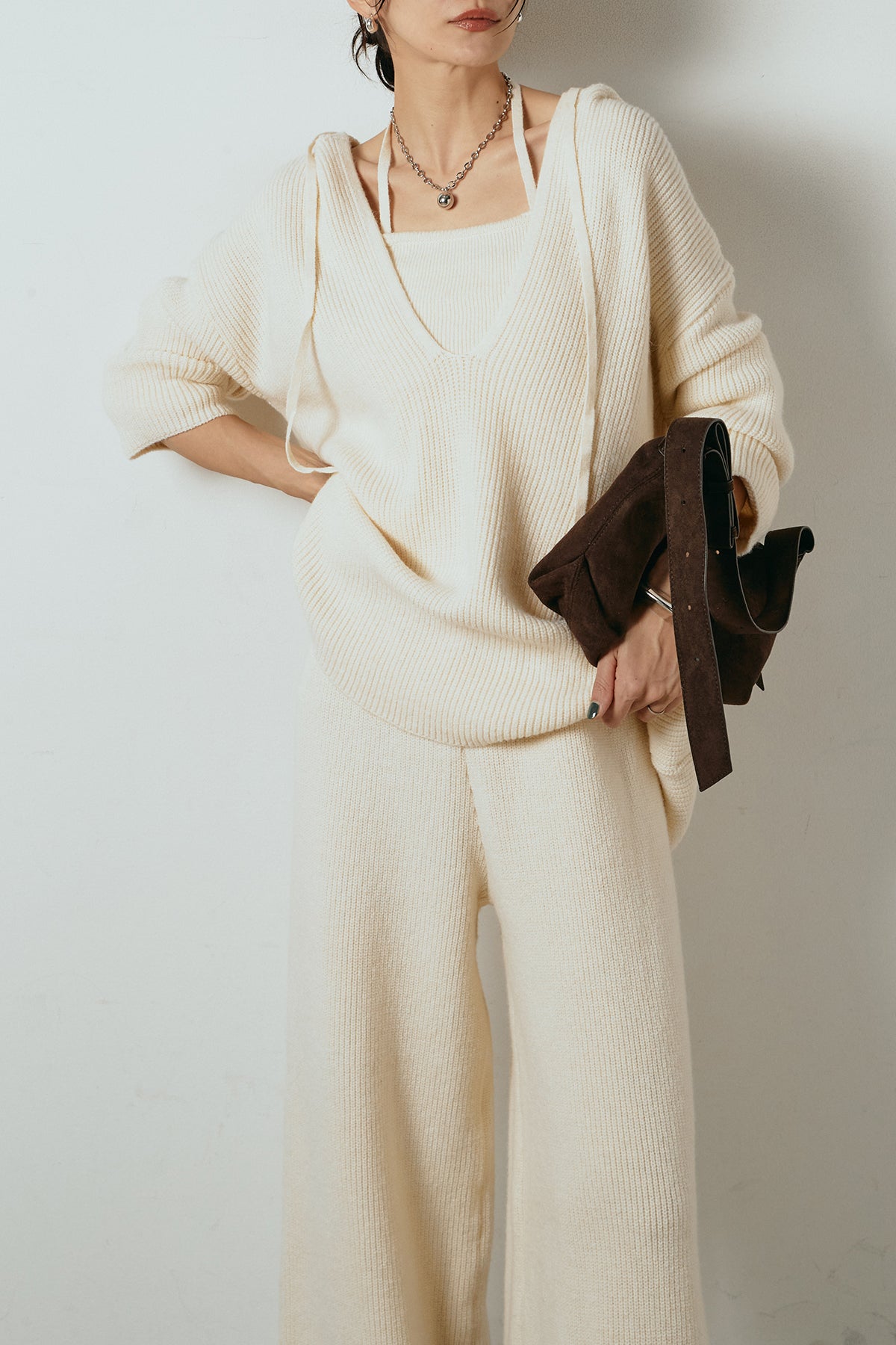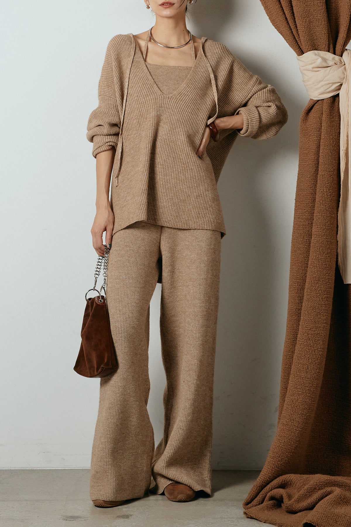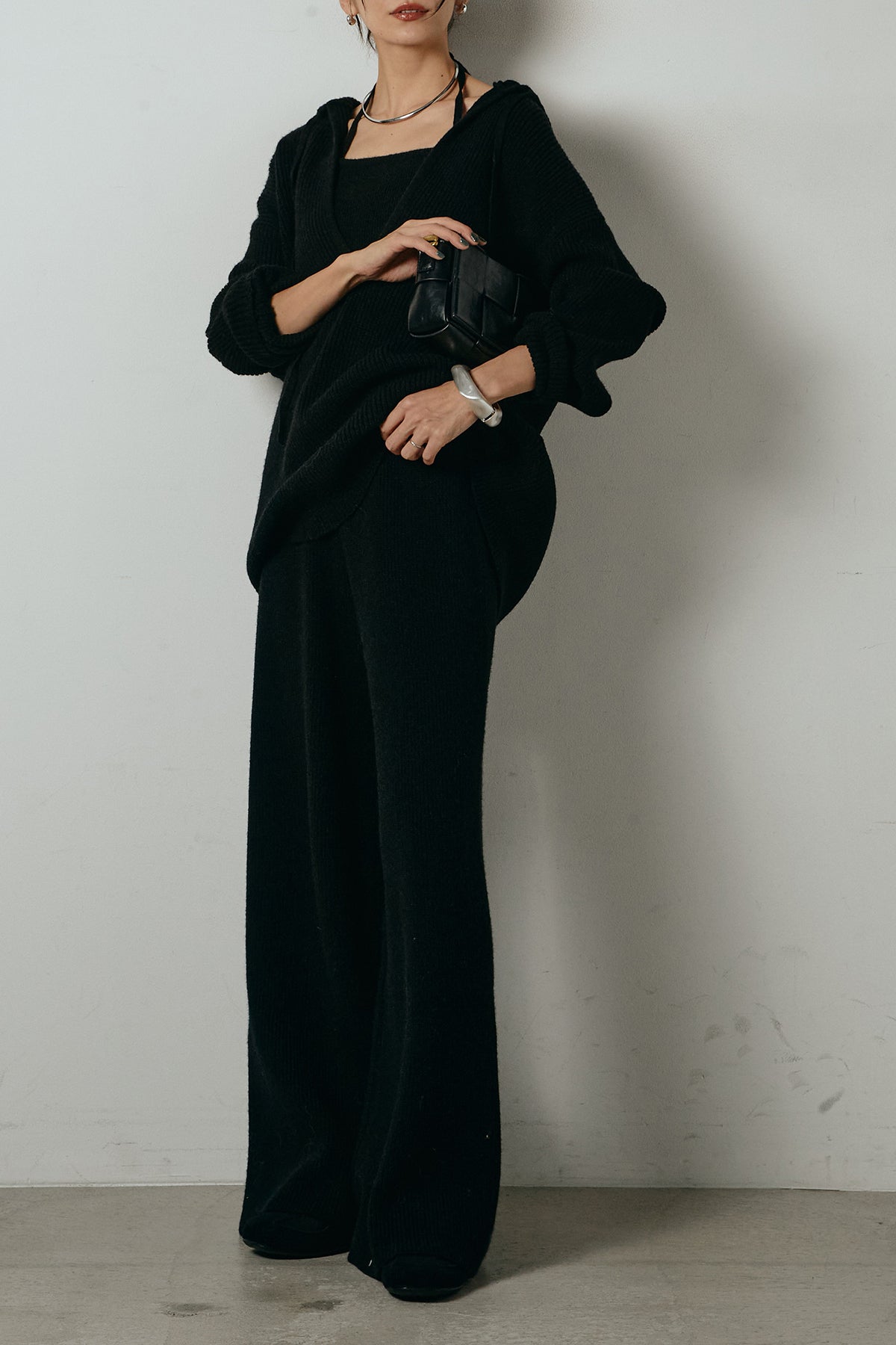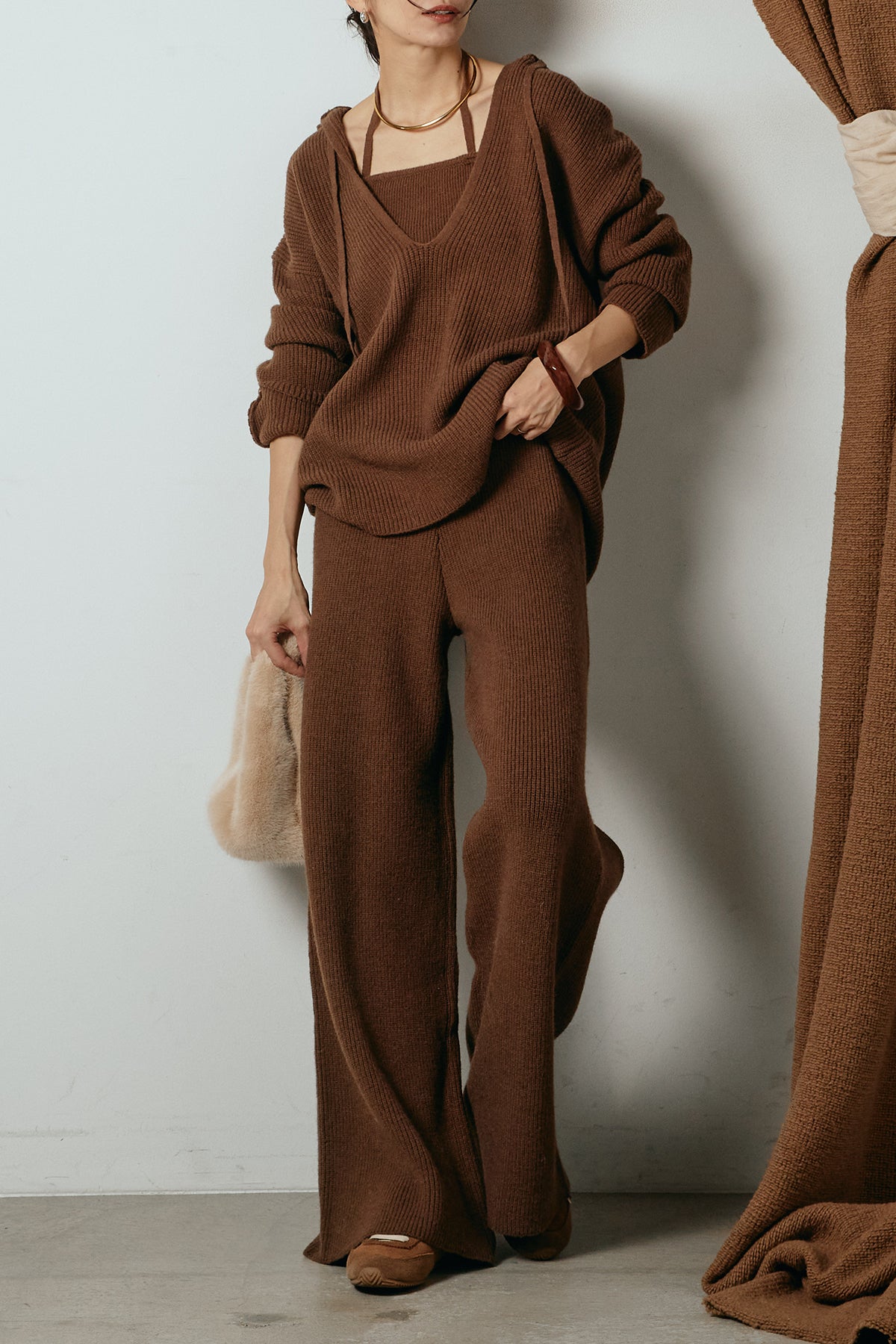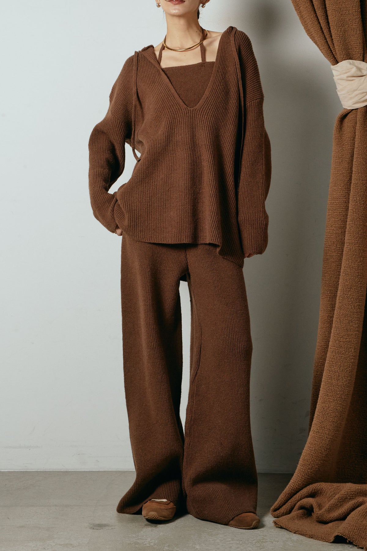 ホルターネックデザインがさりげないアクセントになる、ニットトップスとパンツのセットアップ。表情のある編地が柔らかな立体感を生み、リラックス感の中にも女性らしさを感じさせます。トップスは動きのあるシルエットで抜け感を演出し、ワイドパンツと合わせることで縦ラインを強調。セットではもちろん、単品使いもしやすく、幅広いスタイリングに活躍するアイテムです。