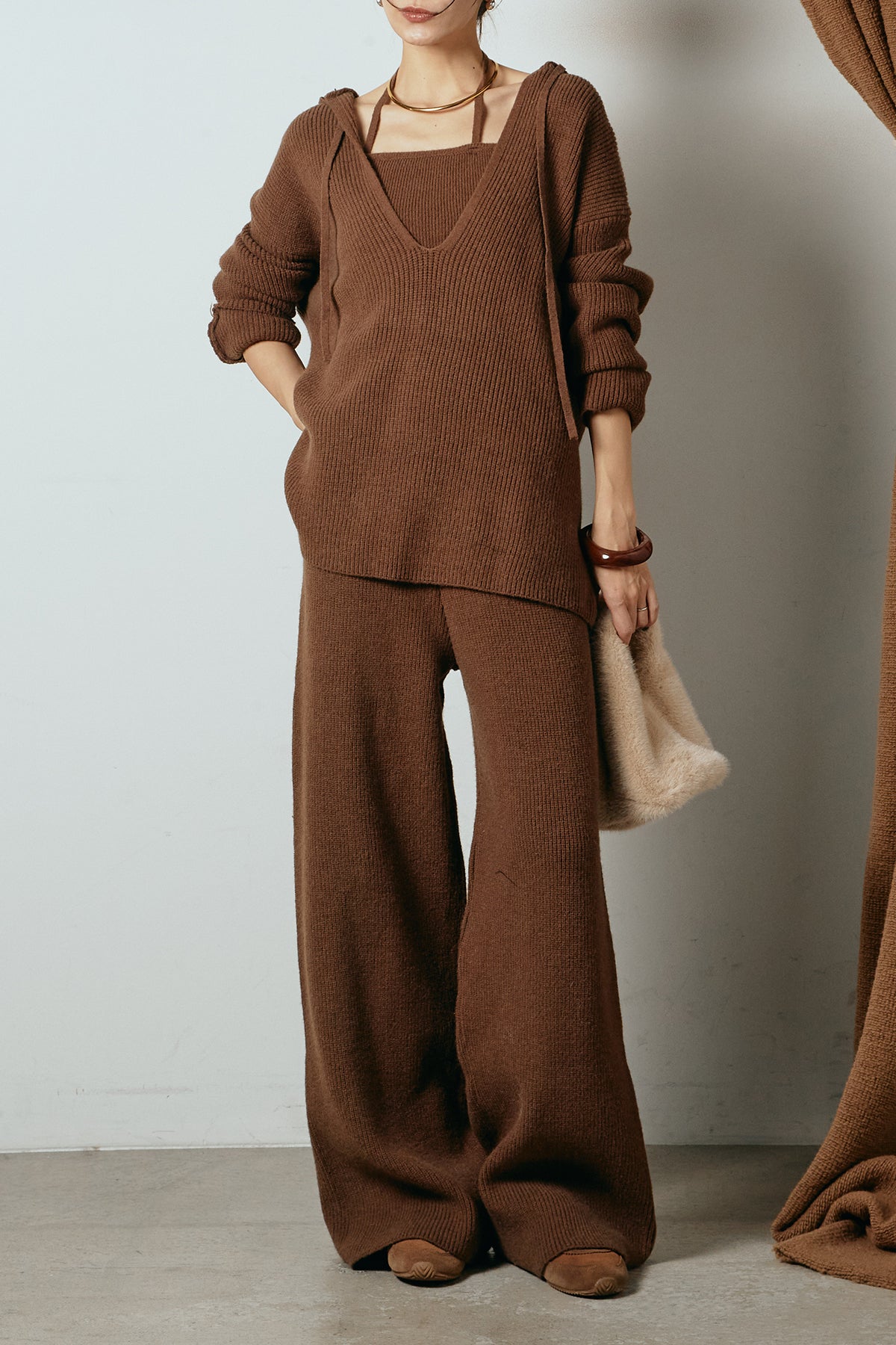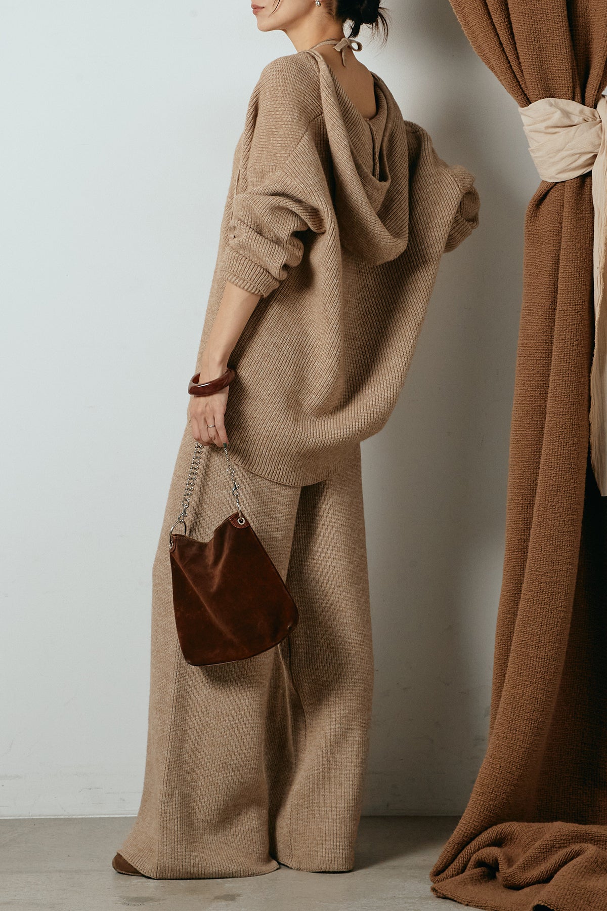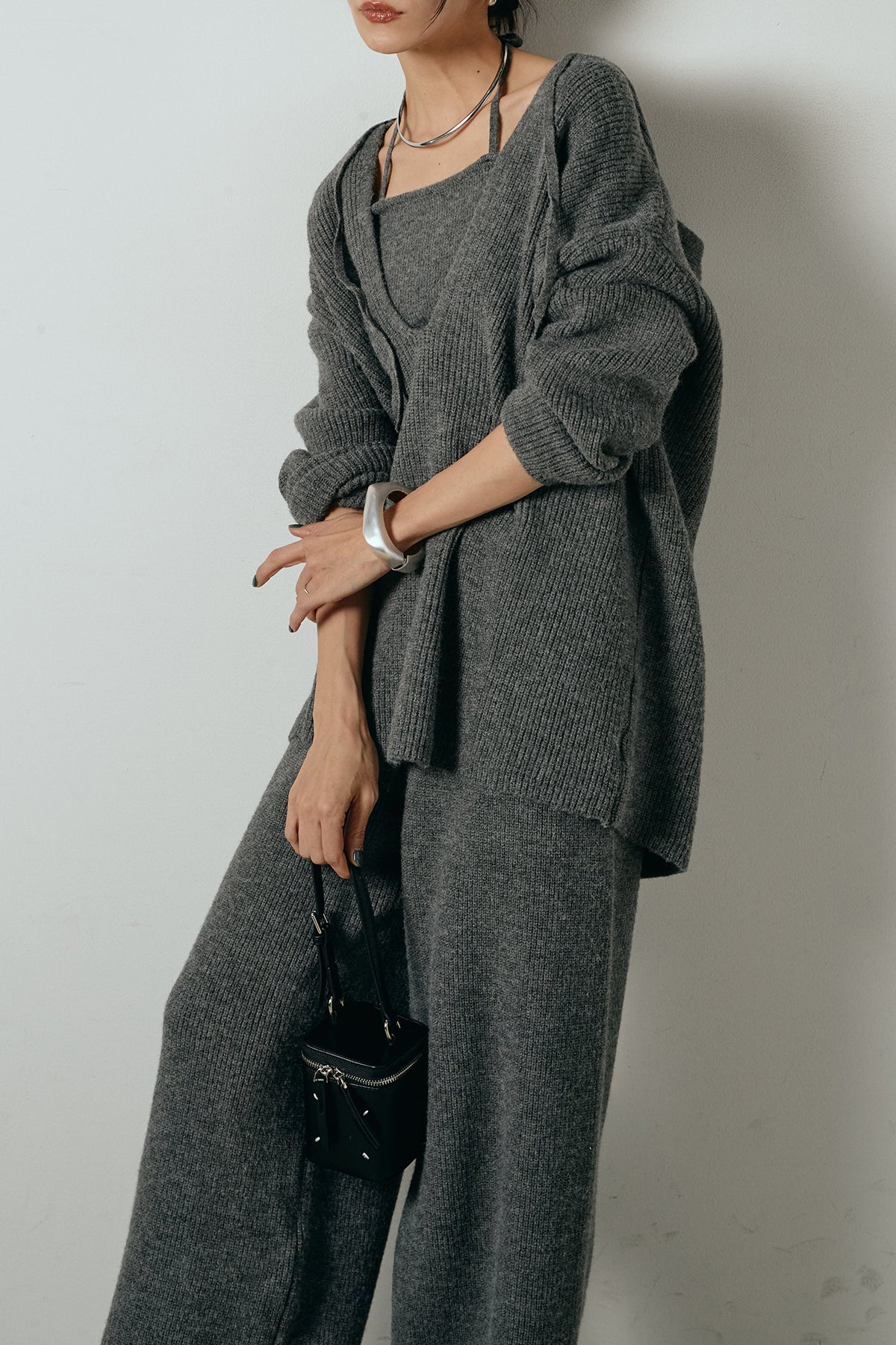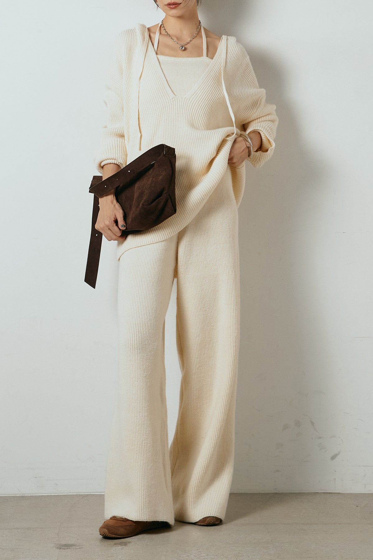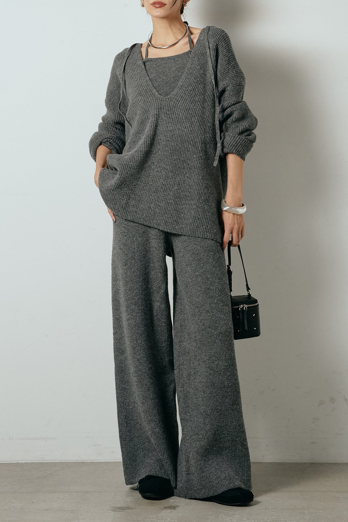 ホルターネックデザインがさりげないアクセントになる、ニットトップスとパンツのセットアップ。表情のある編地が柔らかな立体感を生み、リラックス感の中にも女性らしさを感じさせます。トップスは動きのあるシルエットで抜け感を演出し、ワイドパンツと合わせることで縦ラインを強調。セットではもちろん、単品使いもしやすく、幅広いスタイリングに活躍するアイテムです。