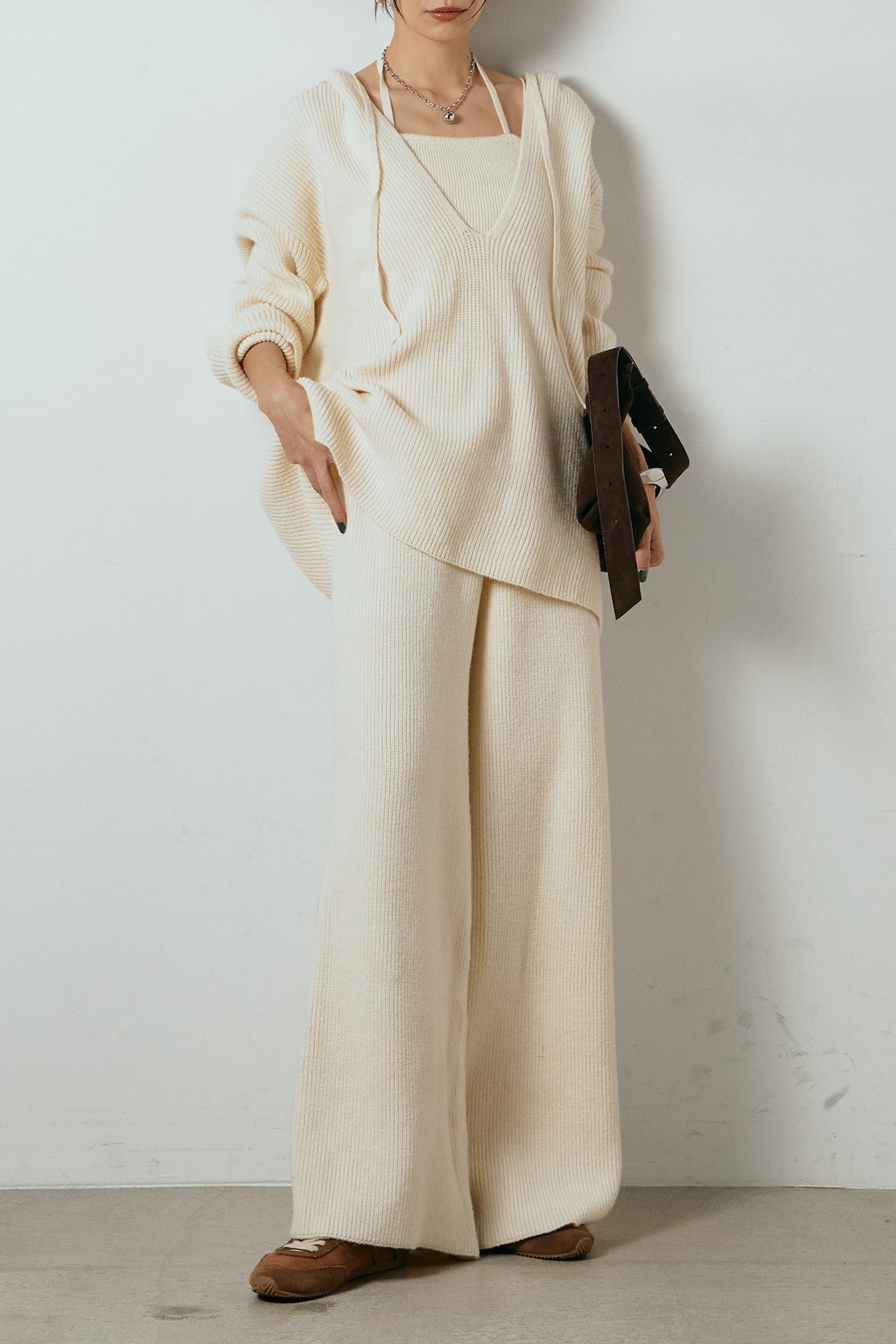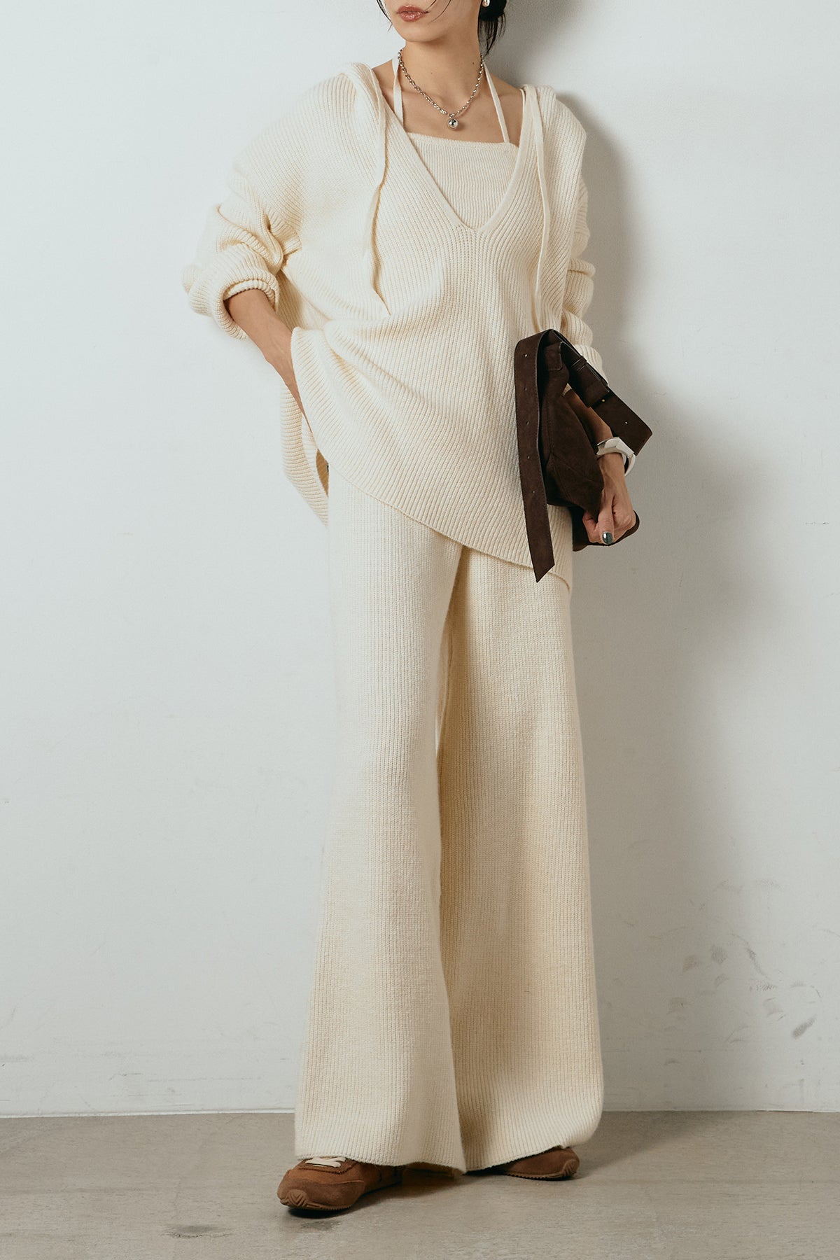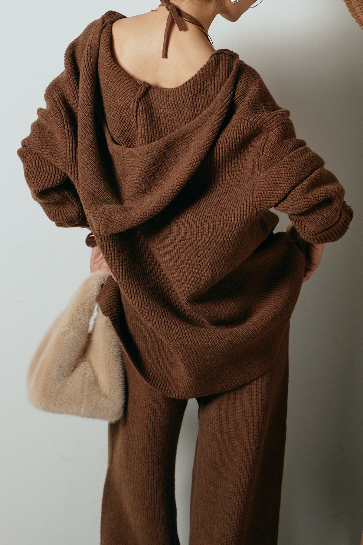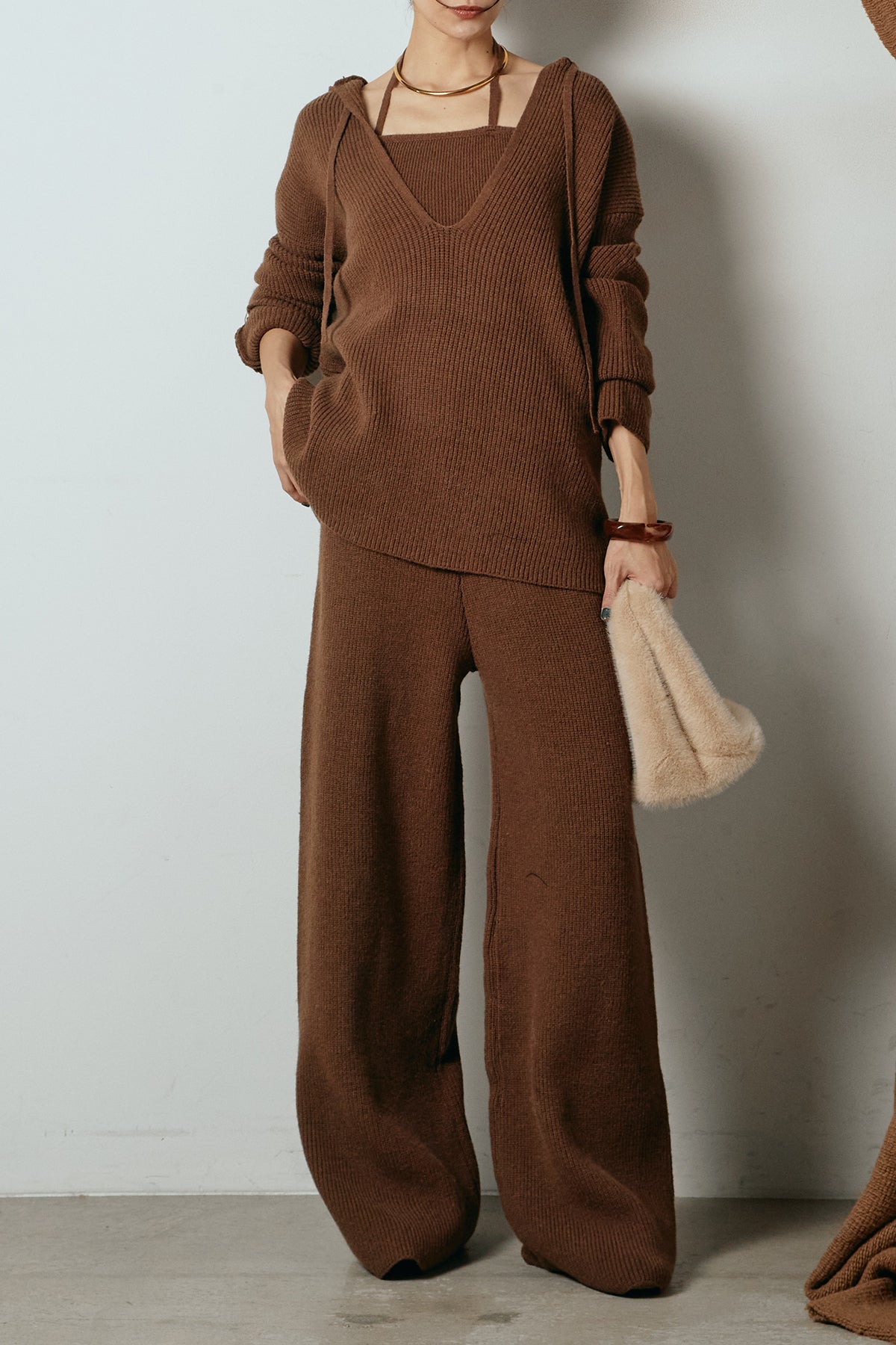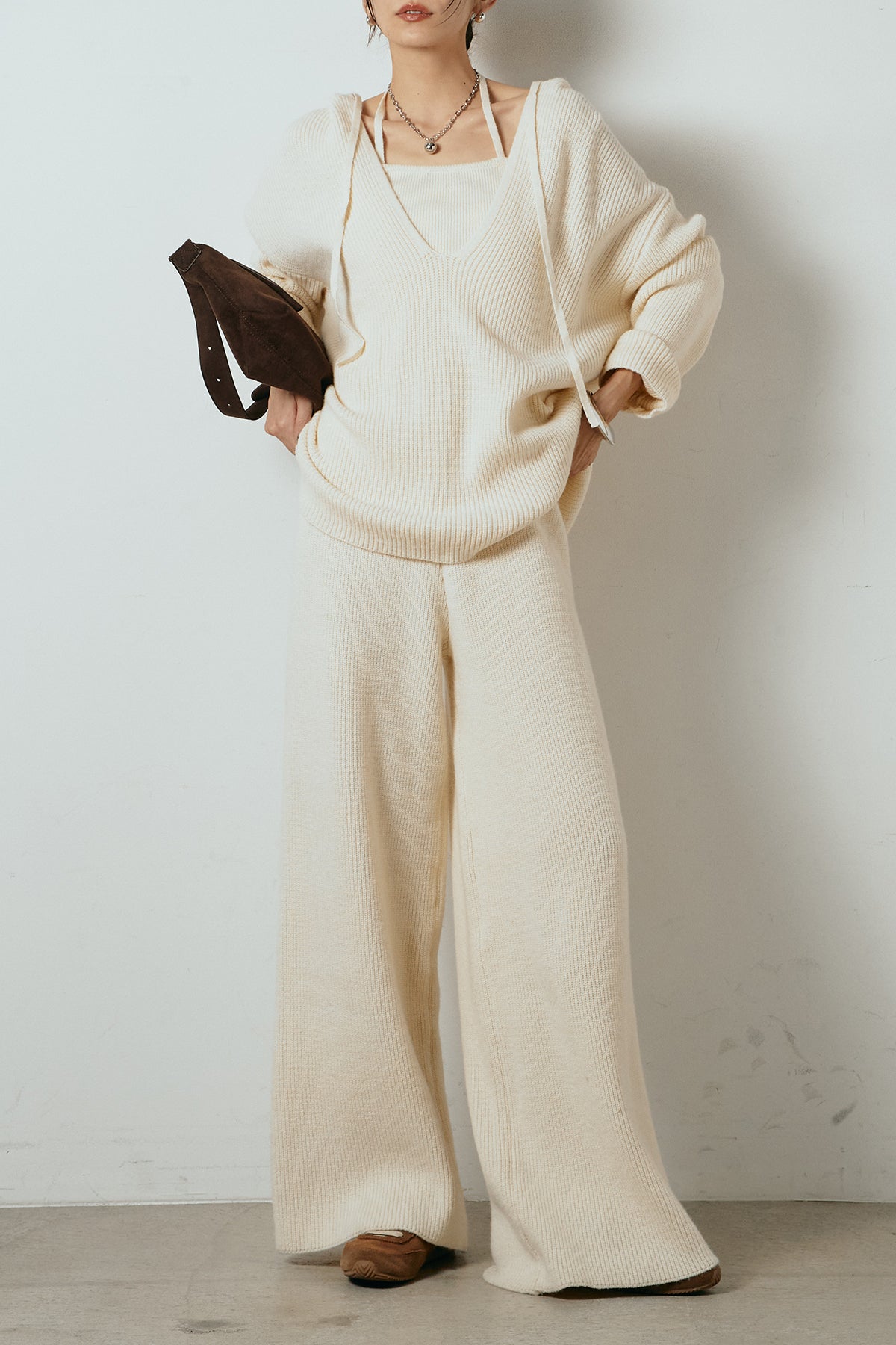 ホルターネックデザインがさりげないアクセントになる、ニットトップスとパンツのセットアップ。表情のある編地が柔らかな立体感を生み、リラックス感の中にも女性らしさを感じさせます。トップスは動きのあるシルエットで抜け感を演出し、ワイドパンツと合わせることで縦ラインを強調。セットではもちろん、単品使いもしやすく、幅広いスタイリングに活躍するアイテムです。