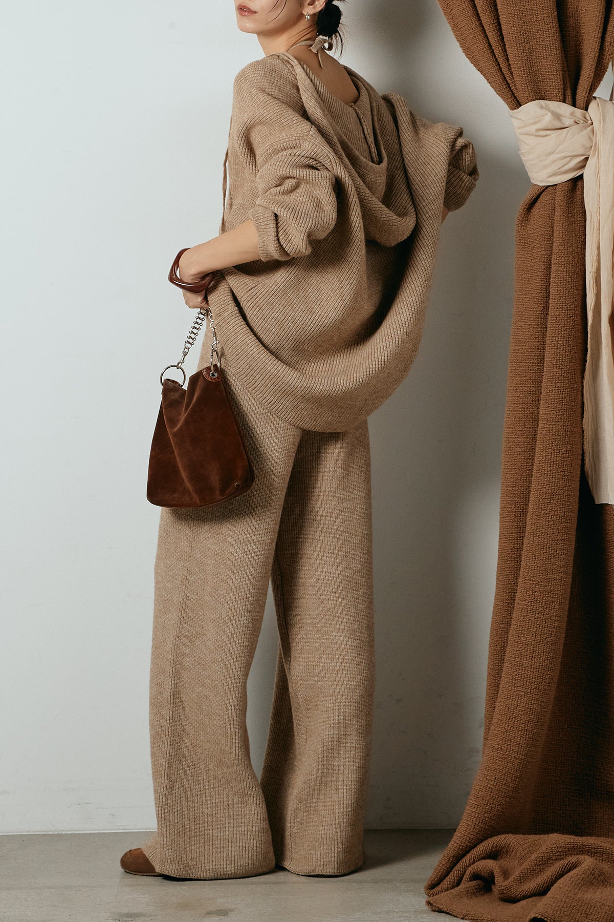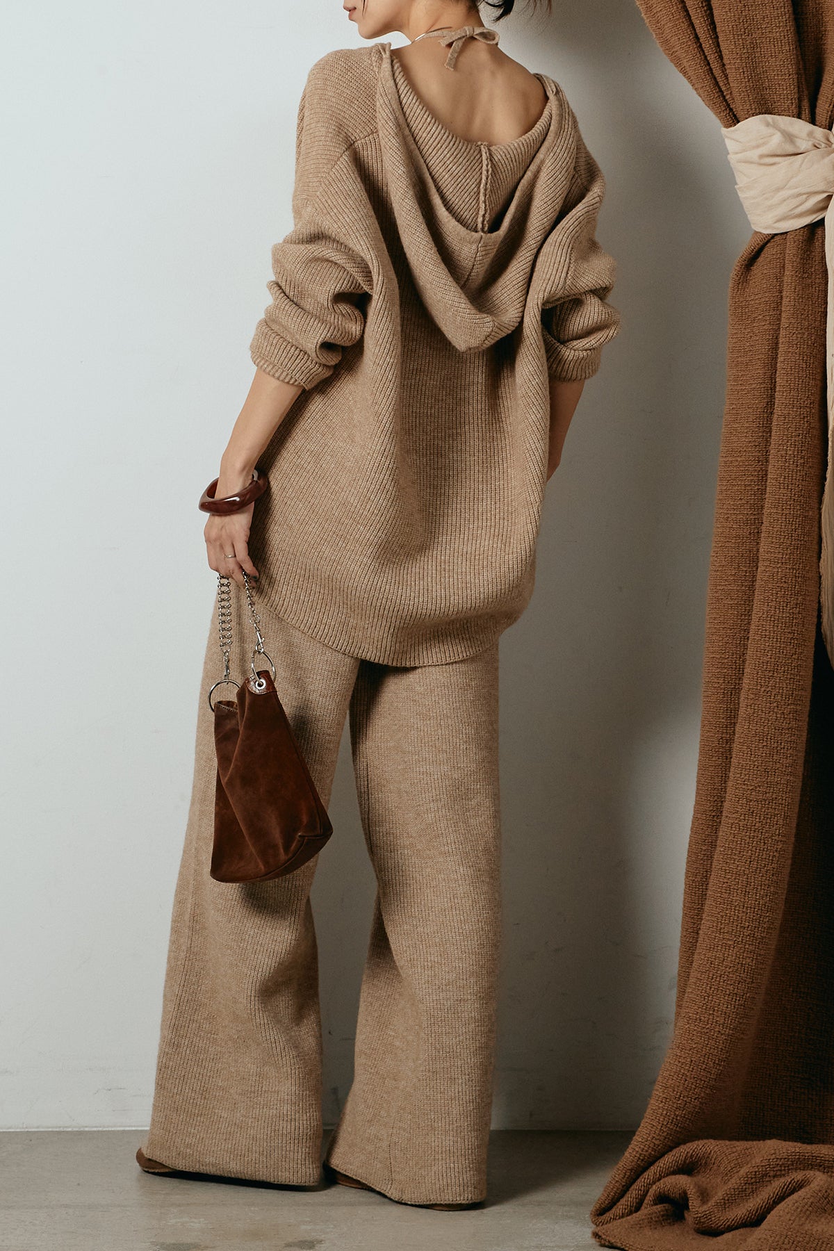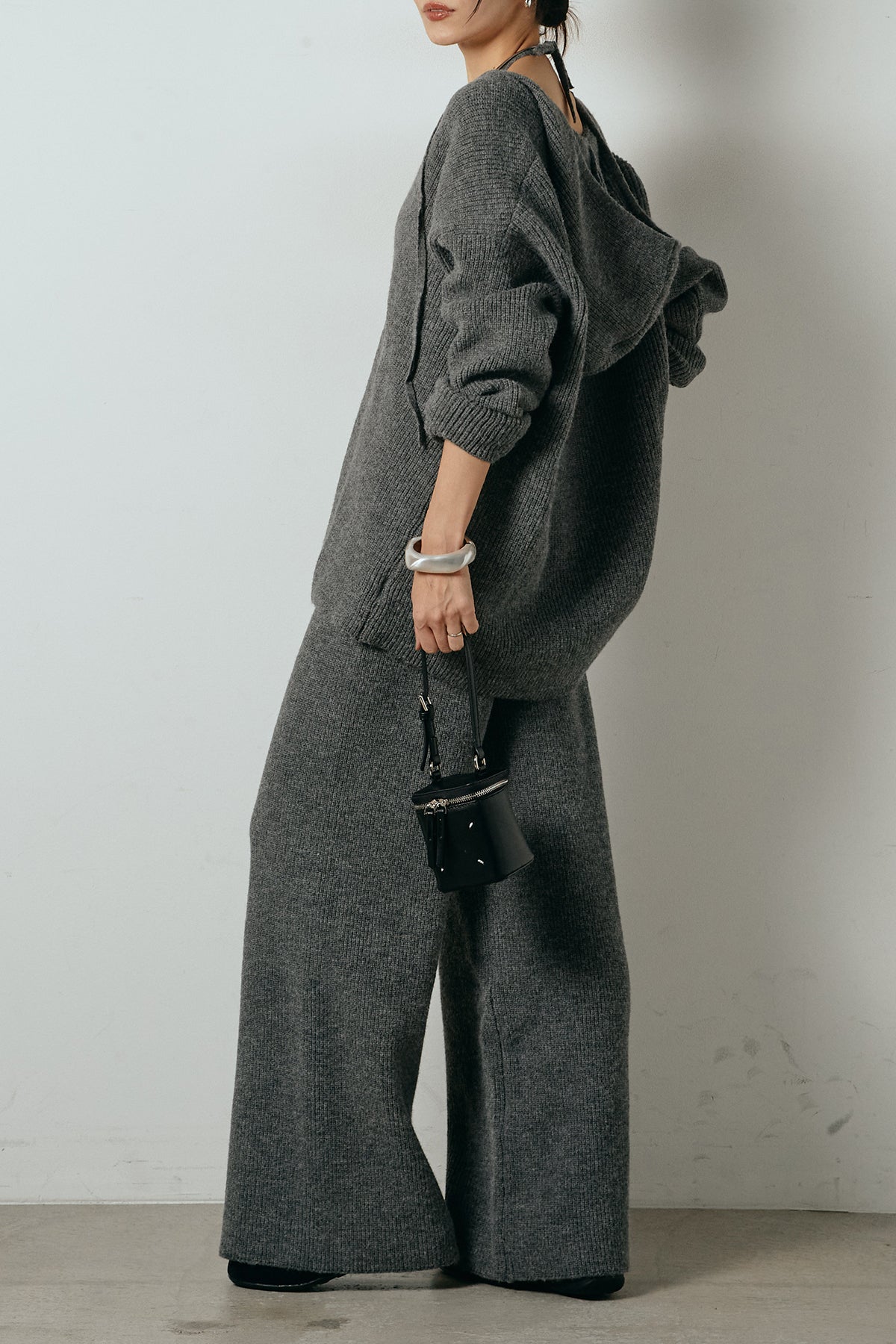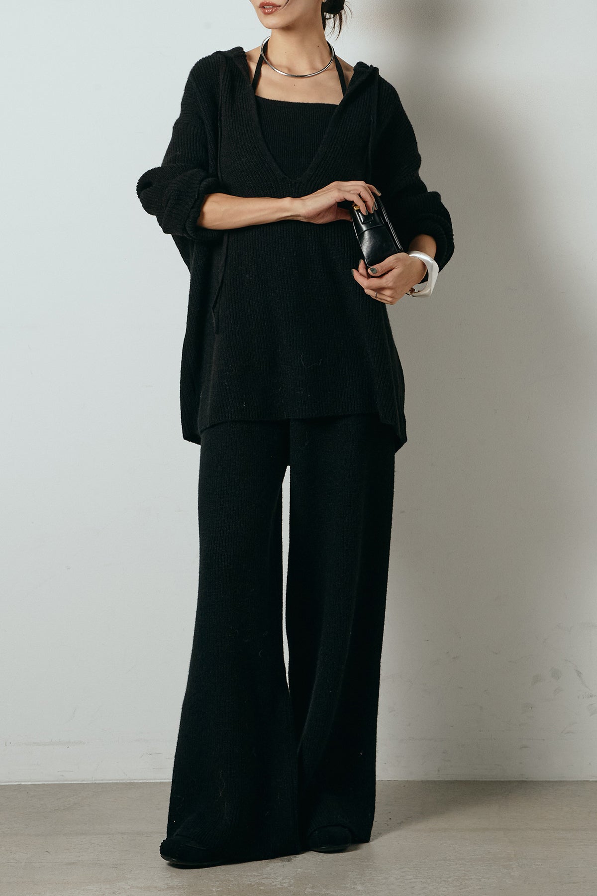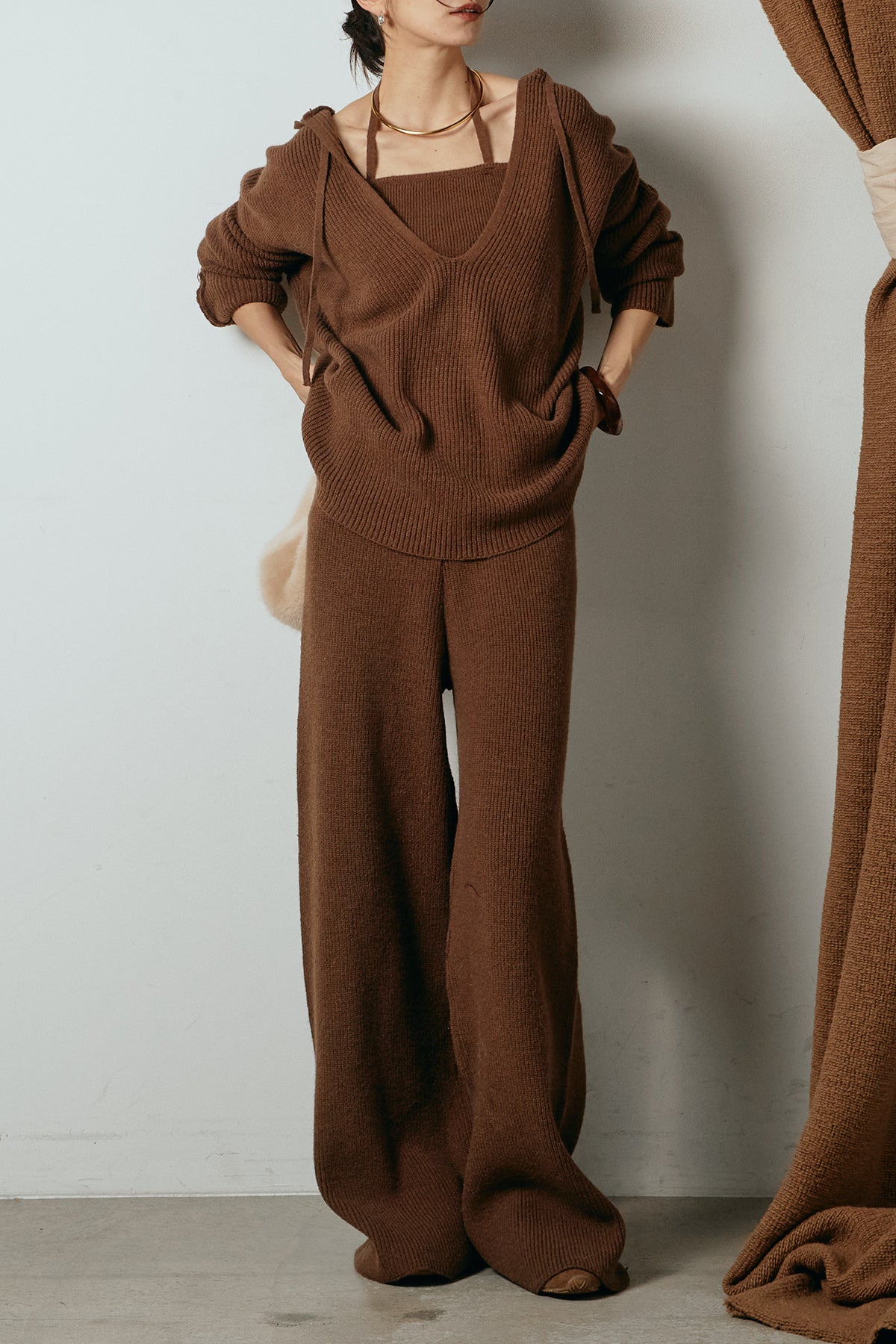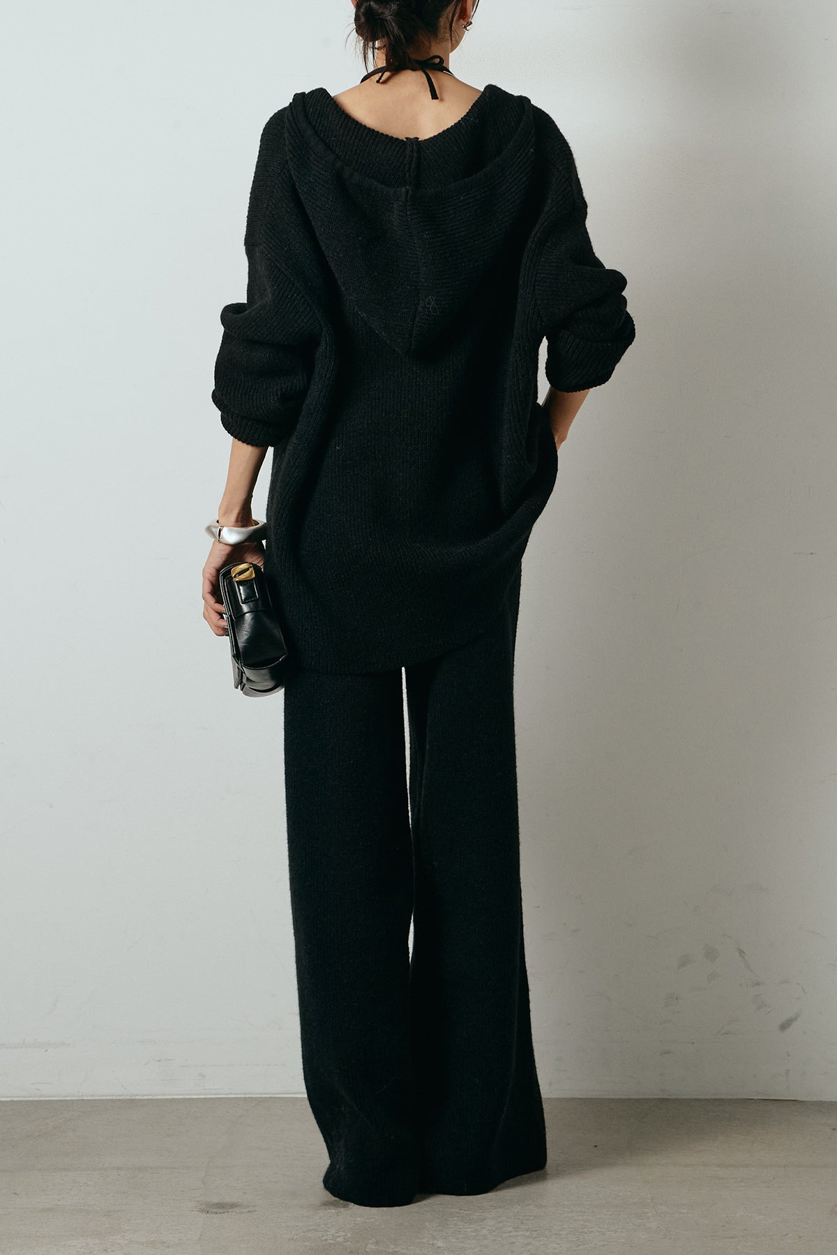 ホルターネックデザインがさりげないアクセントになる、ニットトップスとパンツのセットアップ。表情のある編地が柔らかな立体感を生み、リラックス感の中にも女性らしさを感じさせます。トップスは動きのあるシルエットで抜け感を演出し、ワイドパンツと合わせることで縦ラインを強調。セットではもちろん、単品使いもしやすく、幅広いスタイリングに活躍するアイテムです。