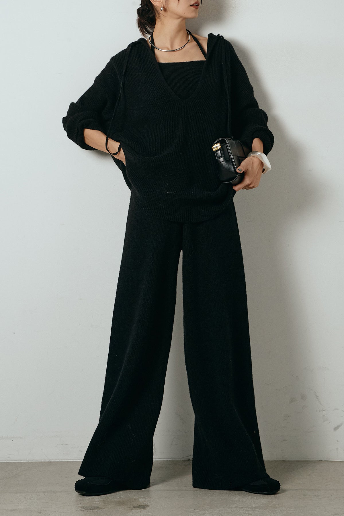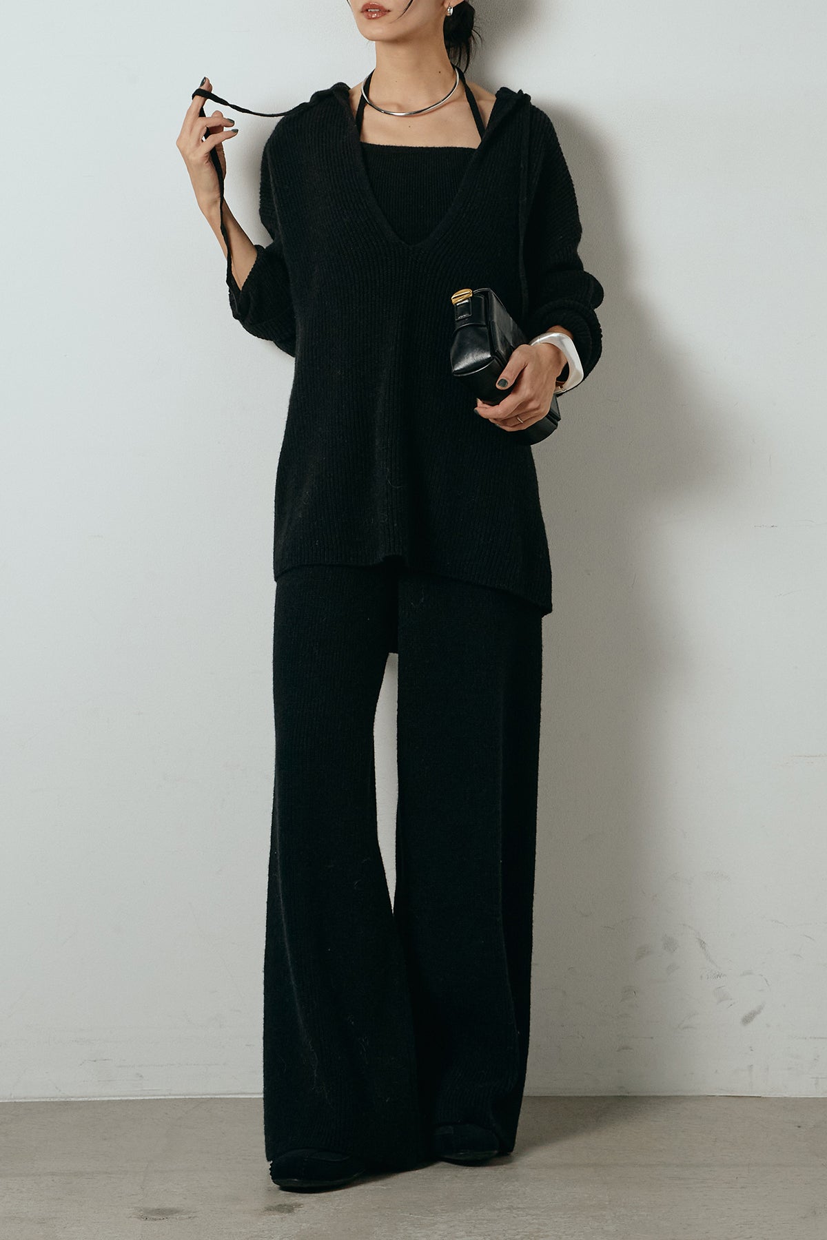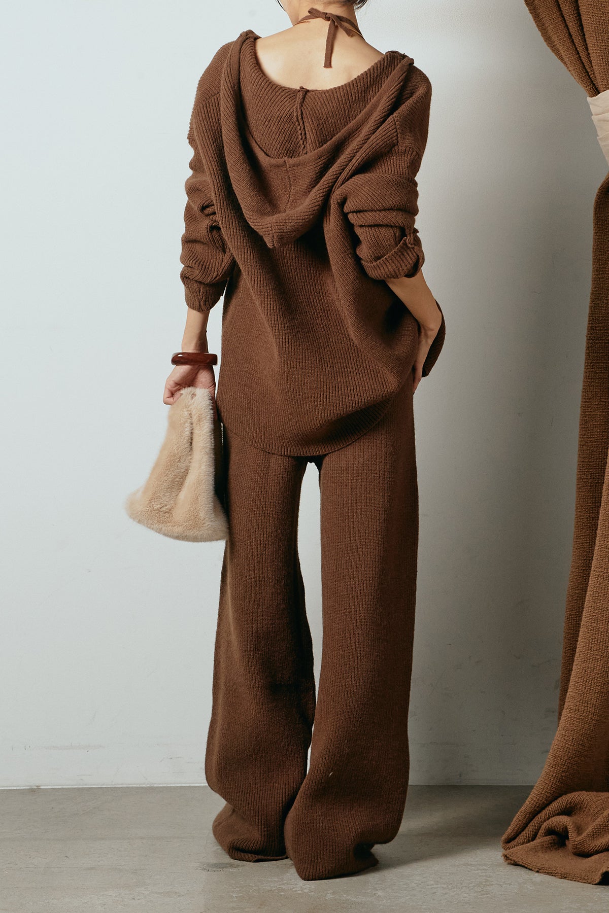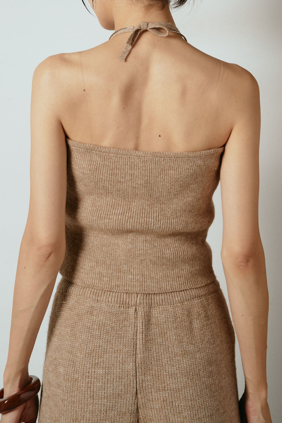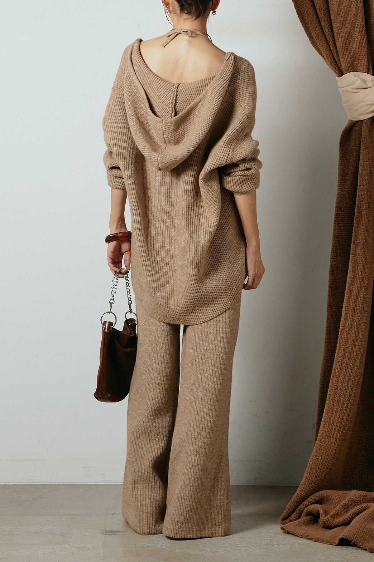 ホルターネックデザインがさりげないアクセントになる、ニットトップスとパンツのセットアップ。表情のある編地が柔らかな立体感を生み、リラックス感の中にも女性らしさを感じさせます。トップスは動きのあるシルエットで抜け感を演出し、ワイドパンツと合わせることで縦ラインを強調。セットではもちろん、単品使いもしやすく、幅広いスタイリングに活躍するアイテムです。