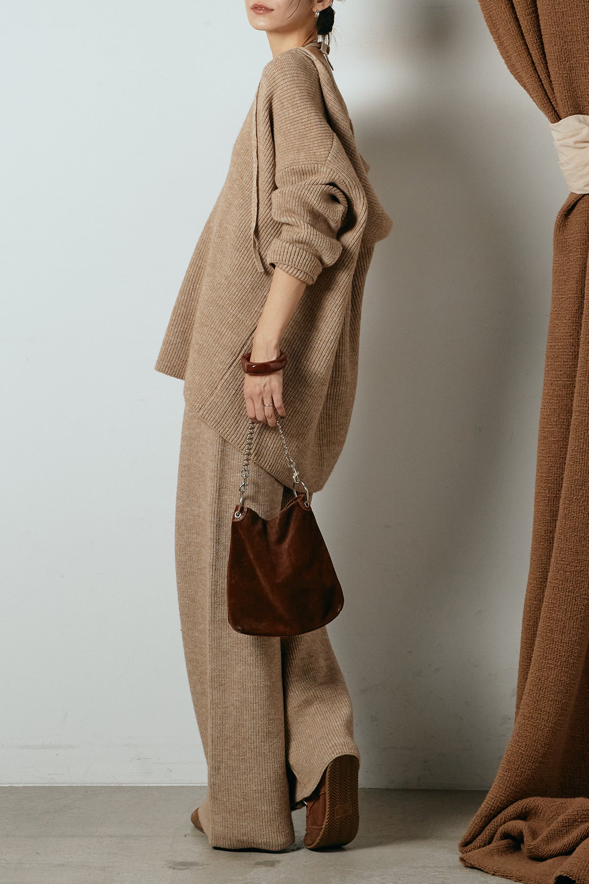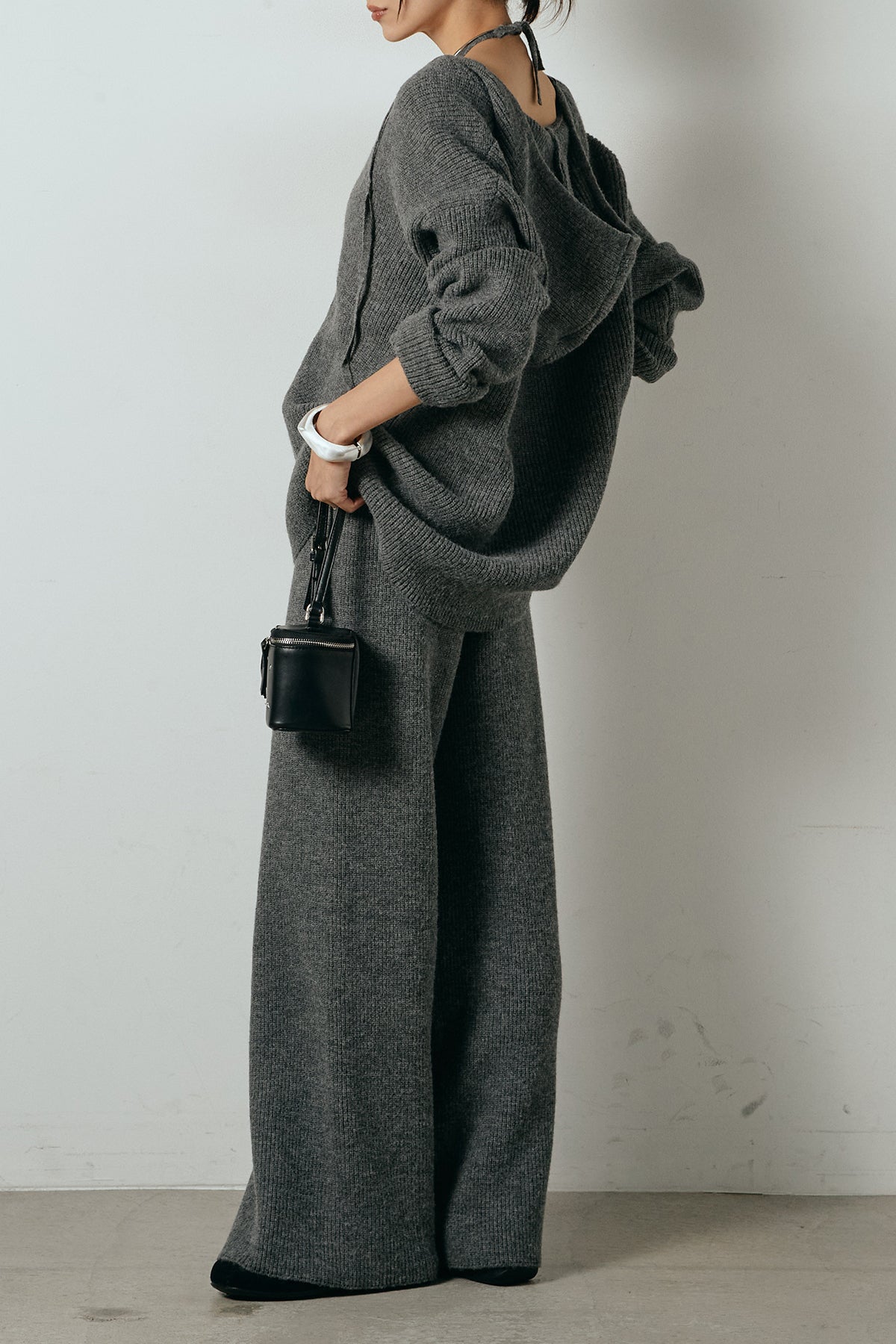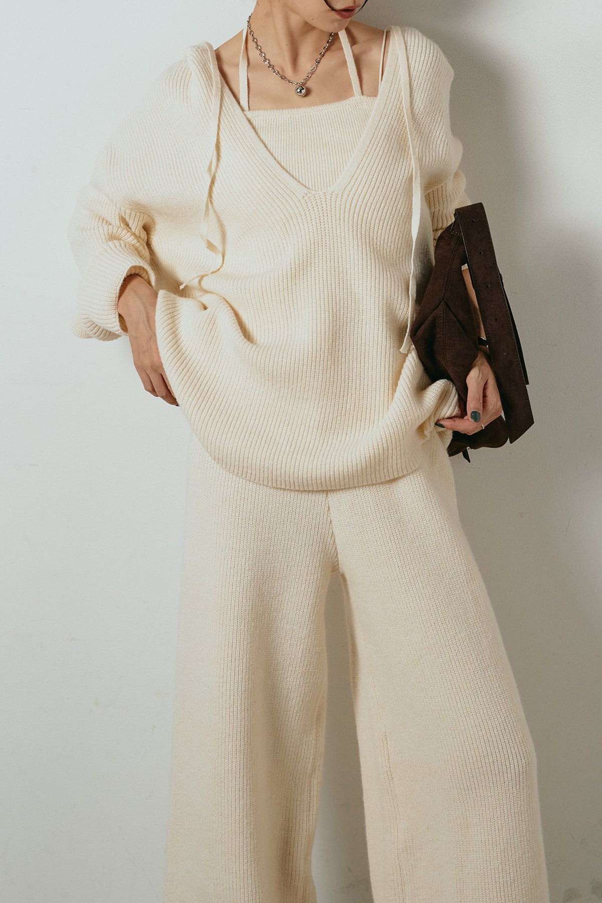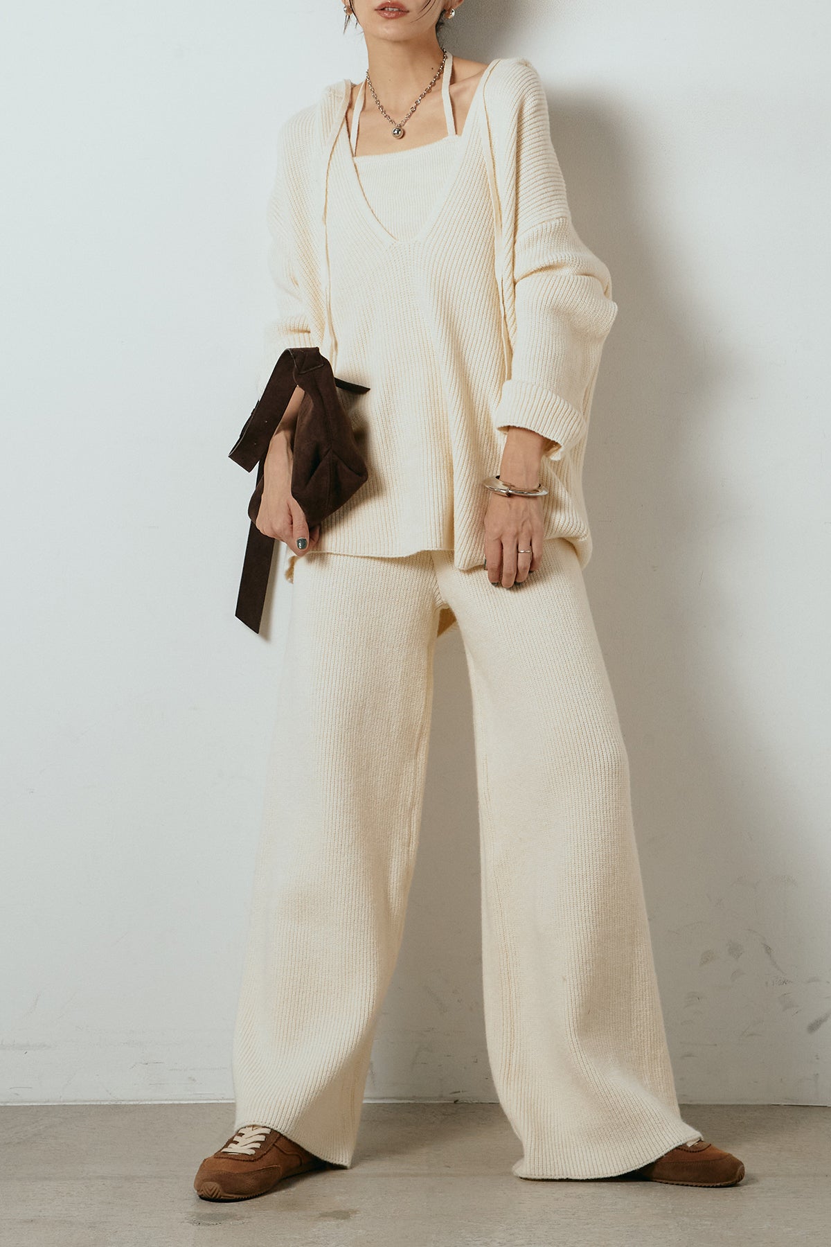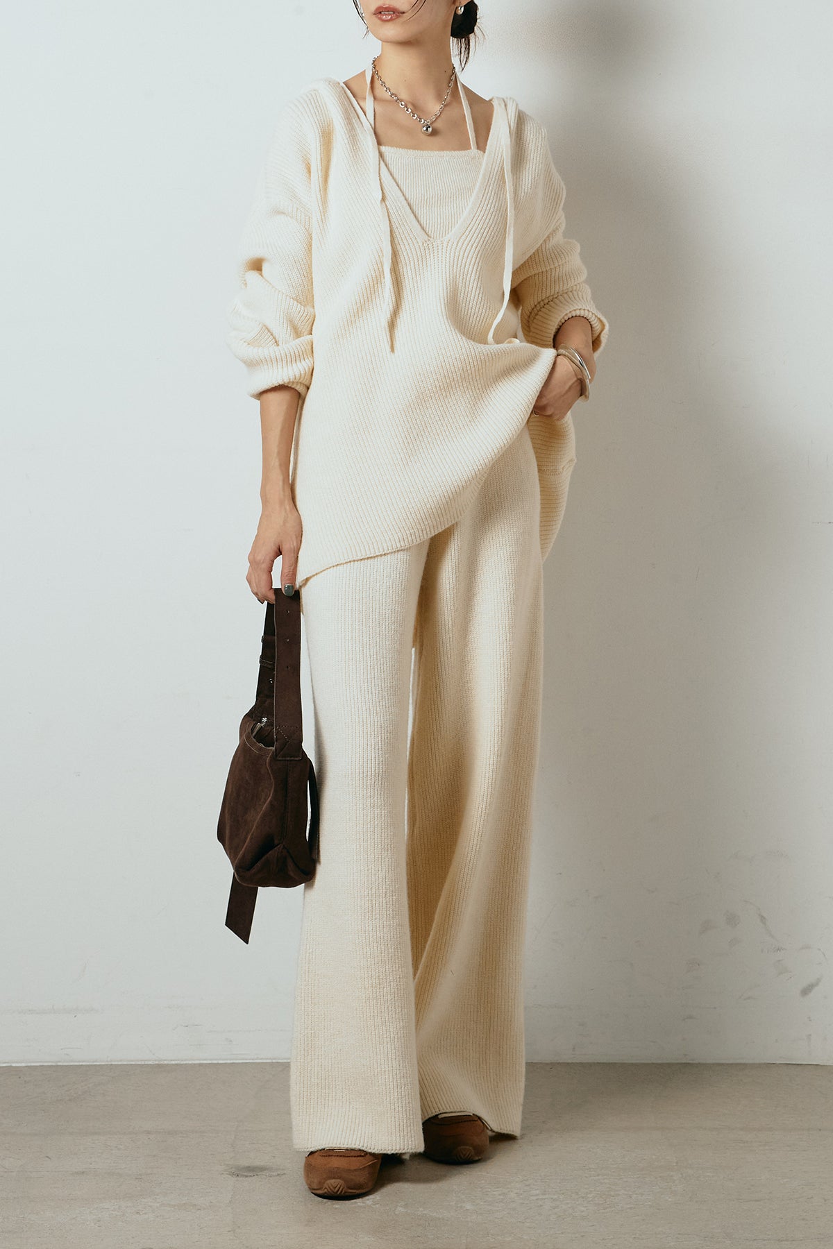 ホルターネックデザインがさりげないアクセントになる、ニットトップスとパンツのセットアップ。表情のある編地が柔らかな立体感を生み、リラックス感の中にも女性らしさを感じさせます。トップスは動きのあるシルエットで抜け感を演出し、ワイドパンツと合わせることで縦ラインを強調。セットではもちろん、単品使いもしやすく、幅広いスタイリングに活躍するアイテムです。