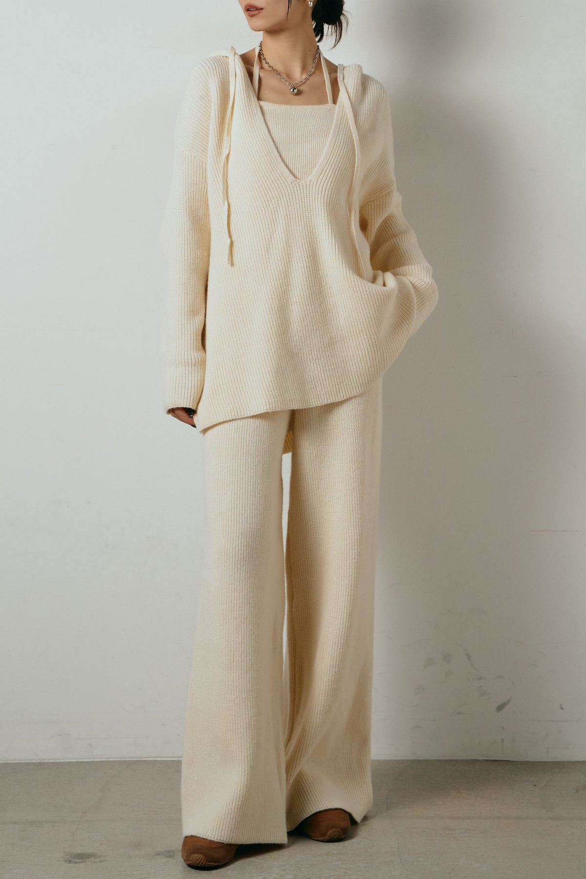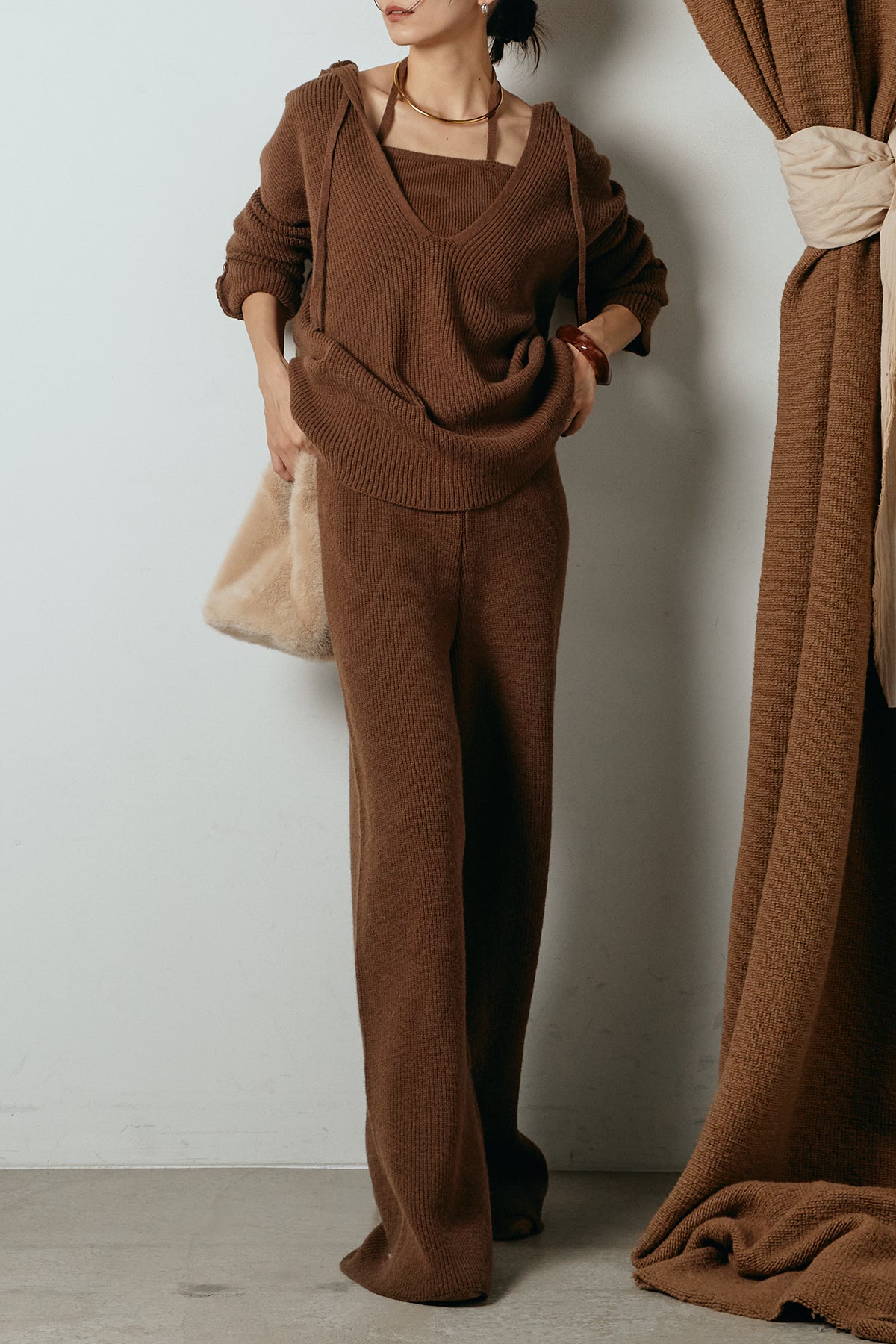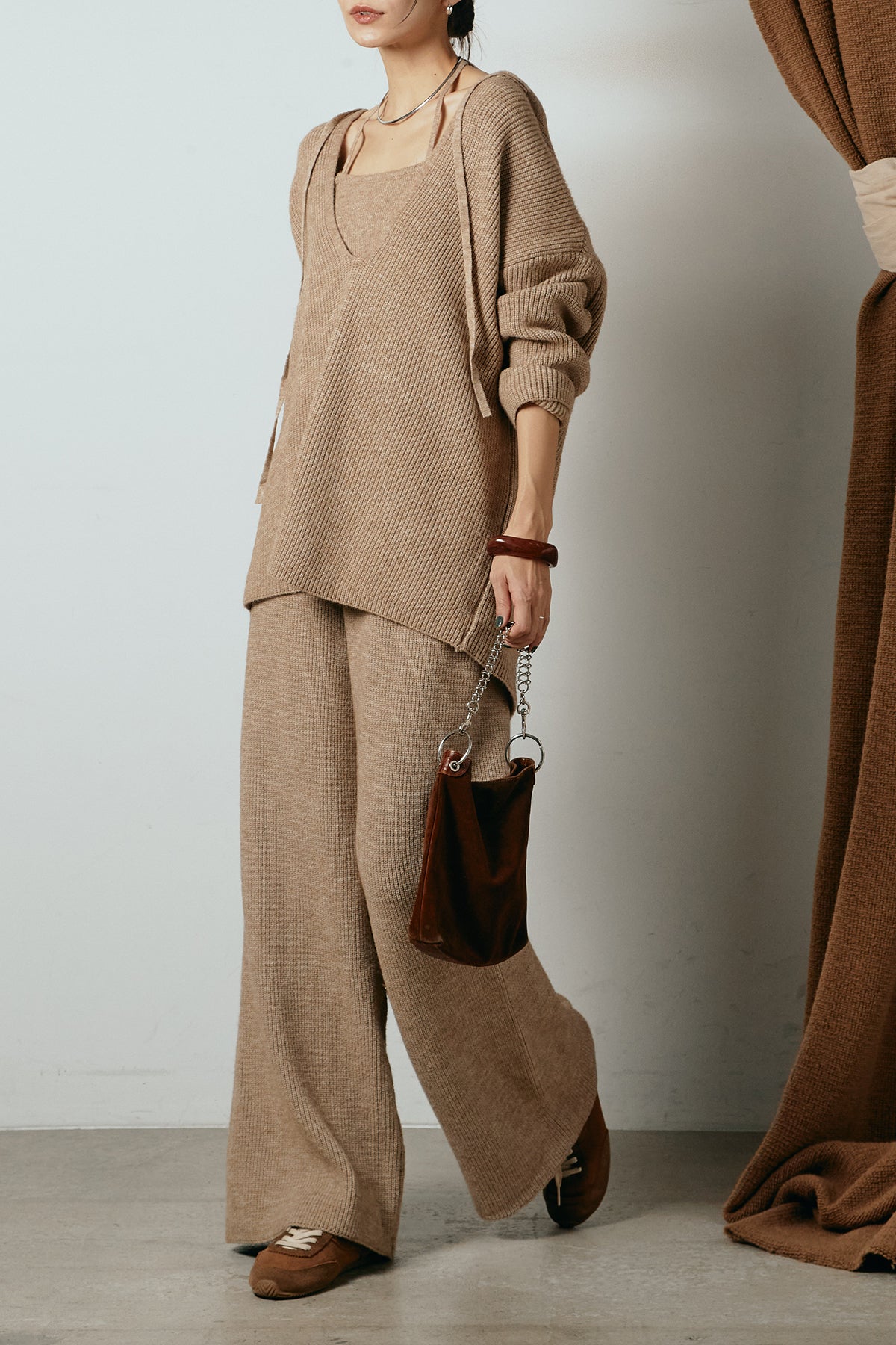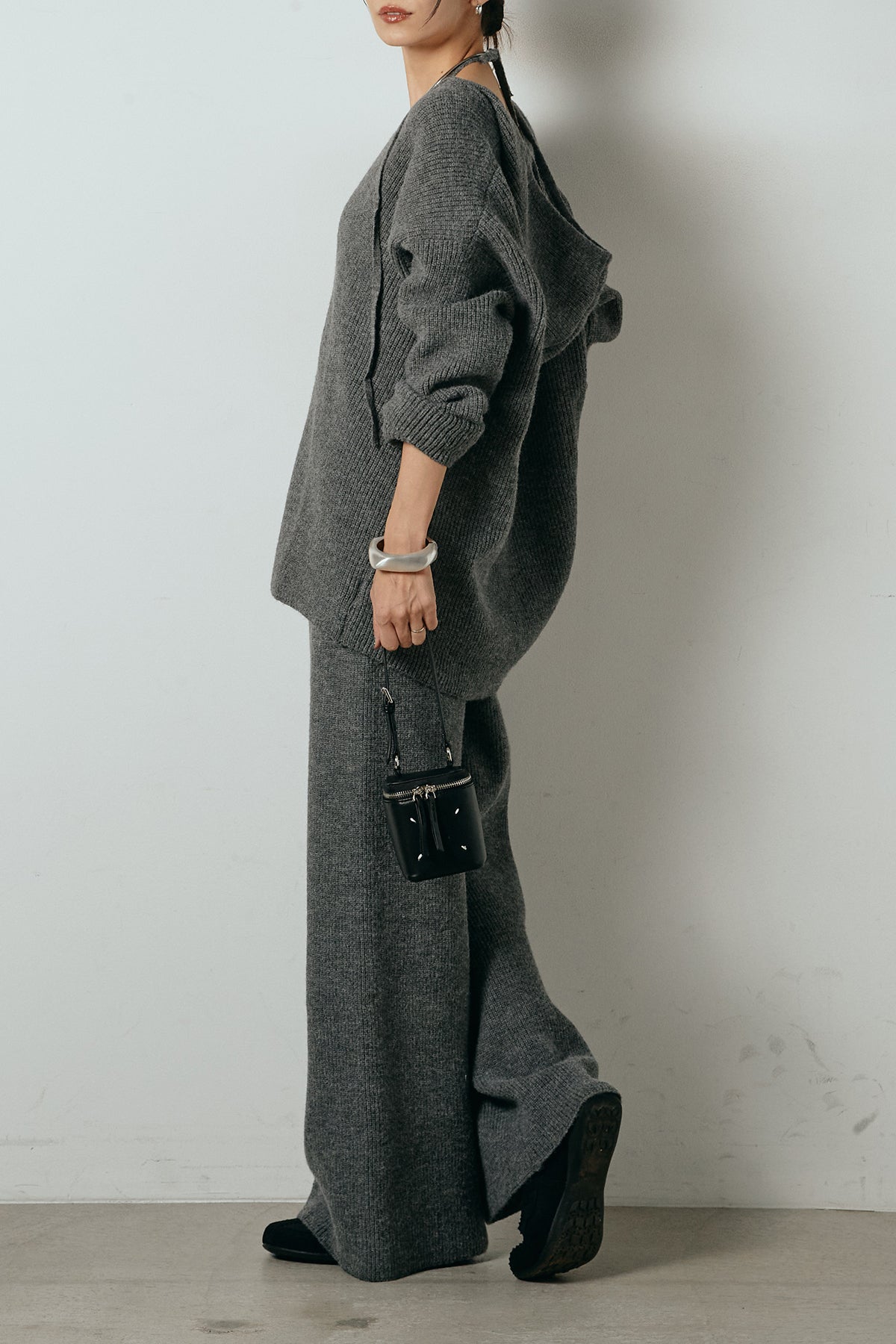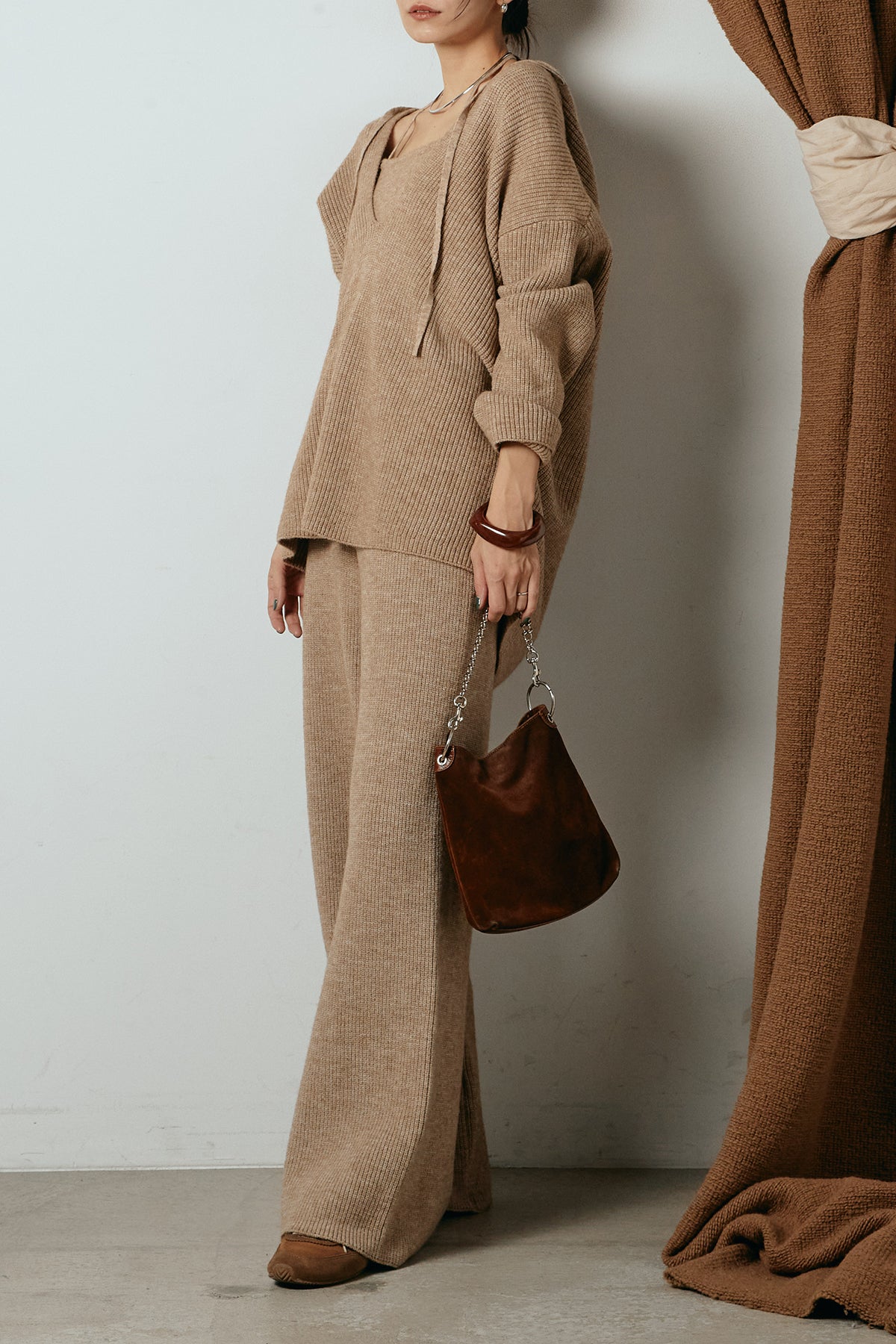 ホルターネックデザインがさりげないアクセントになる、ニットトップスとパンツのセットアップ。表情のある編地が柔らかな立体感を生み、リラックス感の中にも女性らしさを感じさせます。トップスは動きのあるシルエットで抜け感を演出し、ワイドパンツと合わせることで縦ラインを強調。セットではもちろん、単品使いもしやすく、幅広いスタイリングに活躍するアイテムです。