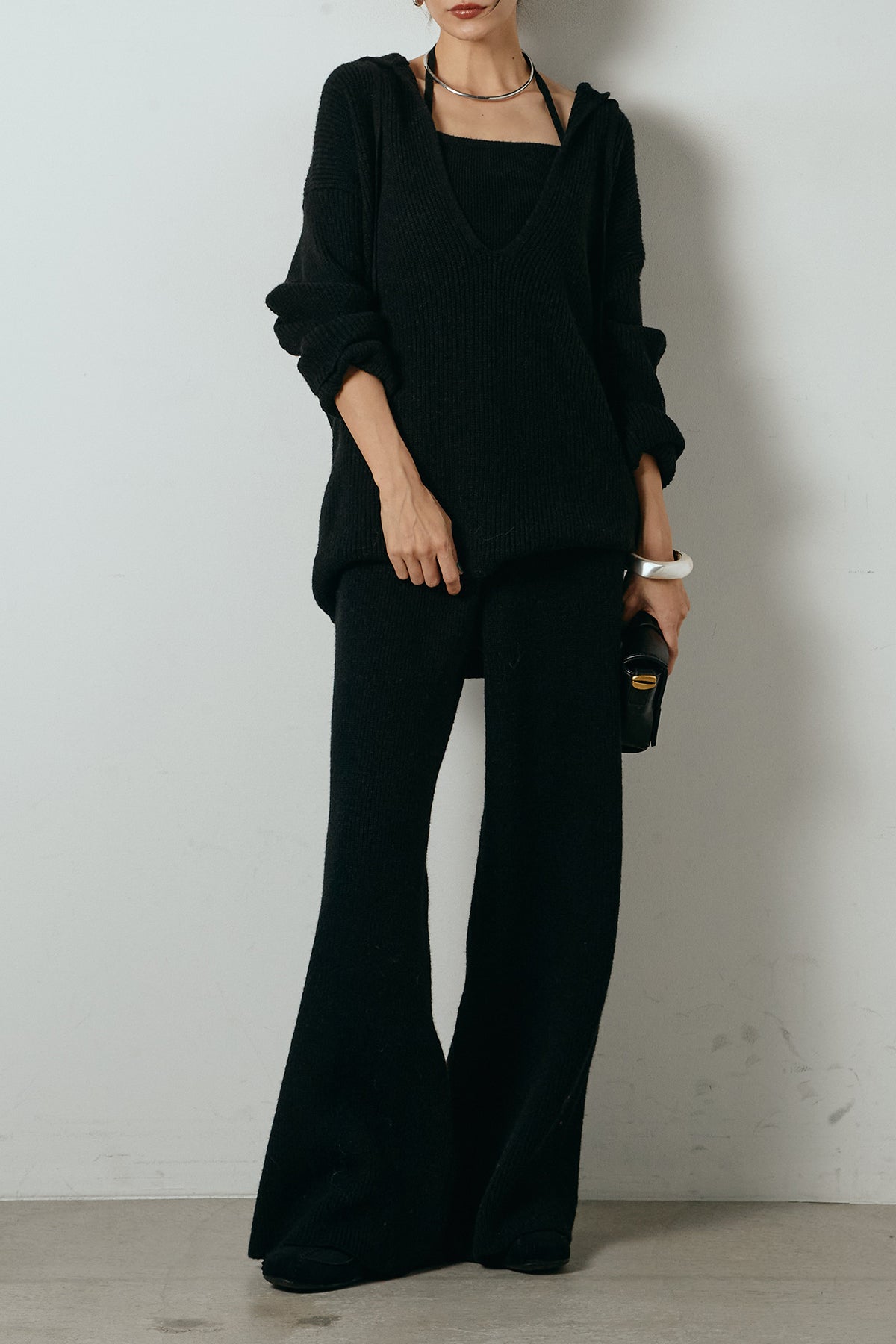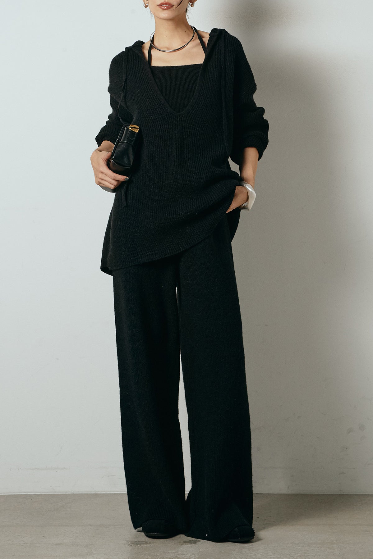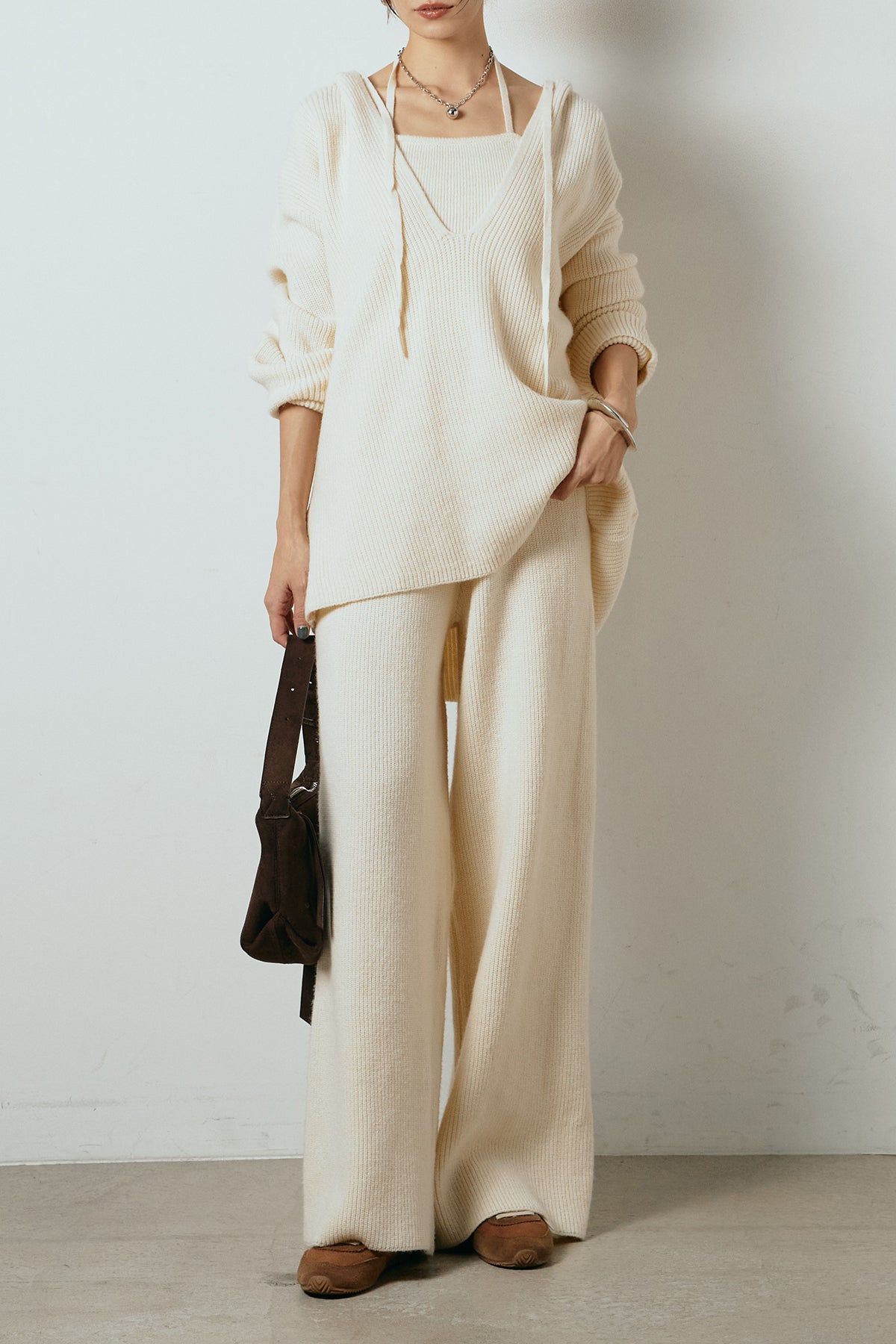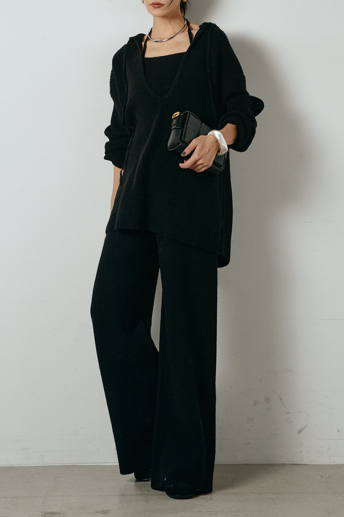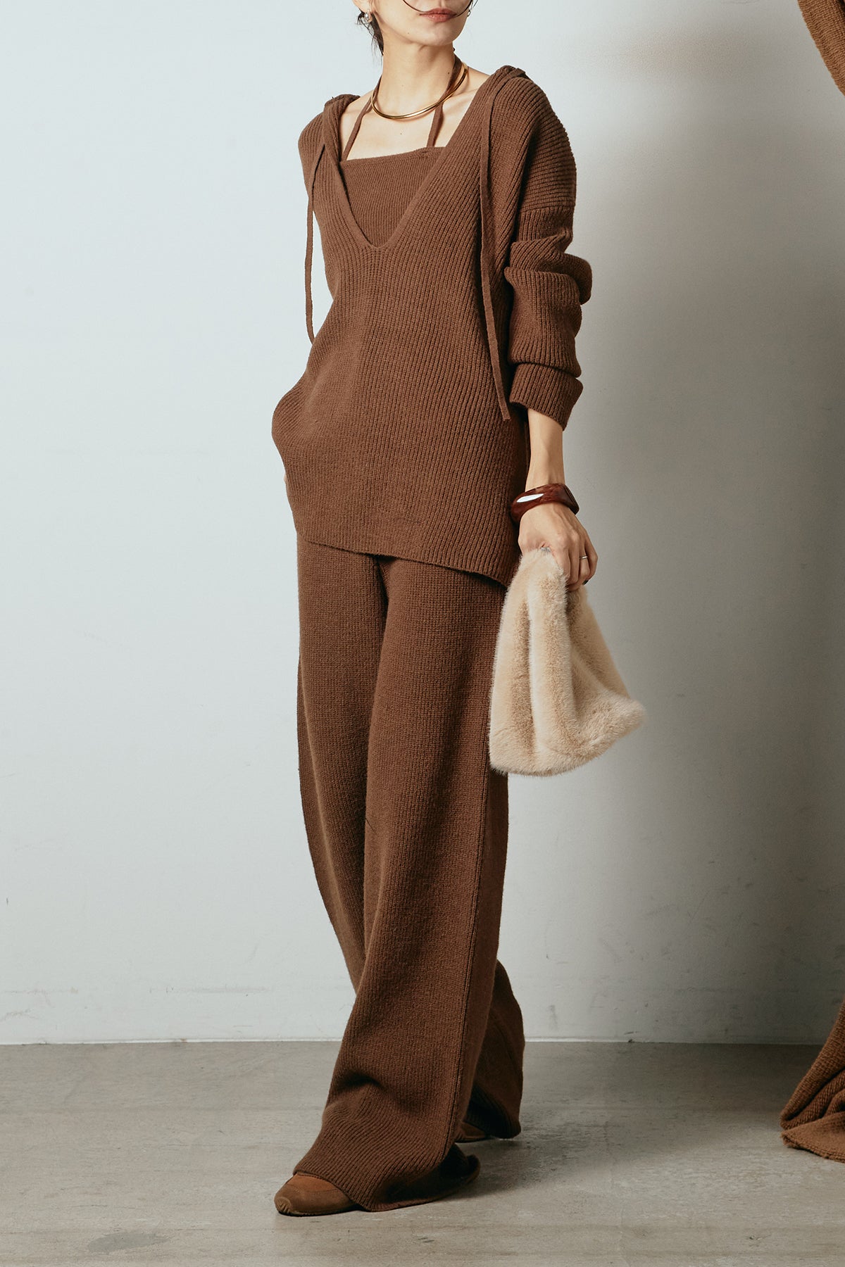 ホルターネックデザインがさりげないアクセントになる、ニットトップスとパンツのセットアップ。表情のある編地が柔らかな立体感を生み、リラックス感の中にも女性らしさを感じさせます。トップスは動きのあるシルエットで抜け感を演出し、ワイドパンツと合わせることで縦ラインを強調。セットではもちろん、単品使いもしやすく、幅広いスタイリングに活躍するアイテムです。