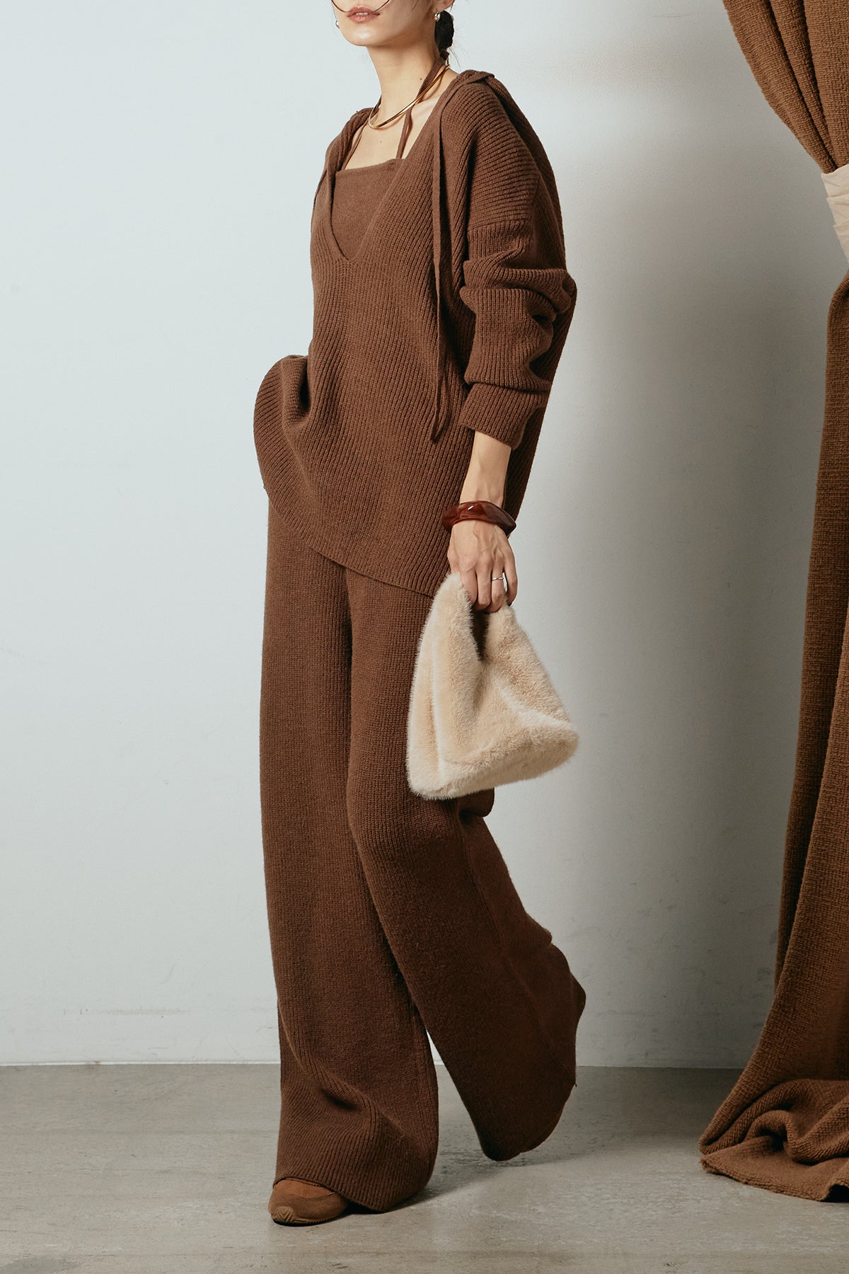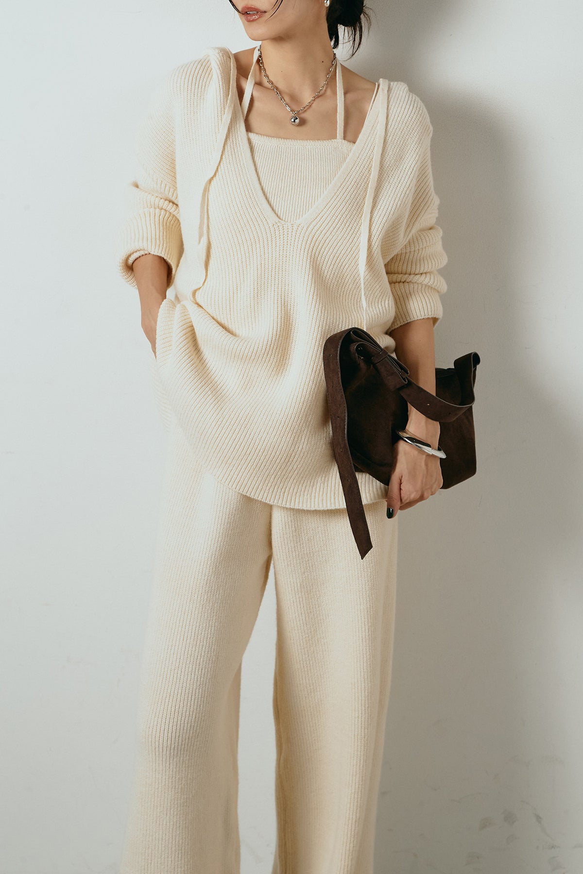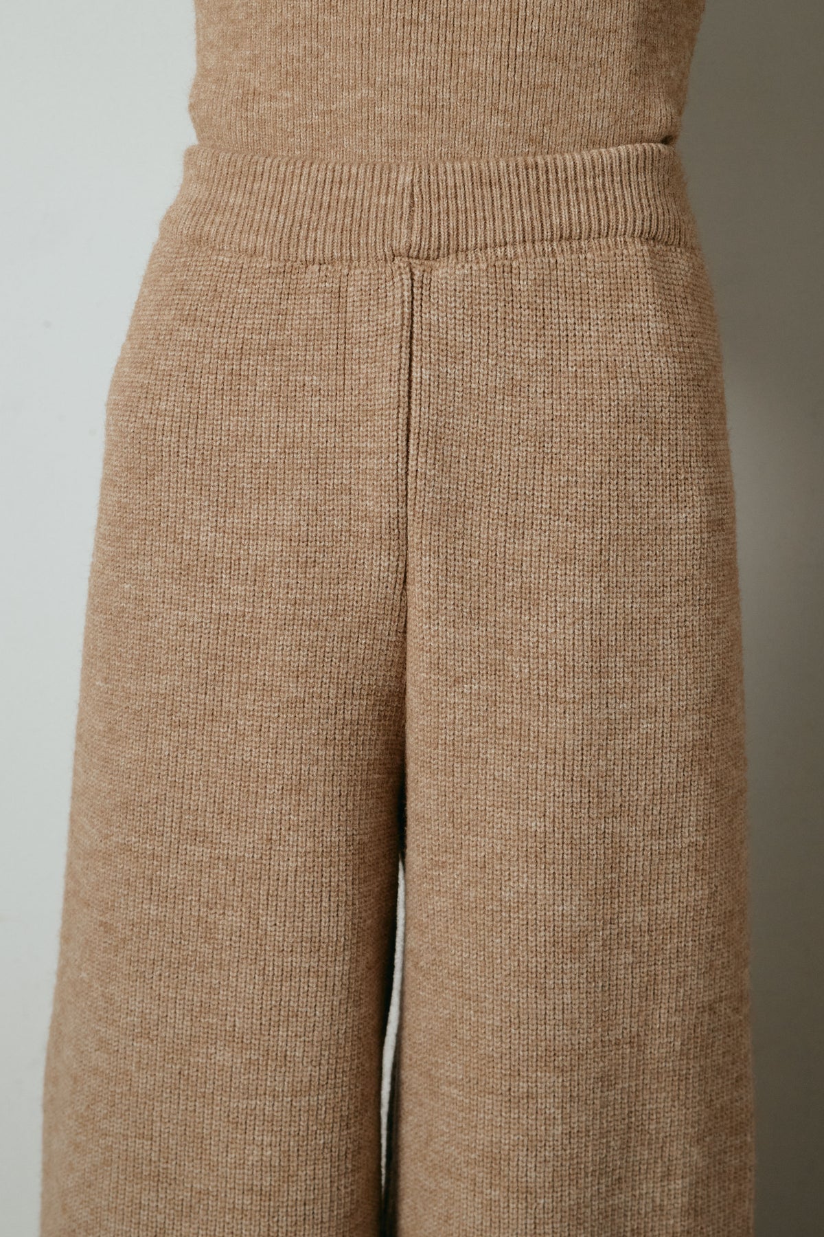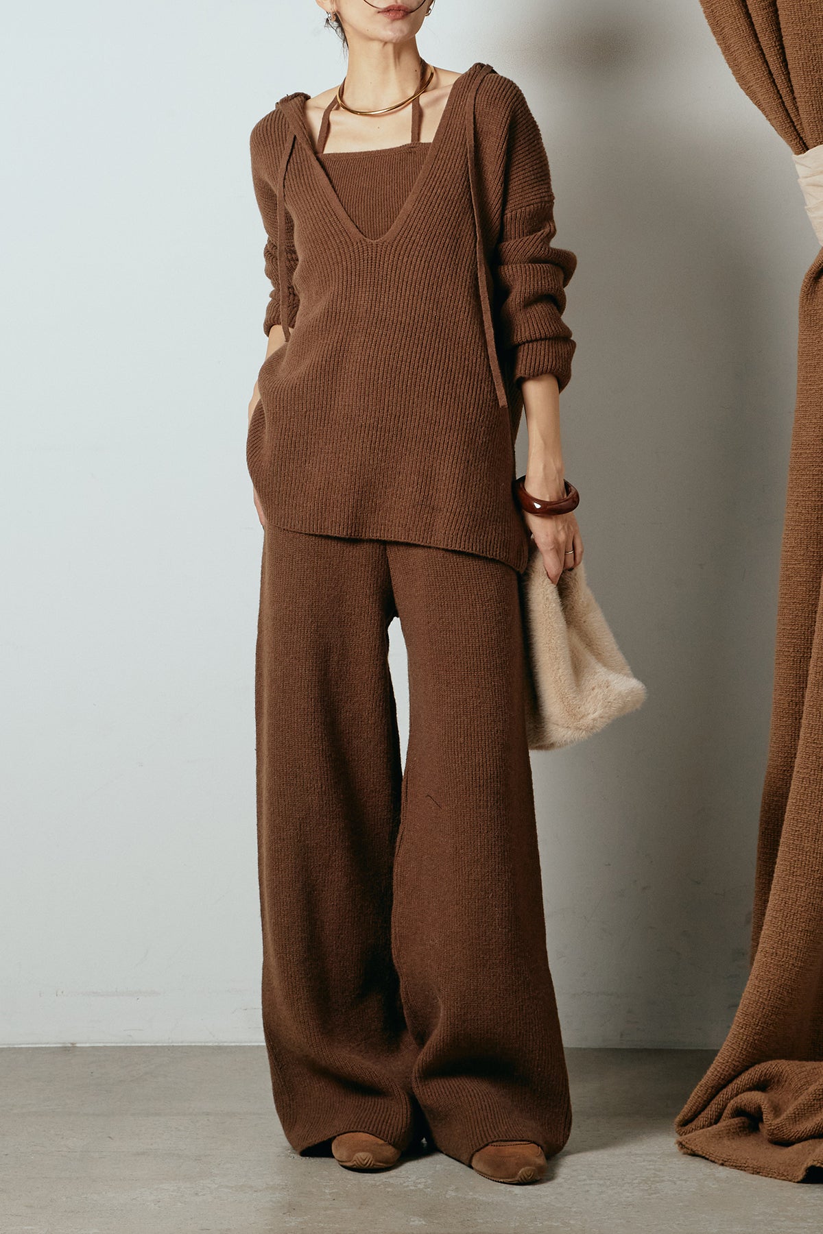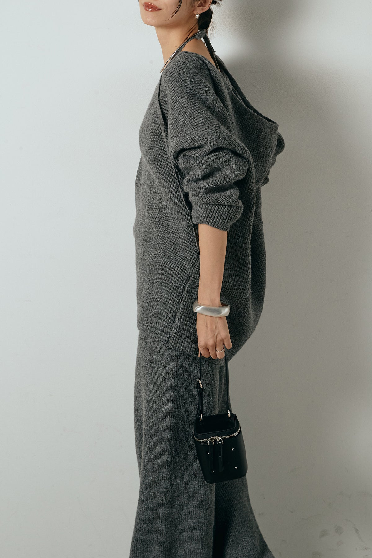 ホルターネックデザインがさりげないアクセントになる、ニットトップスとパンツのセットアップ。表情のある編地が柔らかな立体感を生み、リラックス感の中にも女性らしさを感じさせます。トップスは動きのあるシルエットで抜け感を演出し、ワイドパンツと合わせることで縦ラインを強調。セットではもちろん、単品使いもしやすく、幅広いスタイリングに活躍するアイテムです。