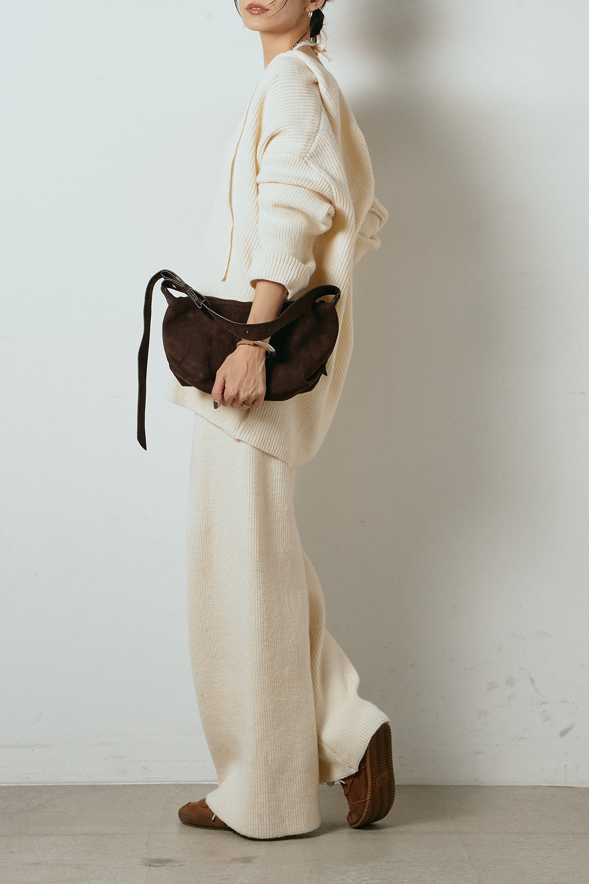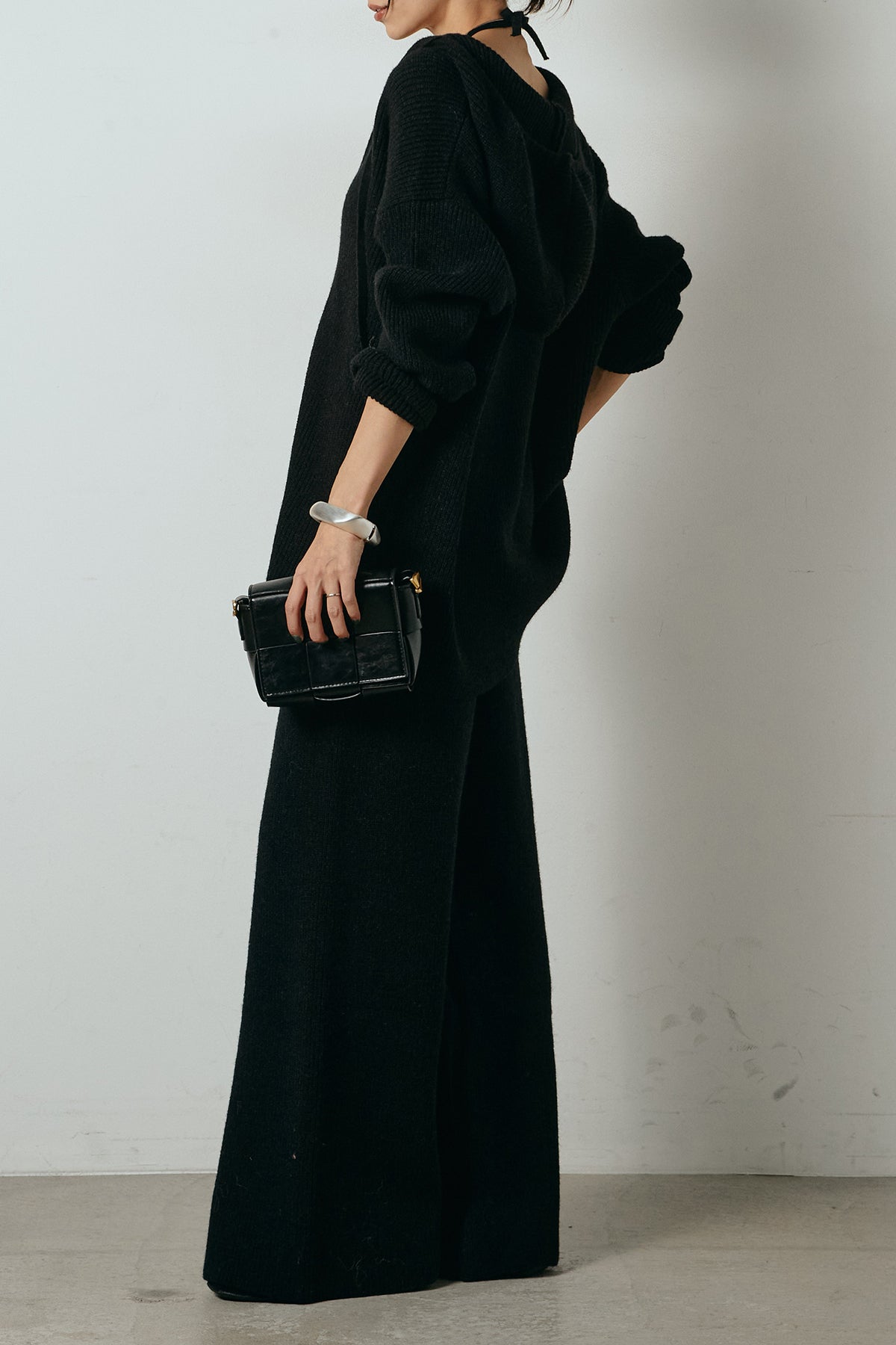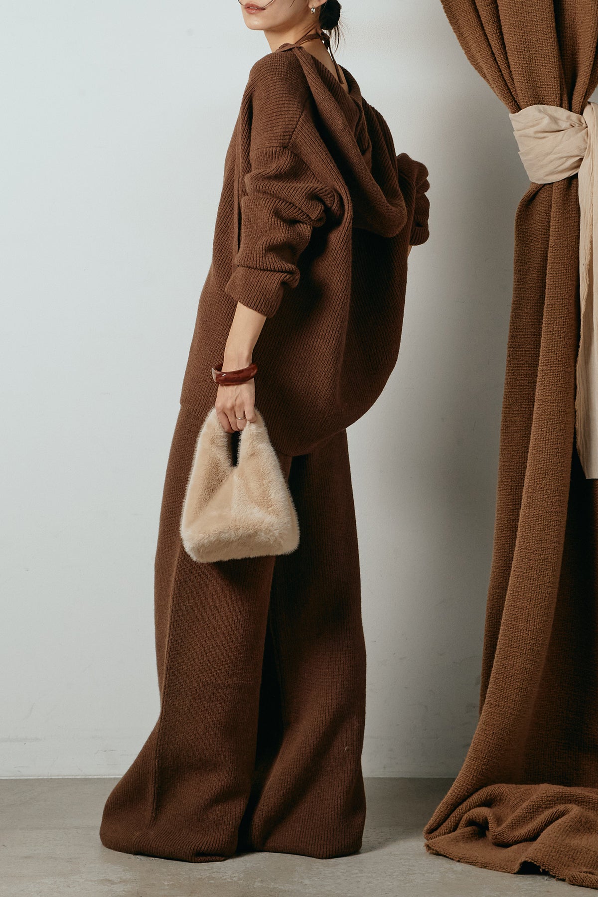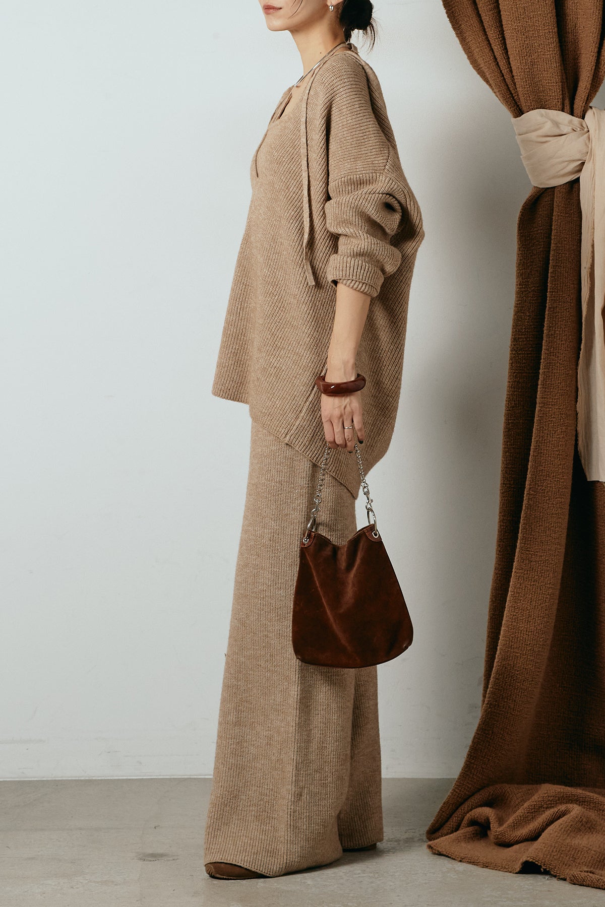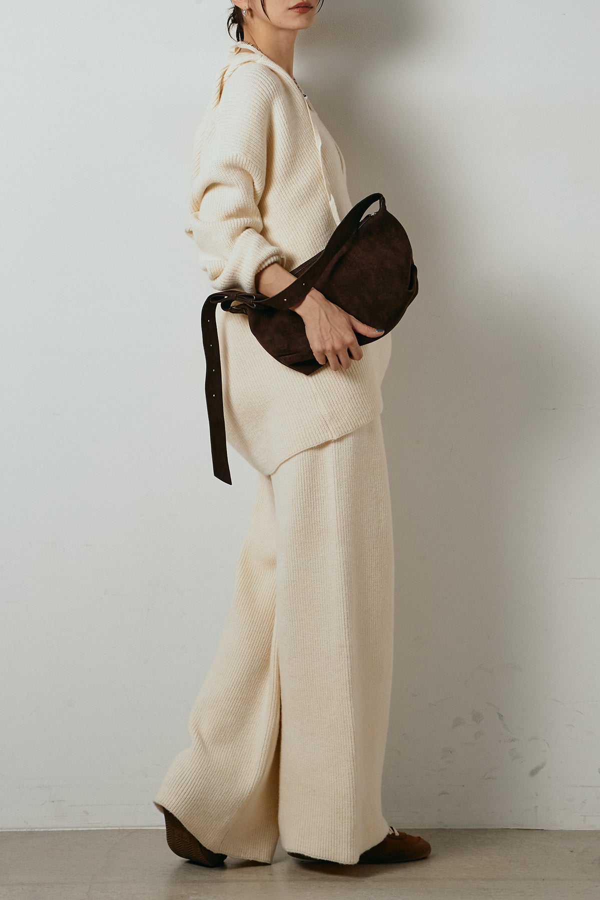 ホルターネックデザインがさりげないアクセントになる、ニットトップスとパンツのセットアップ。表情のある編地が柔らかな立体感を生み、リラックス感の中にも女性らしさを感じさせます。トップスは動きのあるシルエットで抜け感を演出し、ワイドパンツと合わせることで縦ラインを強調。セットではもちろん、単品使いもしやすく、幅広いスタイリングに活躍するアイテムです。
