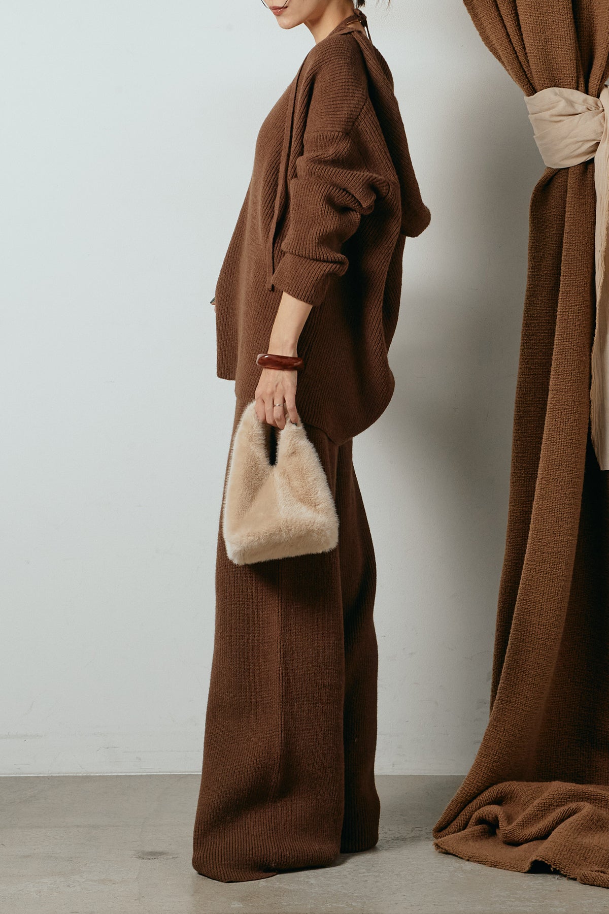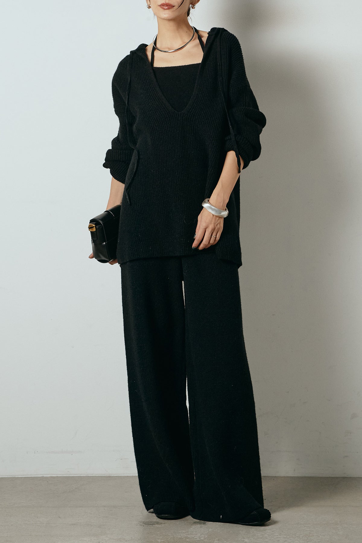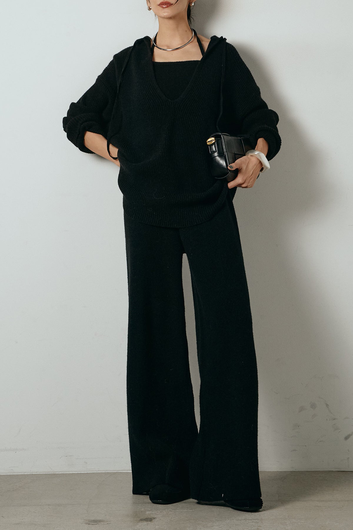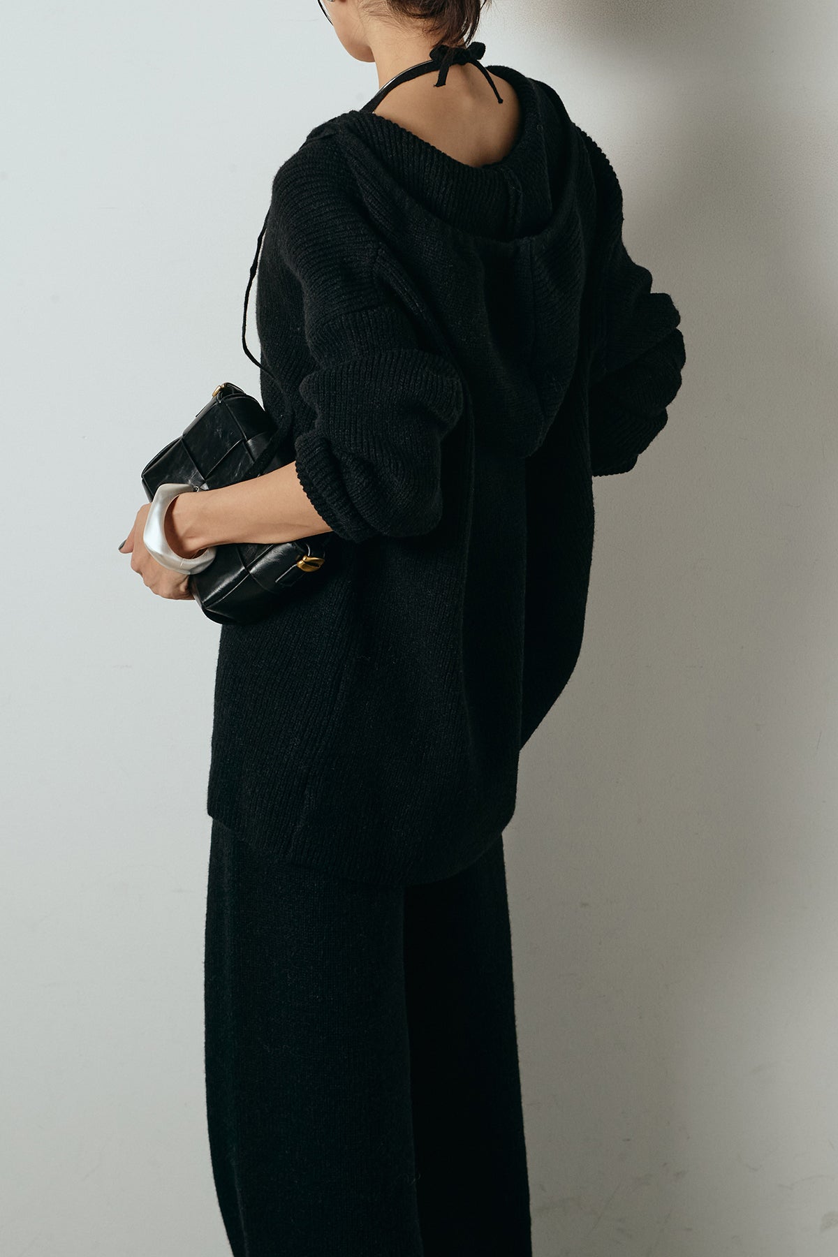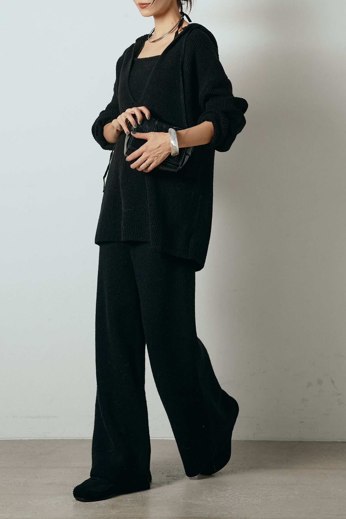 ホルターネックデザインがさりげないアクセントになる、ニットトップスとパンツのセットアップ。表情のある編地が柔らかな立体感を生み、リラックス感の中にも女性らしさを感じさせます。トップスは動きのあるシルエットで抜け感を演出し、ワイドパンツと合わせることで縦ラインを強調。セットではもちろん、単品使いもしやすく、幅広いスタイリングに活躍するアイテムです。