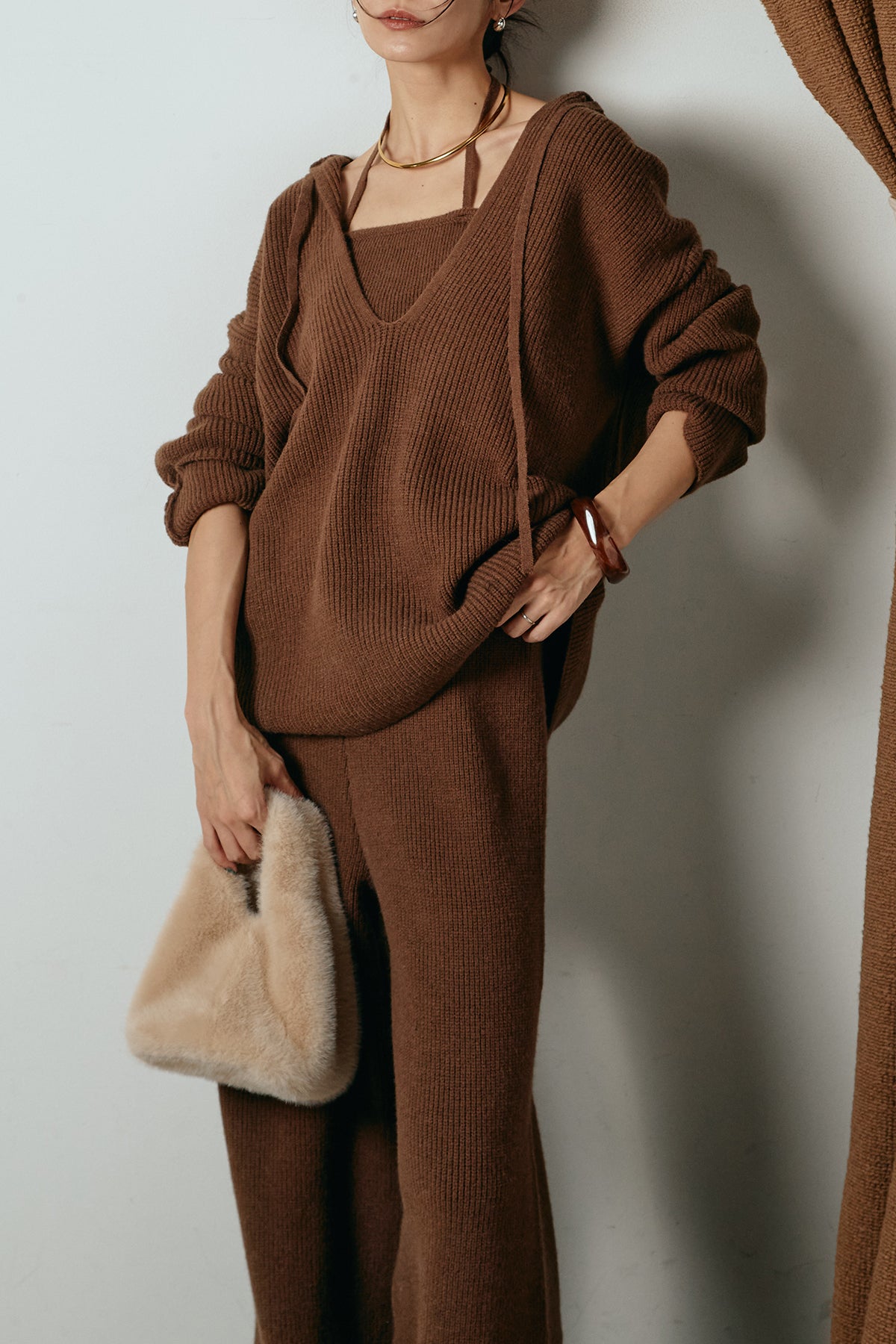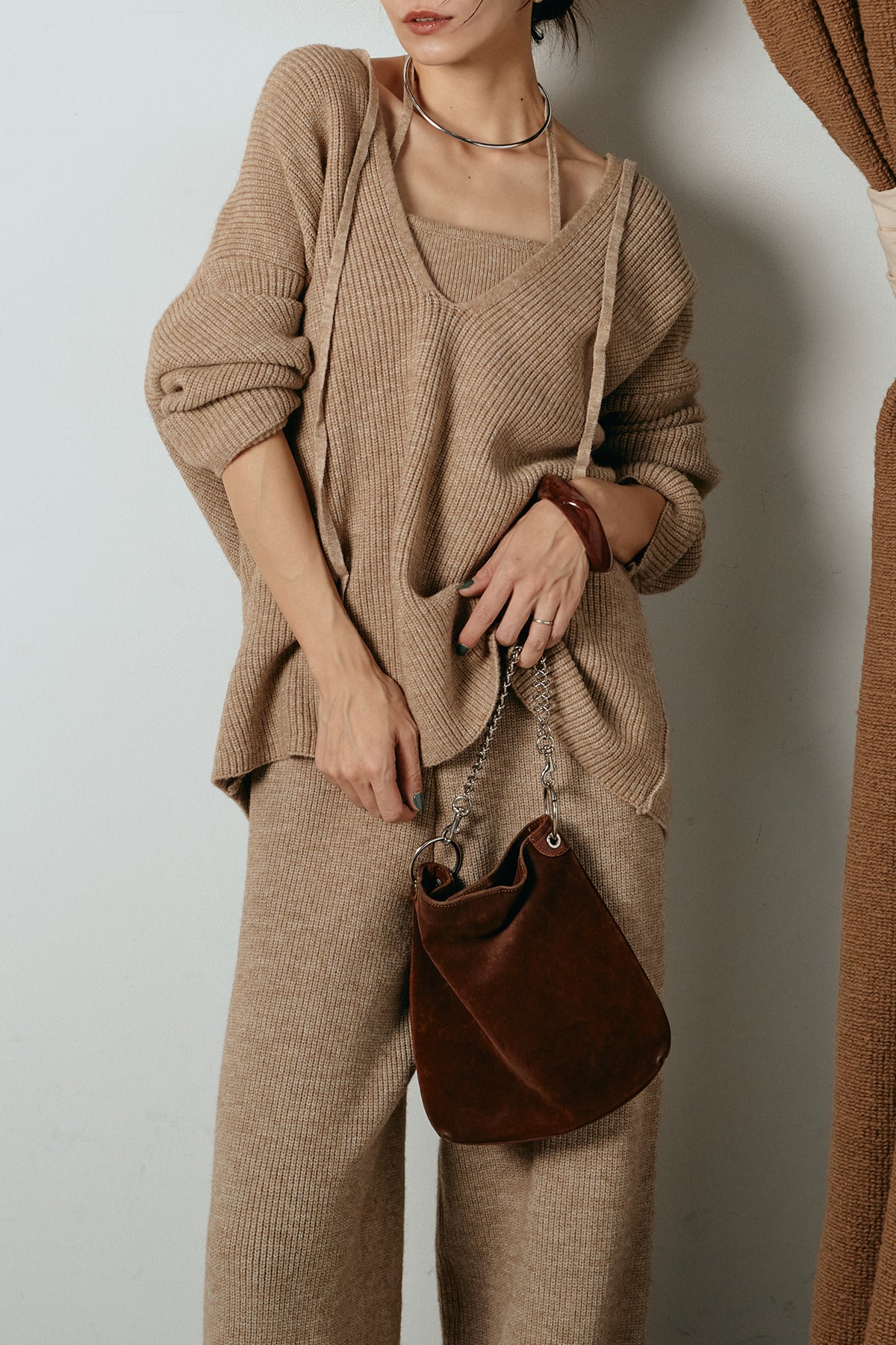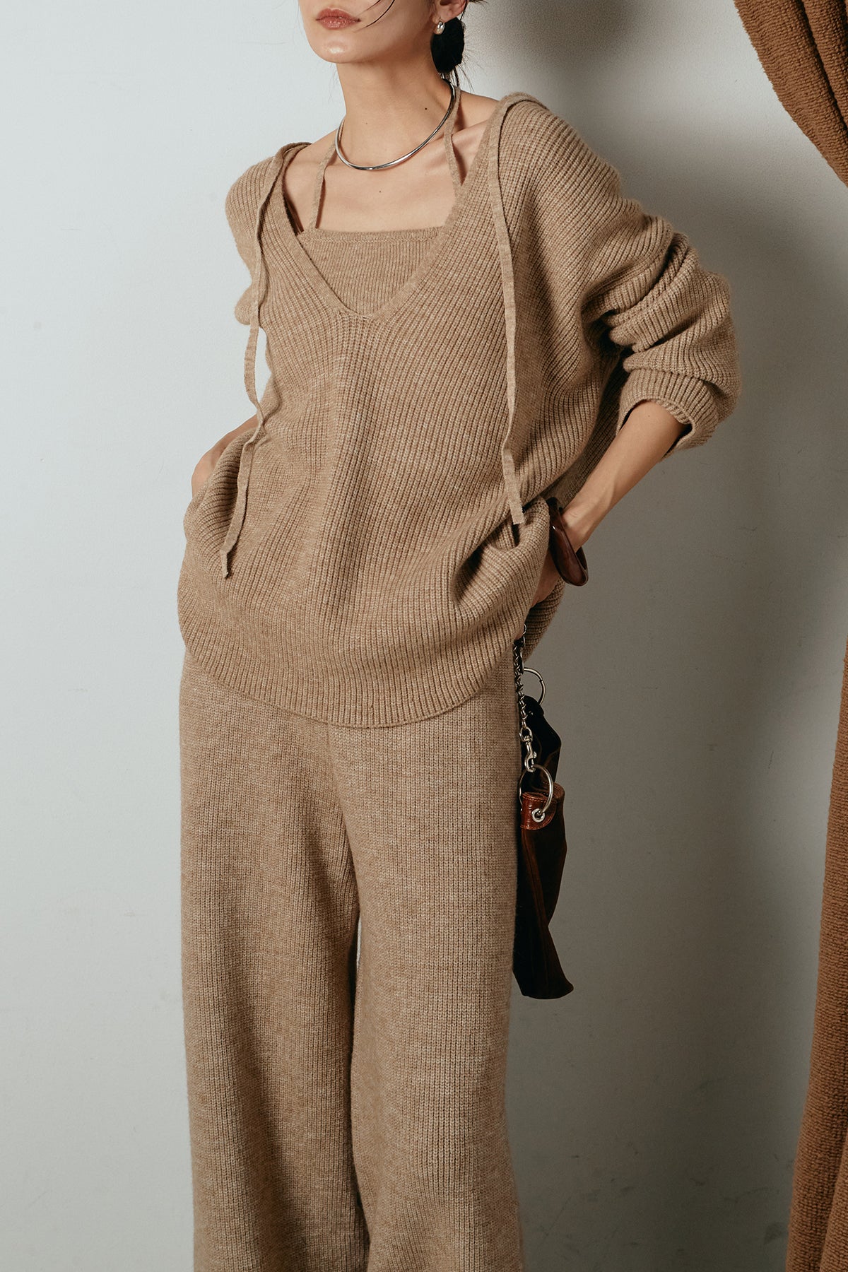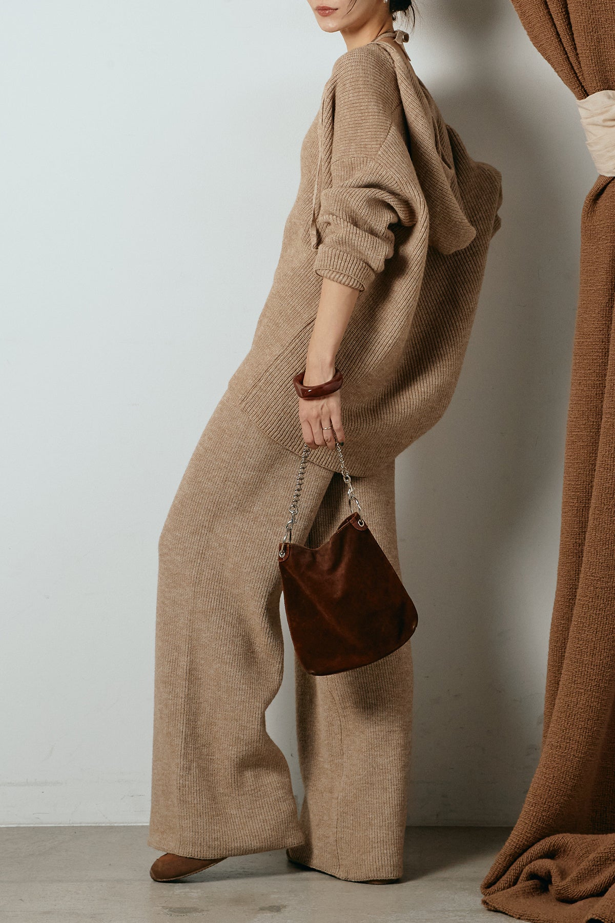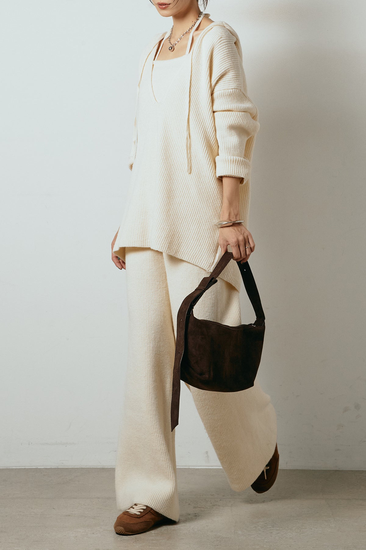 ホルターネックデザインがさりげないアクセントになる、ニットトップスとパンツのセットアップ。表情のある編地が柔らかな立体感を生み、リラックス感の中にも女性らしさを感じさせます。トップスは動きのあるシルエットで抜け感を演出し、ワイドパンツと合わせることで縦ラインを強調。セットではもちろん、単品使いもしやすく、幅広いスタイリングに活躍するアイテムです。