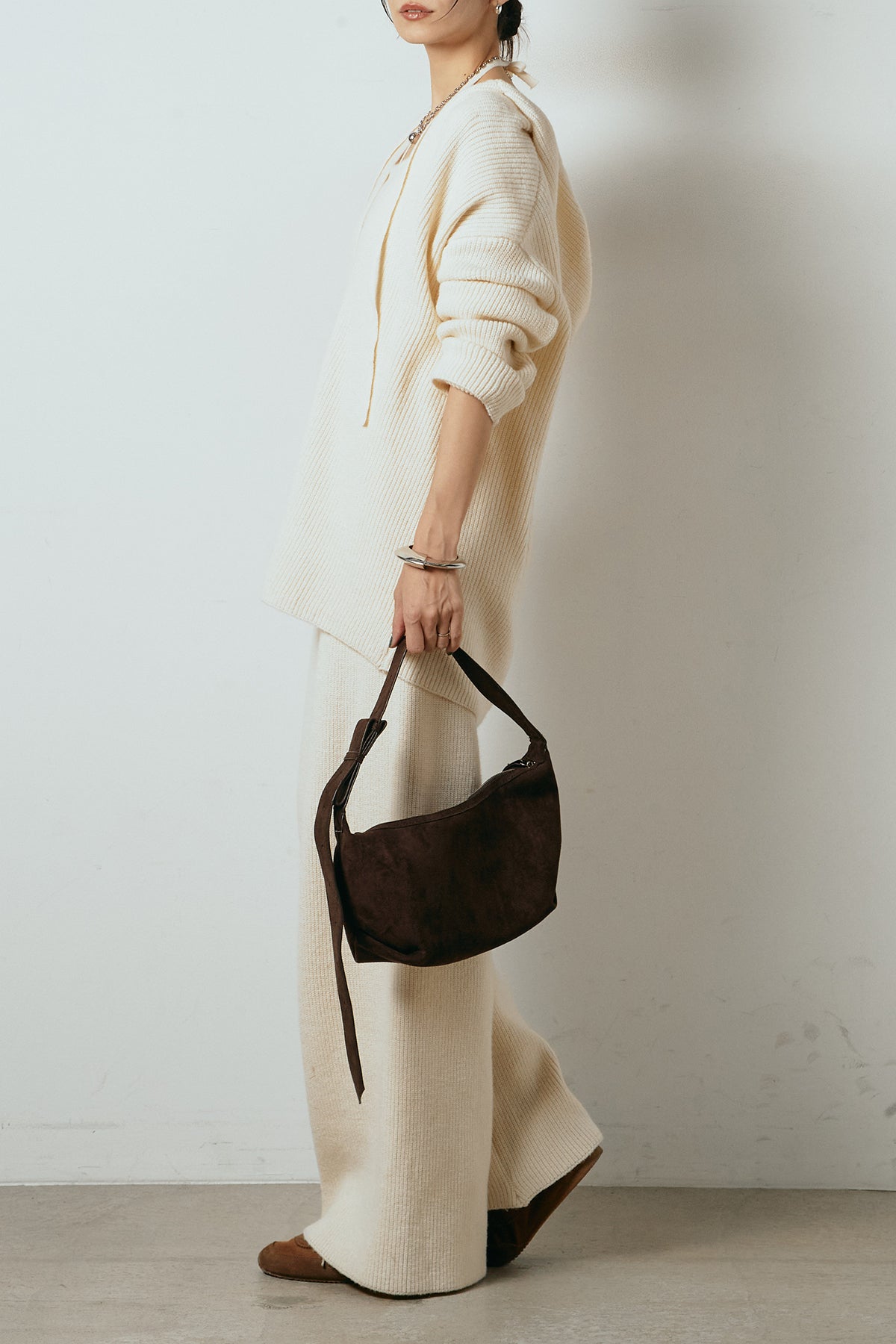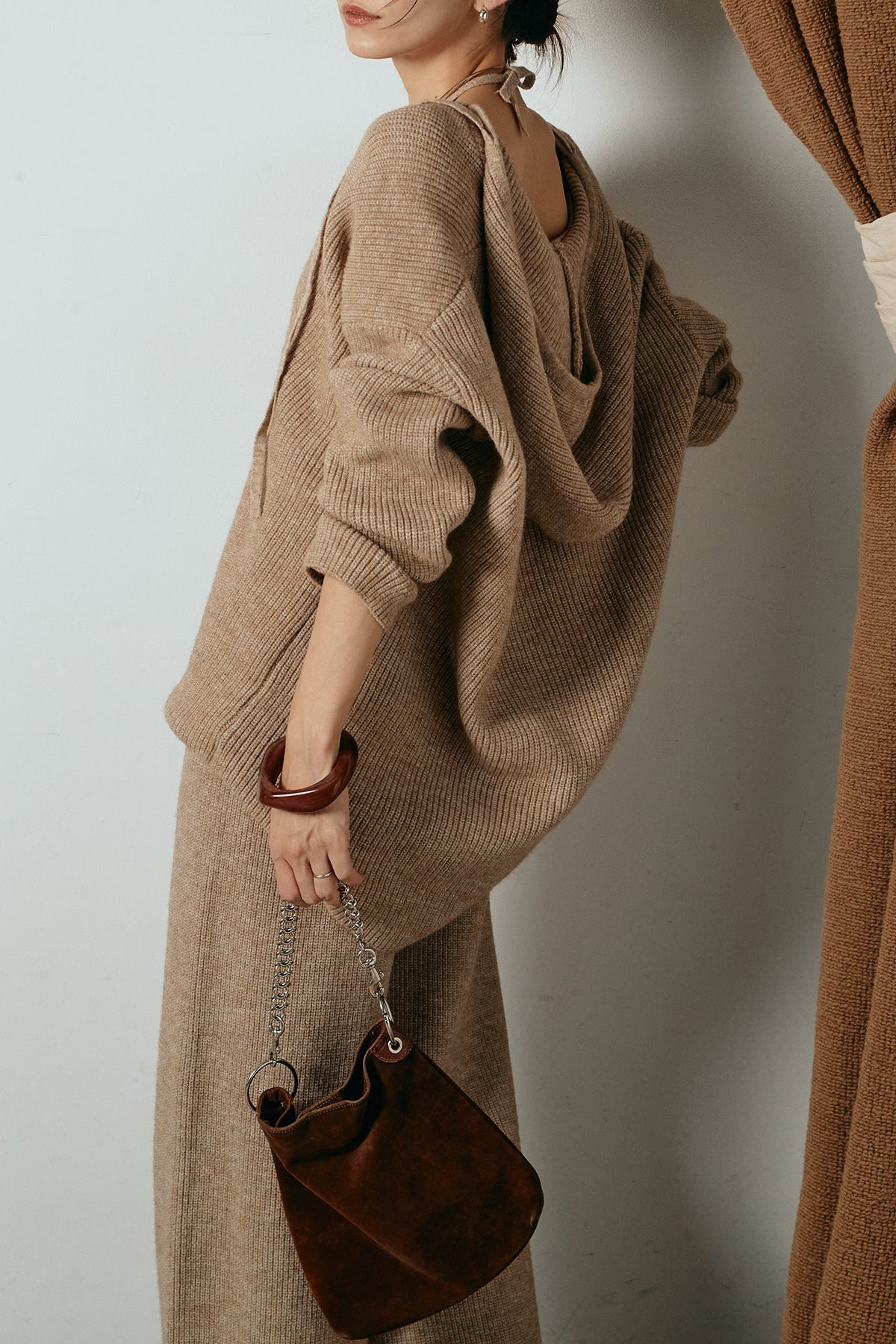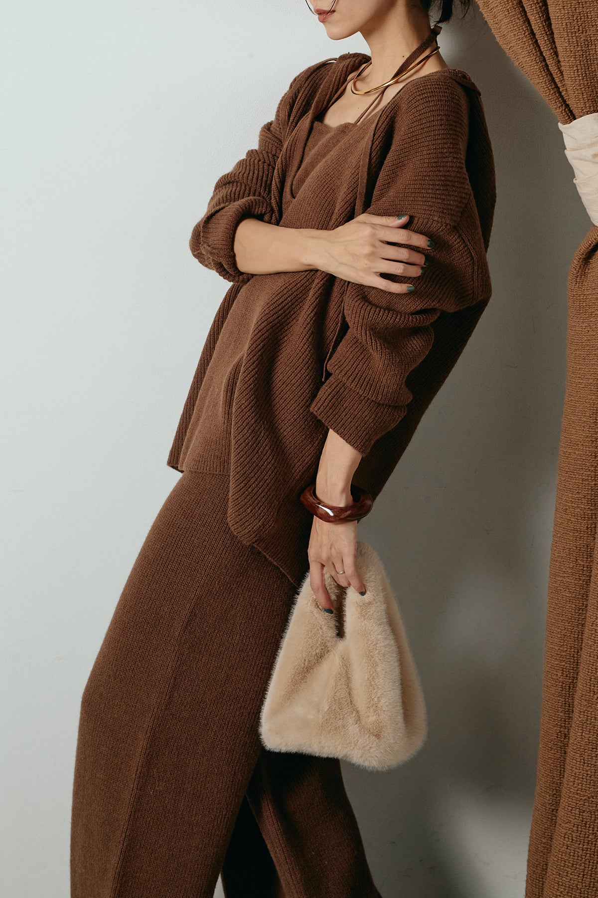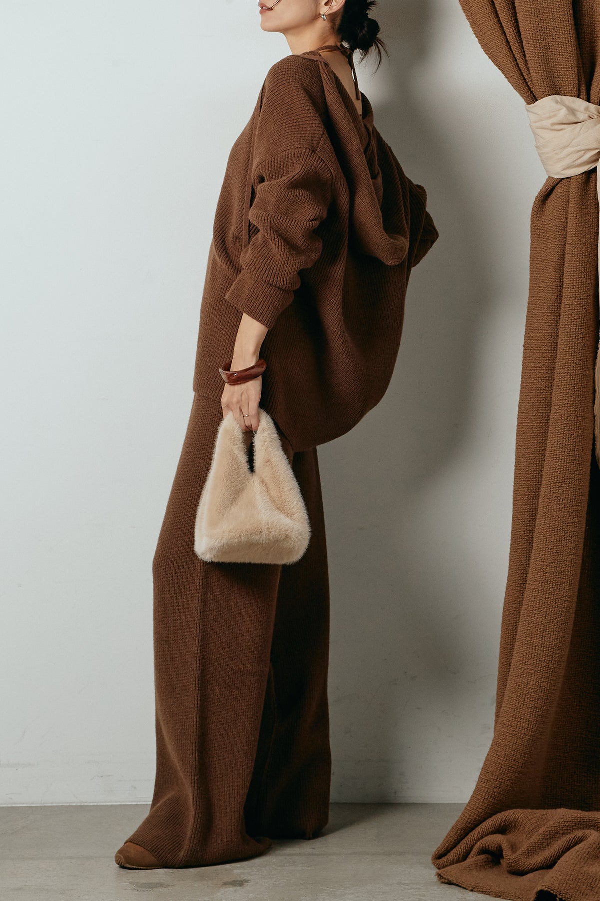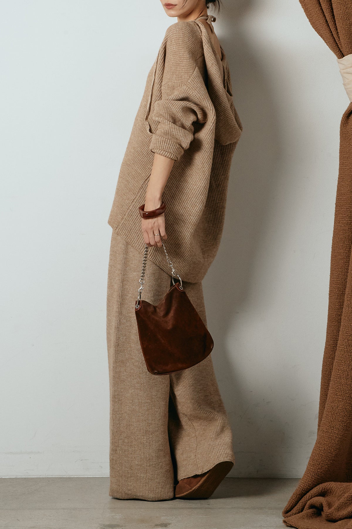 ホルターネックデザインがさりげないアクセントになる、ニットトップスとパンツのセットアップ。表情のある編地が柔らかな立体感を生み、リラックス感の中にも女性らしさを感じさせます。トップスは動きのあるシルエットで抜け感を演出し、ワイドパンツと合わせることで縦ラインを強調。セットではもちろん、単品使いもしやすく、幅広いスタイリングに活躍するアイテムです。