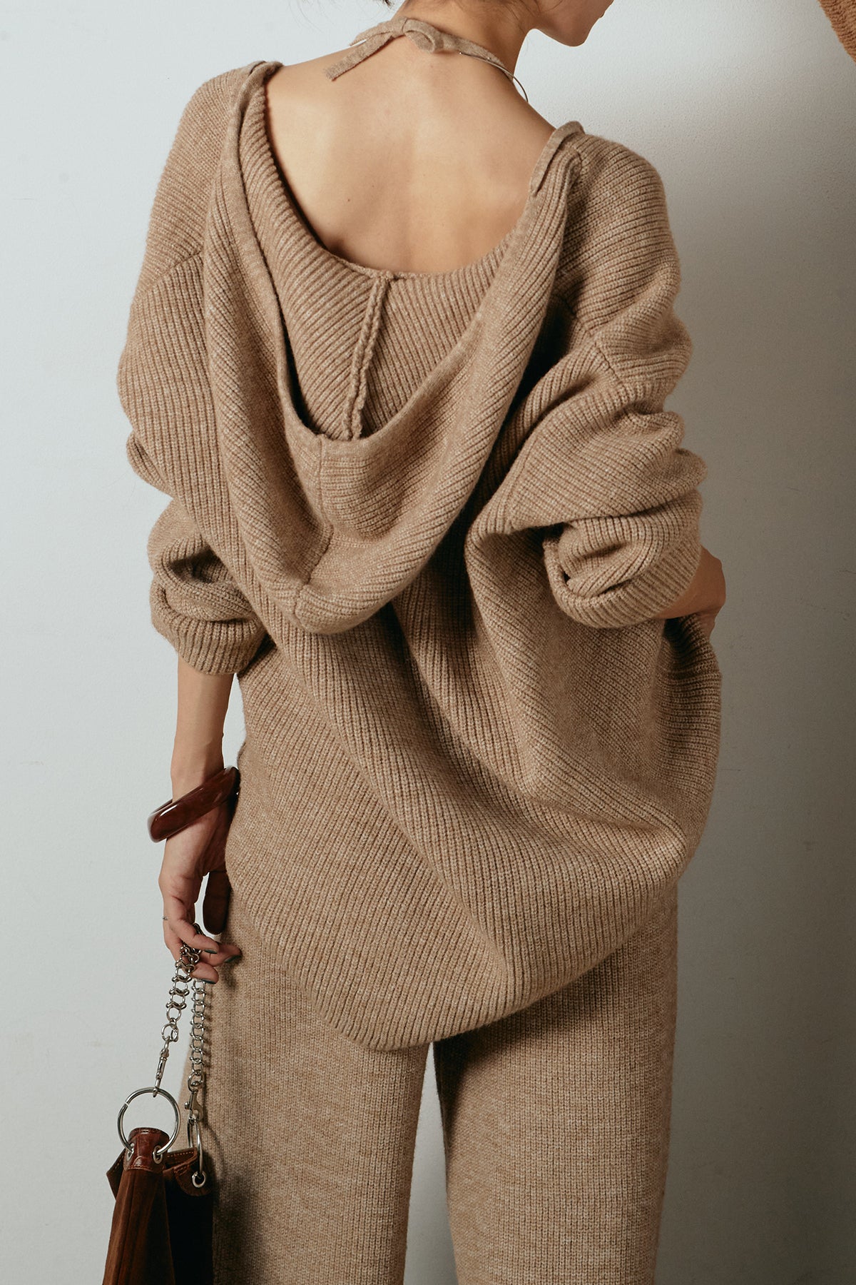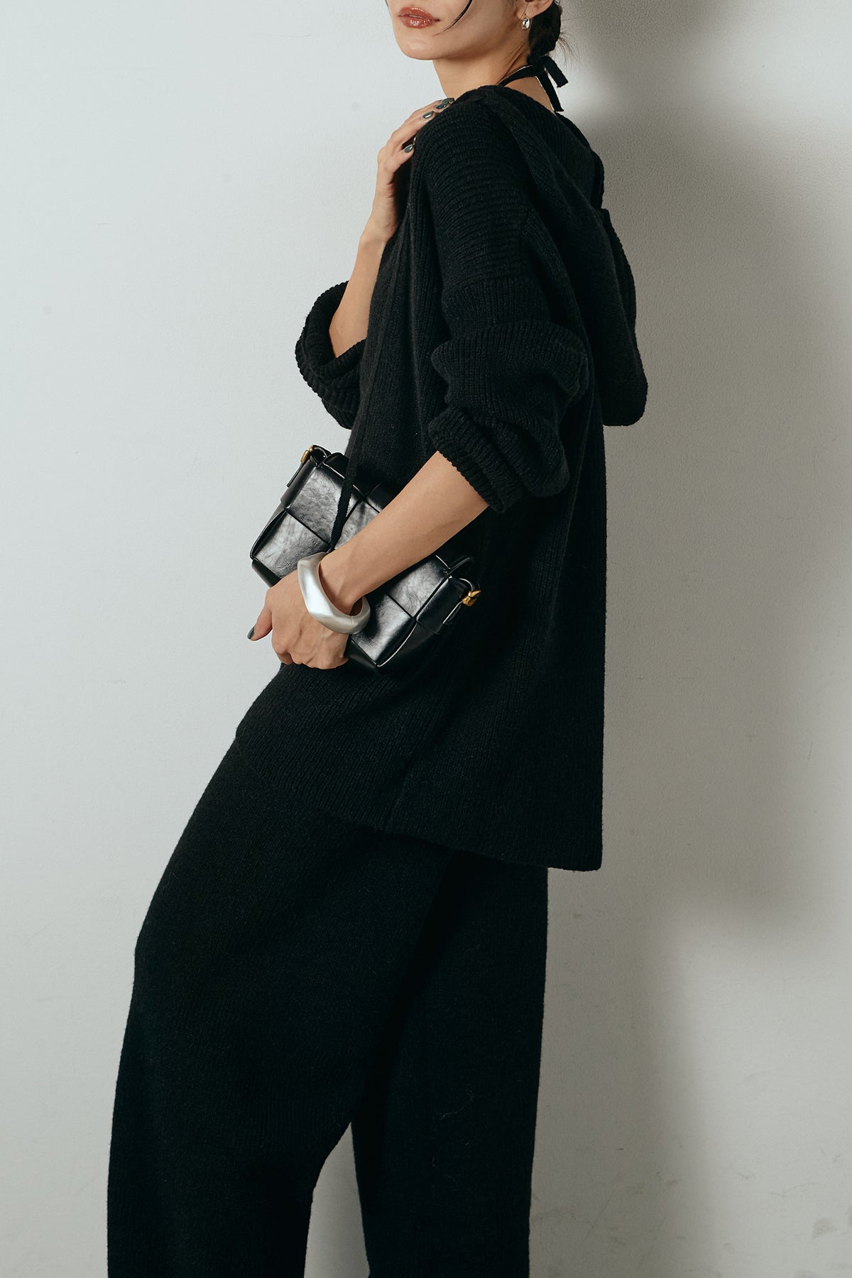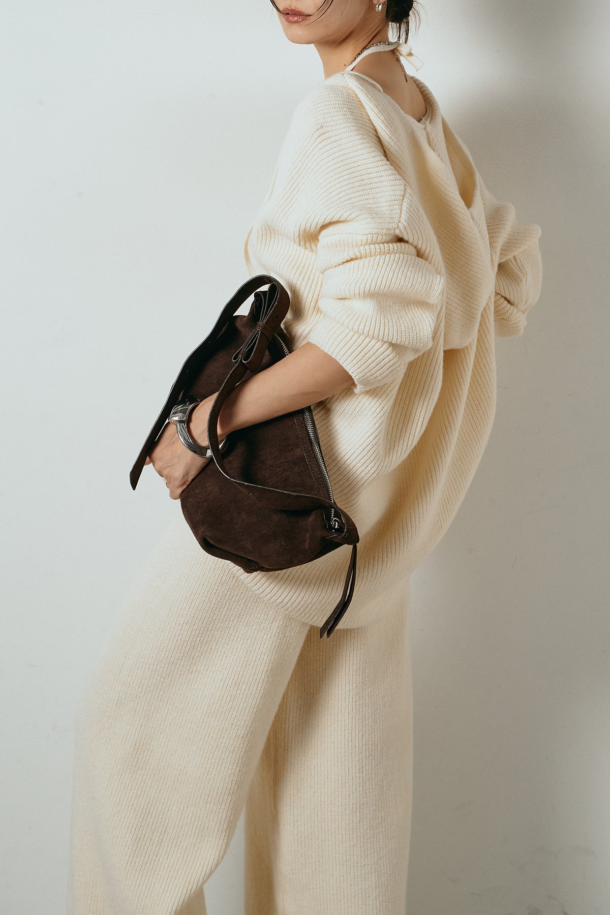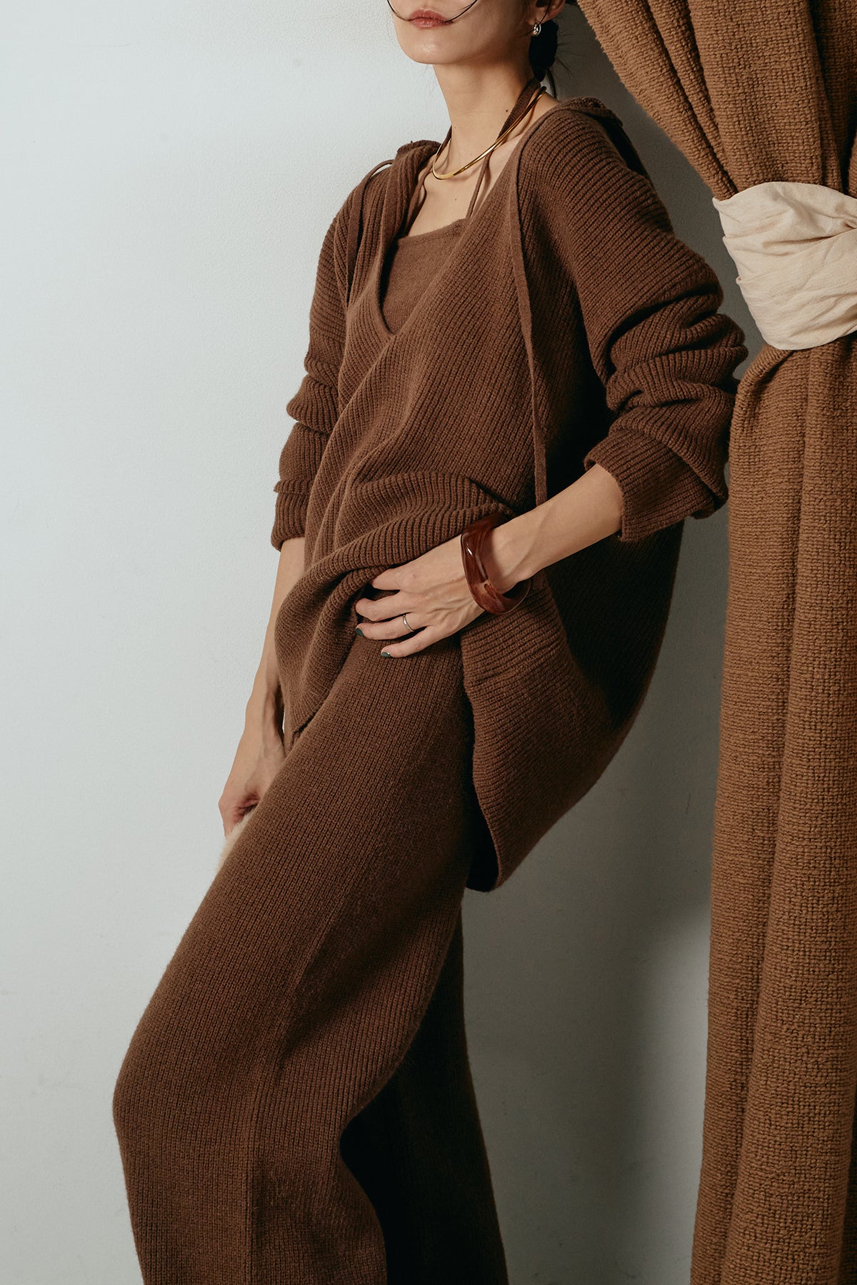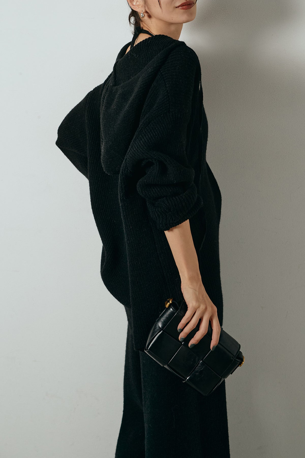 ホルターネックデザインがさりげないアクセントになる、ニットトップスとパンツのセットアップ。表情のある編地が柔らかな立体感を生み、リラックス感の中にも女性らしさを感じさせます。トップスは動きのあるシルエットで抜け感を演出し、ワイドパンツと合わせることで縦ラインを強調。セットではもちろん、単品使いもしやすく、幅広いスタイリングに活躍するアイテムです。